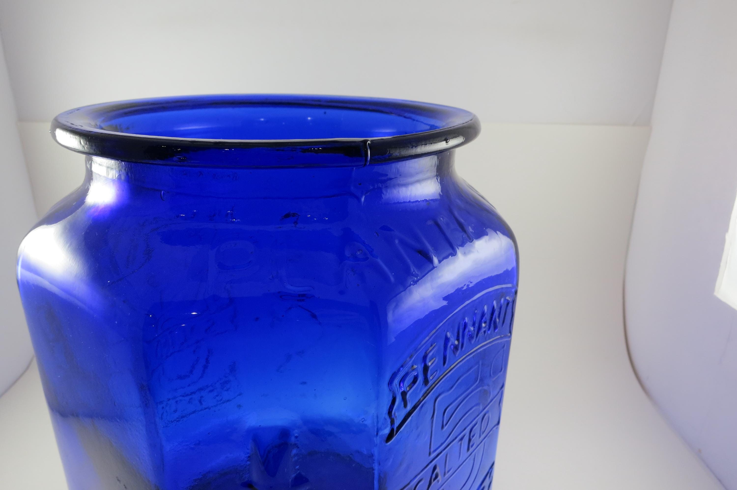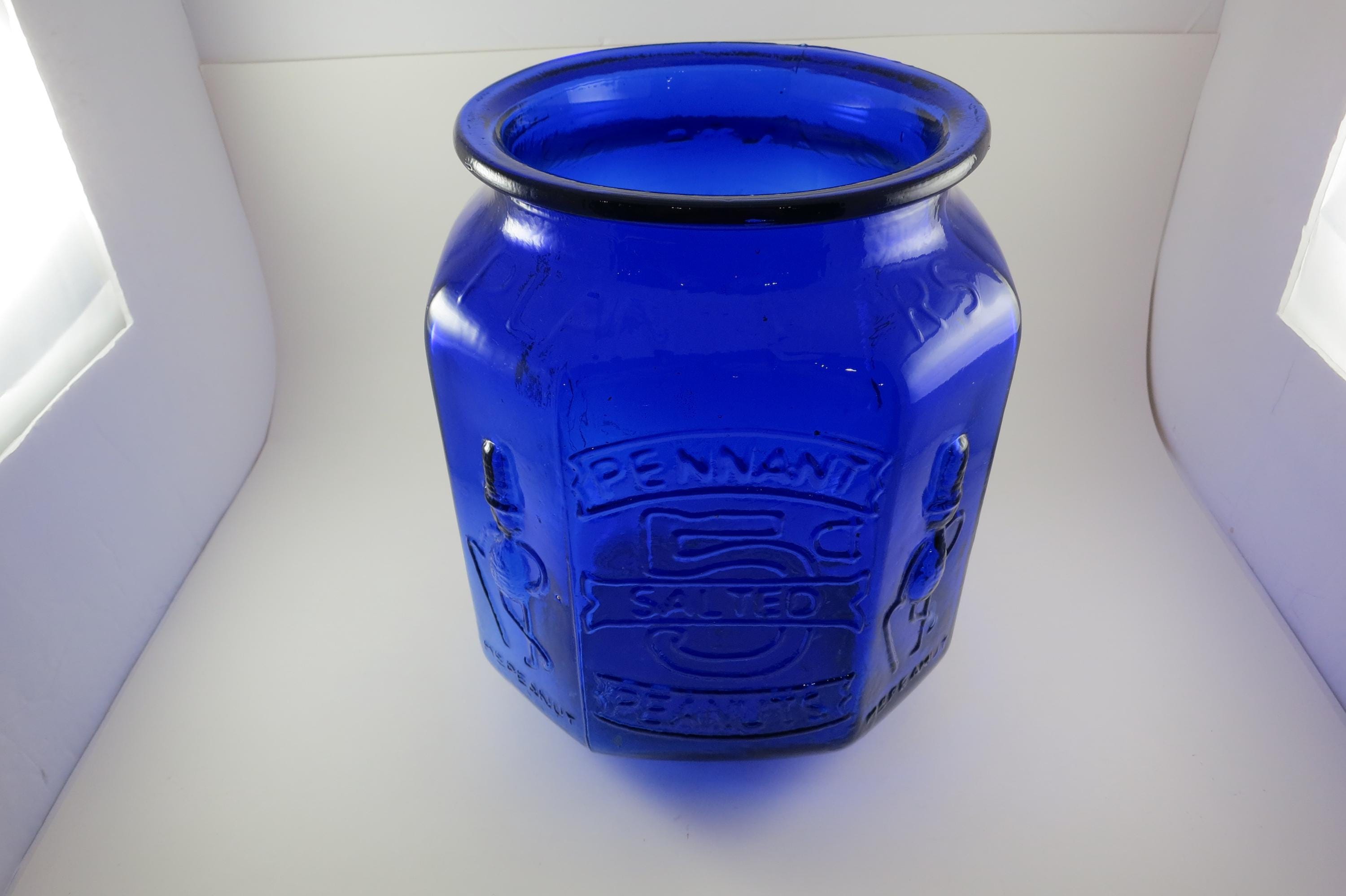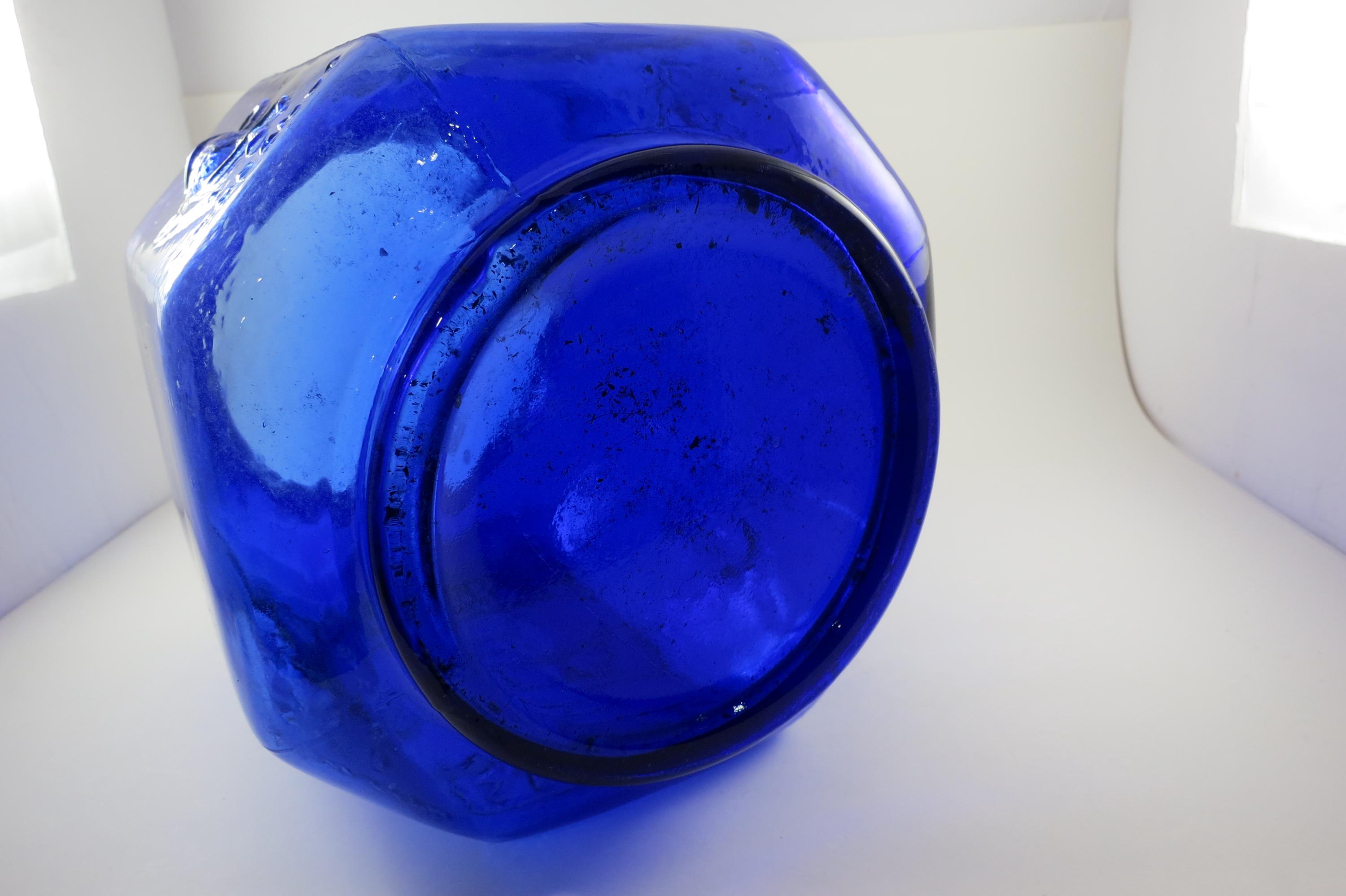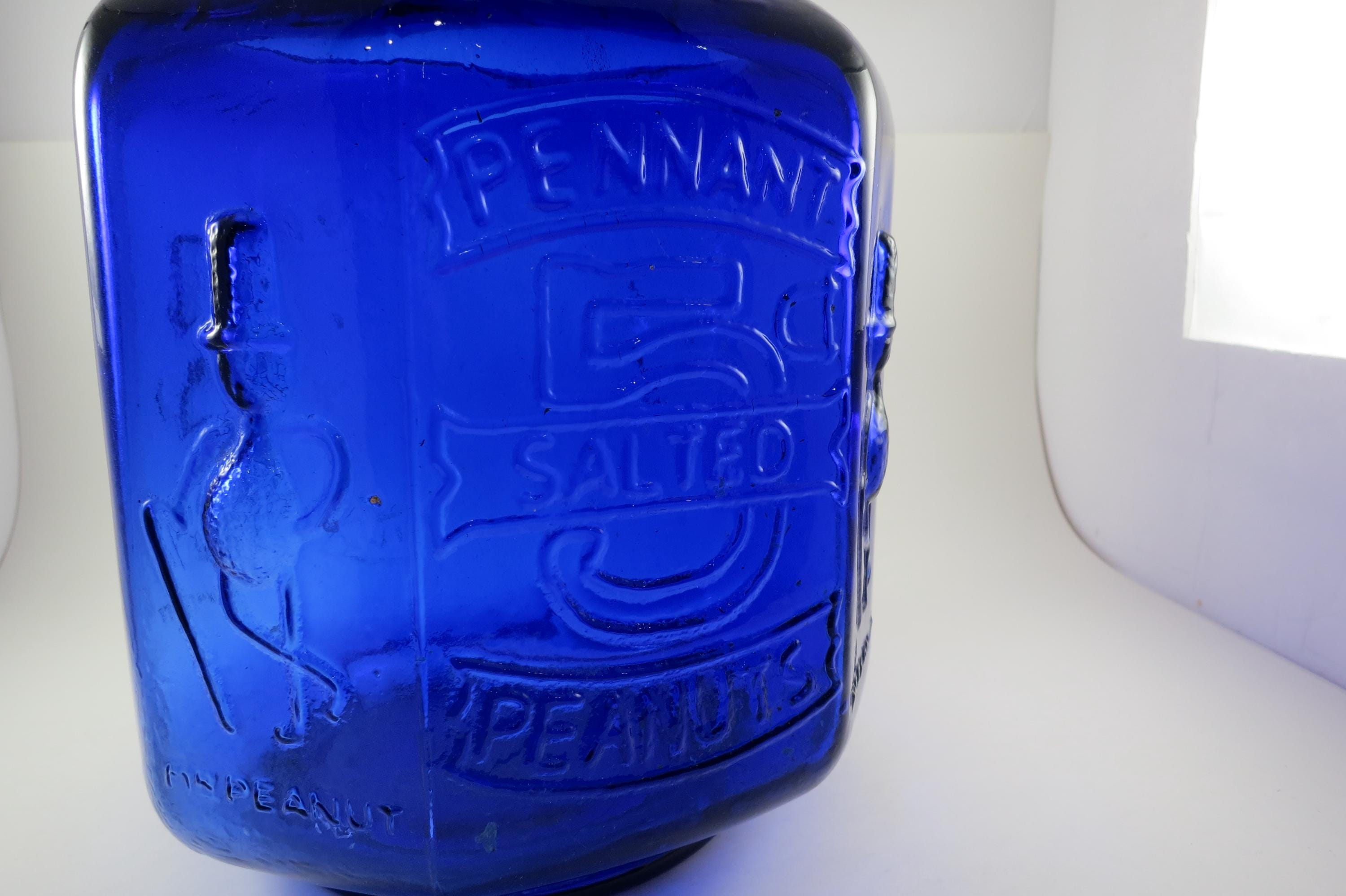Fabulous Vintage Cobalt Blue Mr. Peanut Planters Peanuts Jar Large Size Embossed Bubbled Glass Great Display Piece. A wonderful addition to any home or collection. Very detailed, measures 10 1/2 inches tall and 8 inches wide. No chips, cracks or damages. Looks great in the cabinet and even better when light shines through!!