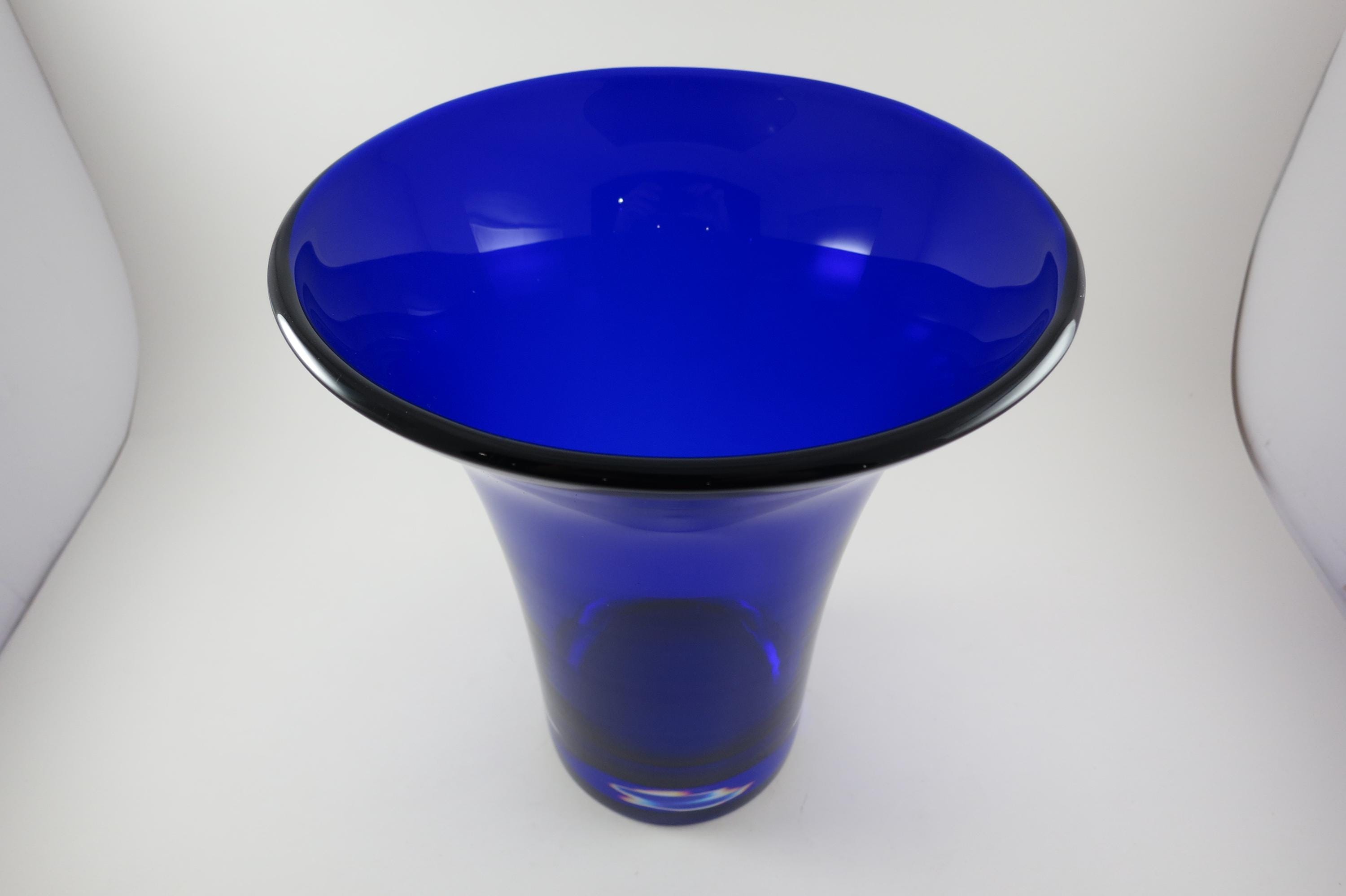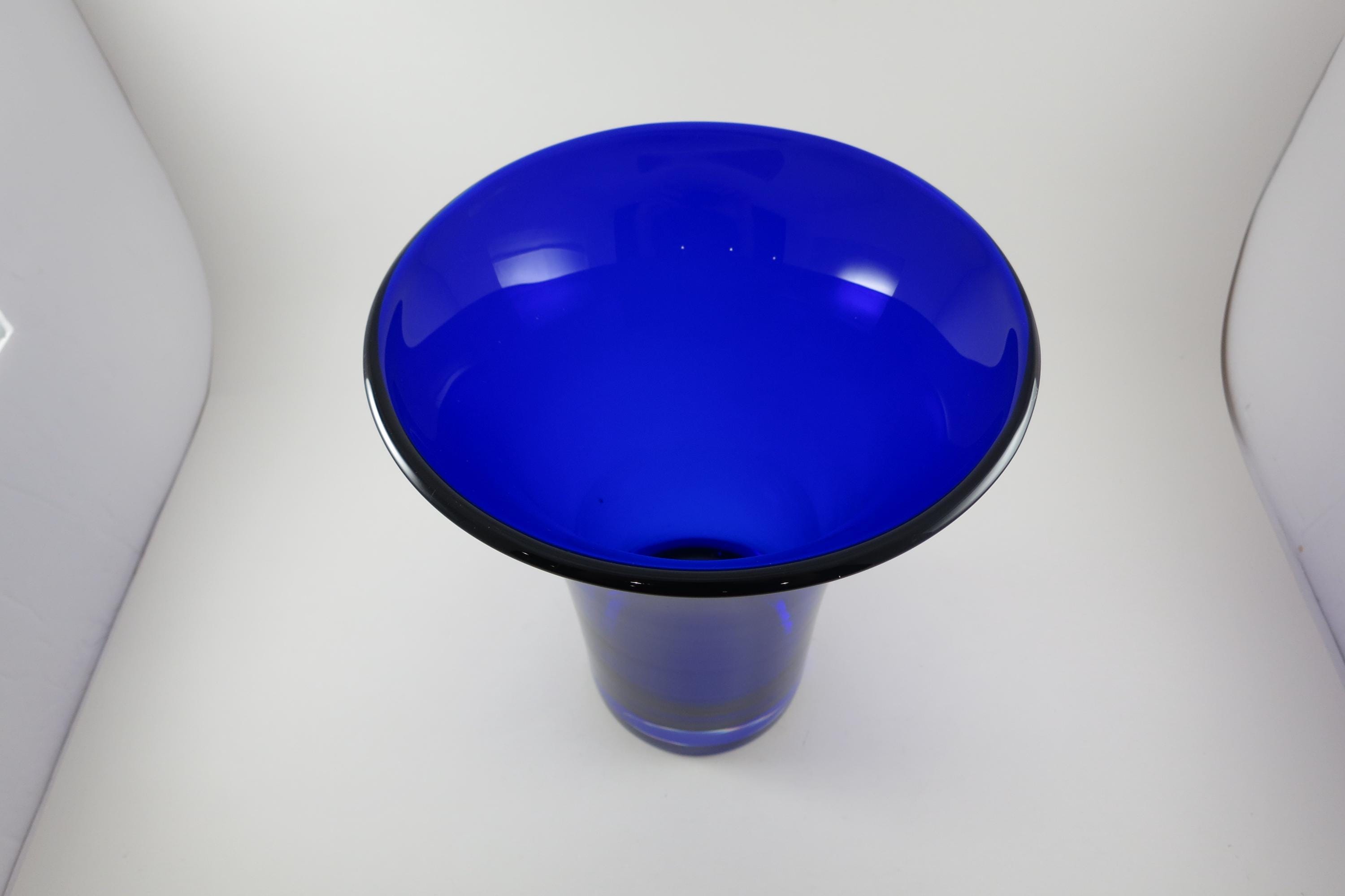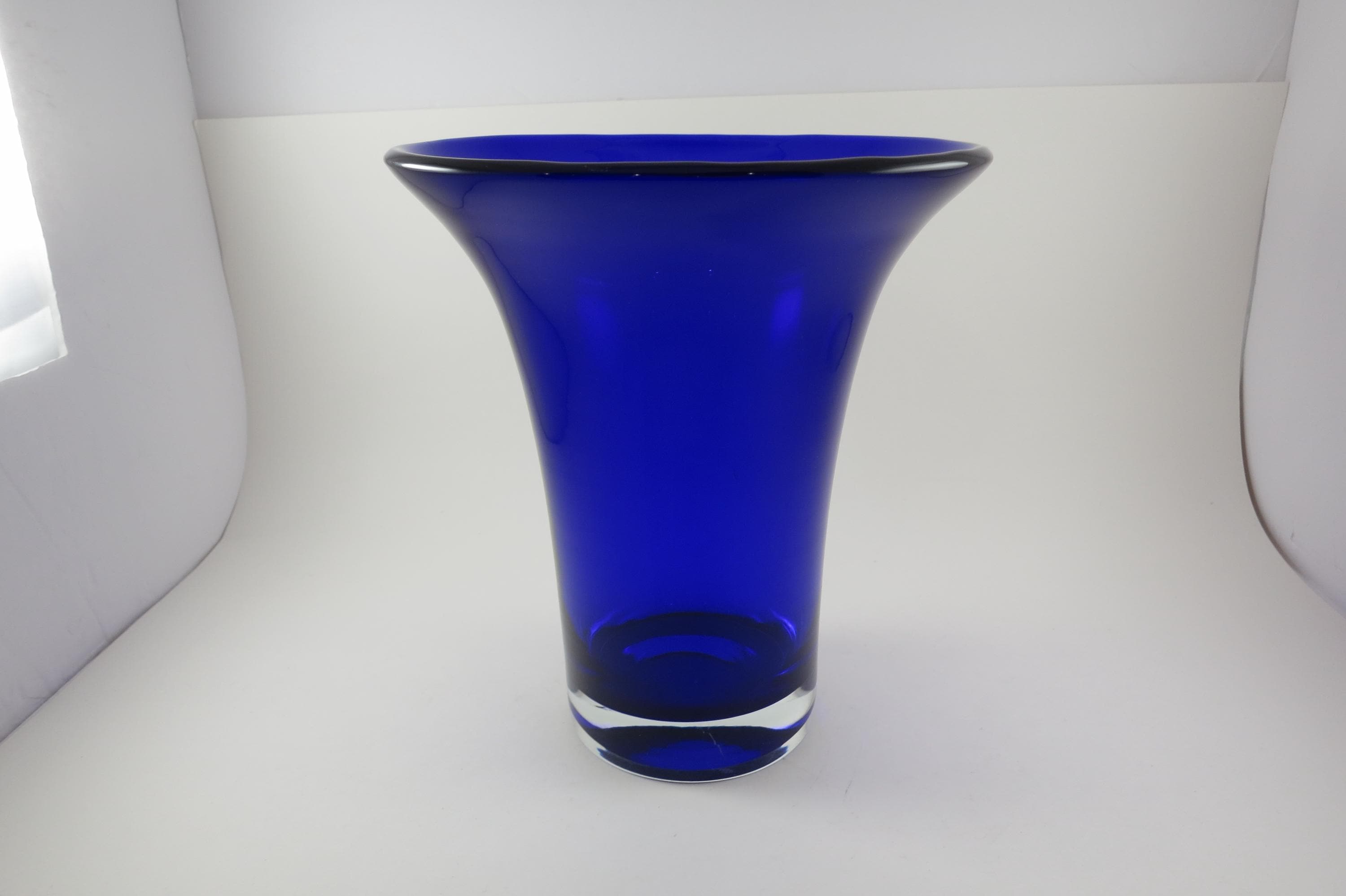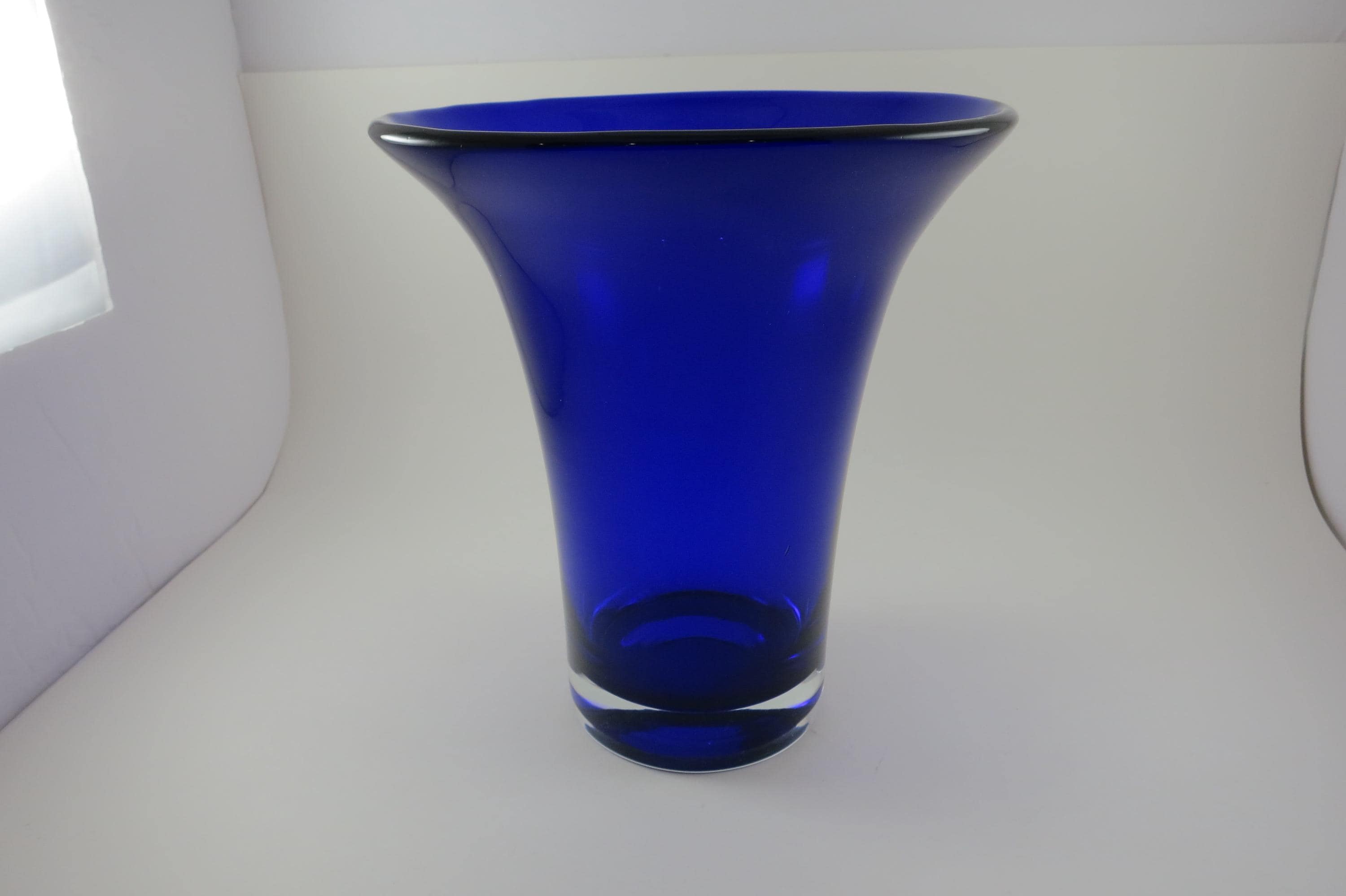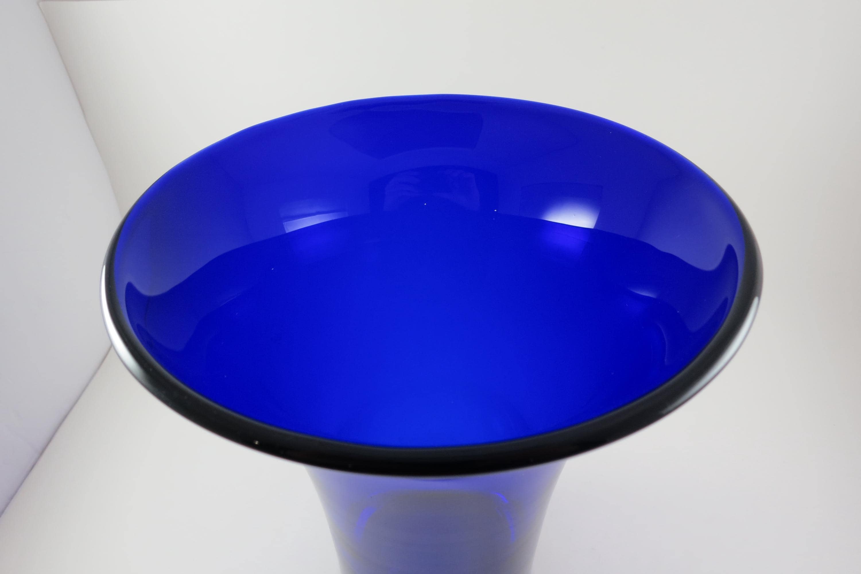 Vintage Cobalt Blue Polish Hand Blown Glass Vase Flared Rim Thick Clear Base. Very nice vase that displays great! Measures 8 1/2 inches tall and 7 1/2 inches wide at the rim. Heavy, great quality and a beautiful vase.