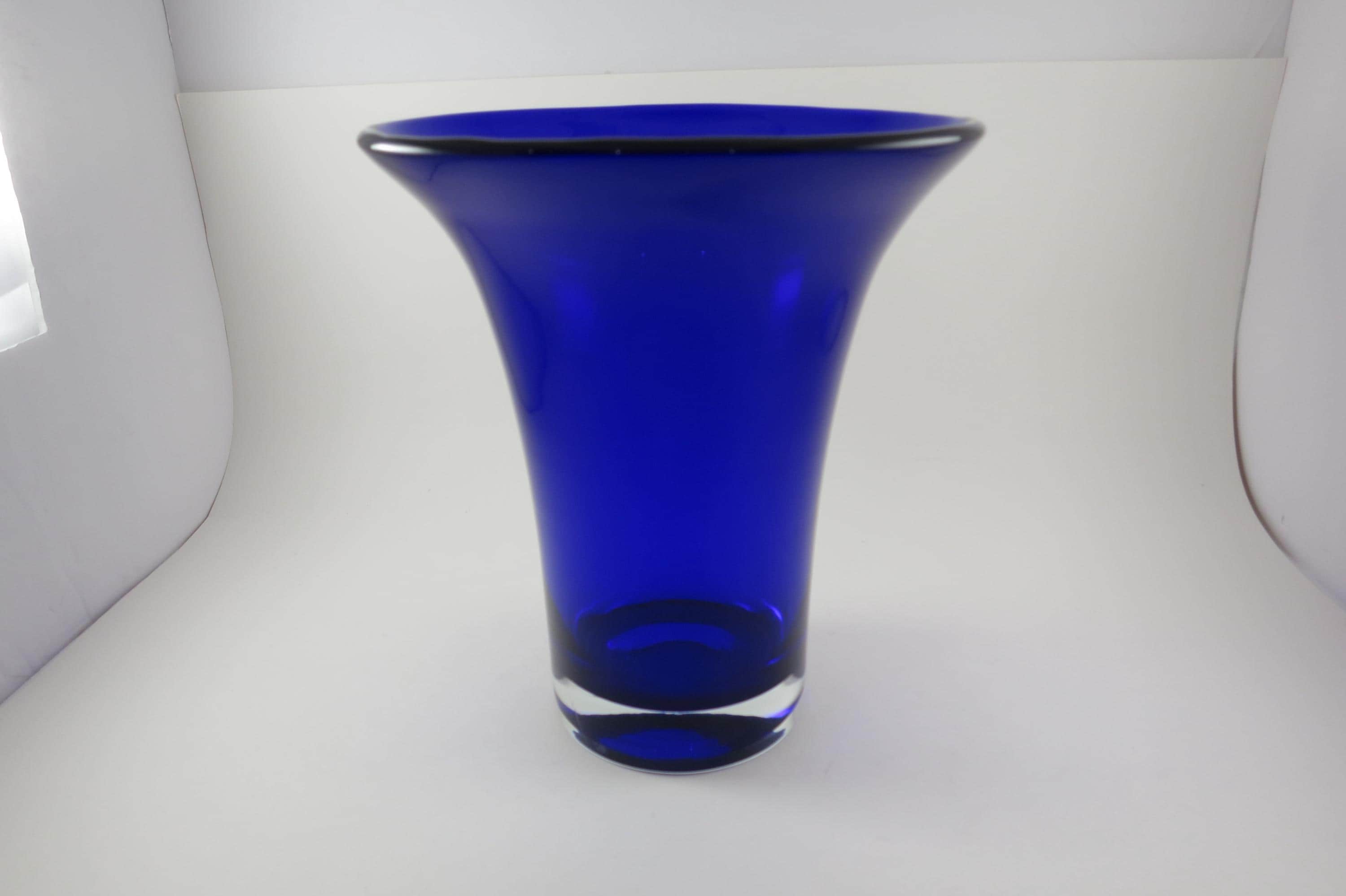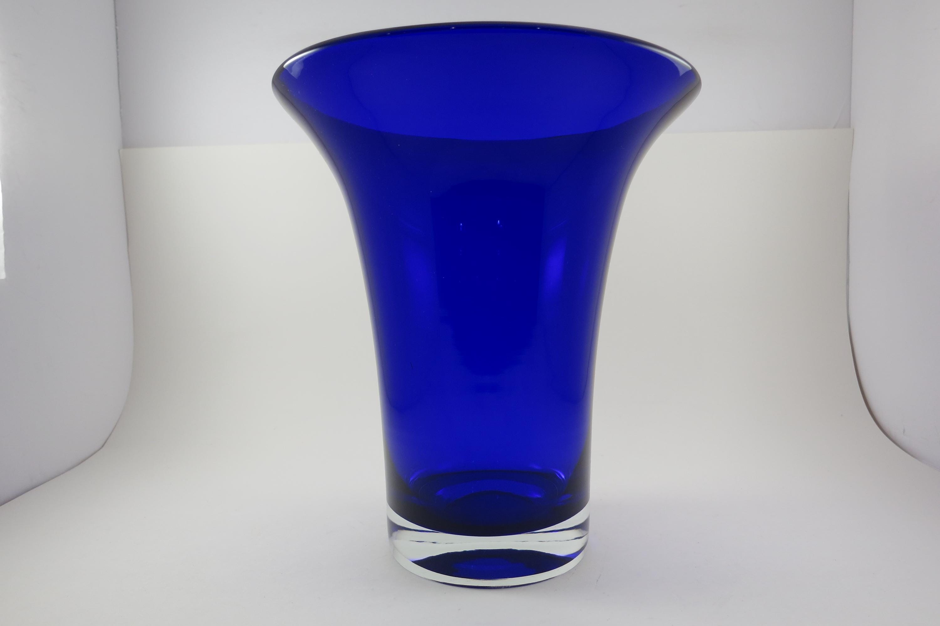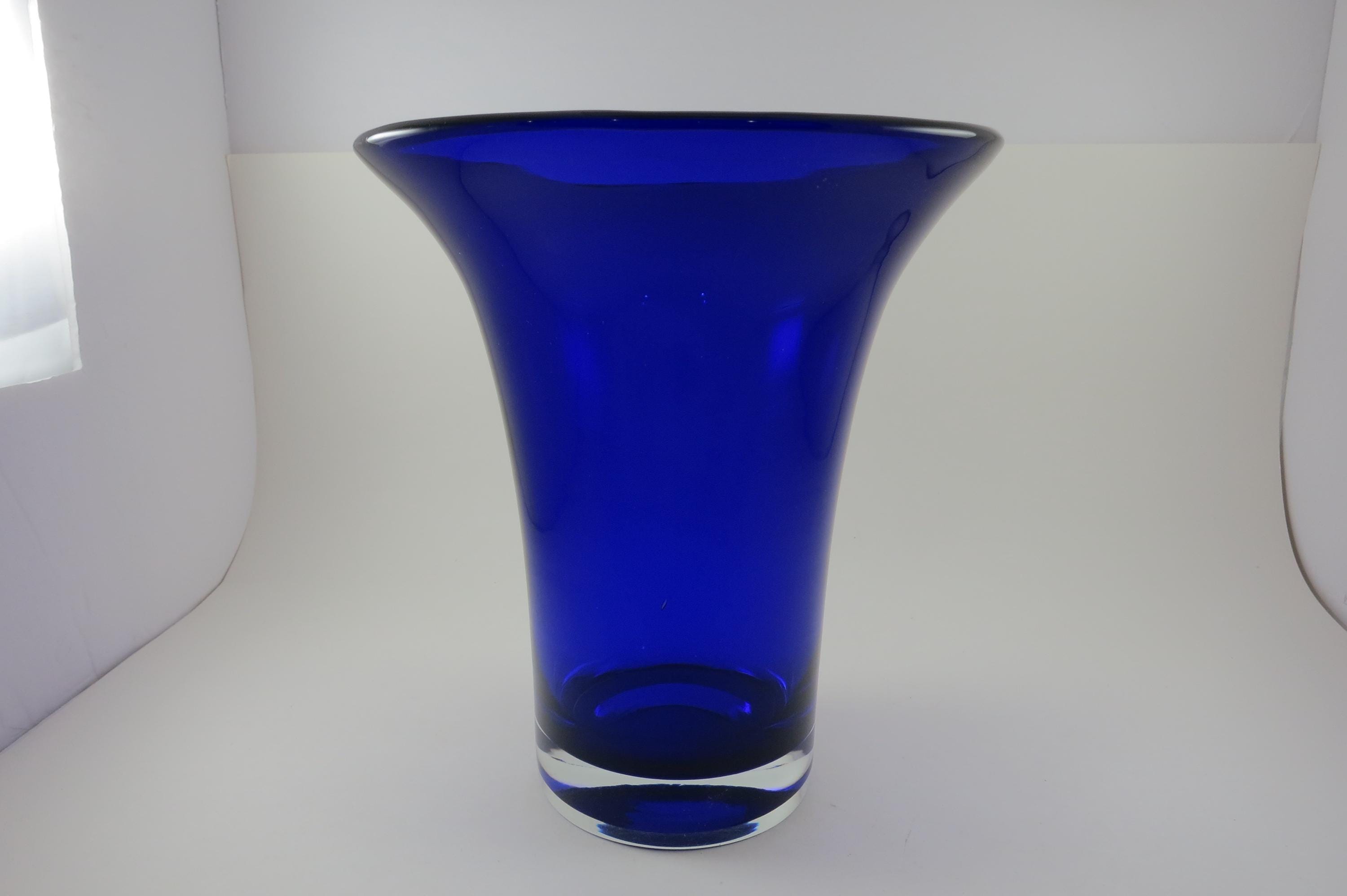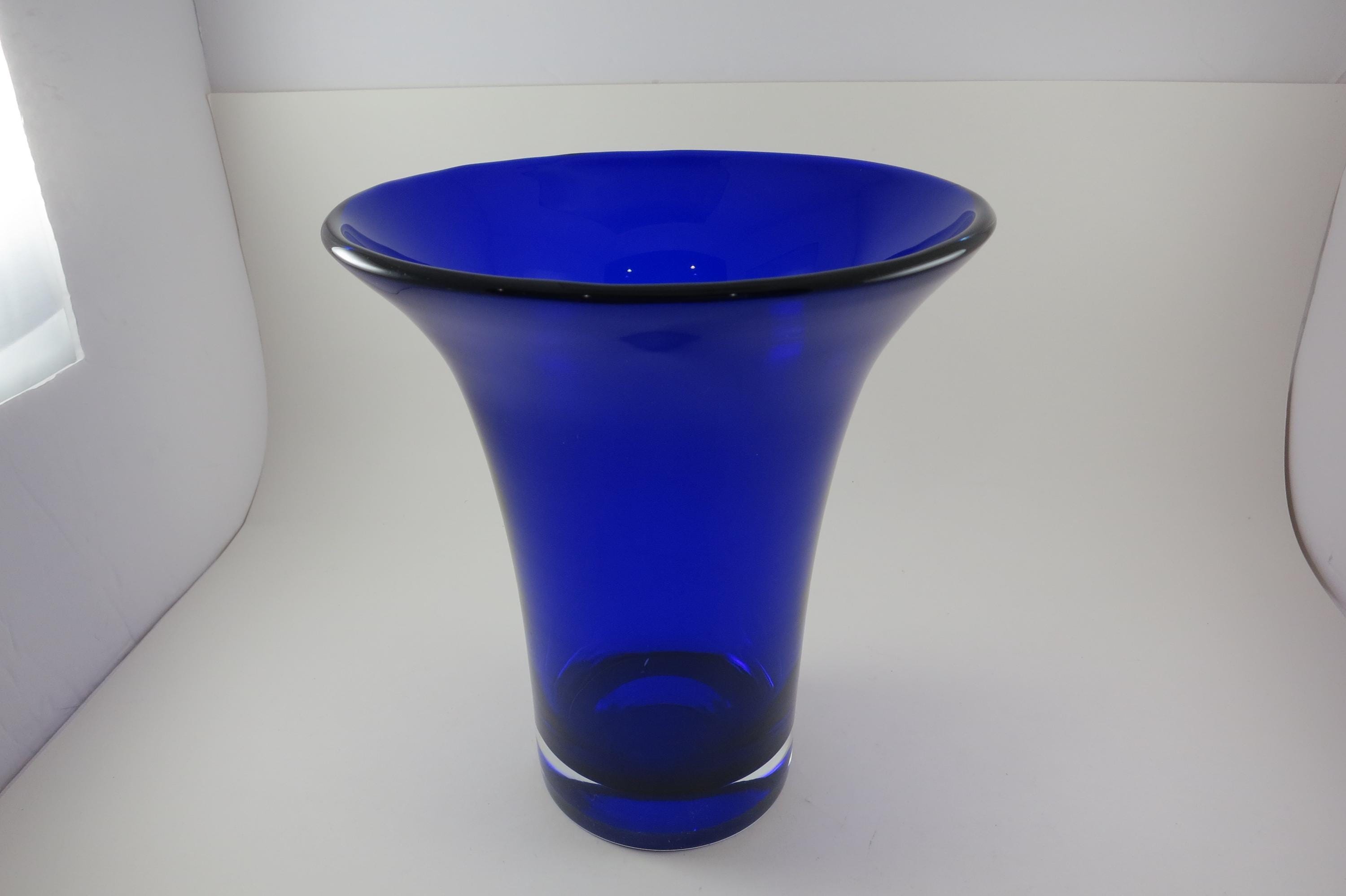 Vintage Cobalt Blue Polish Hand Blown Glass Vase Flared Rim Thick Clear Base. Very nice vase that displays great! Measures 8 1/2 inches tall and 7 1/2 inches wide at the rim. Heavy, great quality and a beautiful vase.