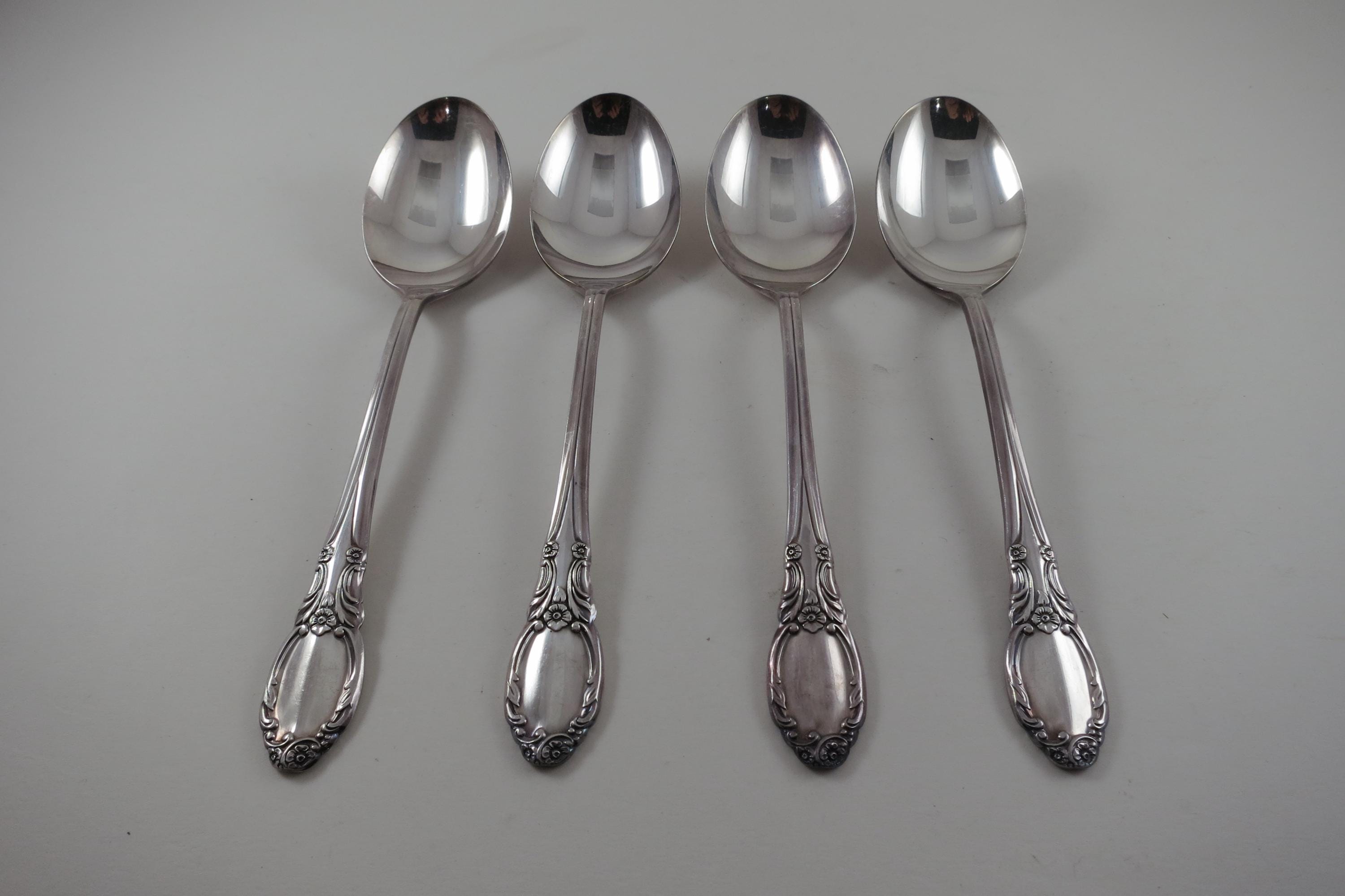 Listing is for Four (4) 6 7/8 Inch Soup Spoons in the Park Lane Chatelaine Dowry Pattern. All in excellent condition.
