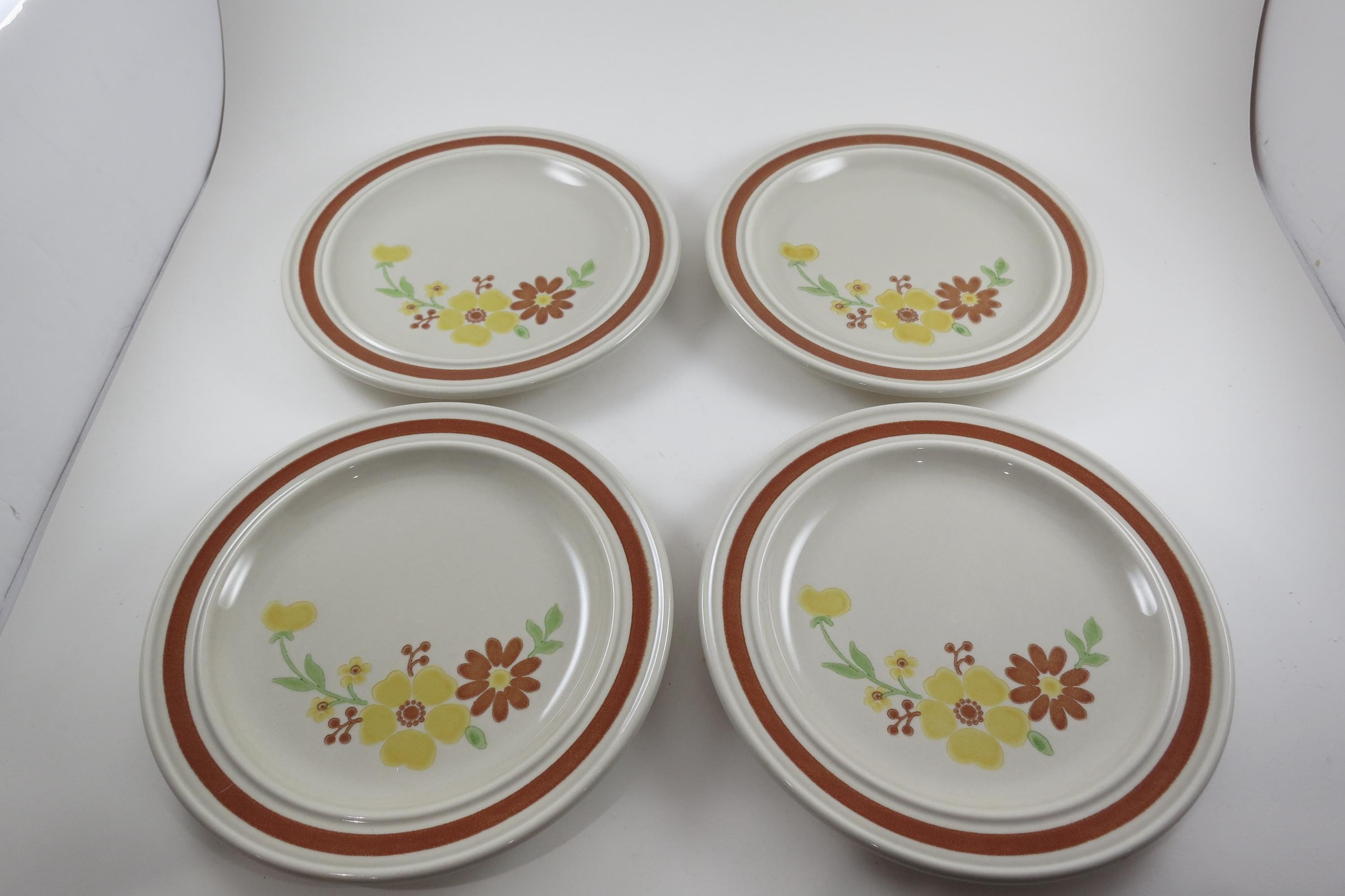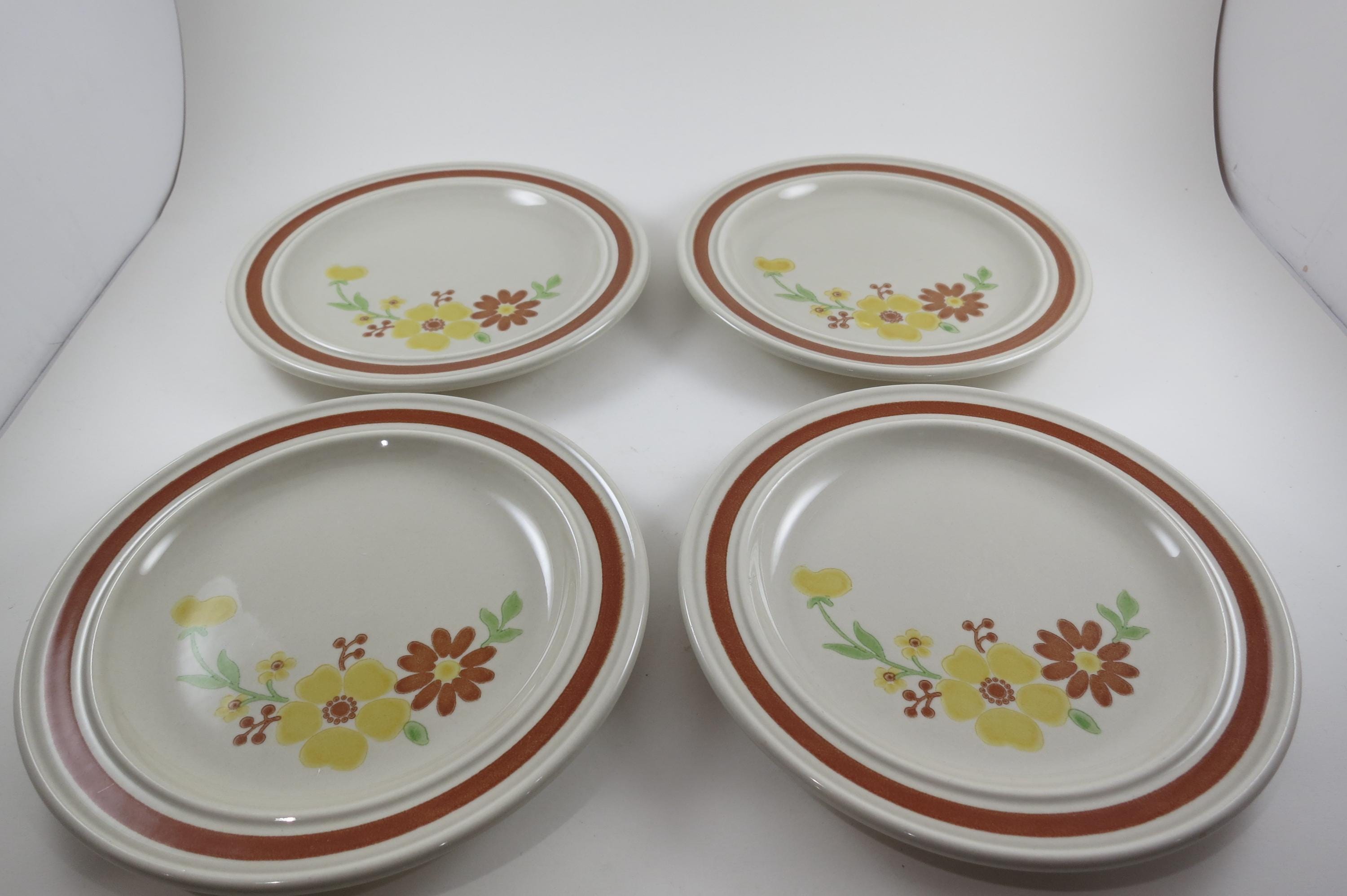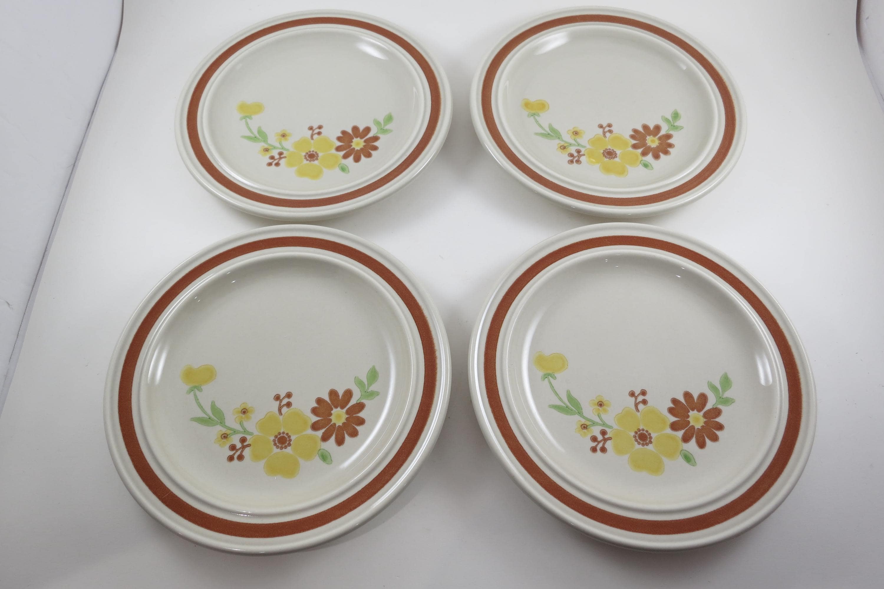 Set of Four Vintage Homer Laughlin China Brown Rim Floral Salad Lunch Plates. All four are in excellent condition with no chips, cracks or damages. Each measures 7 1/4 inches diameter.