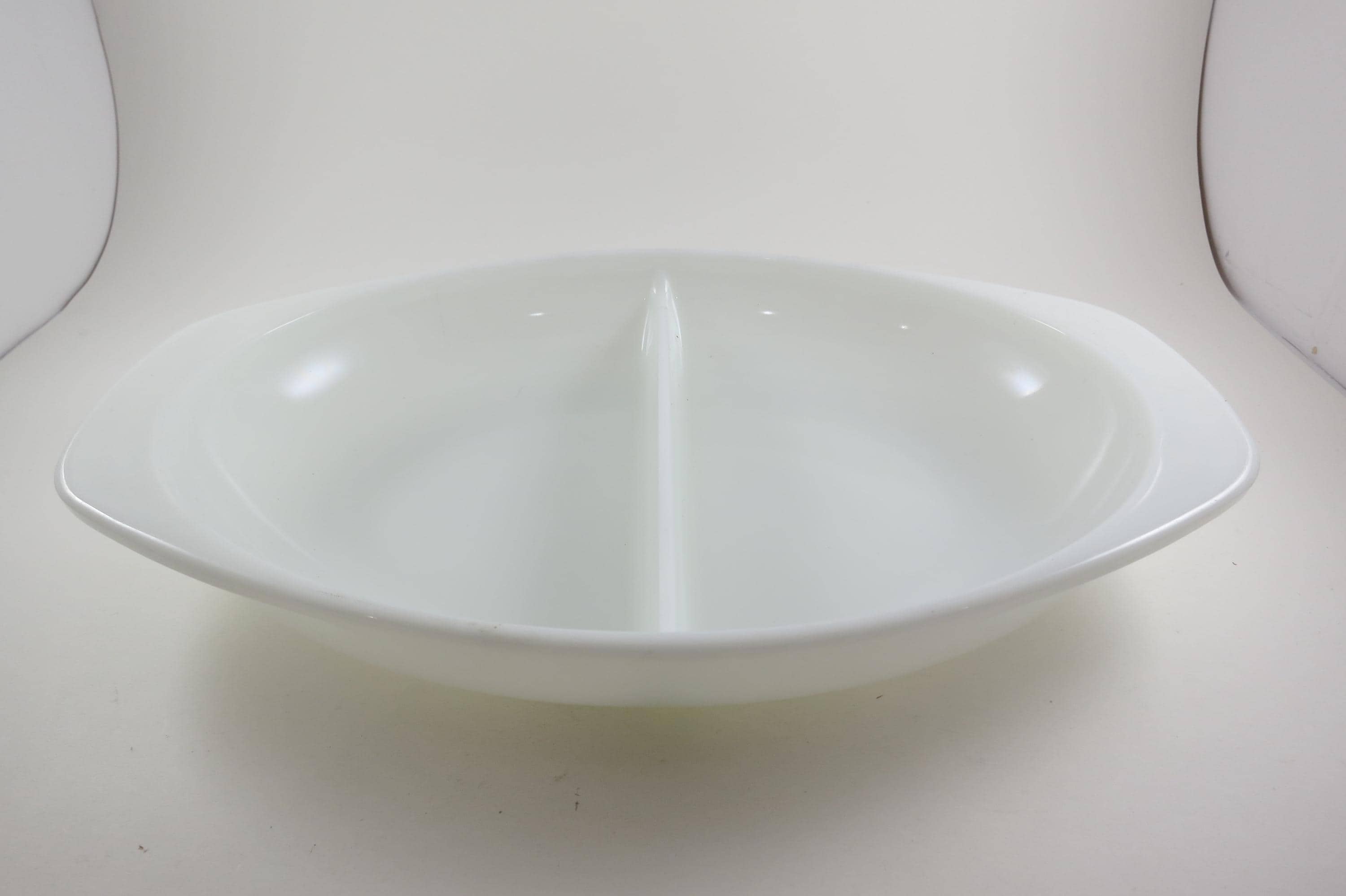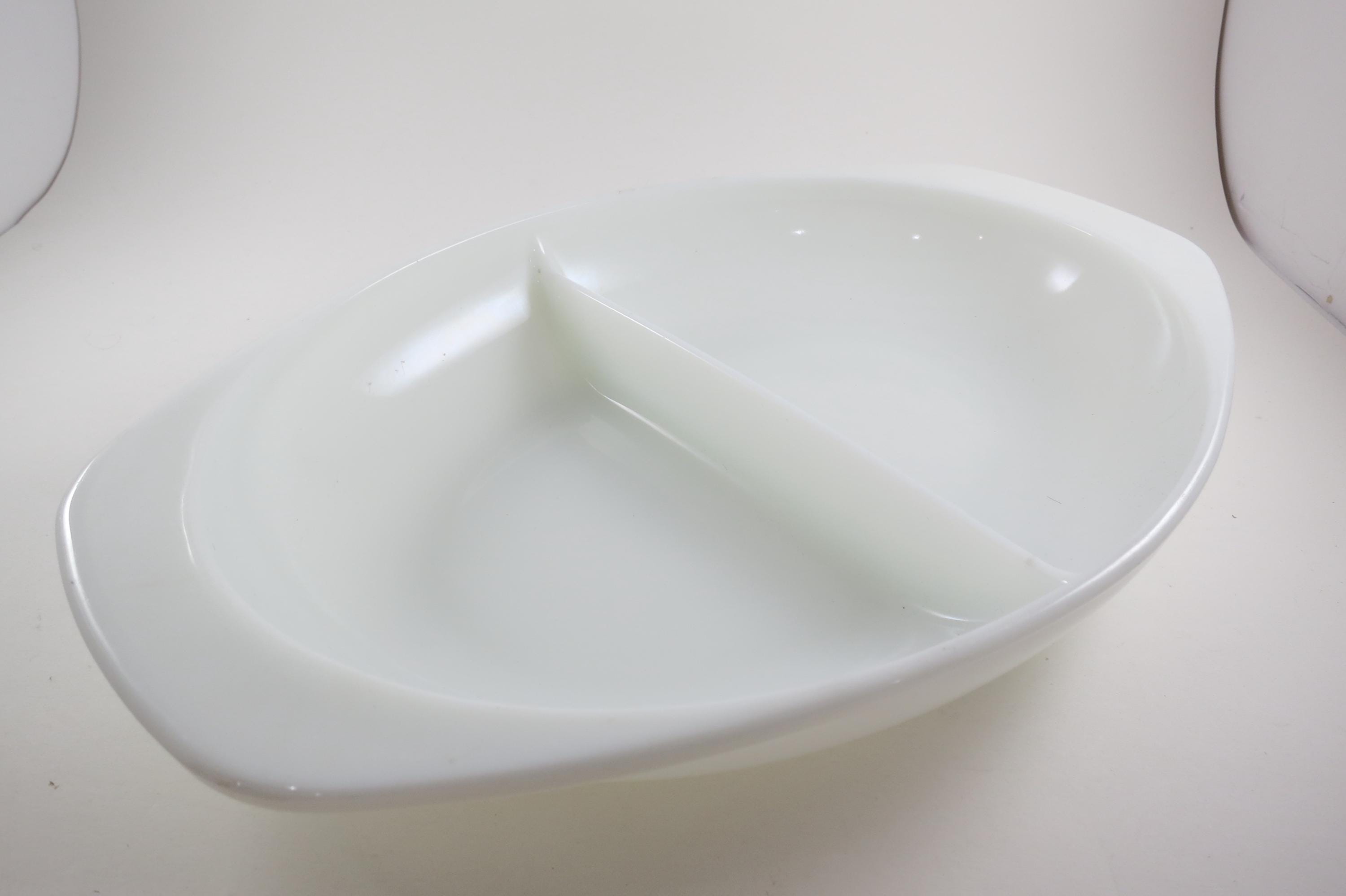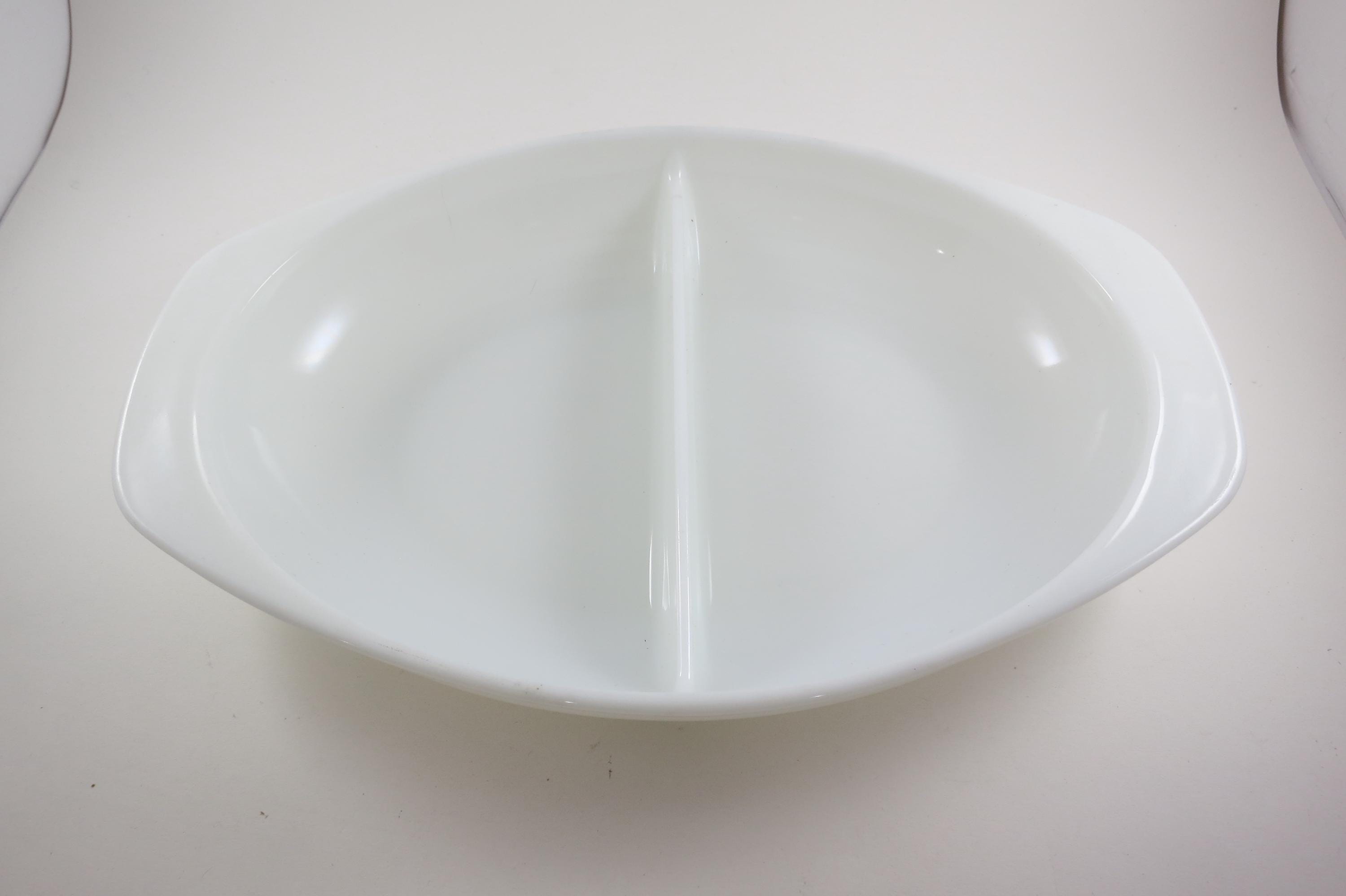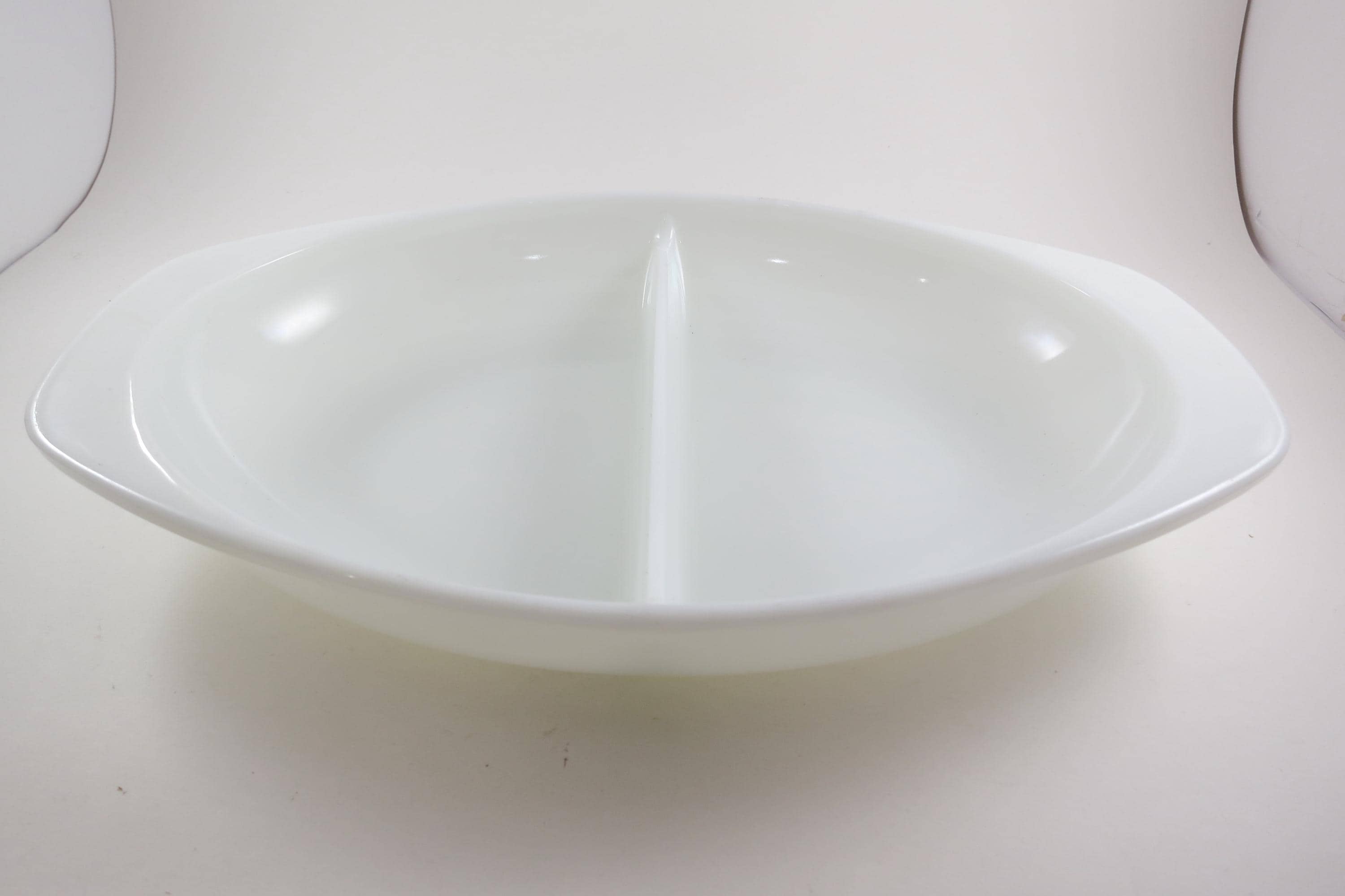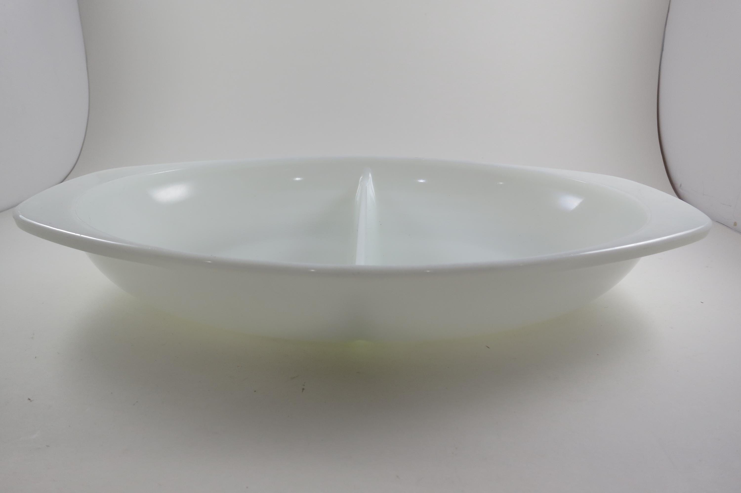 Pyrex Divided 1 1/2 Quart Divided Casserole Dish No 1063 Milk Glass Like New Condition. No damages, measures 13 inches long and 8 3/4 inches wide.