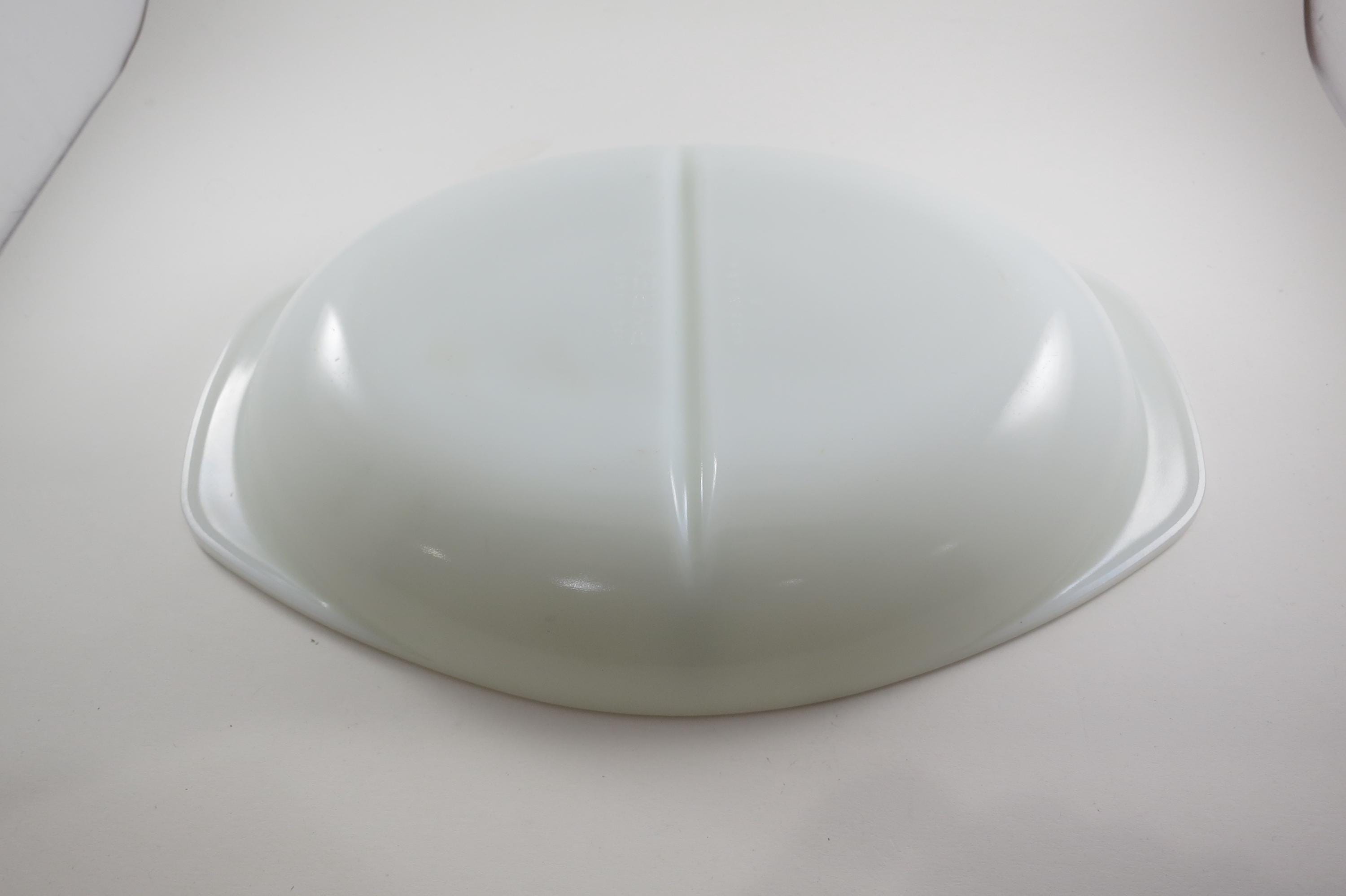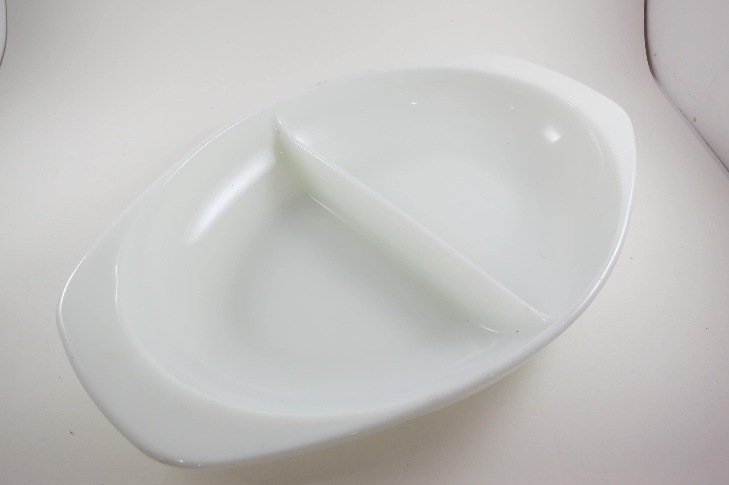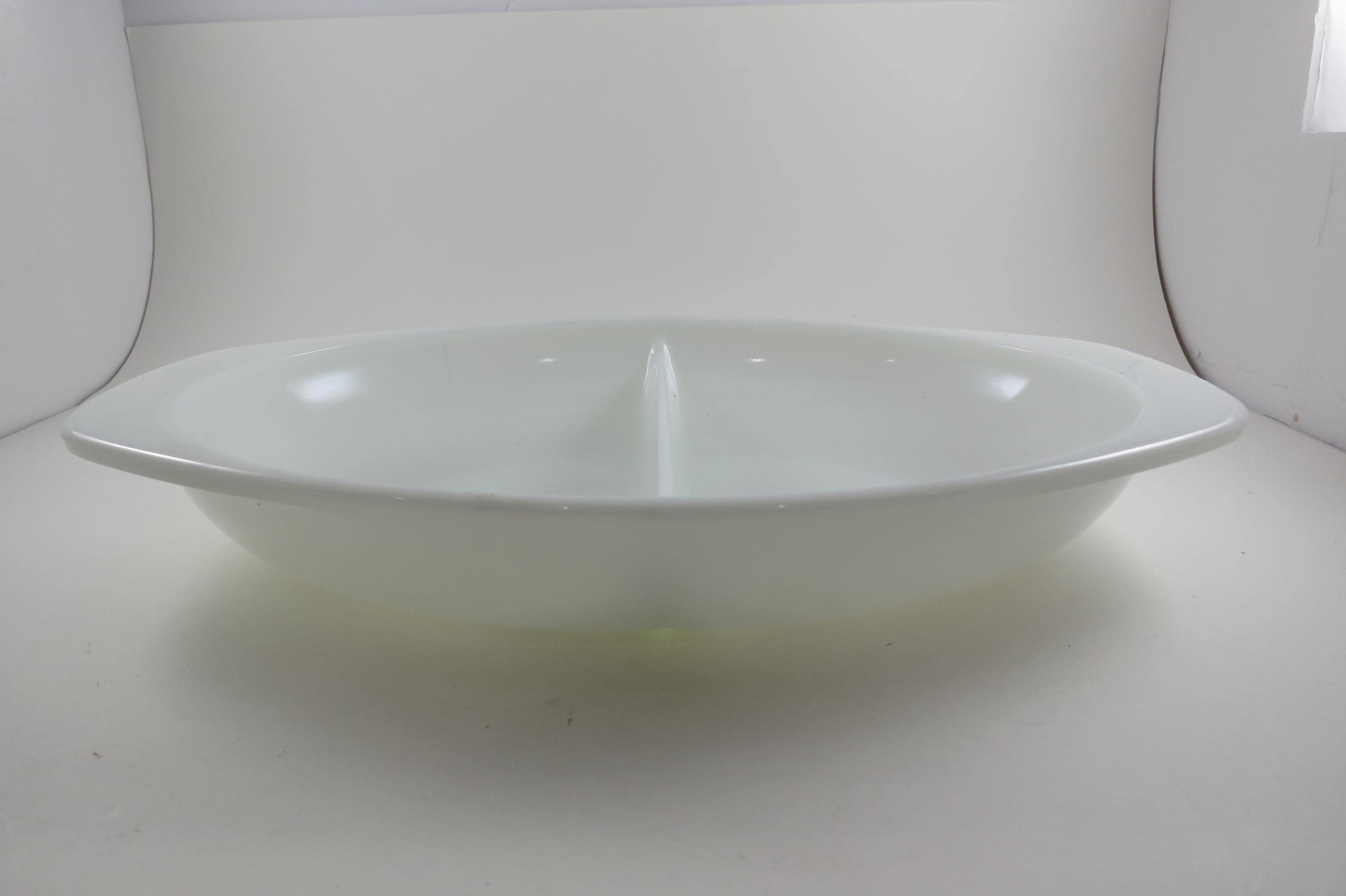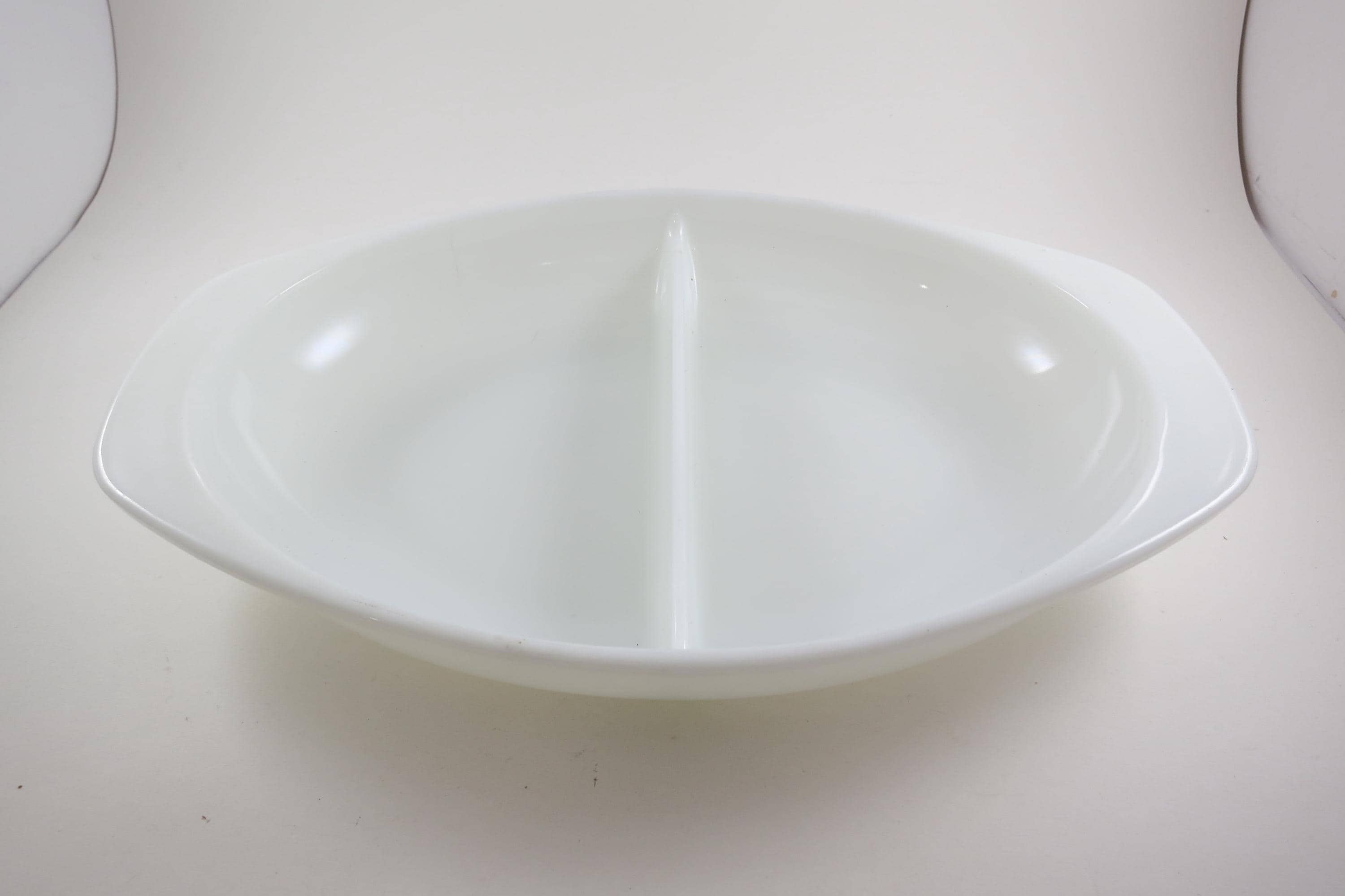Pyrex Divided 1 1/2 Quart Divided Casserole Dish No 1063 Milk Glass Like New Condition. No damages, measures 13 inches long and 8 3/4 inches wide.