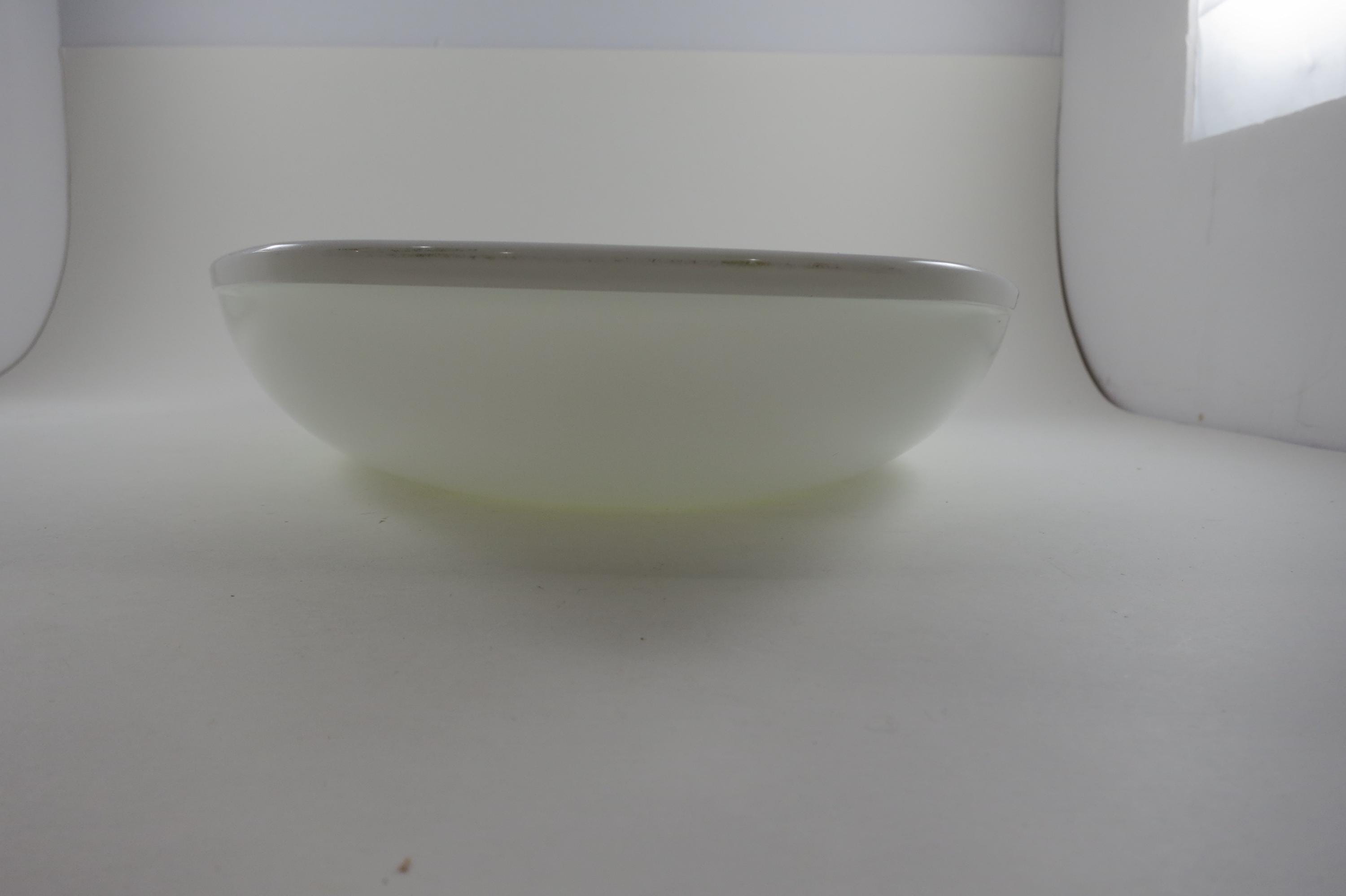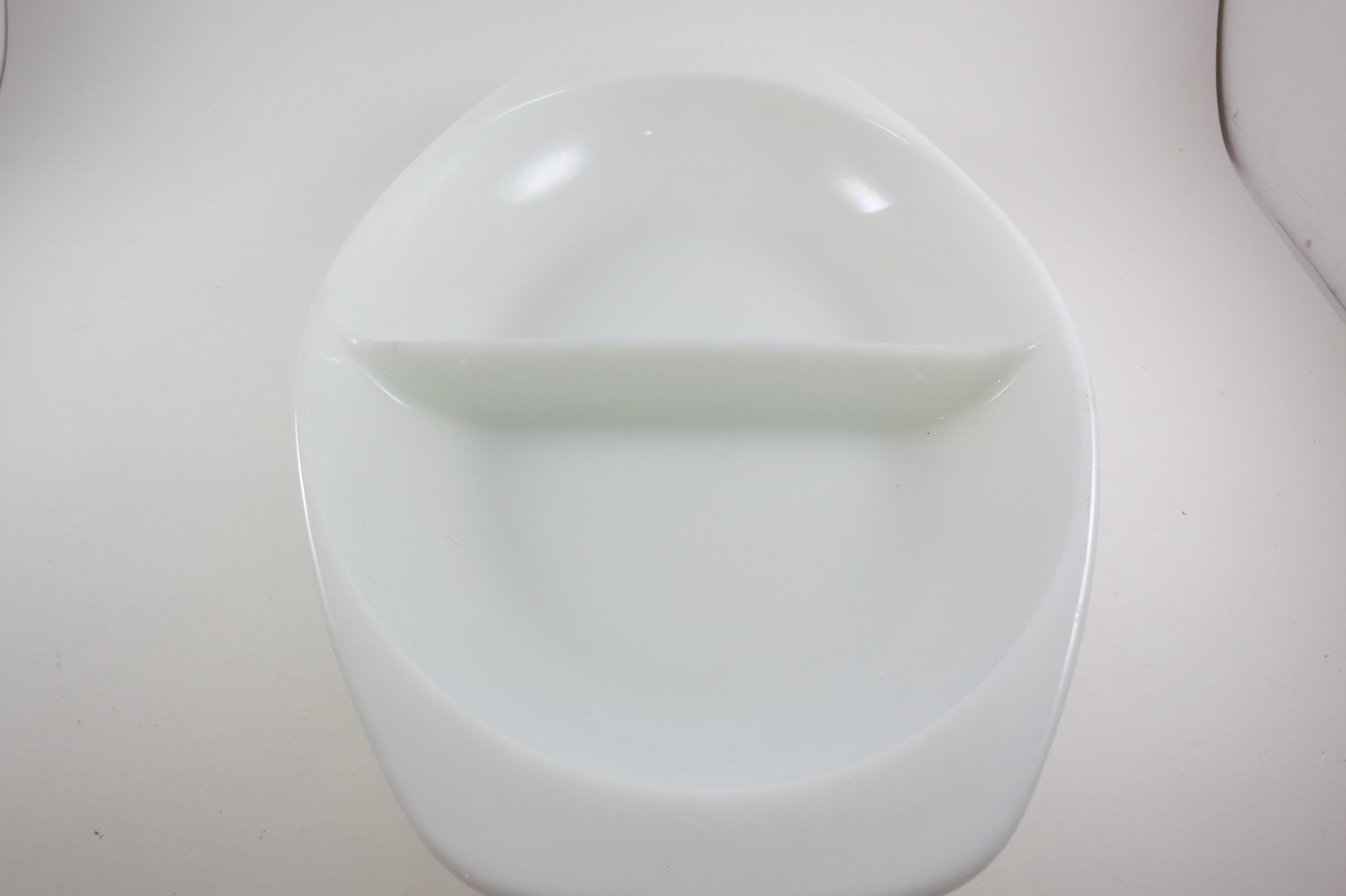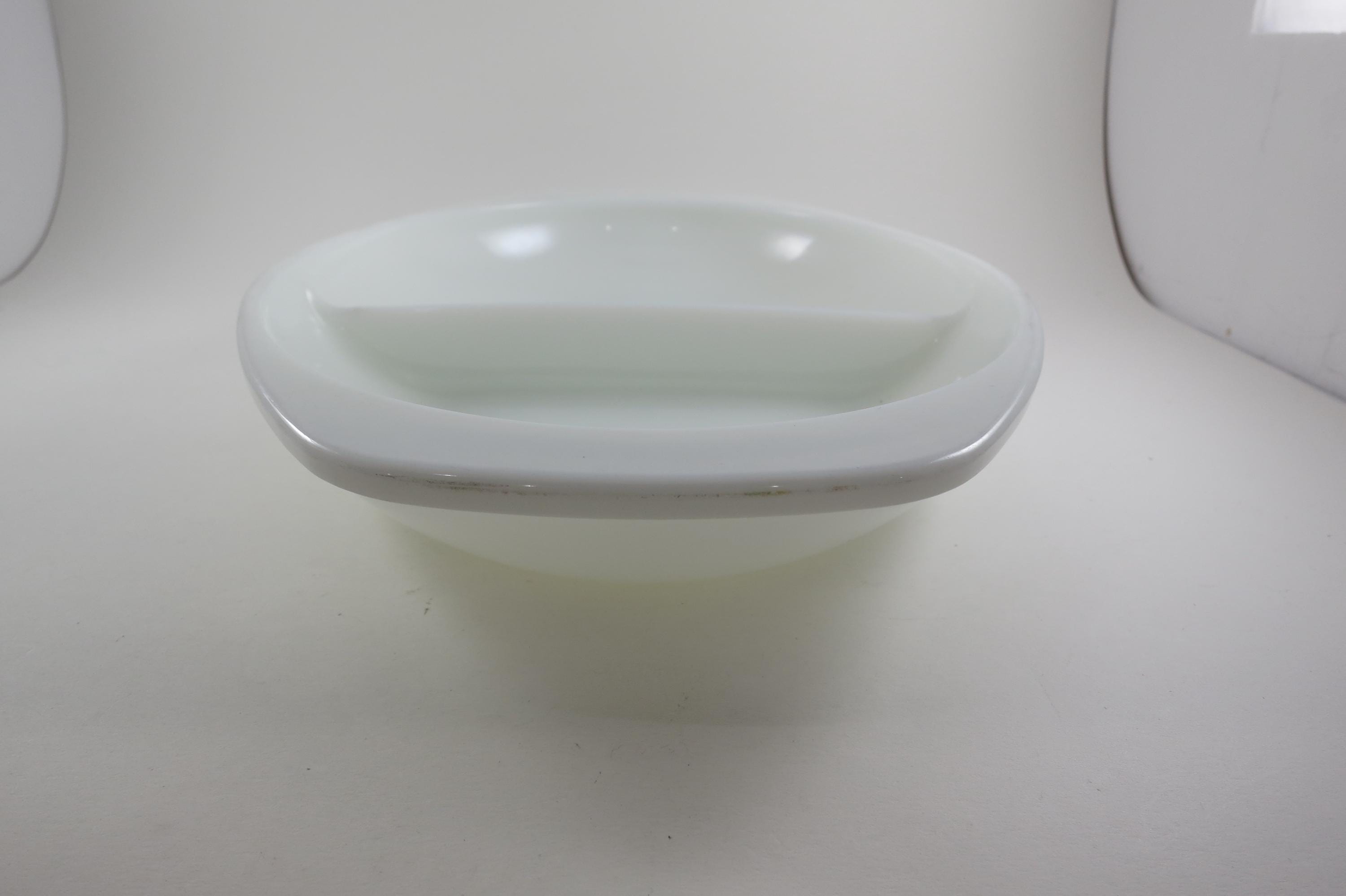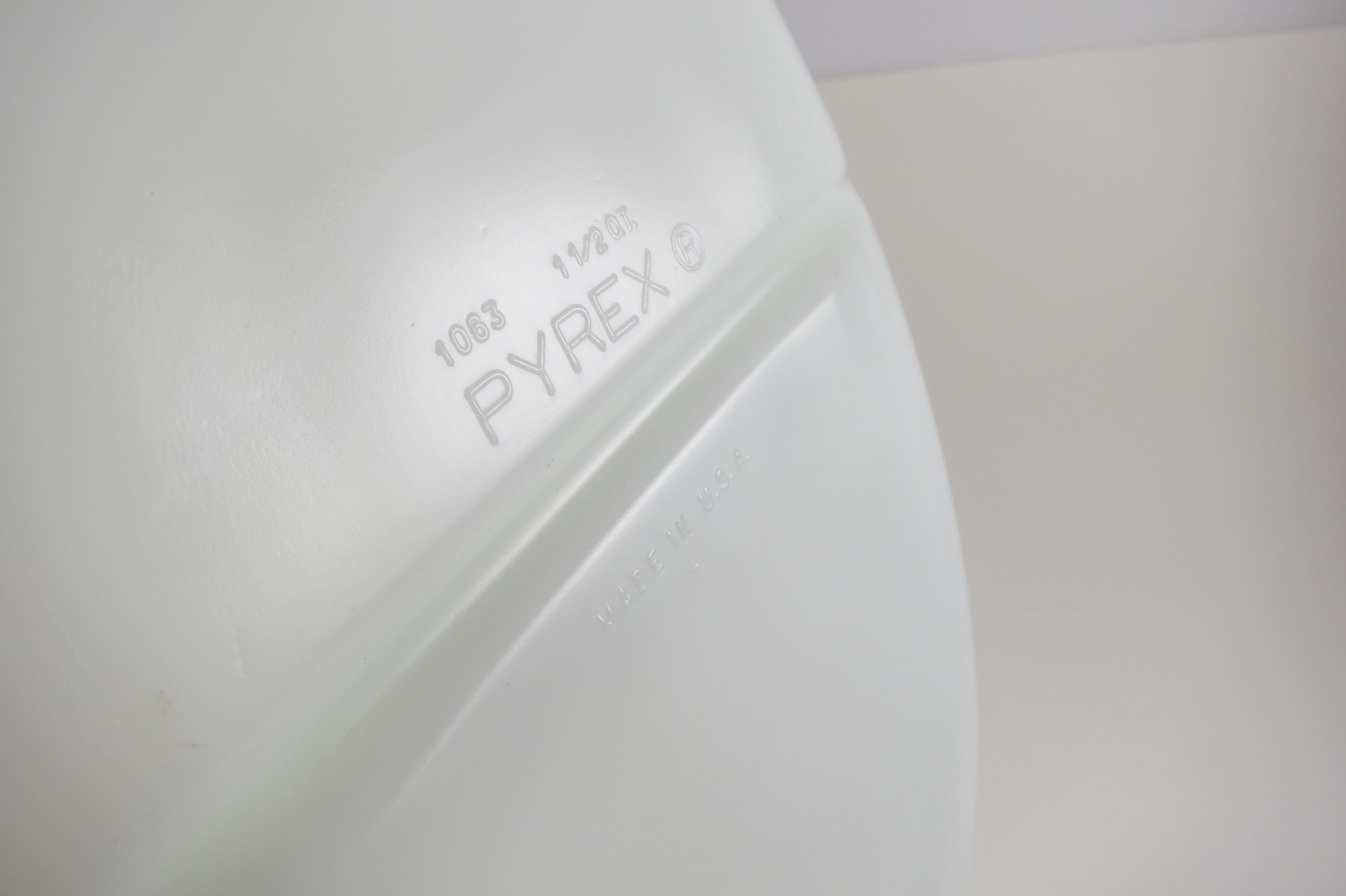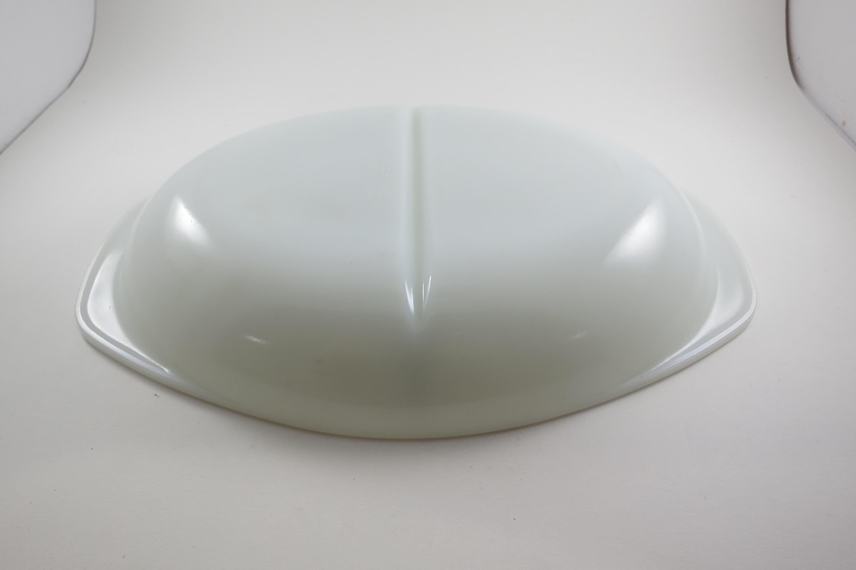 Pyrex Divided 1 1/2 Quart Divided Casserole Dish No 1063 Milk Glass Like New Condition. No damages, measures 13 inches long and 8 3/4 inches wide.