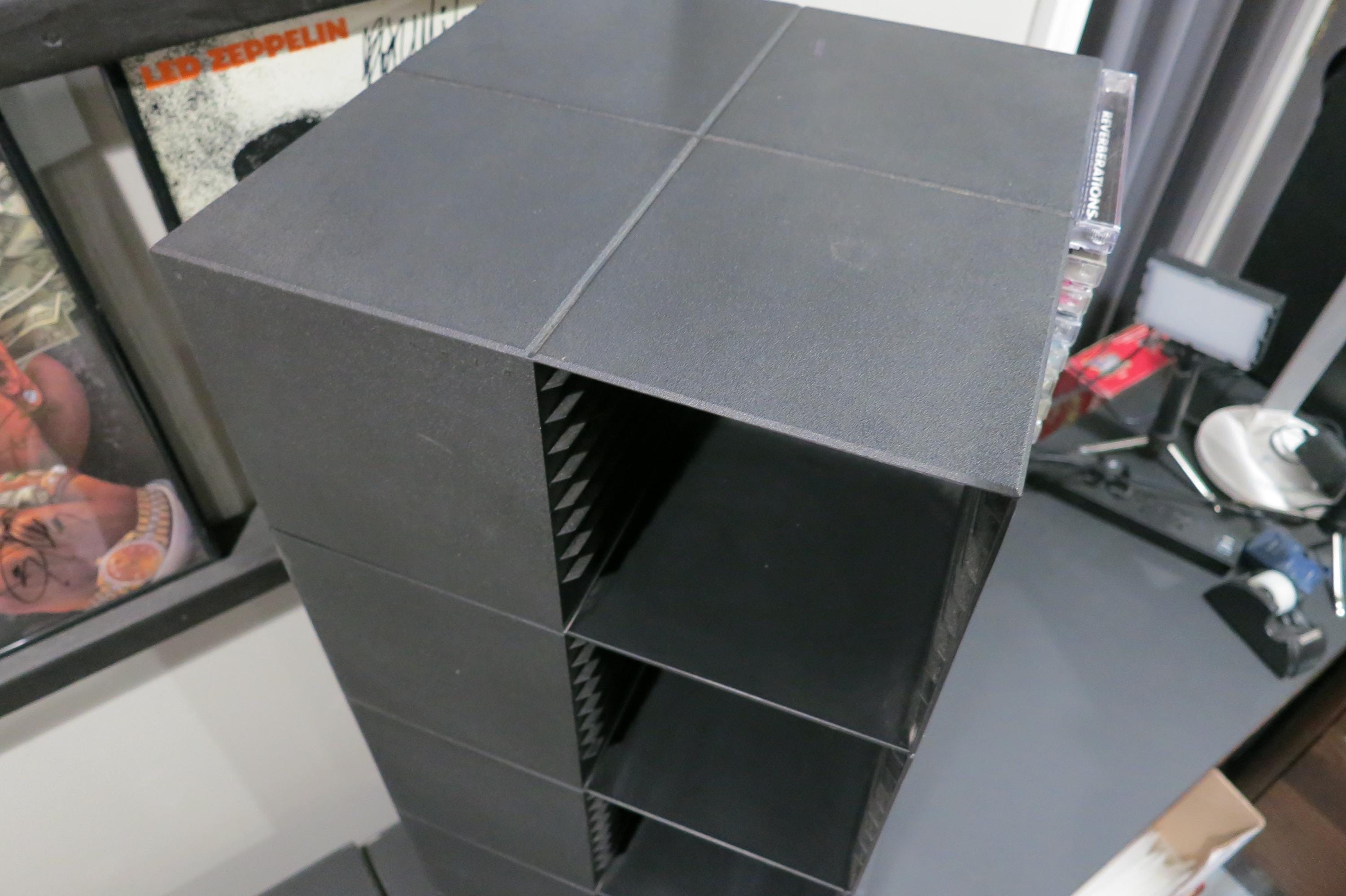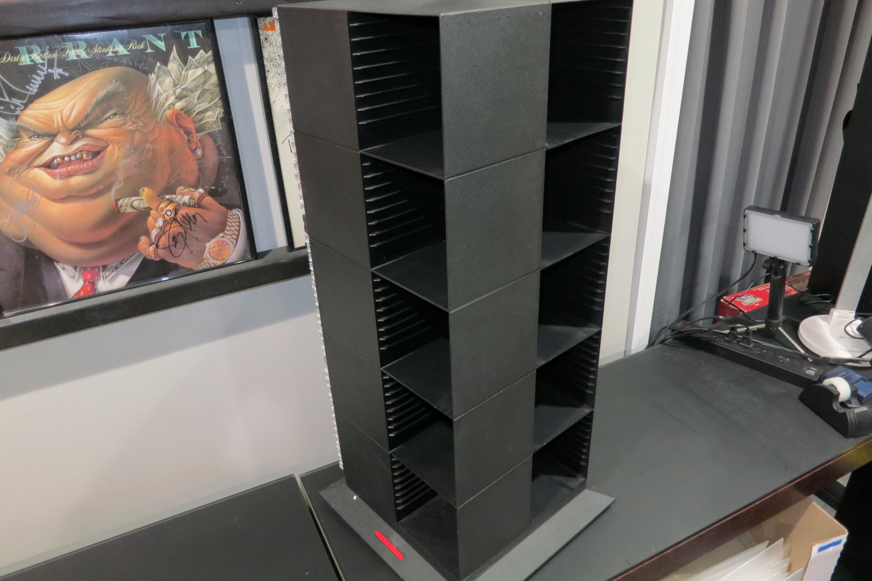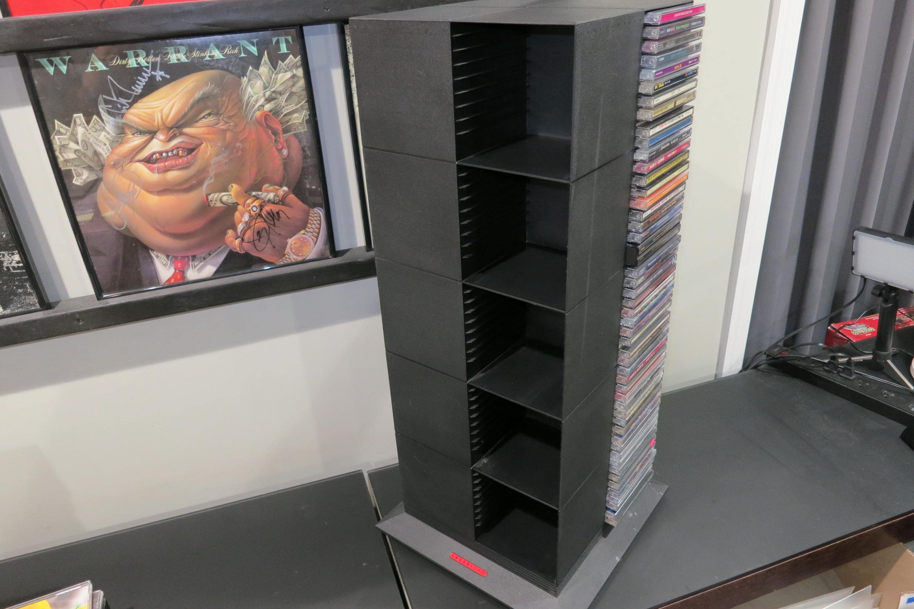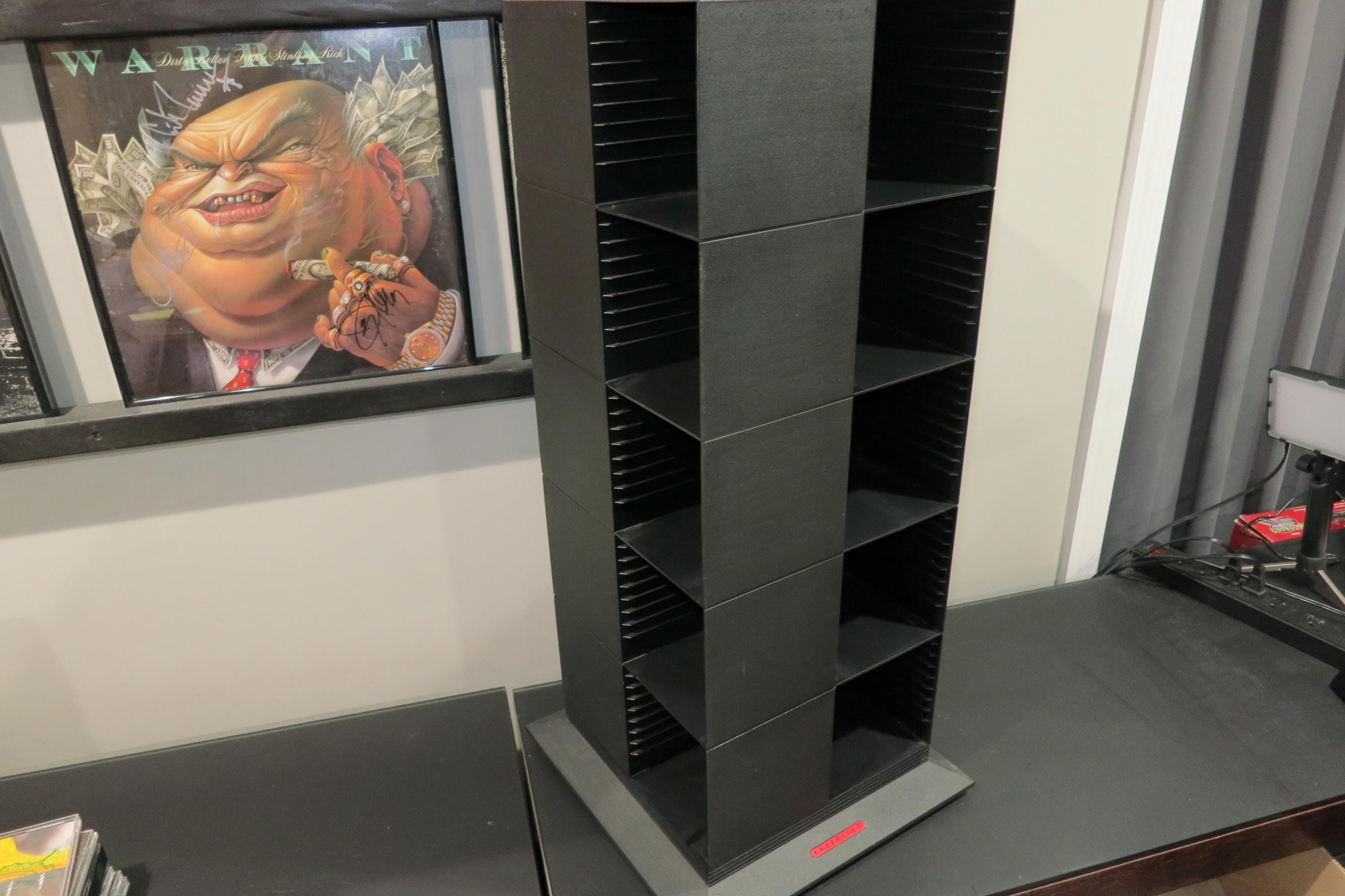1990's Black Laserline CD Floor Tower Mega Holder Rotating Base Holds 200 CD's. Rotating base to easily view your cd's. This was the biggest of the day by Laserline, it is a free standing floor (or table) model with rotating base. Each side holds 40 regular sized disc's and 5 oversized, for a total of 160 standard disc's and 20 doubles. (Or any combination you need, up to 200) Tower measures 28 inches tall, base measures 13x13. Great looking holder for your home or a perfect gift!!