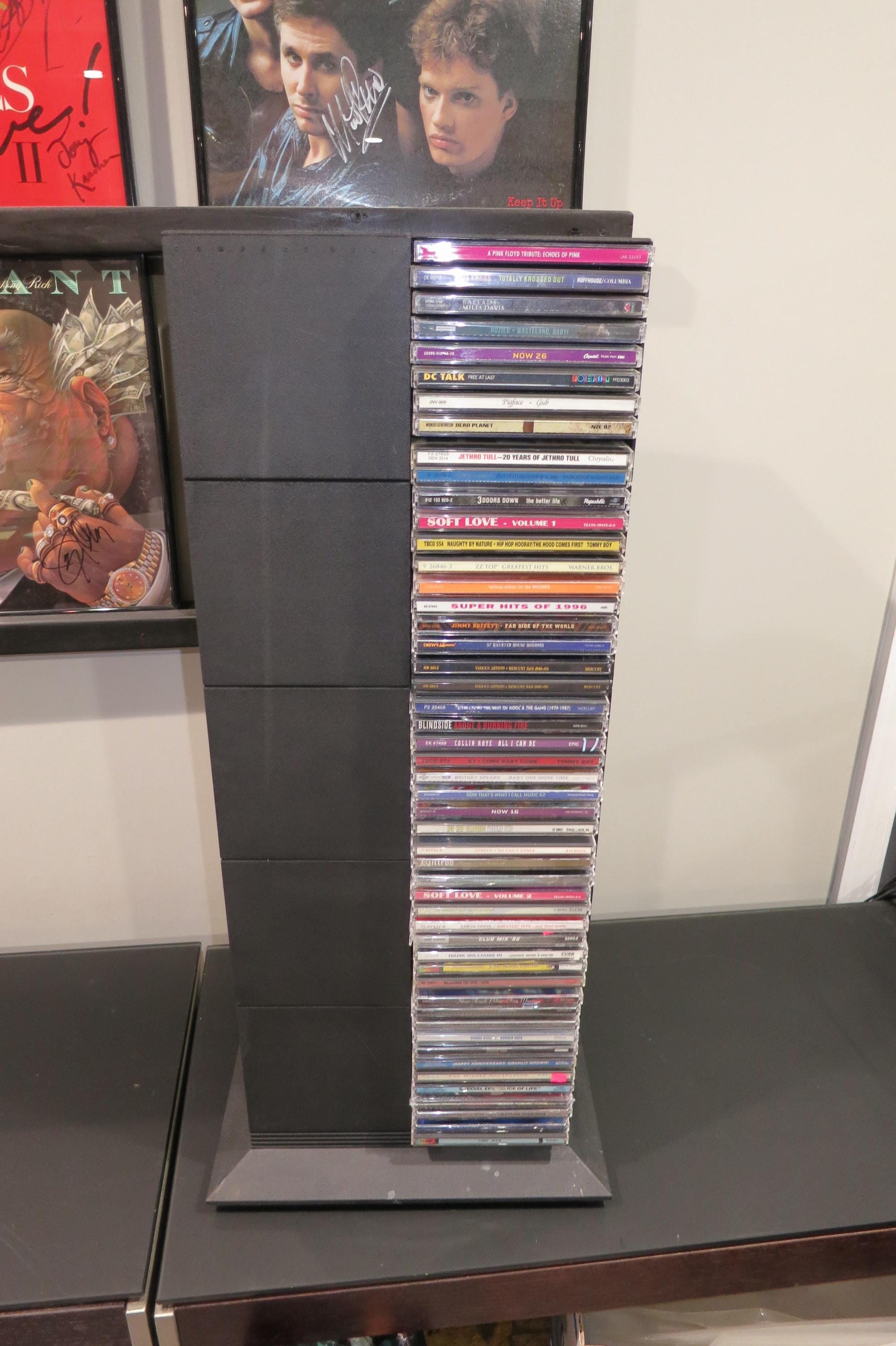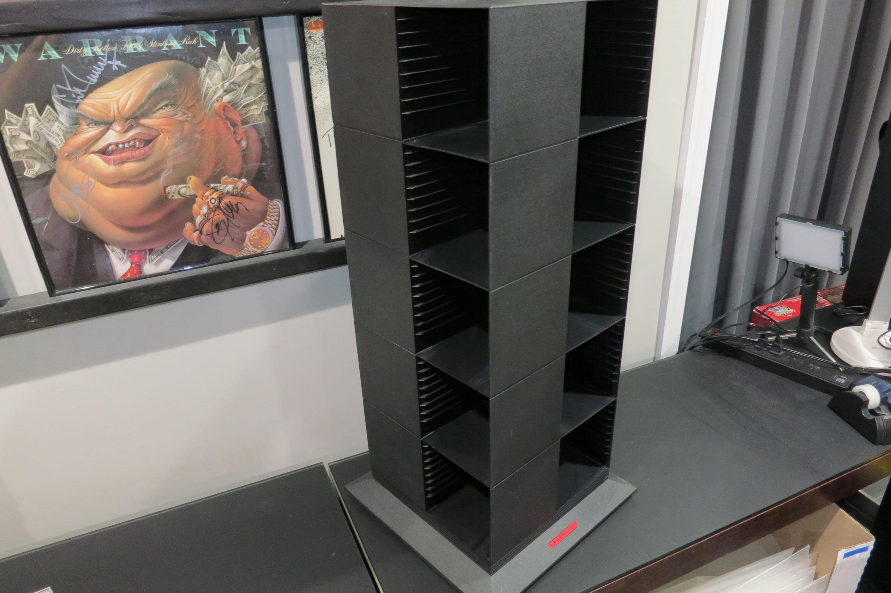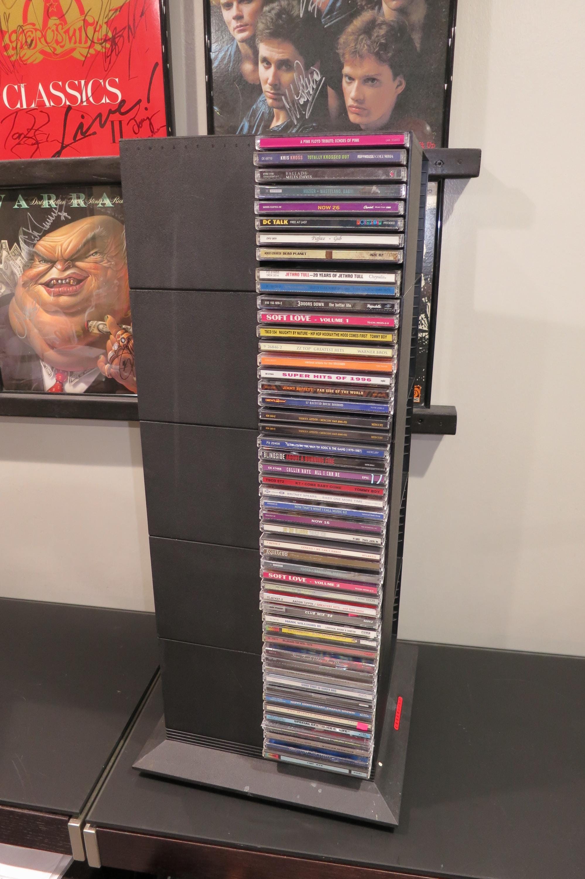 1990's Black Laserline CD Floor Tower Mega Holder Rotating Base Holds 200 CD's. Rotating base to easily view your cd's. This was the biggest of the day by Laserline, it is a free standing floor (or table) model with rotating base. Each side holds 40 regular sized disc's and 5 oversized, for a total of 160 standard disc's and 20 doubles. (Or any combination you need, up to 200) Tower measures 28 inches tall, base measures 13x13. Great looking holder for your home or a perfect gift!!