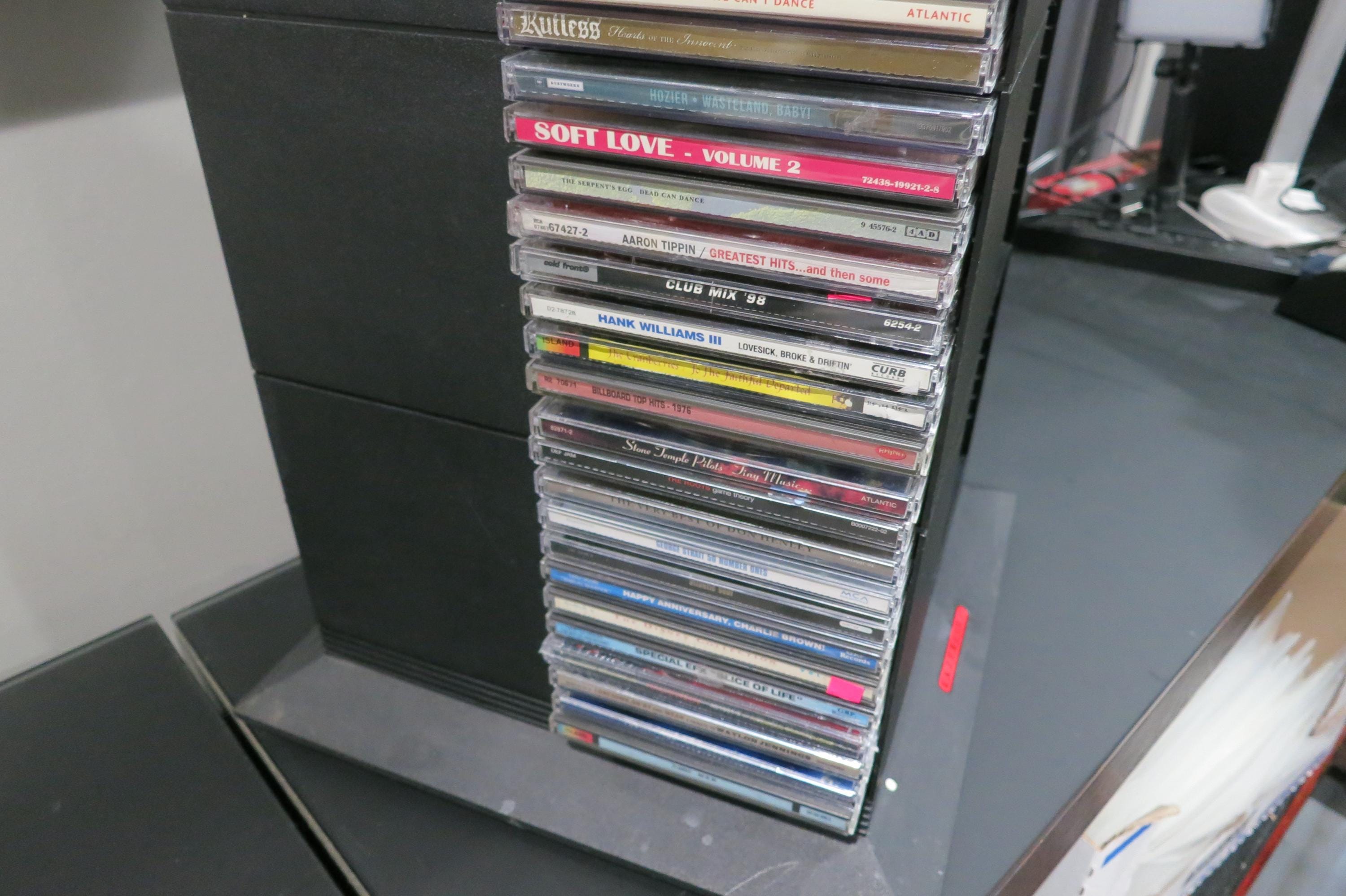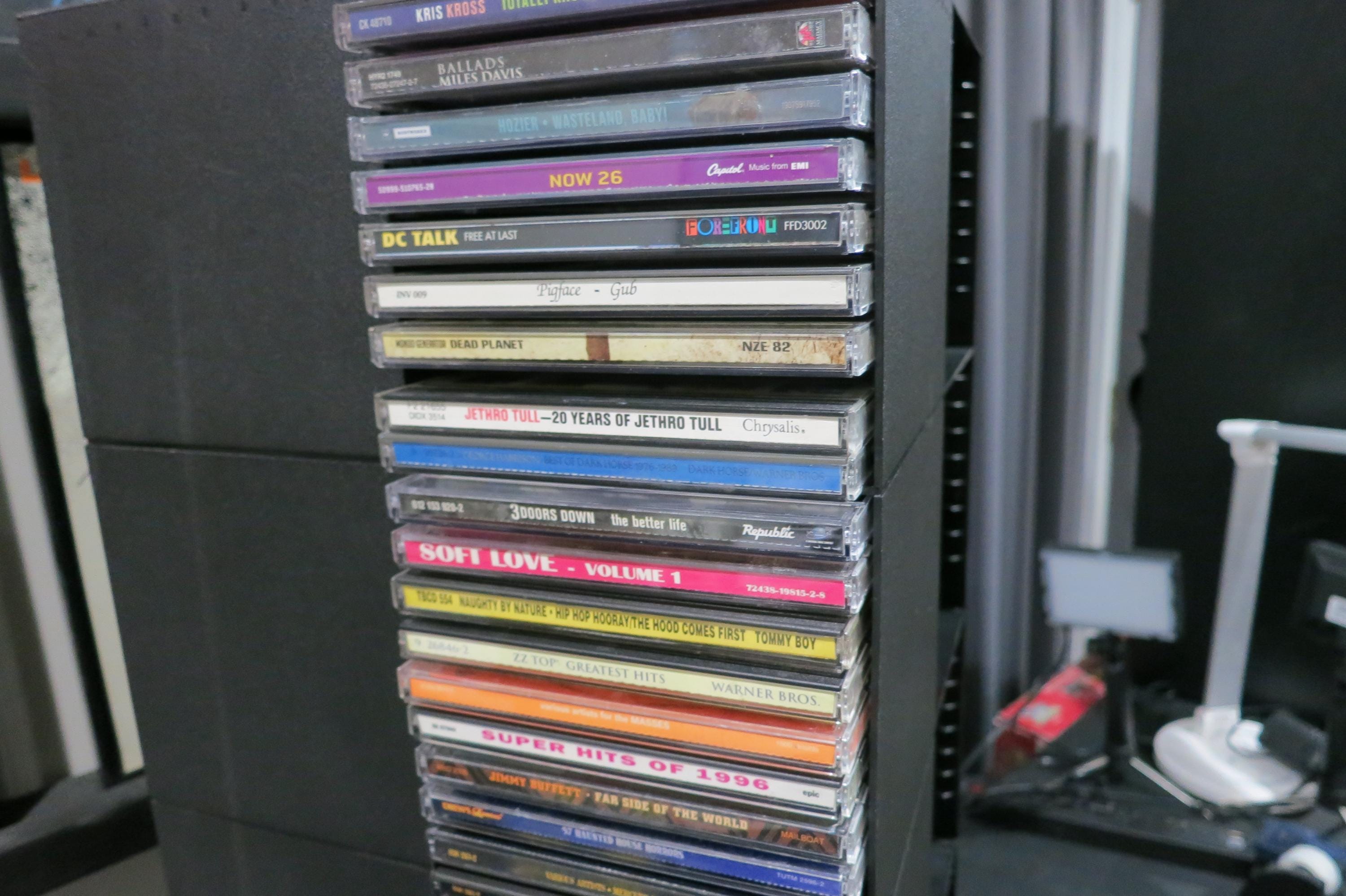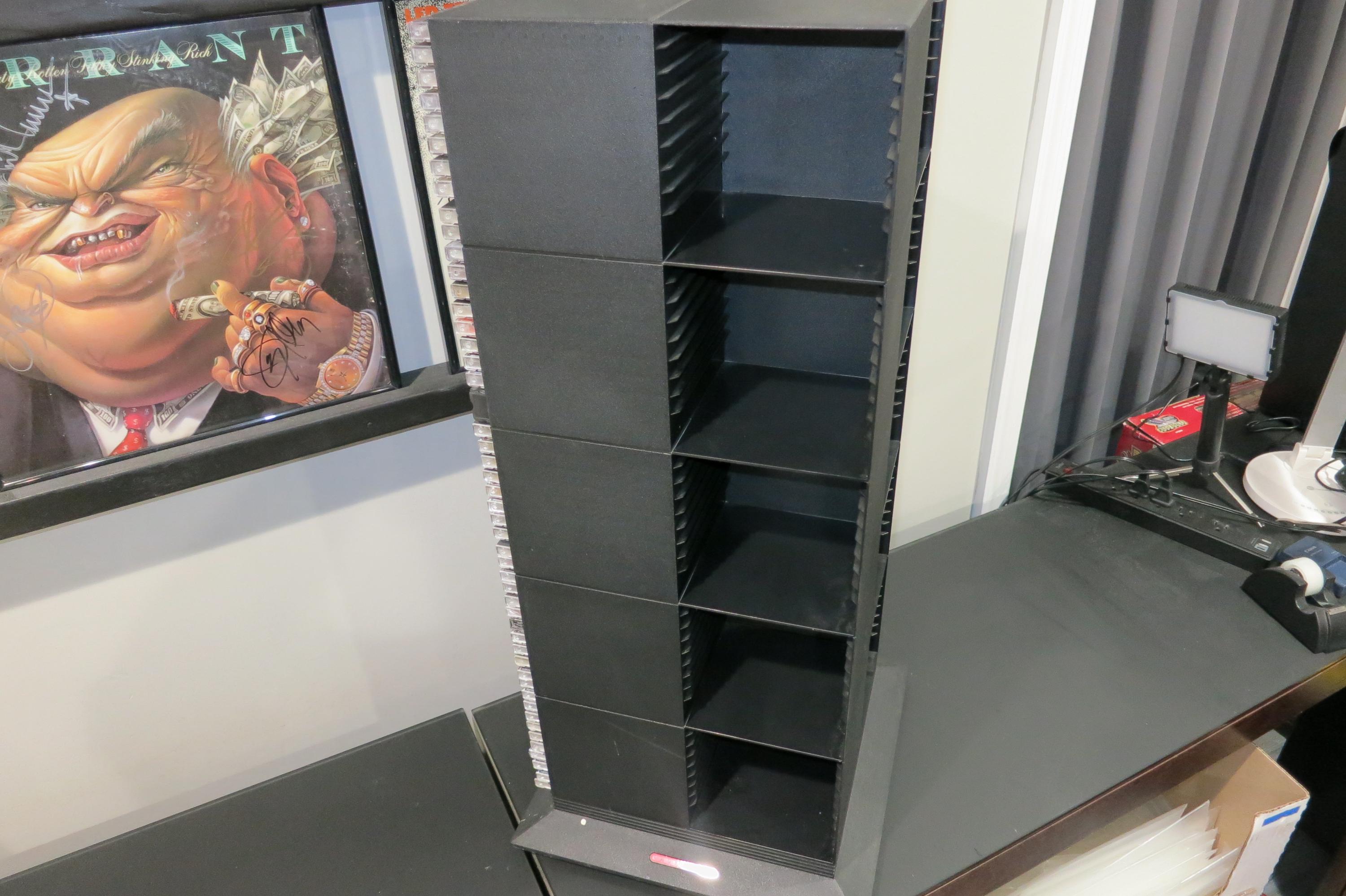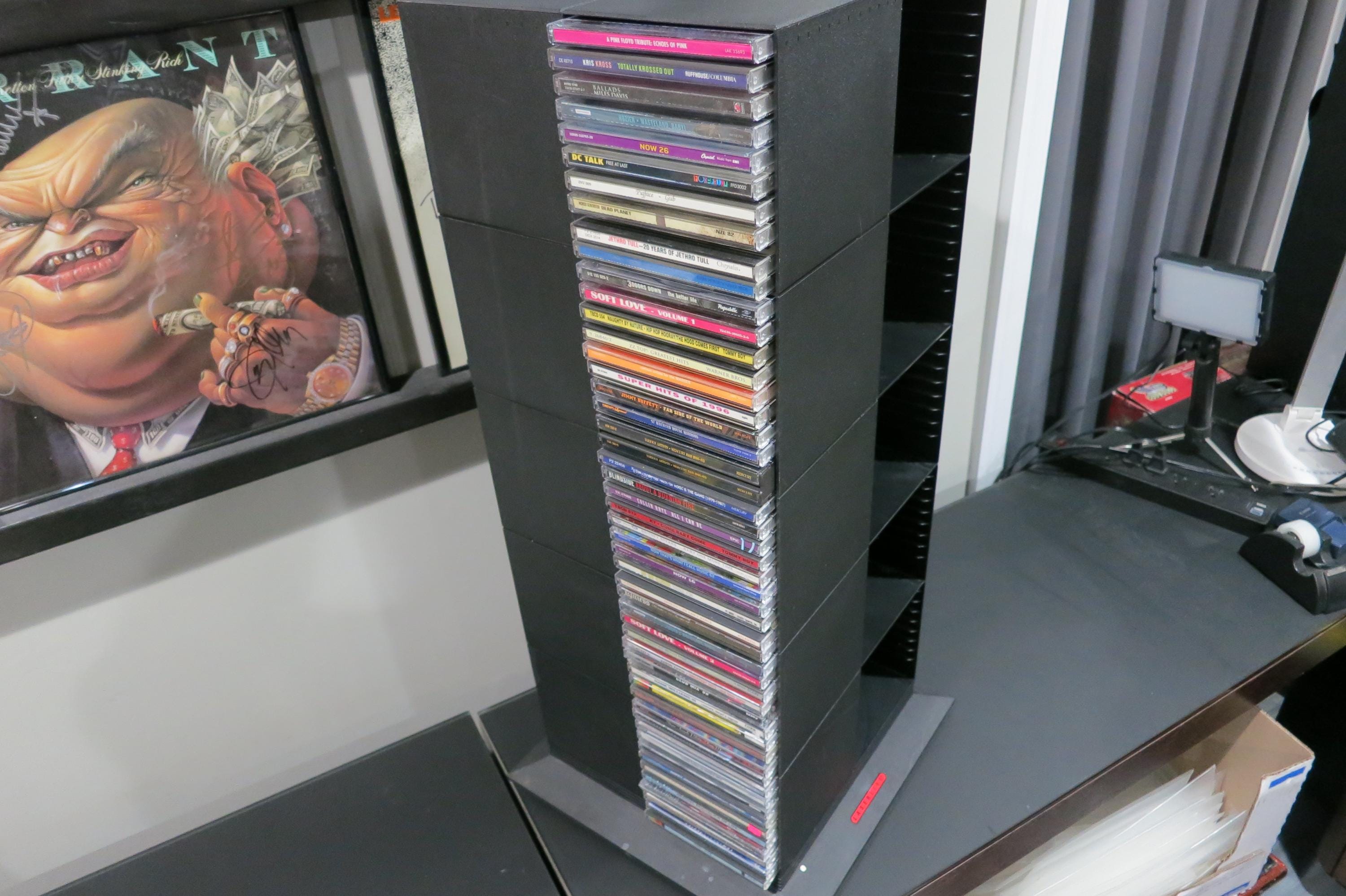1990's Black Laserline CD Floor Tower Mega Holder Rotating Base Holds 200 CD's. Rotating base to easily view your cd's. This was the biggest of the day by Laserline, it is a free standing floor (or table) model with rotating base. Each side holds 40 regular sized disc's and 5 oversized, for a total of 160 standard disc's and 20 doubles. (Or any combination you need, up to 200) Tower measures 28 inches tall, base measures 13x13. Great looking holder for your home or a perfect gift!!