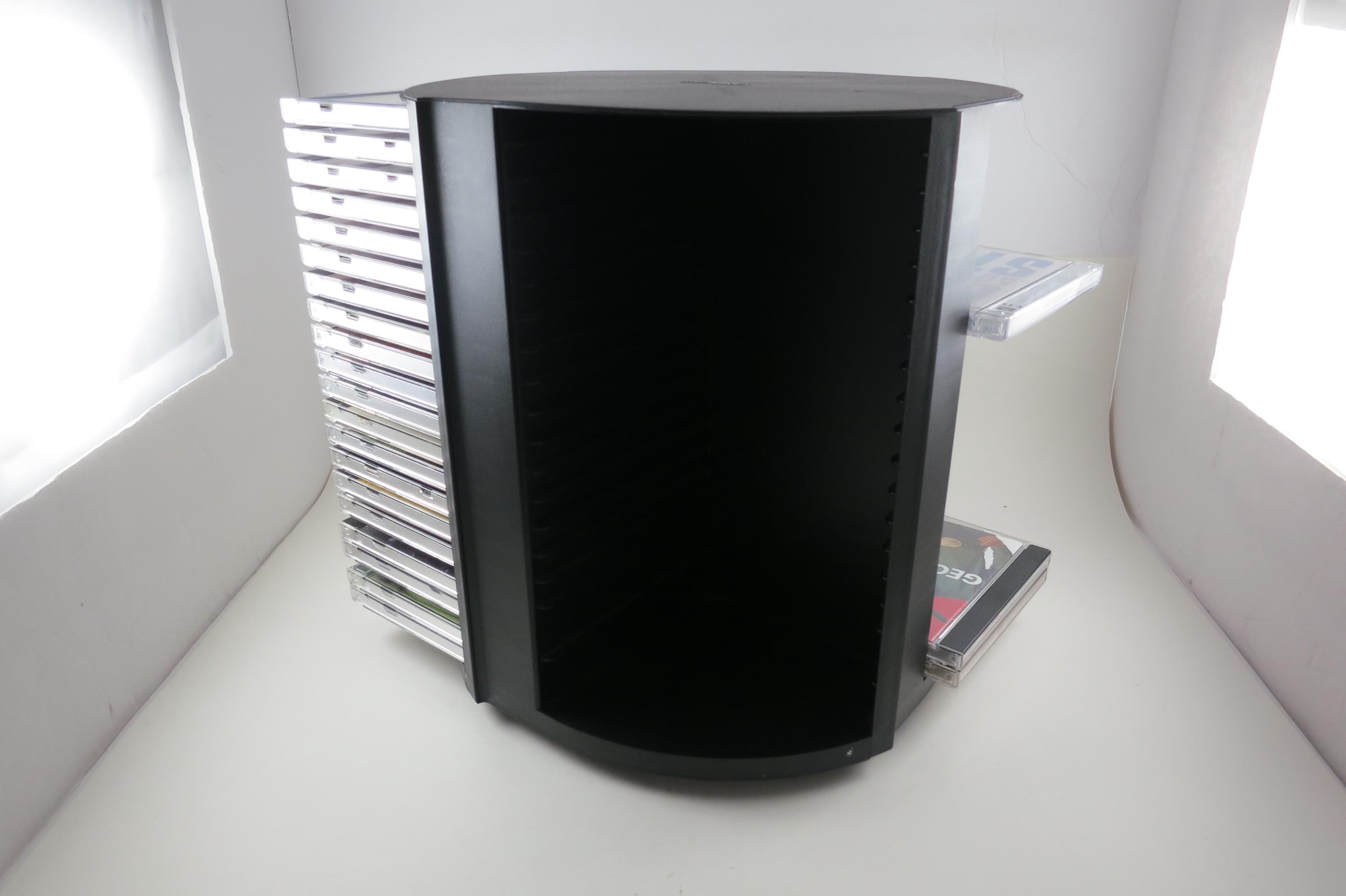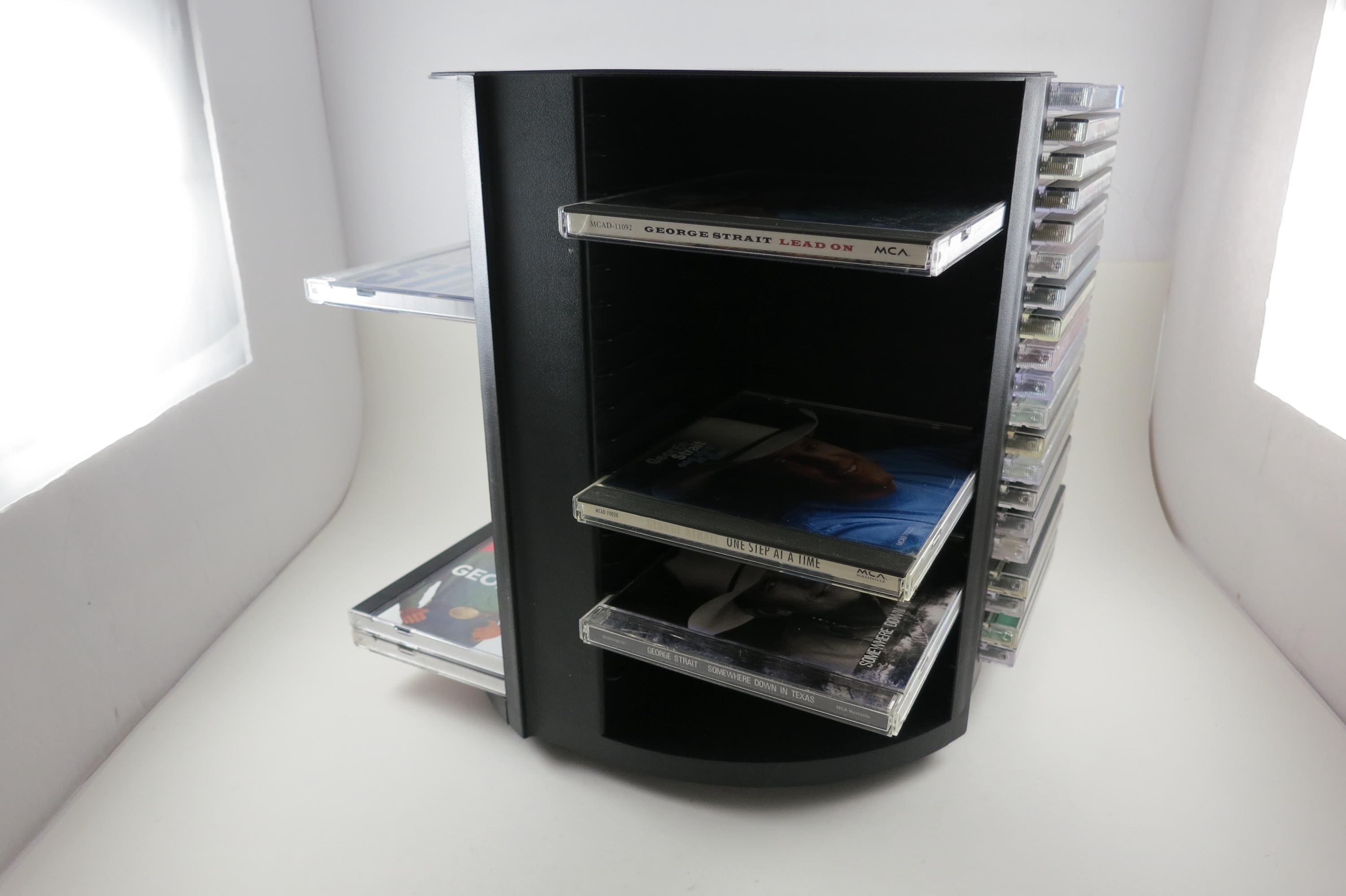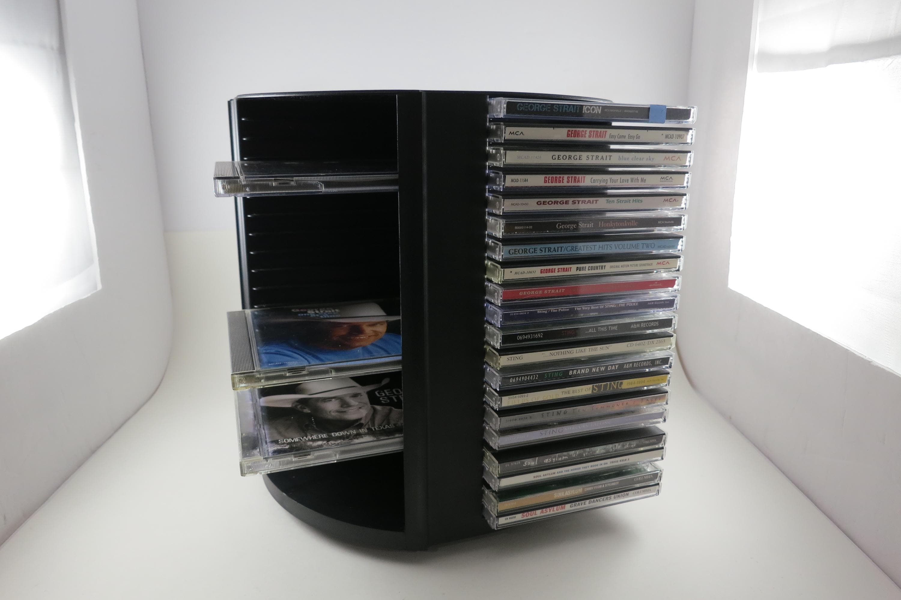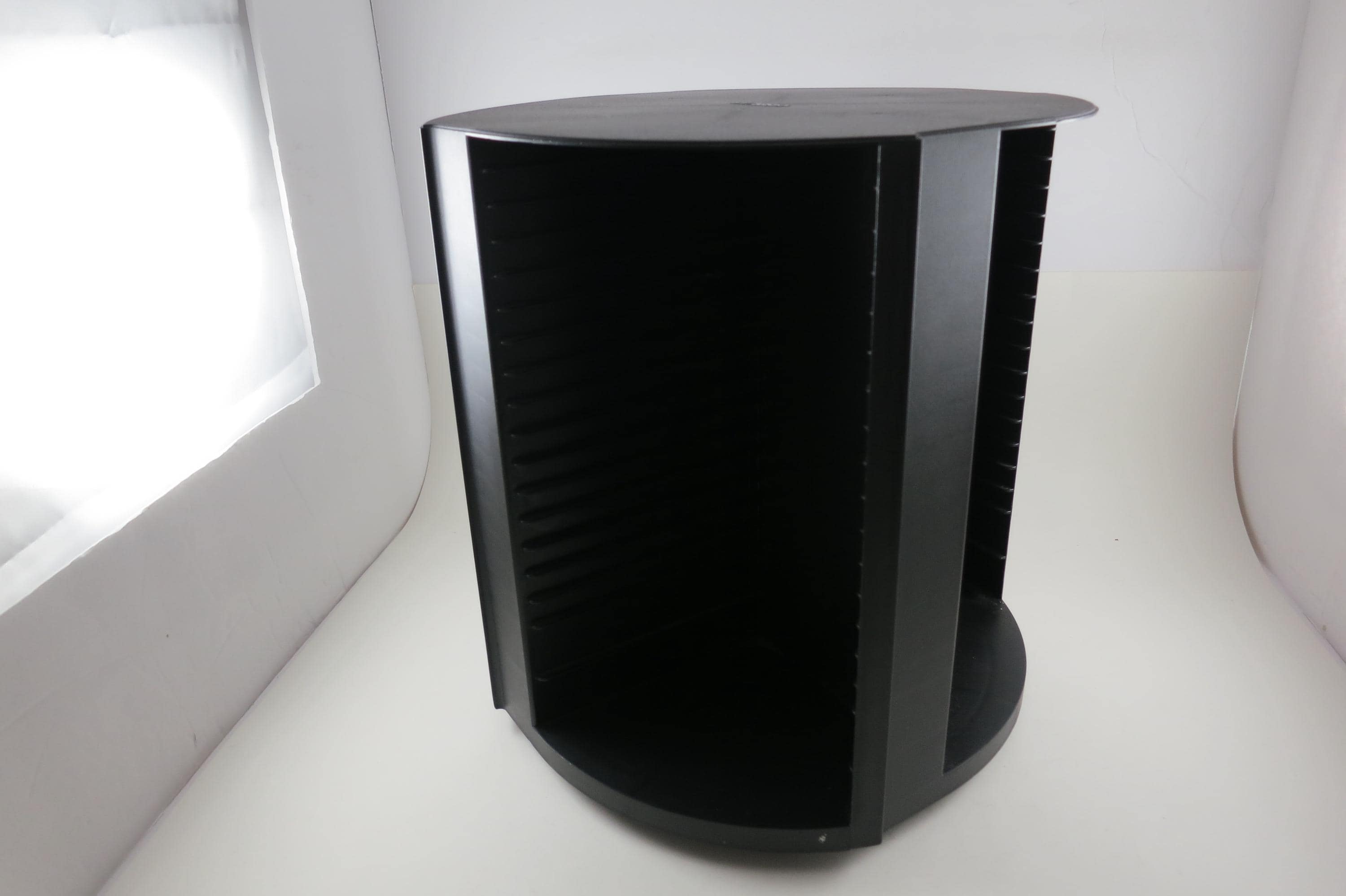 1990's Black Laserline CD Holder Rotating Base Holds 80 Disc's . Rotating base to easily view your cd's. Each side holds 20 disc's, for a total of 80. Measures 11 1/4 inches tall, 12 inches wide. Great gift and perfect to hold your CD's. Can hold up to 8 Doubles.