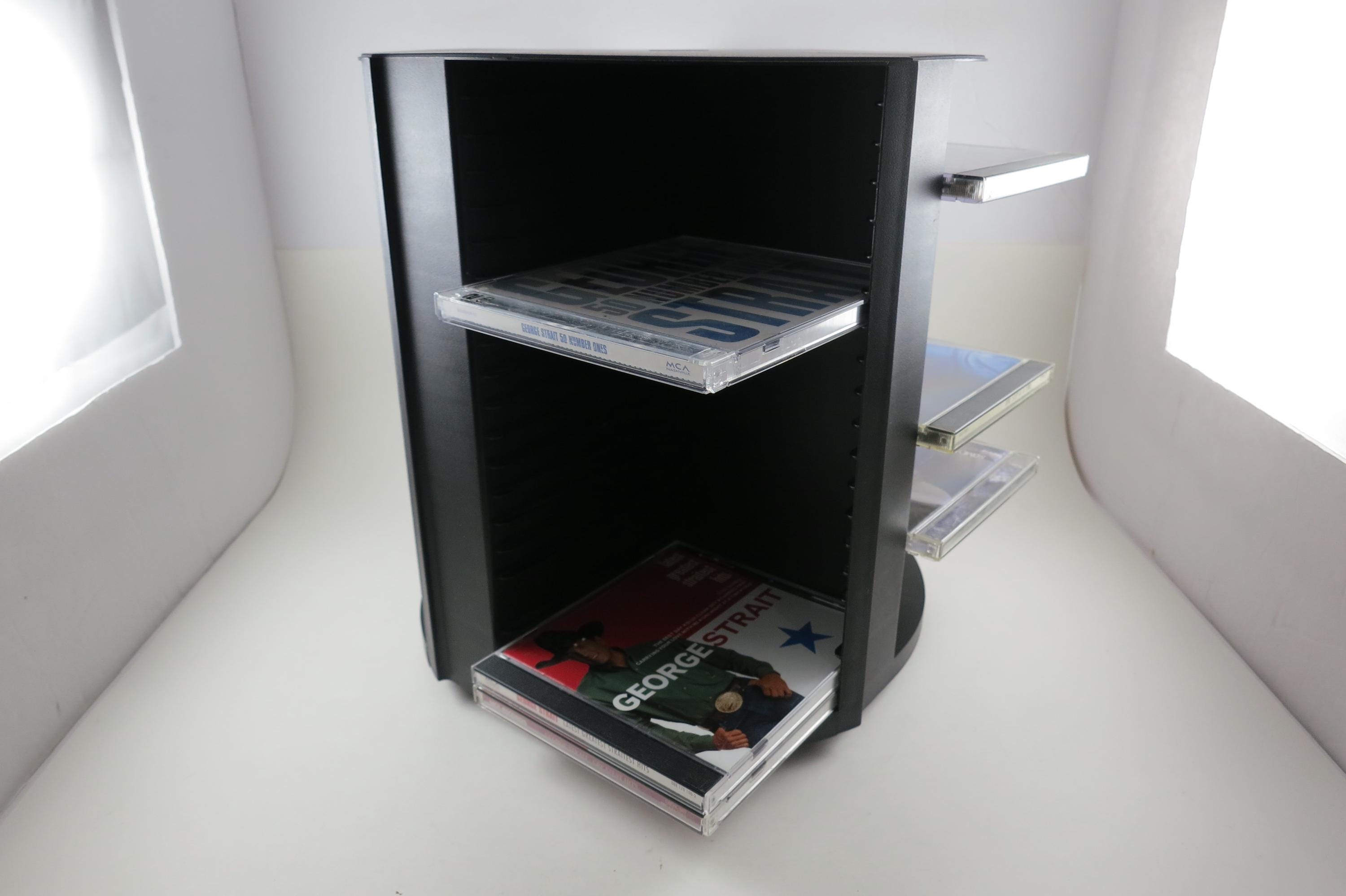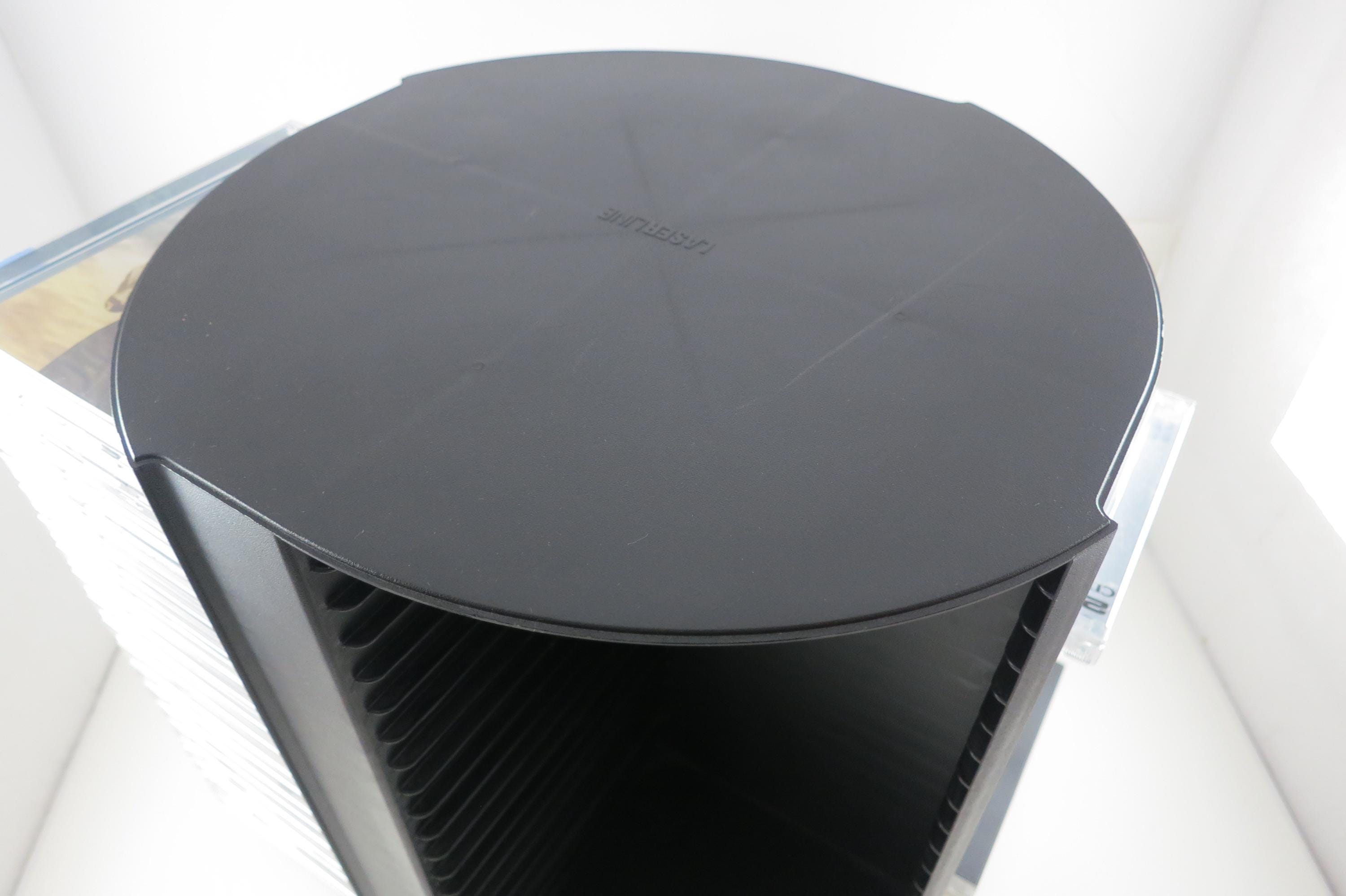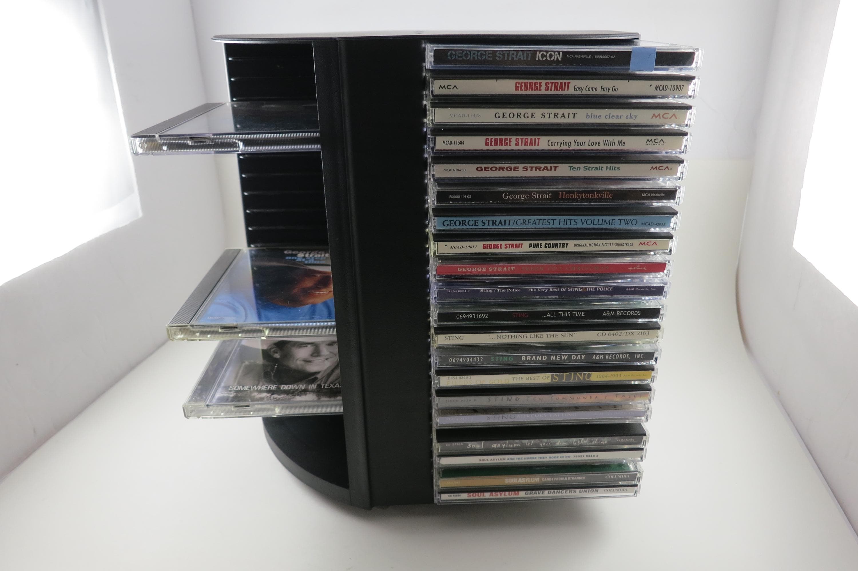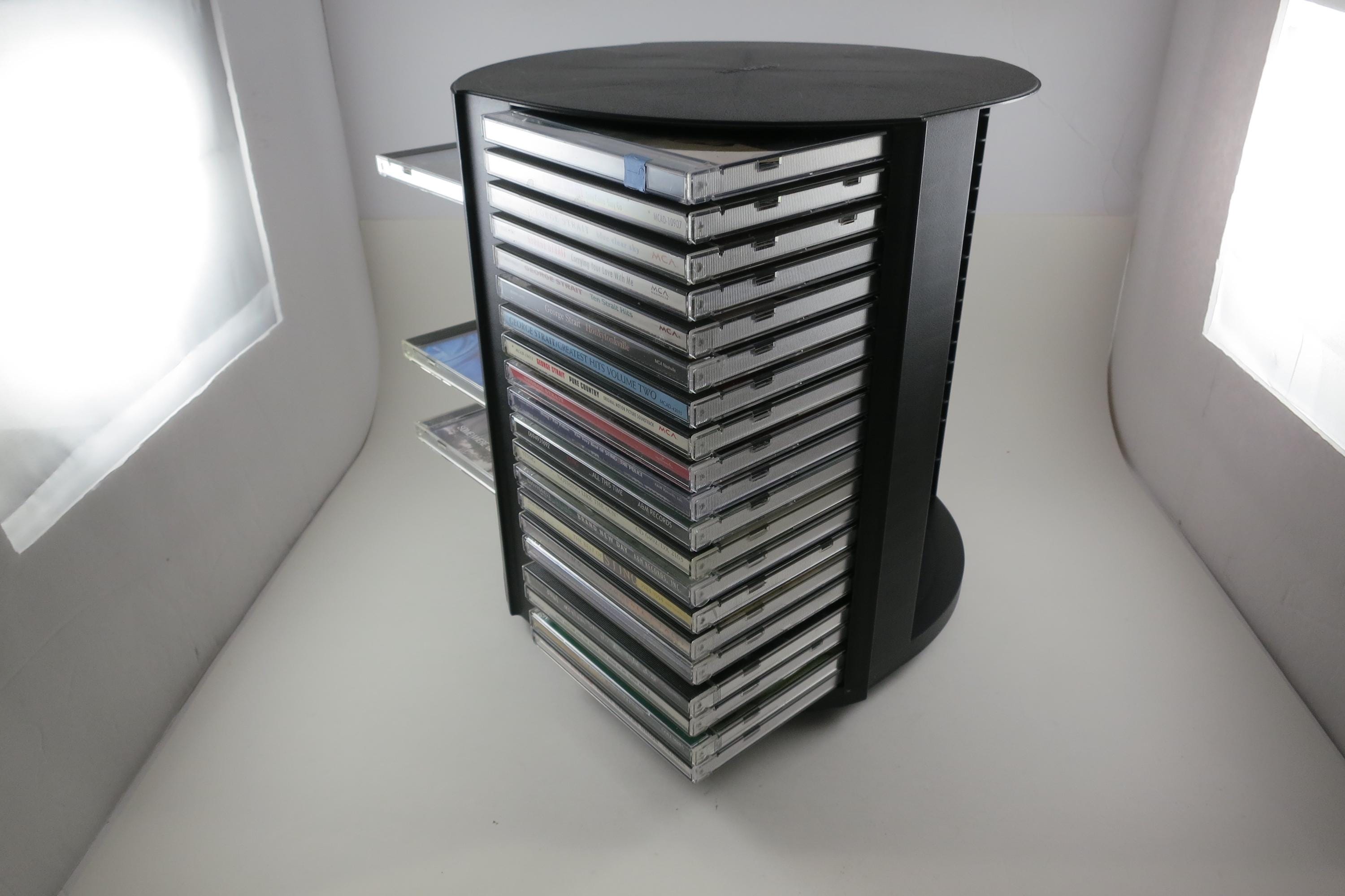 1990's Black Laserline CD Holder Rotating Base Holds 80 Disc's . Rotating base to easily view your cd's. Each side holds 20 disc's, for a total of 80. Measures 11 1/4 inches tall, 12 inches wide. Great gift and perfect to hold your CD's. Can hold up to 8 Doubles.
