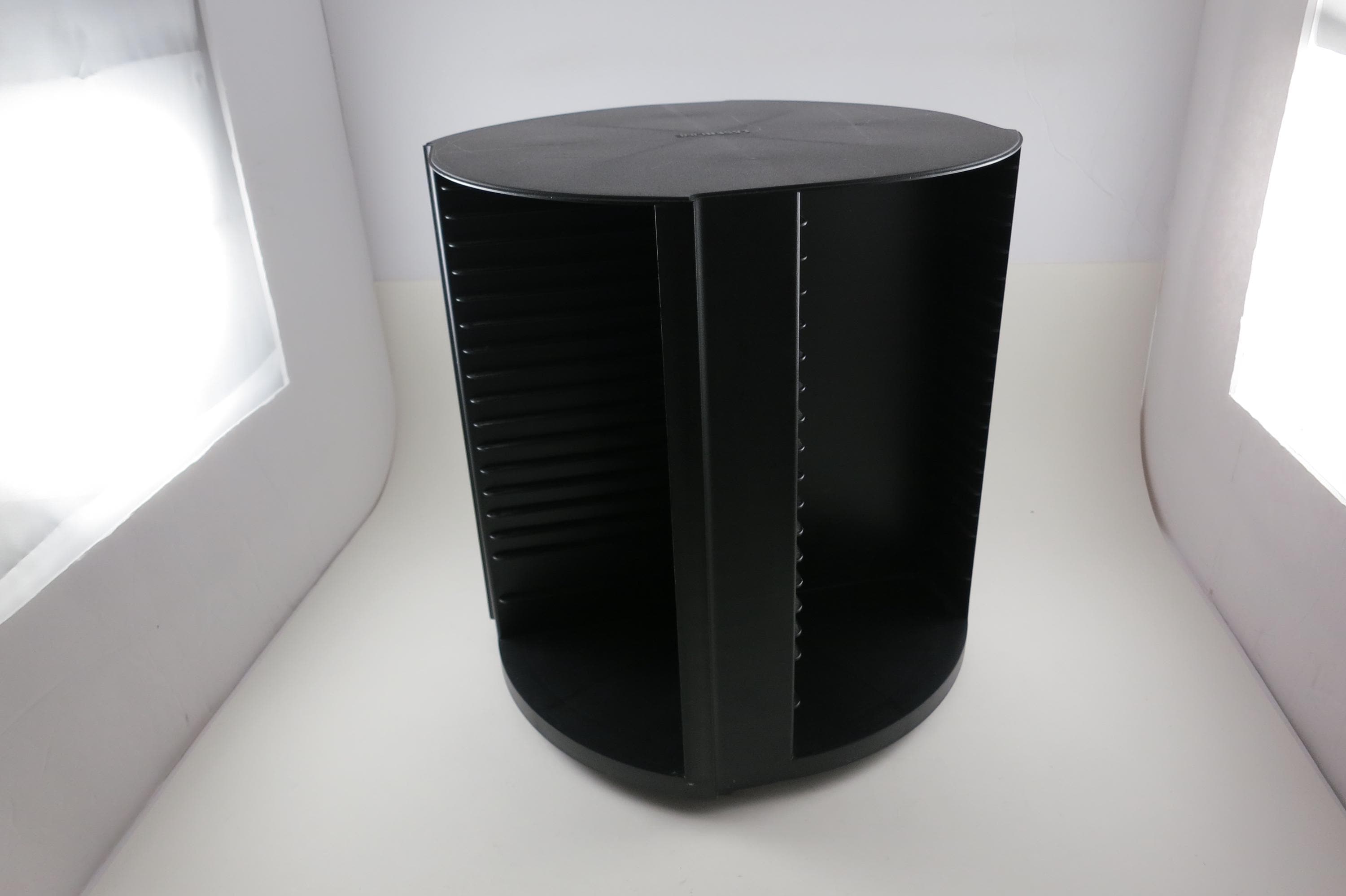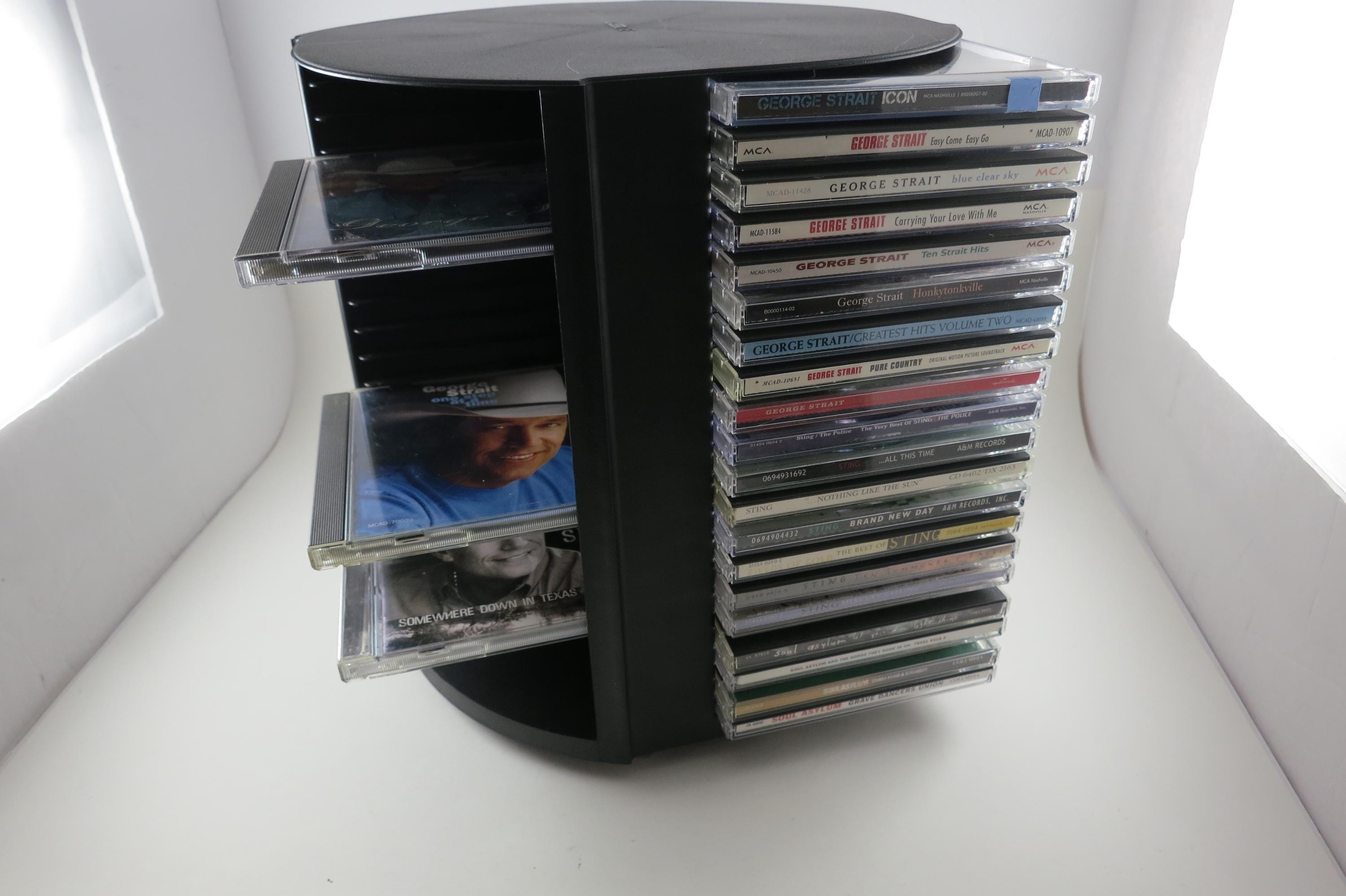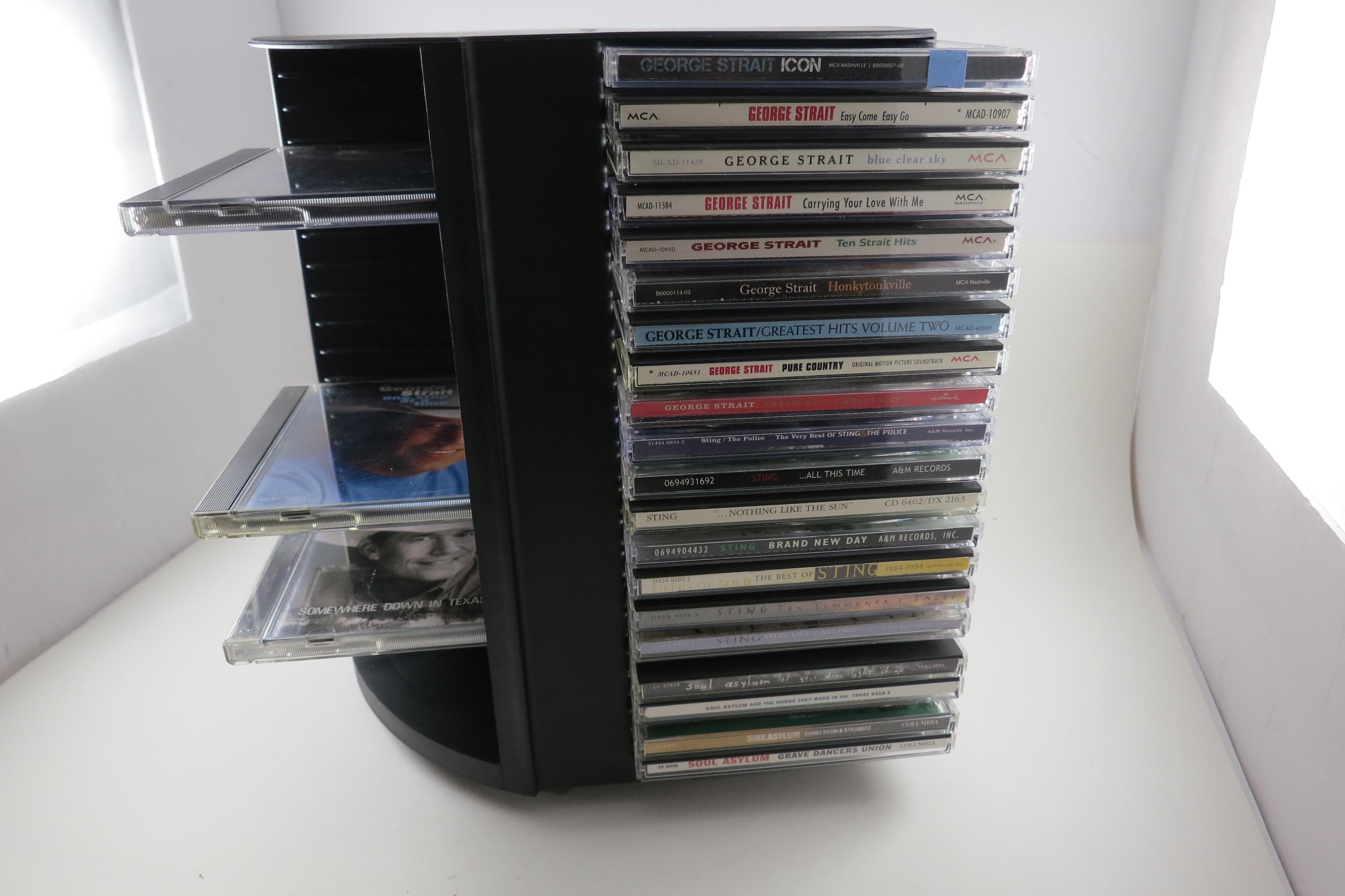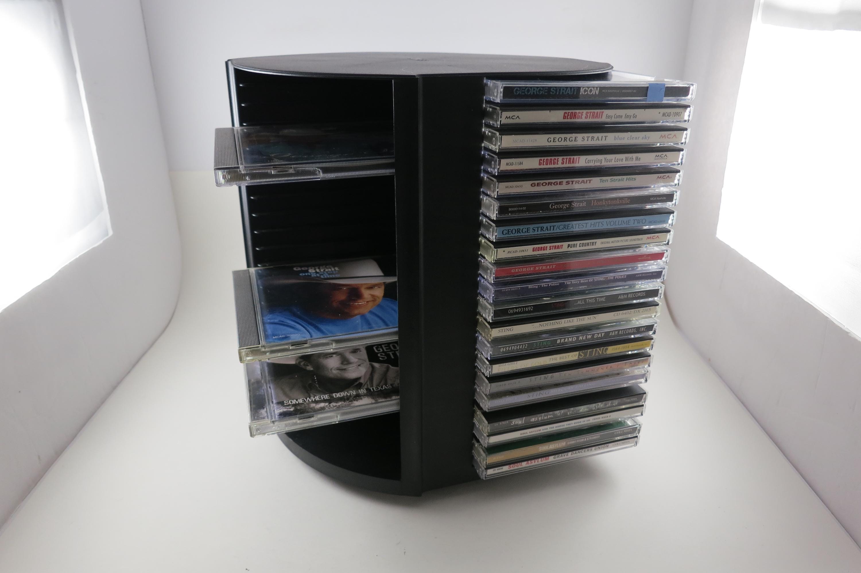 1990's Black Laserline CD Holder Rotating Base Holds 80 Disc's . Rotating base to easily view your cd's. Each side holds 20 disc's, for a total of 80. Measures 11 1/4 inches tall, 12 inches wide. Great gift and perfect to hold your CD's. Can hold up to 8 Doubles.
