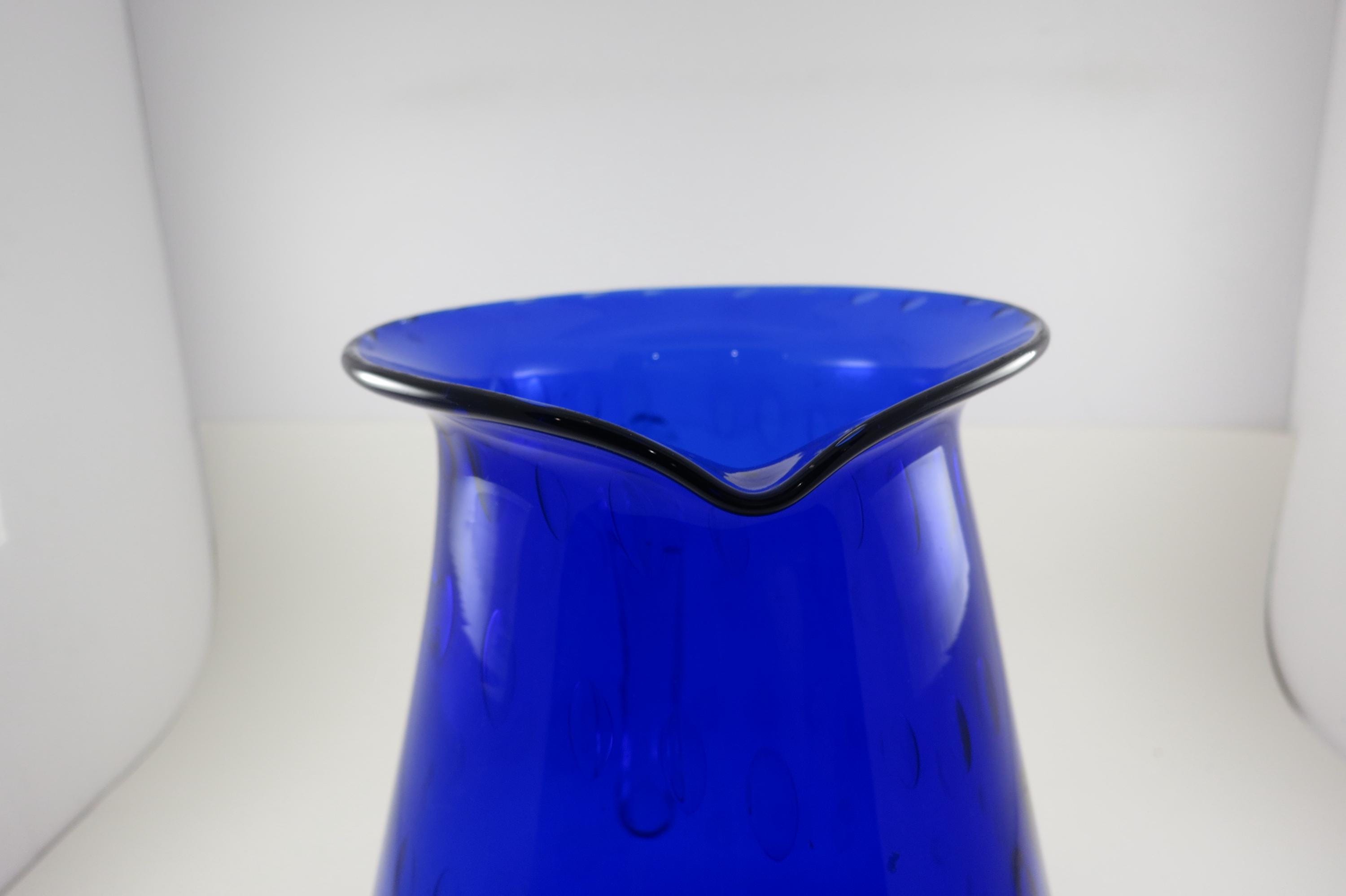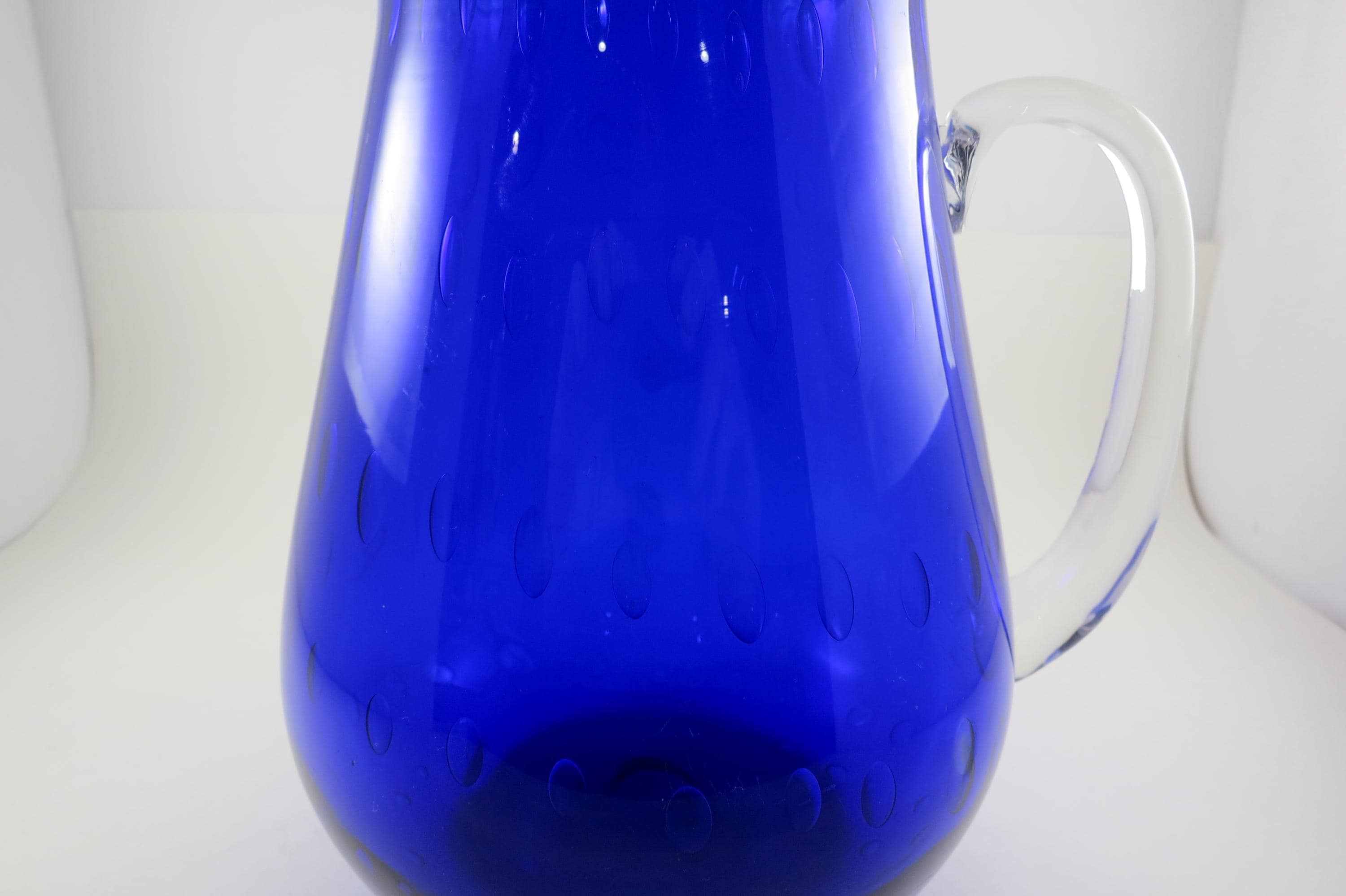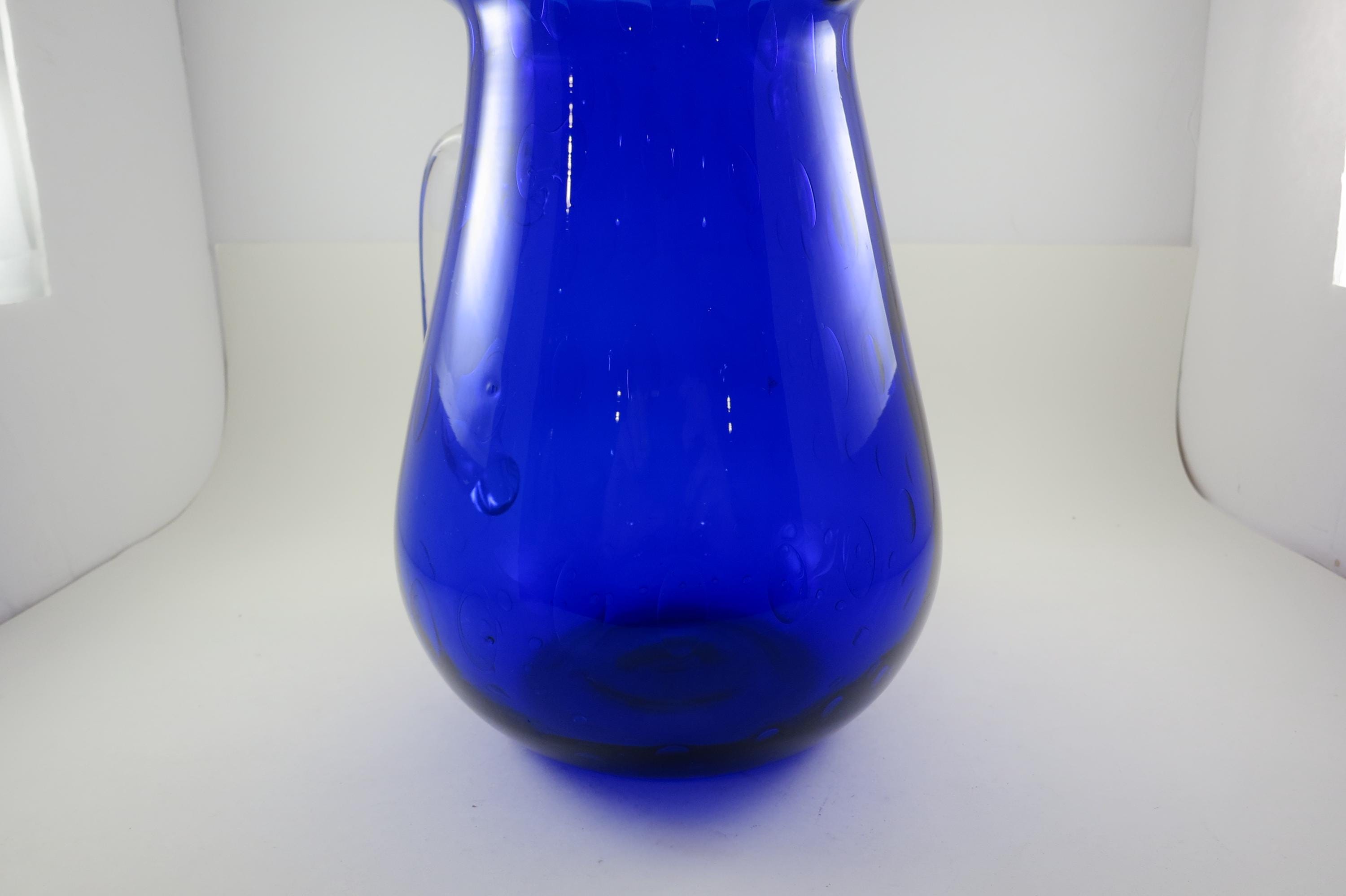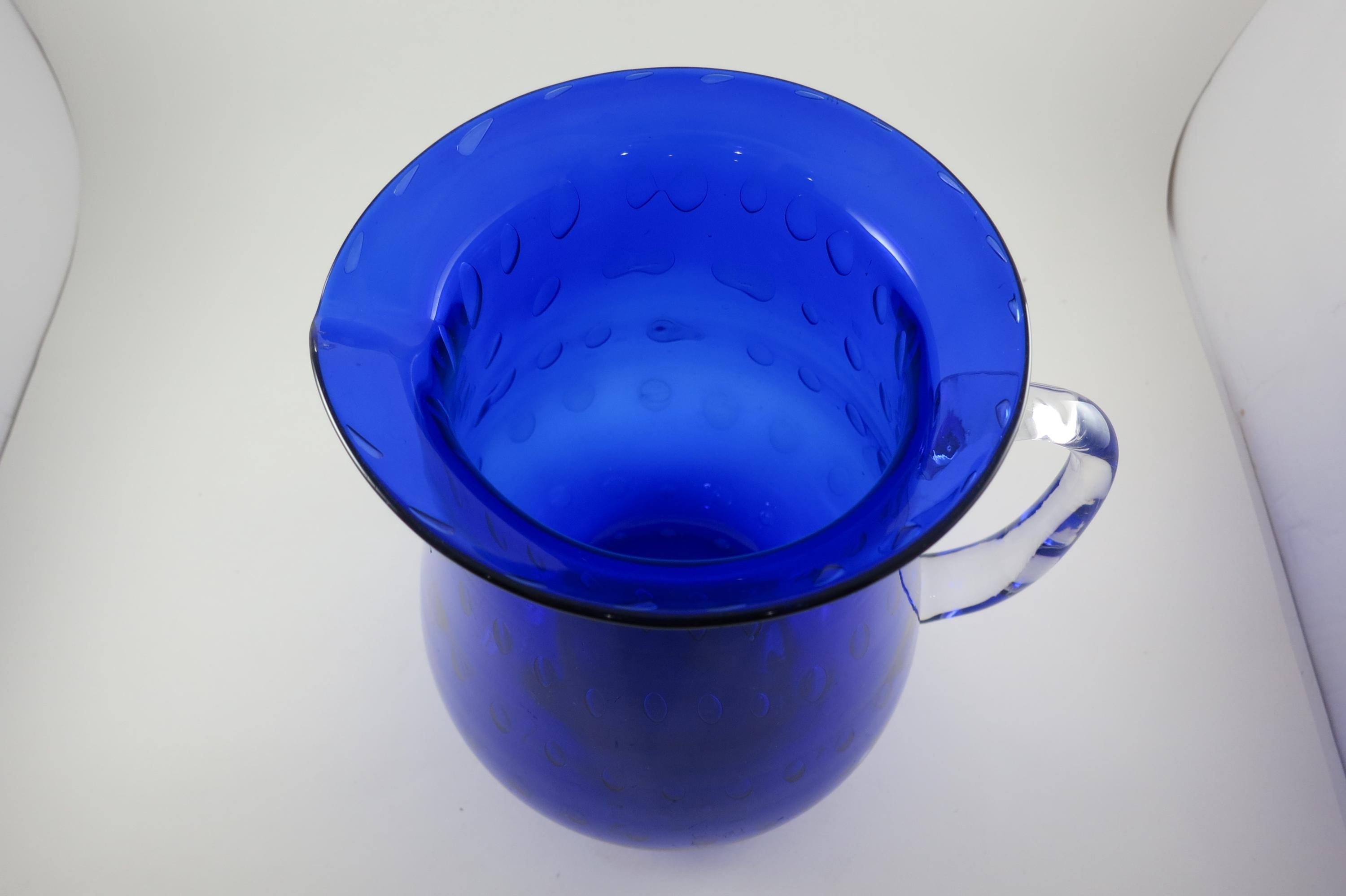 Vintage Cobalt Blue Hand Blown Water Juice Pitcher Ice Lip 9 Inches Tall.