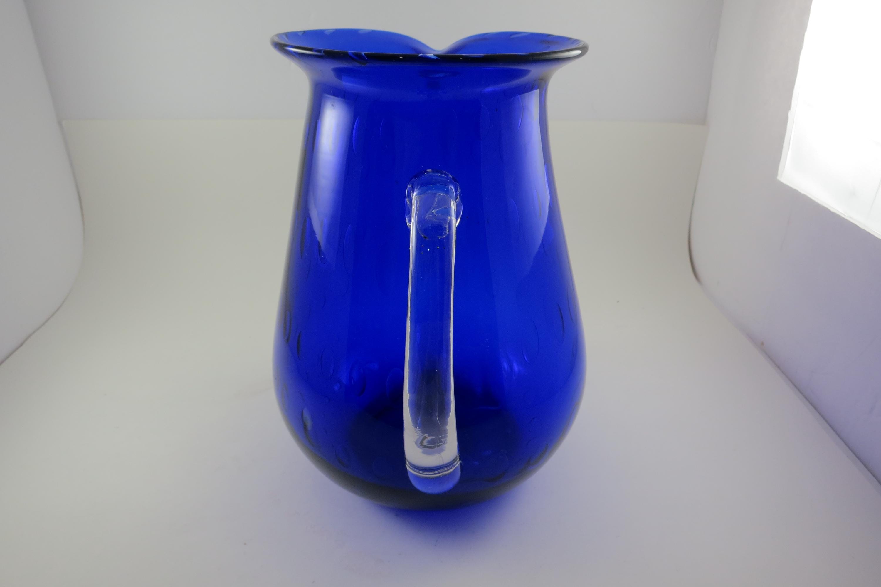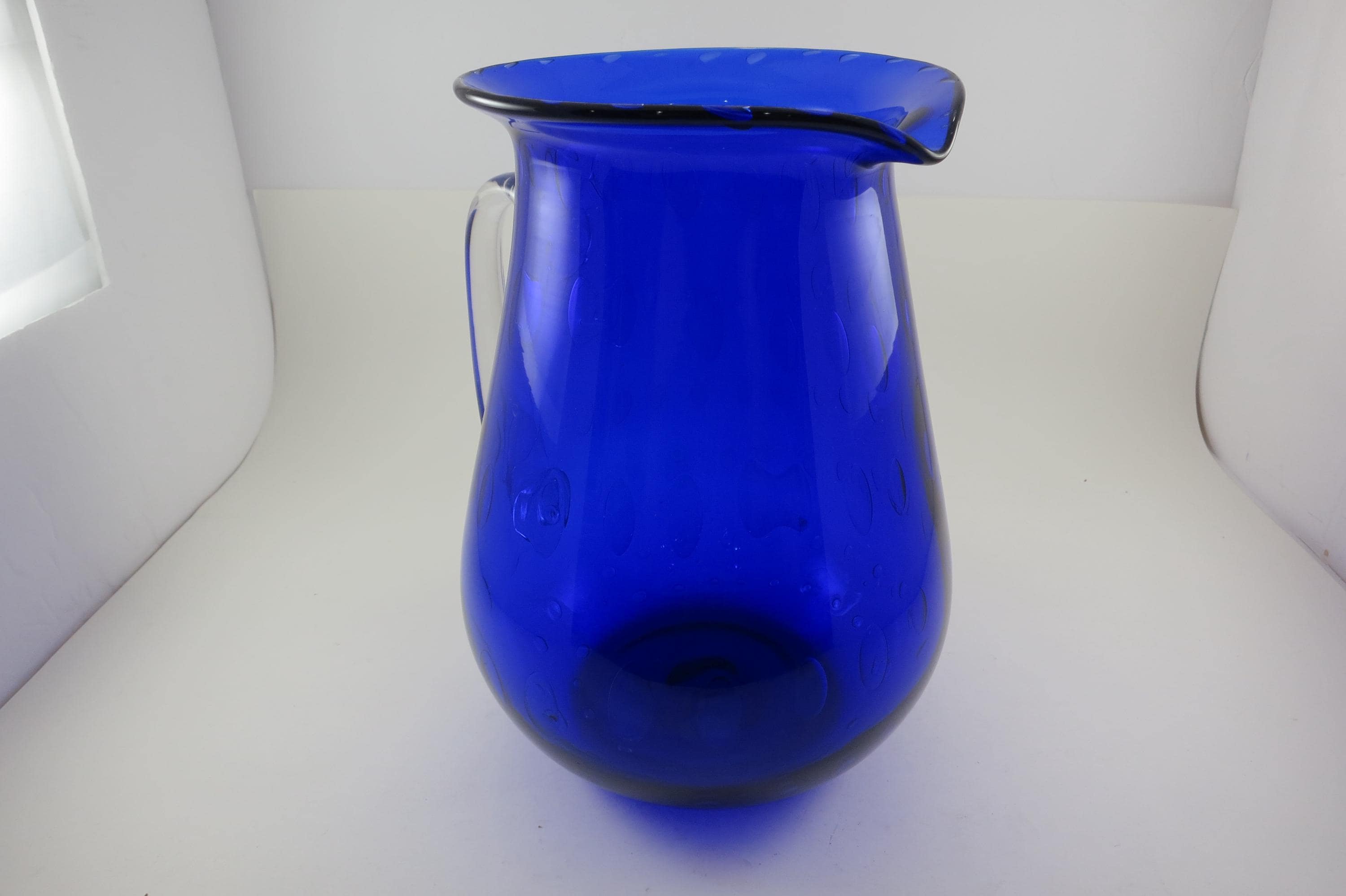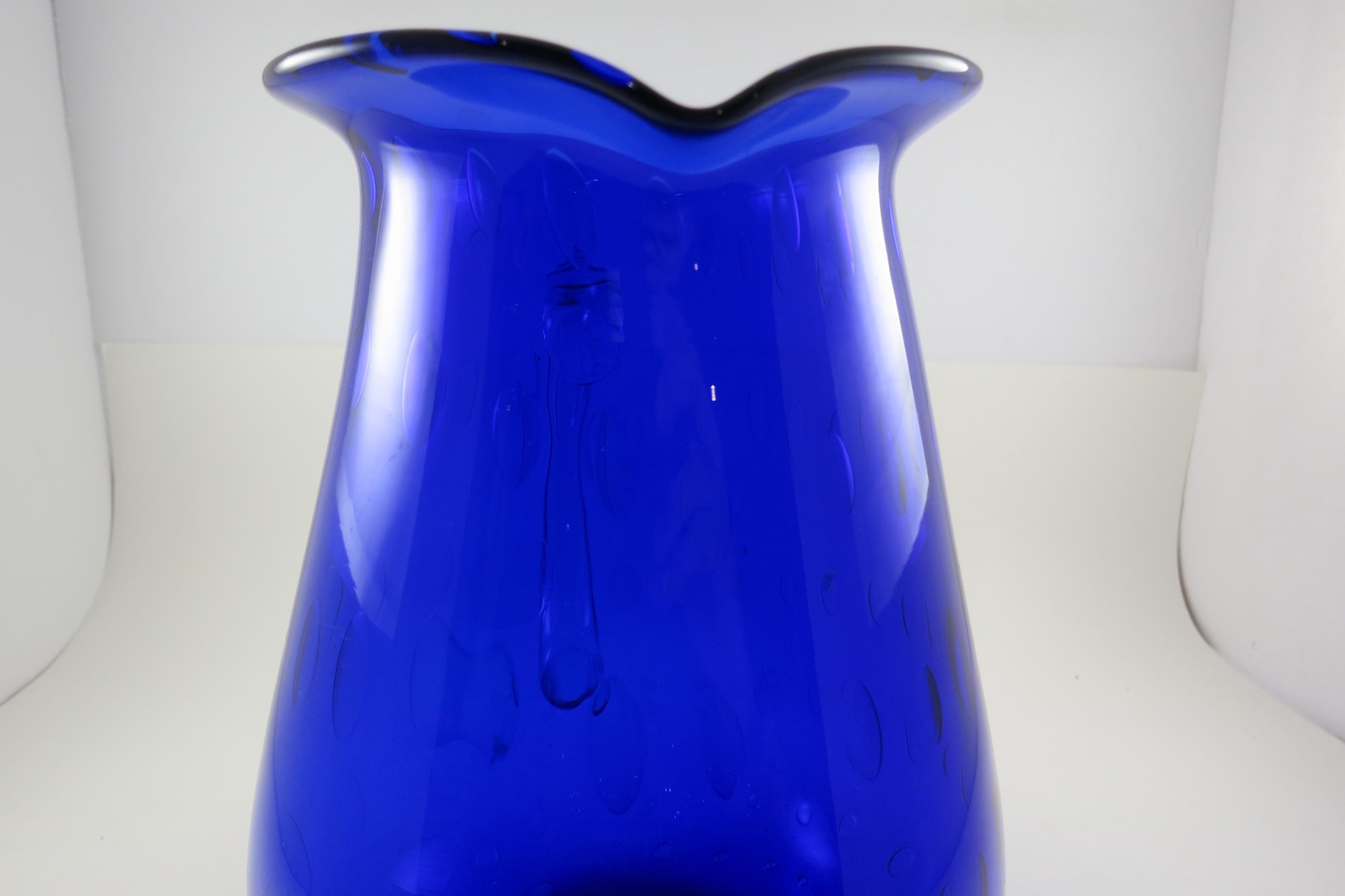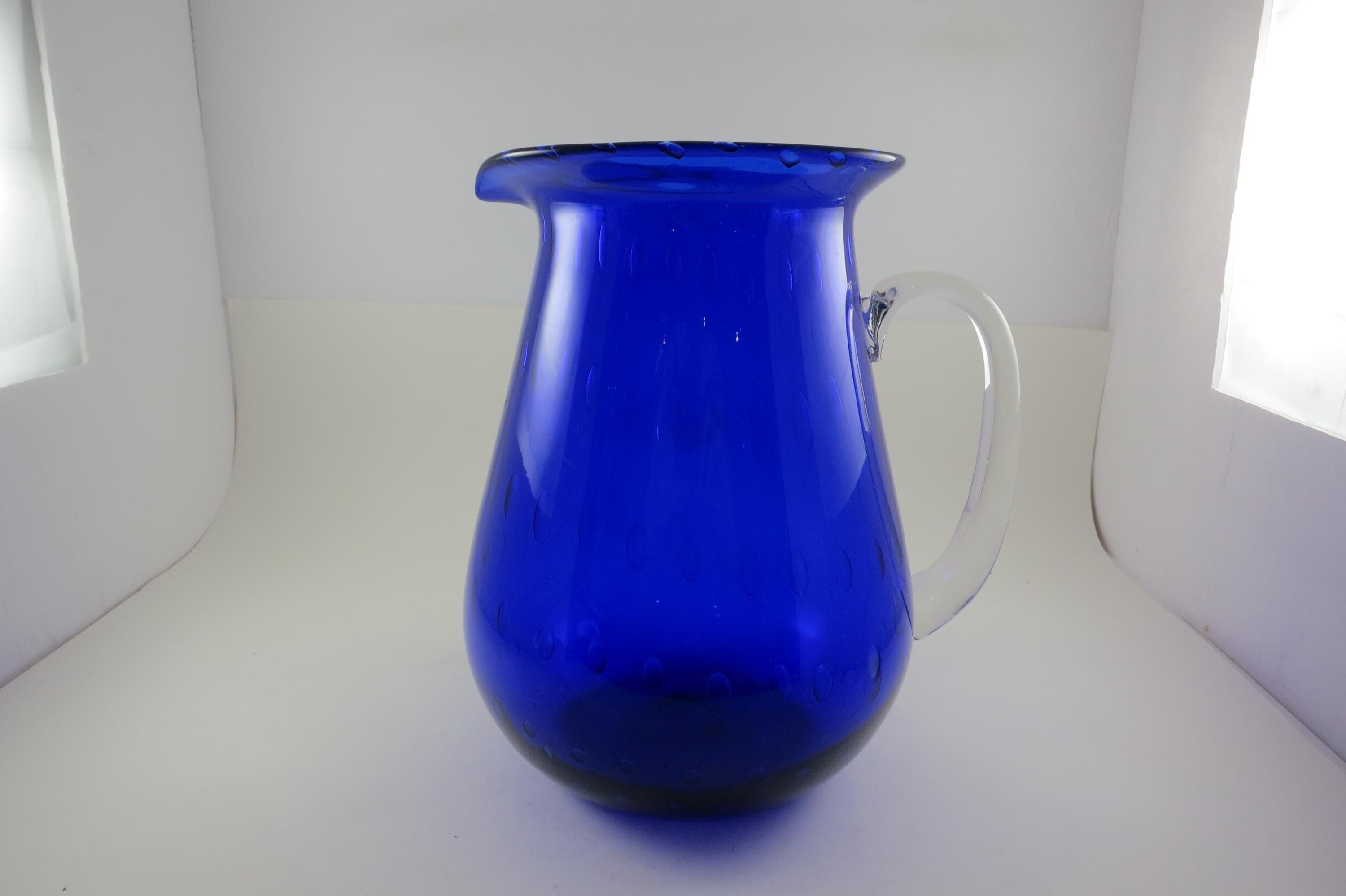 Vintage Cobalt Blue Hand Blown Water Juice Pitcher Ice Lip 9 Inches Tall.