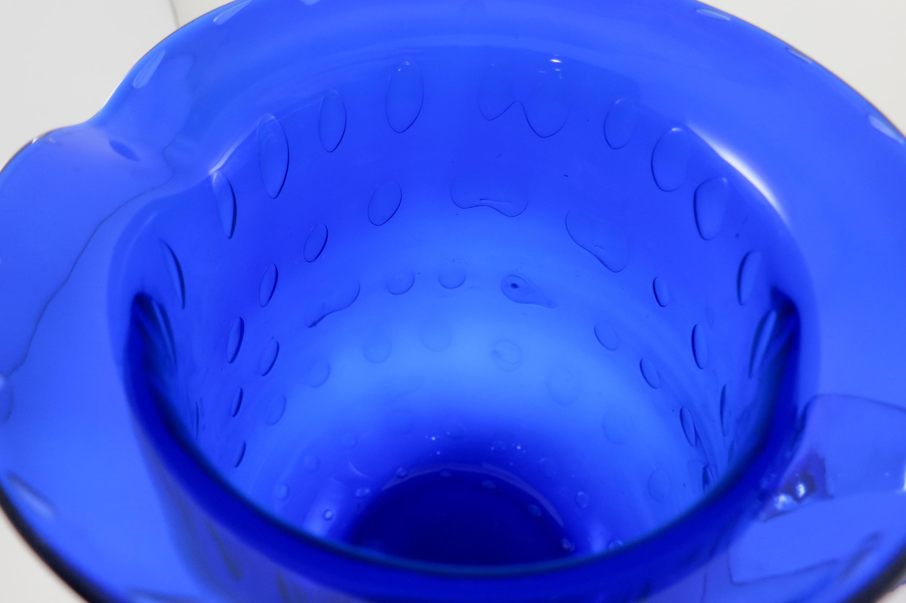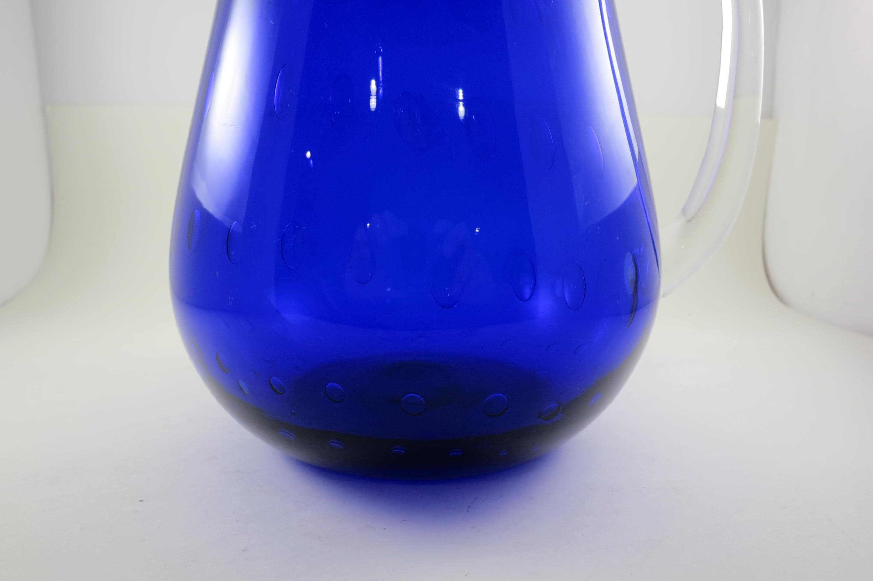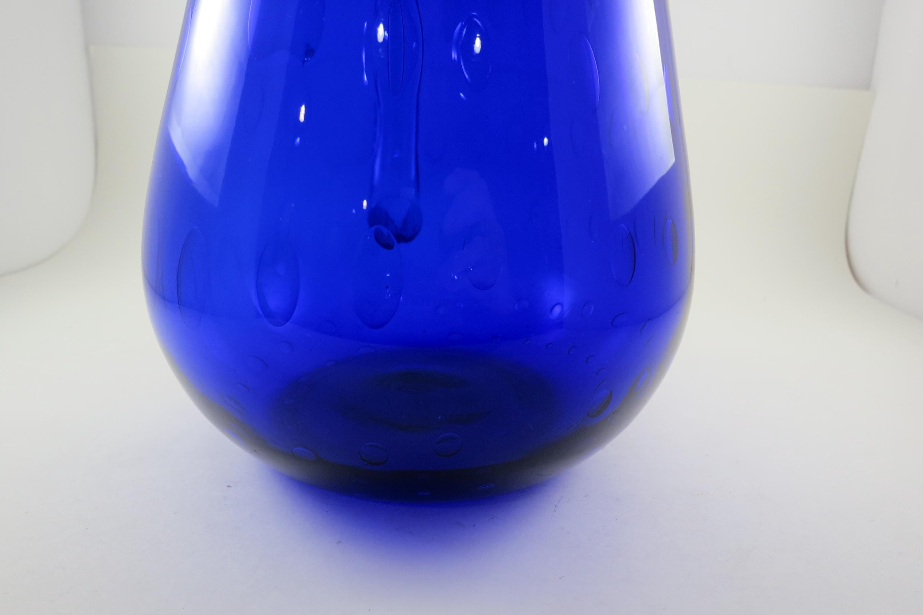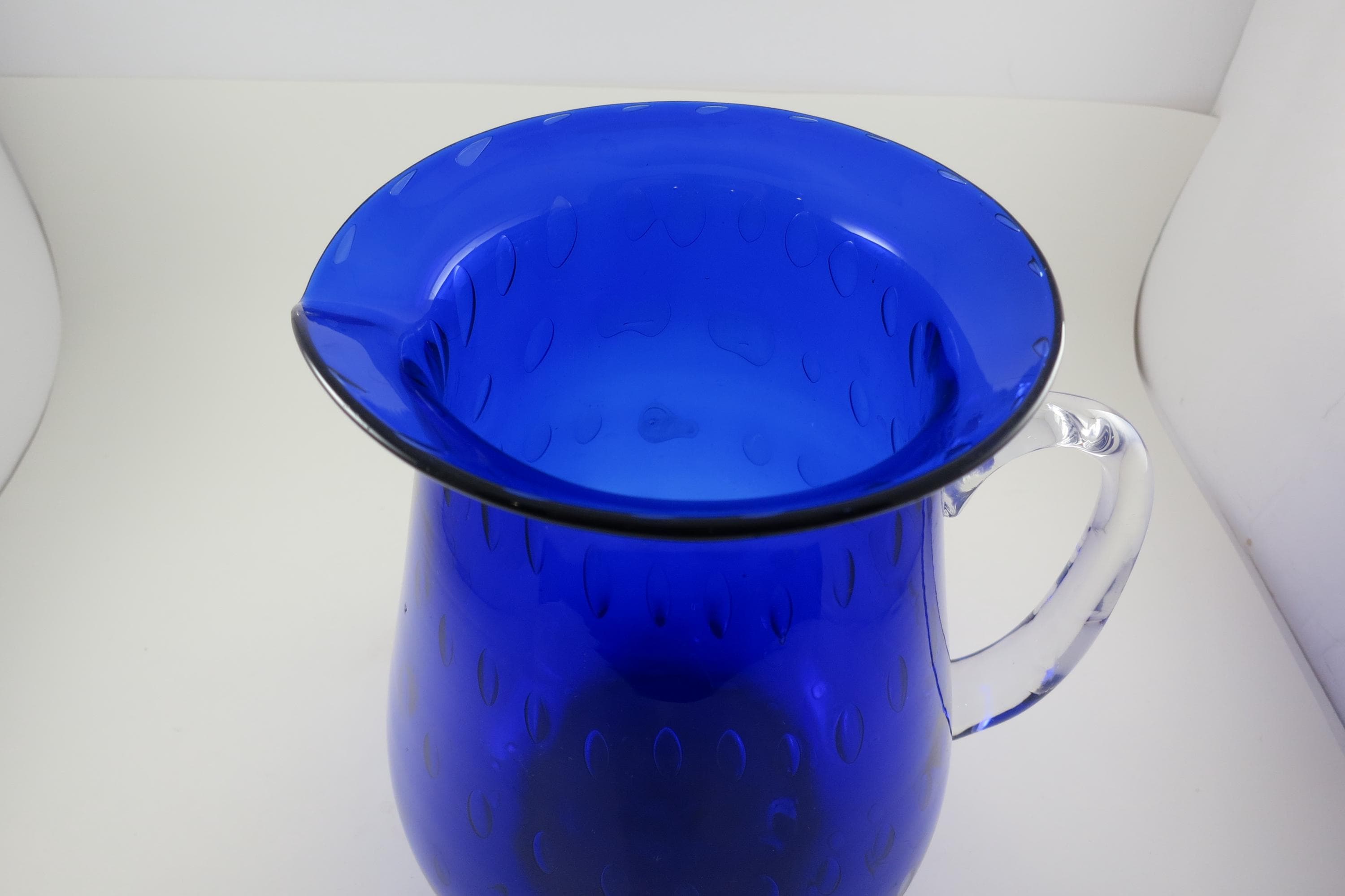 Vintage Cobalt Blue Hand Blown Water Juice Pitcher Ice Lip 9 Inches Tall.