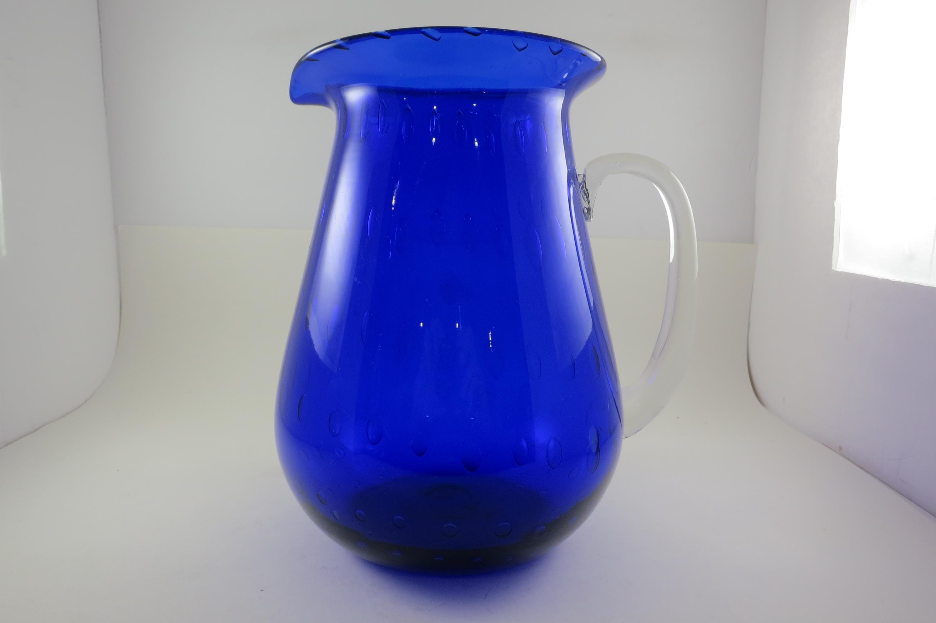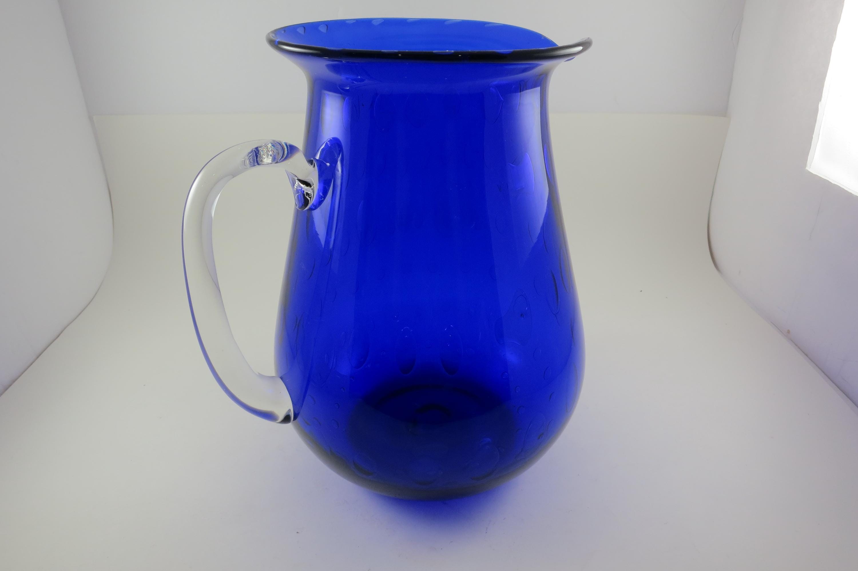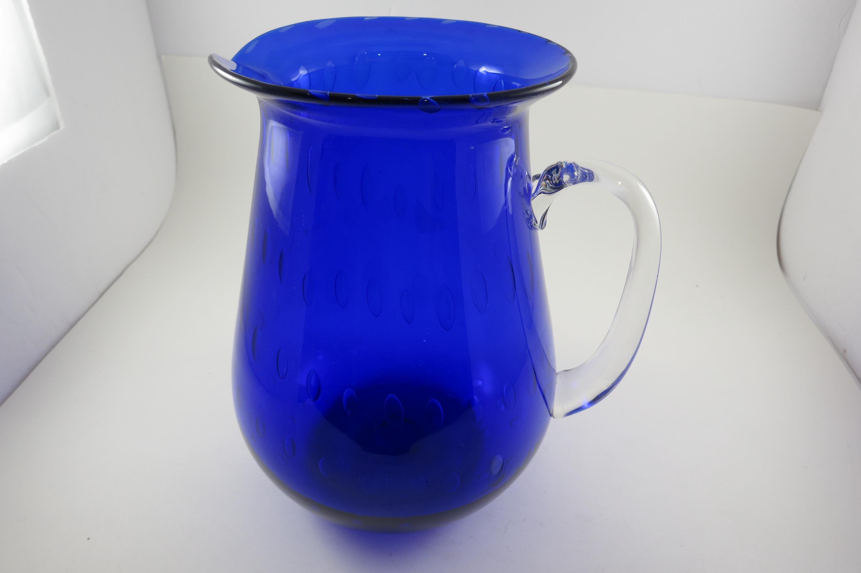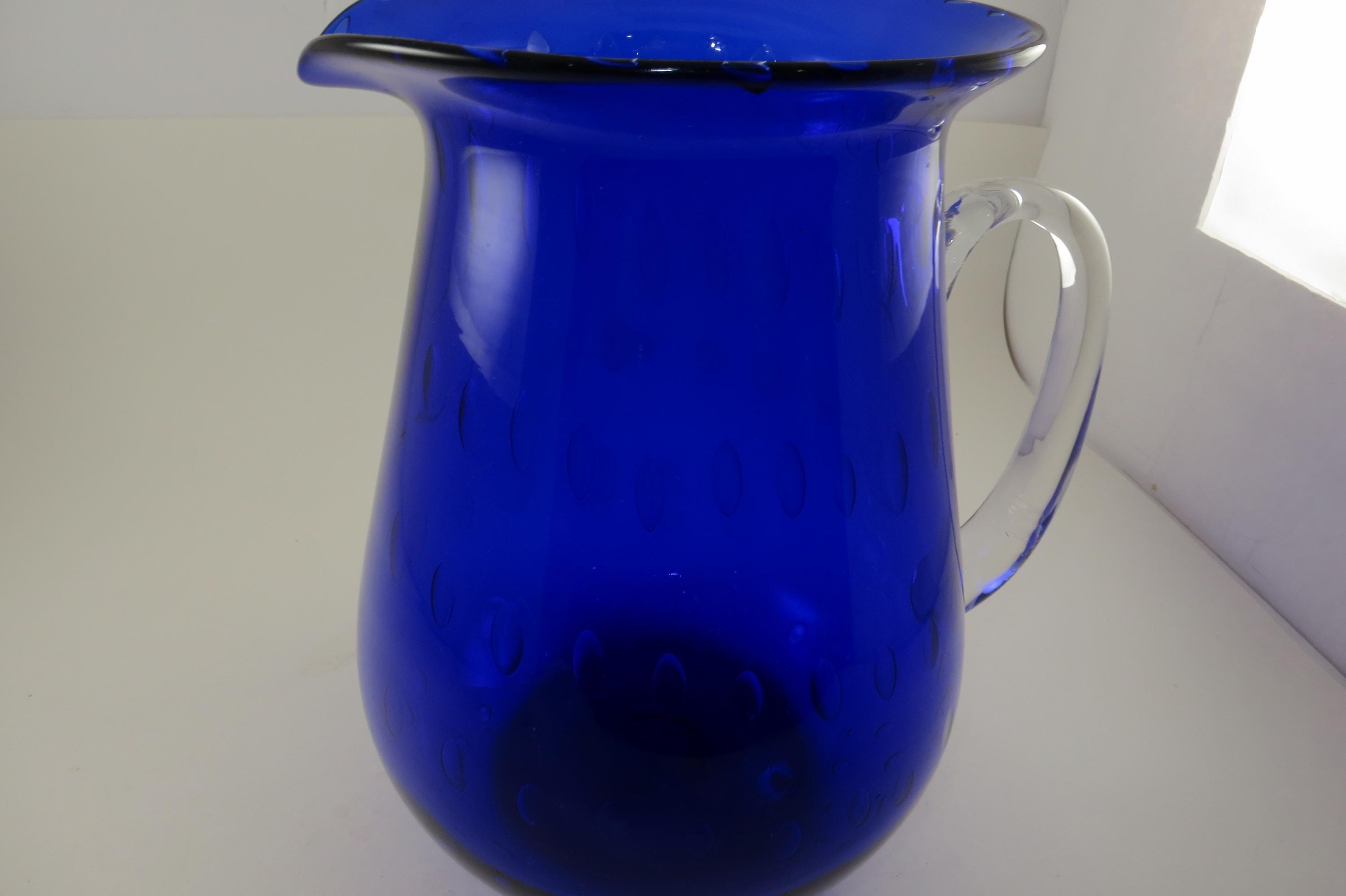 Vintage Cobalt Blue Hand Blown Water Juice Pitcher Ice Lip 9 Inches Tall