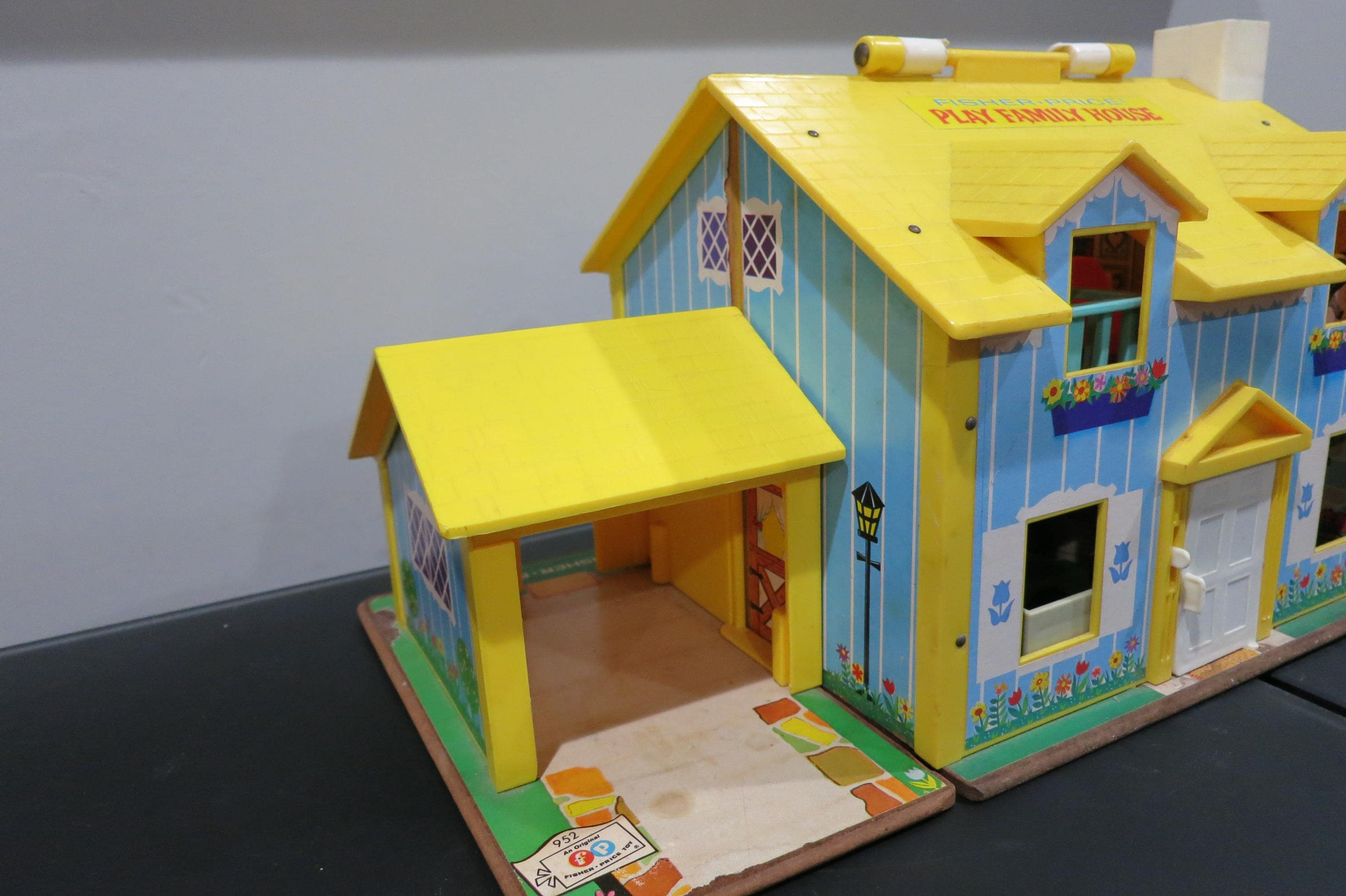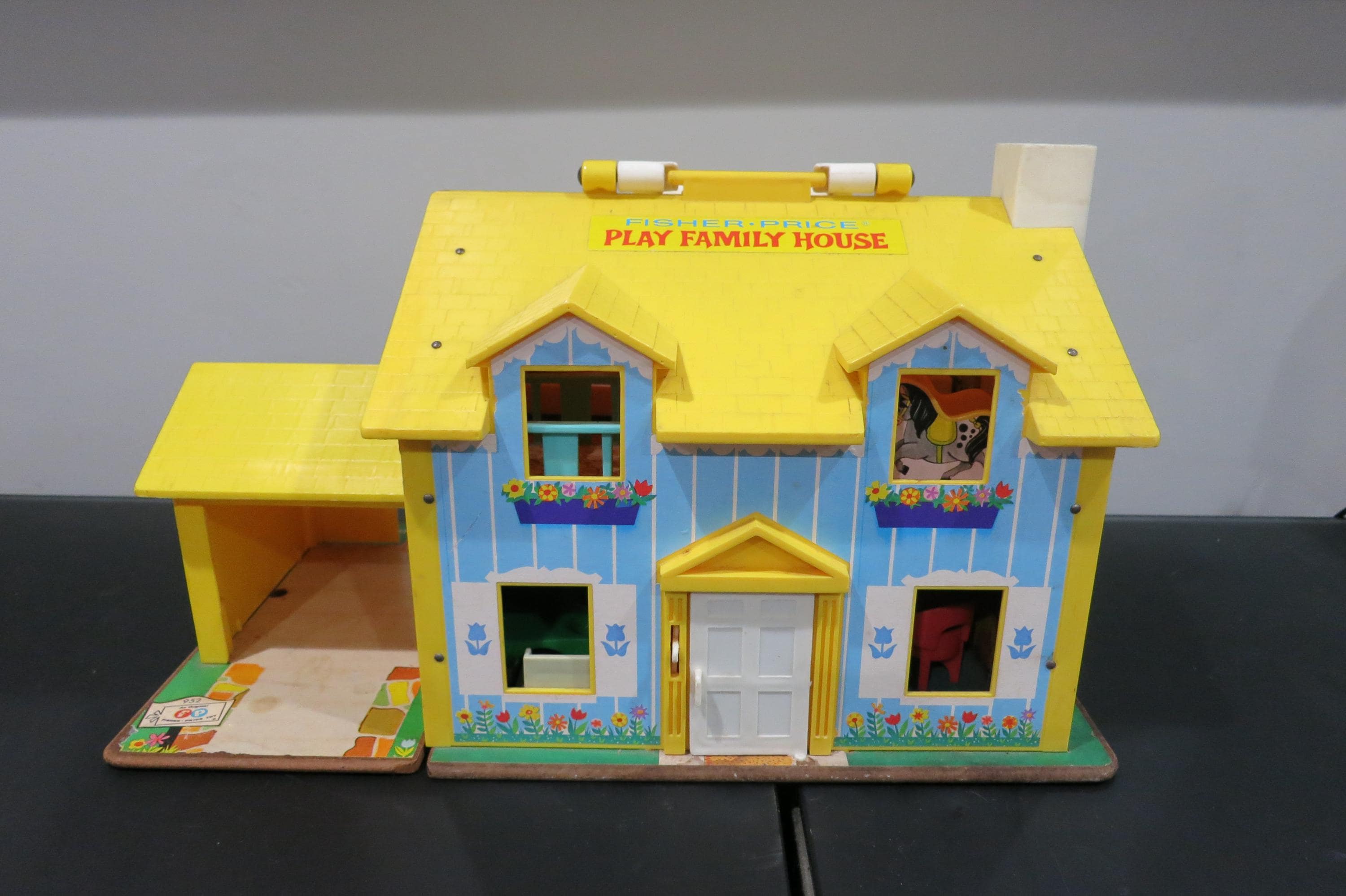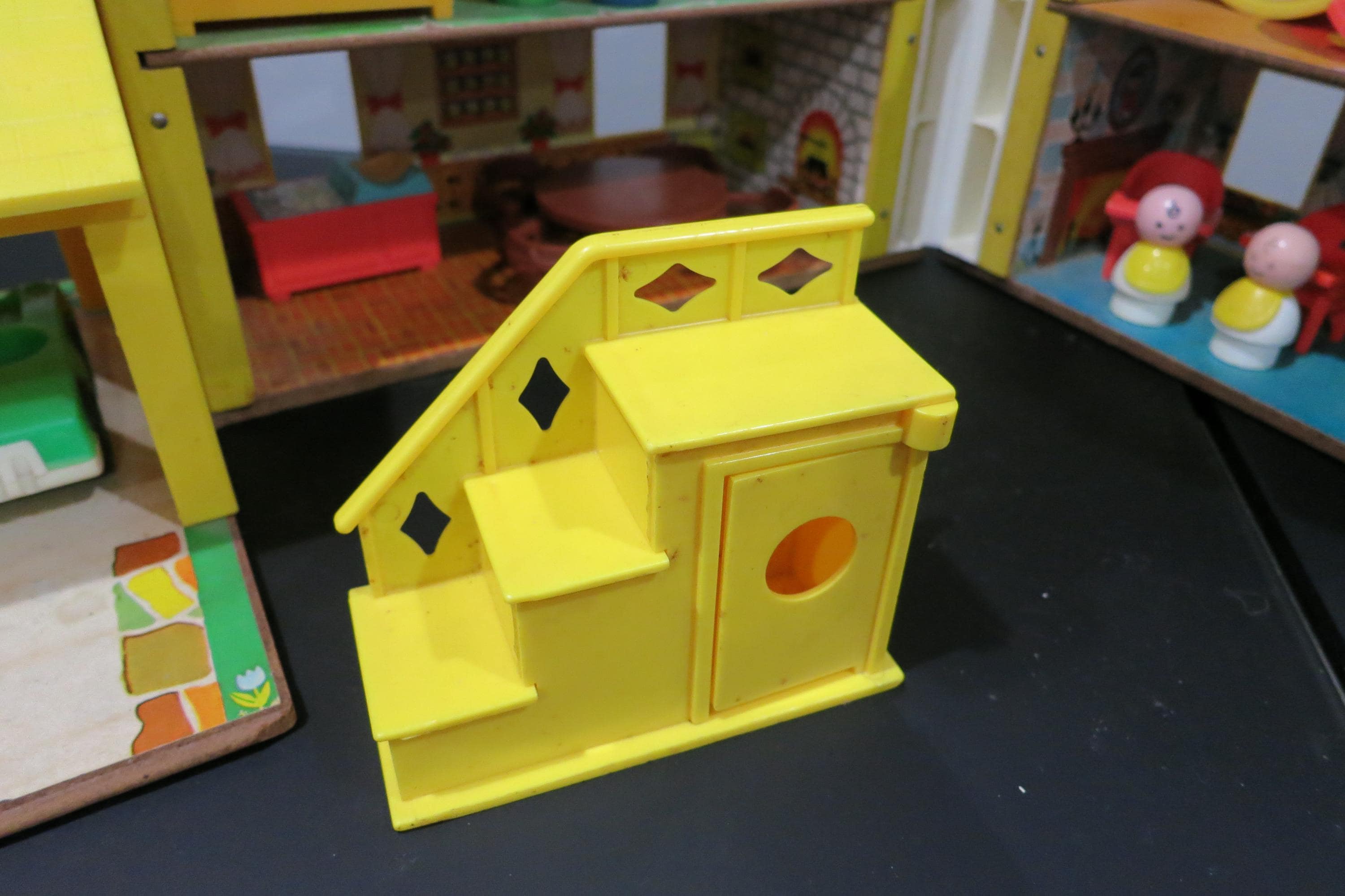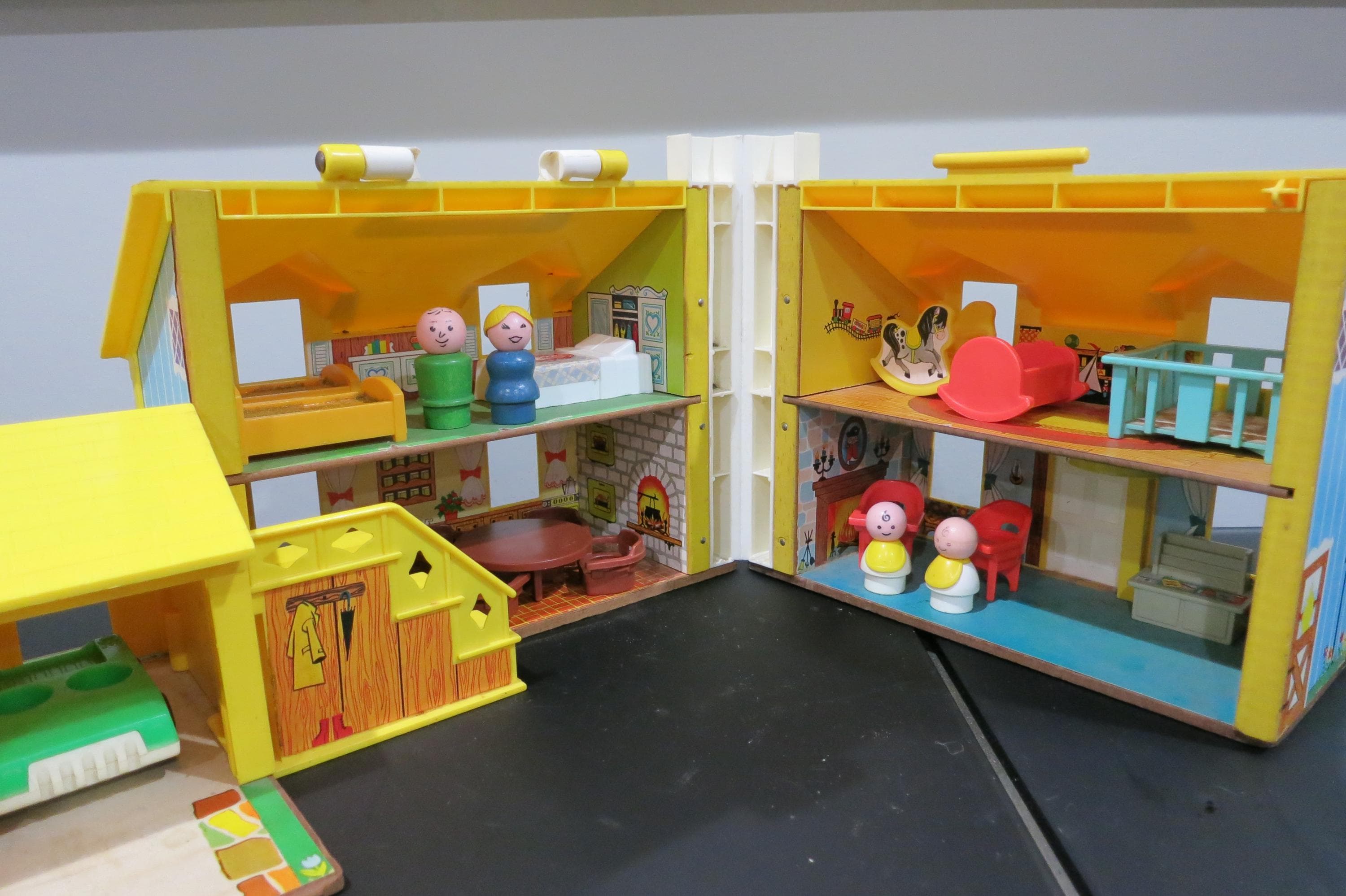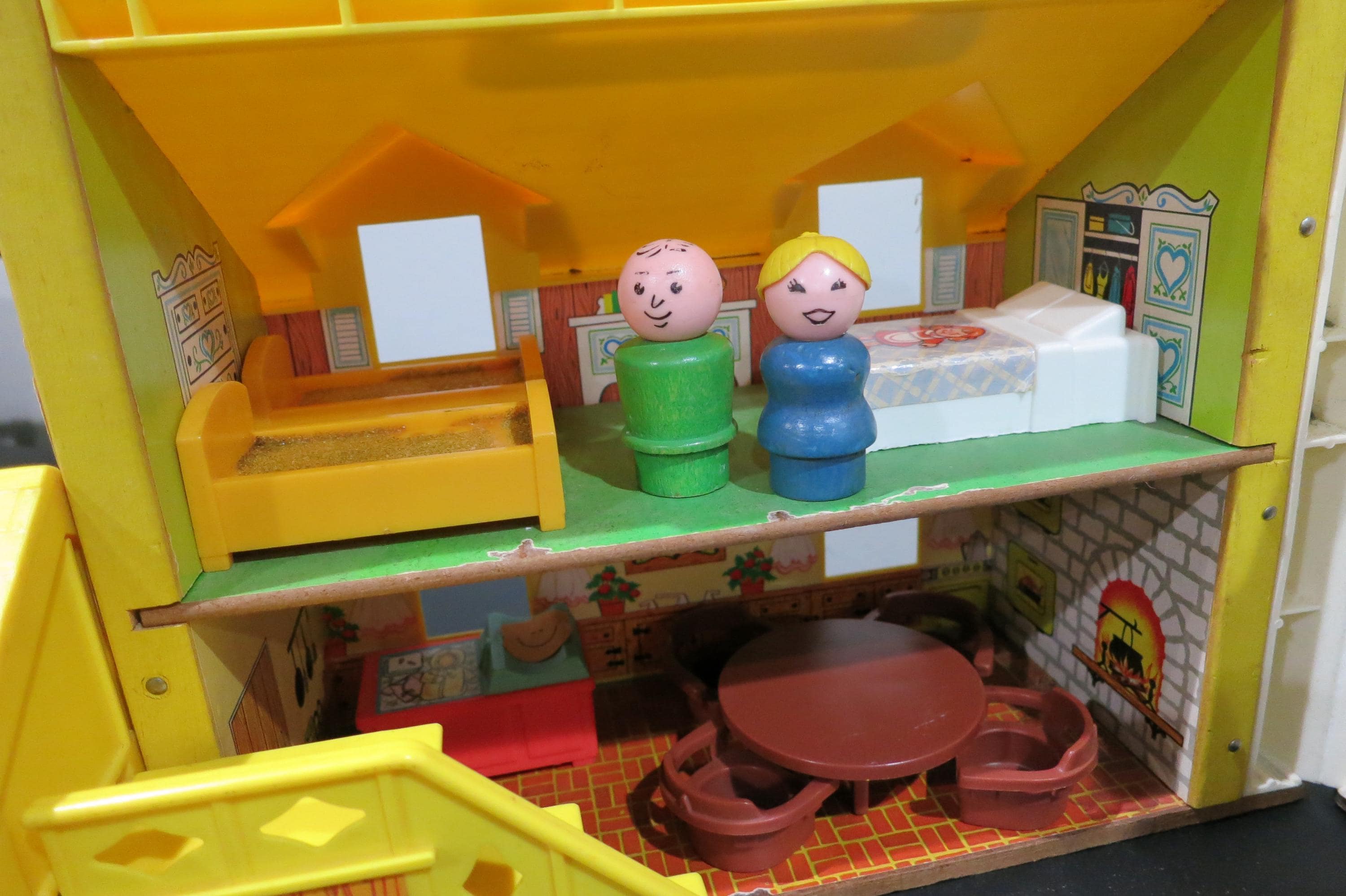 Vintage 1969 Fisher Price Play House: Yellow with Car Furniture People 22 Pieces. Excellent Condition. Obviously, this did not come fully furnished as you see it now. We added all kinds of furniture to fill the rooms, even a car for the garage. Excellent Original Condition with normal use wear. Beds could use some cleaning where the original foam came off. Doorbell Still Works! 22 Pieces, Including the House, 2 Baby People, Mom and Dad, Car, 3 Beds, Table with 4 Chairs, Changing Table, 2 High Chairs, Desk, Cradle, rocking Horse, Crib and the stairs with storage door underneath. Would make a great gift.