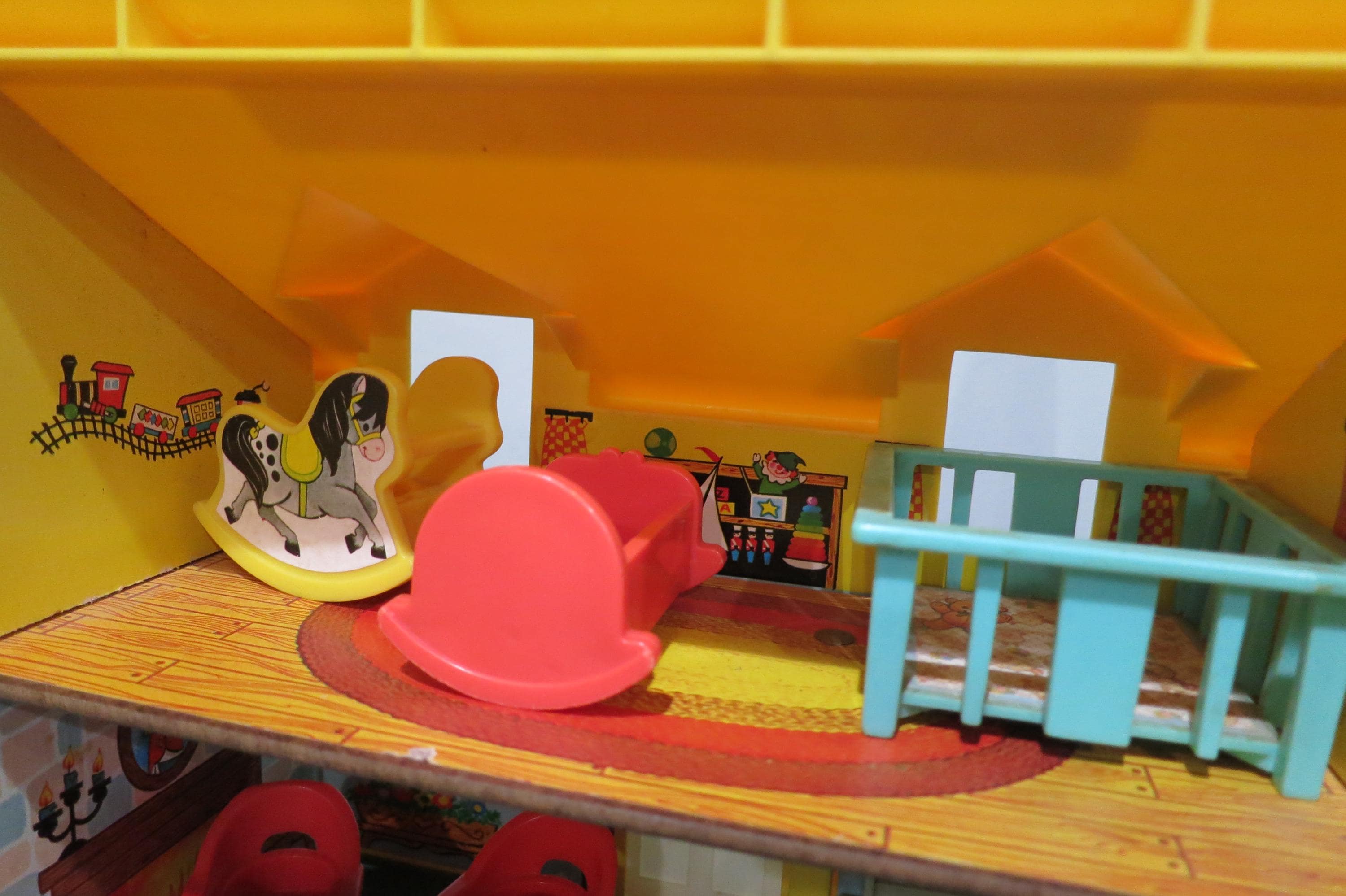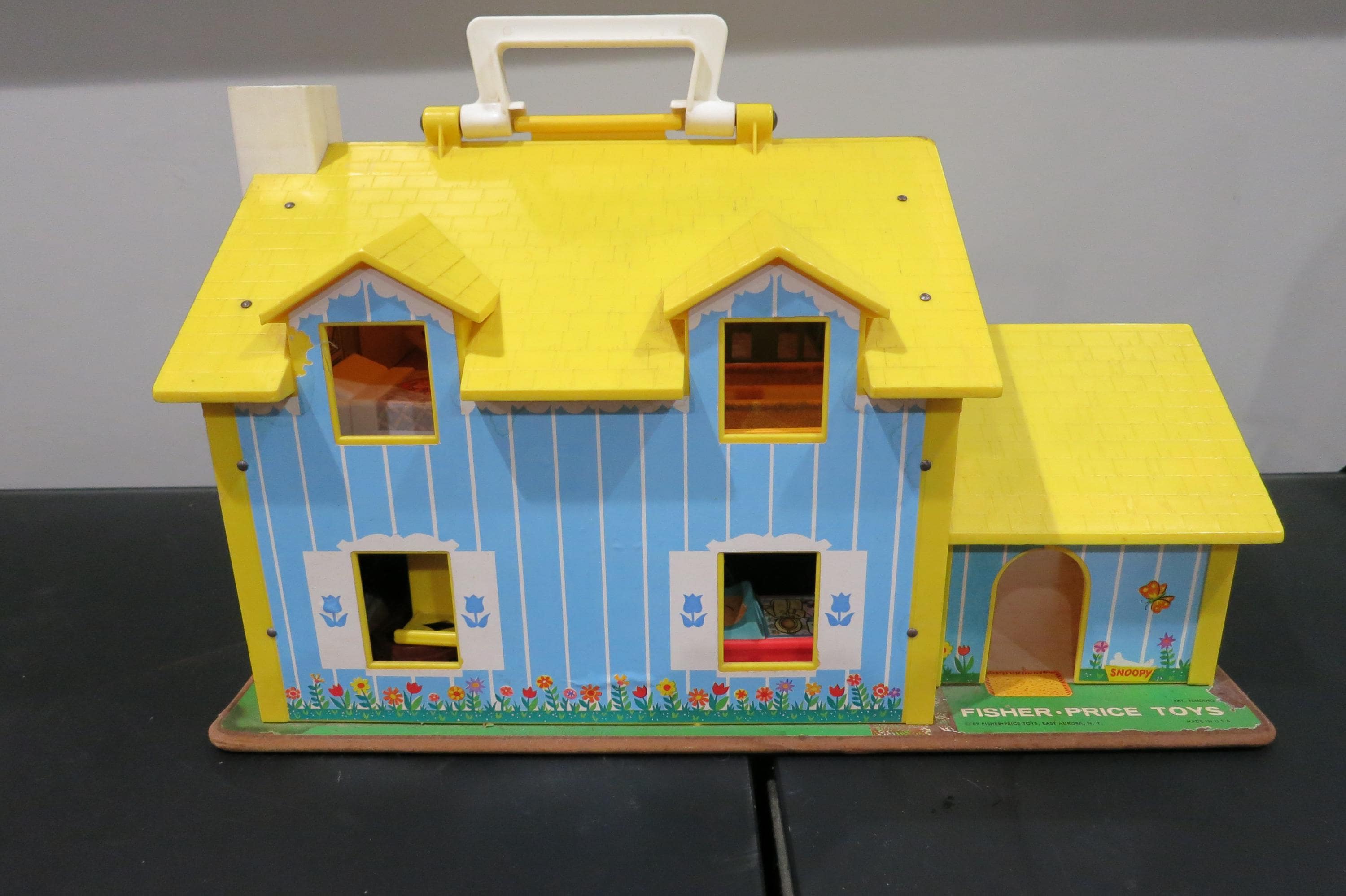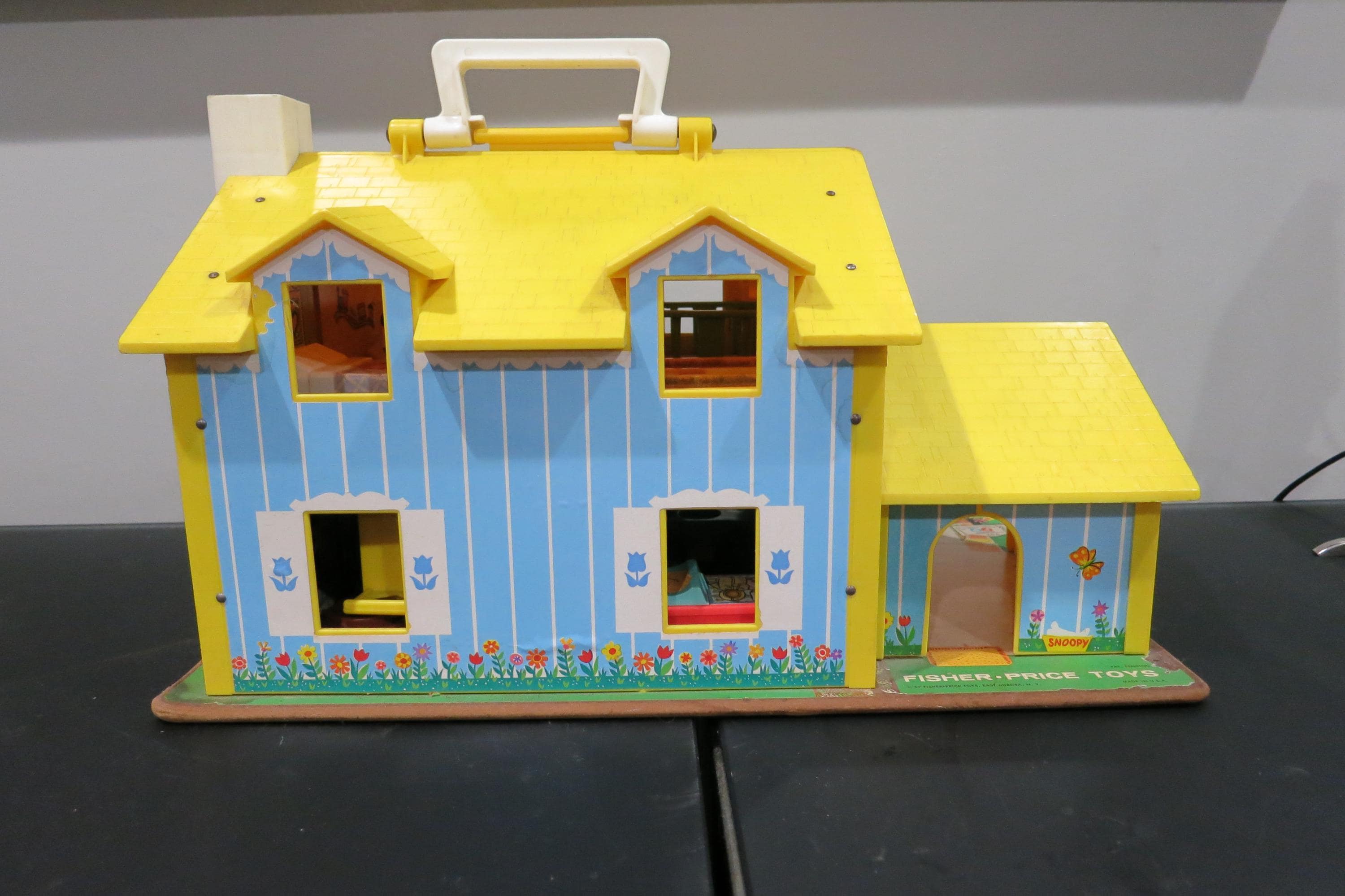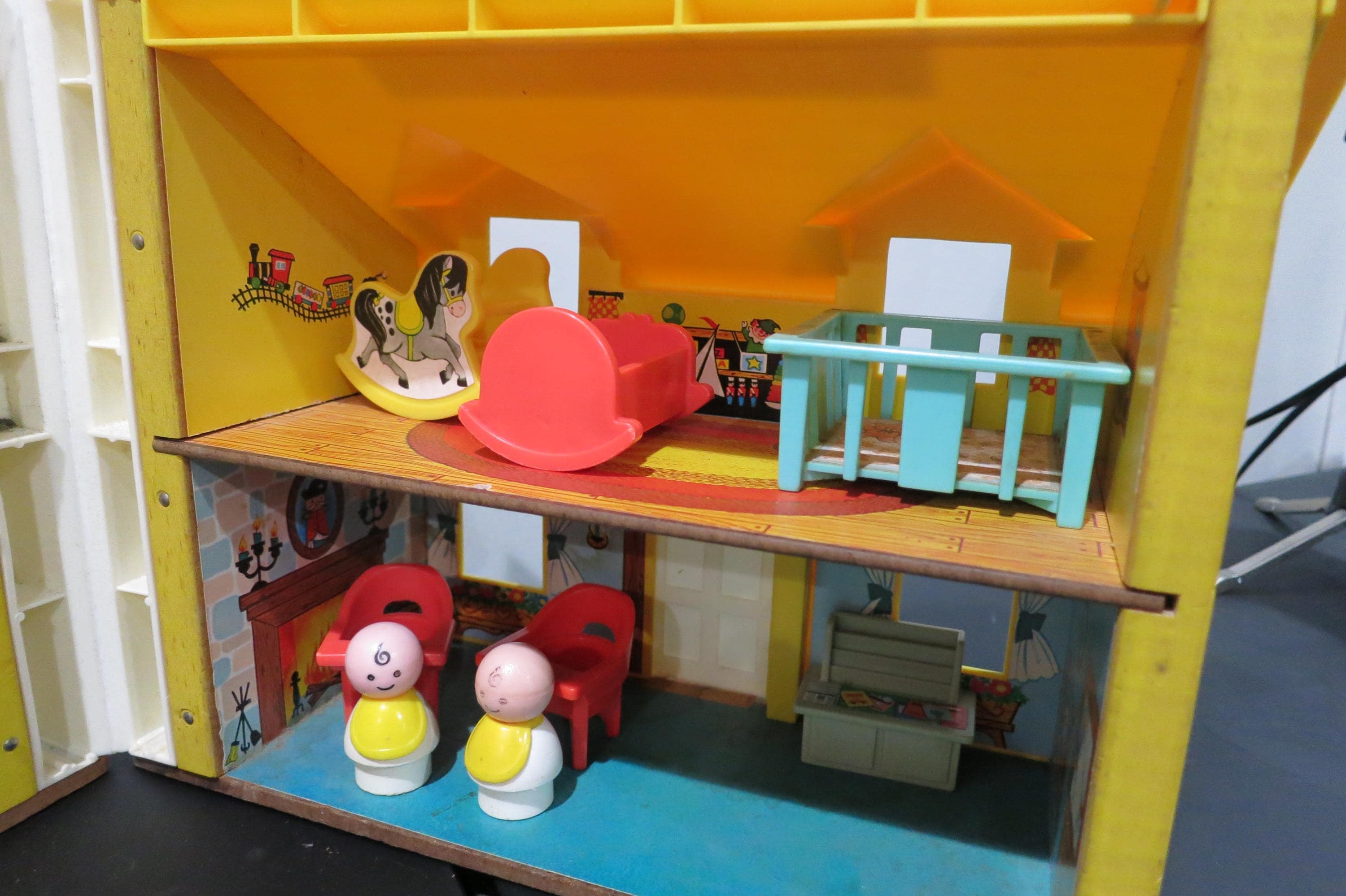 Vintage 1969 Fisher Price Play House: Yellow with Car Furniture People 22 Pieces. Excellent Condition. Obviously, this did not come fully furnished as you see it now. We added all kinds of furniture to fill the rooms, even a car for the garage. Excellent Original Condition with normal use wear. Beds could use some cleaning where the original foam came off. Doorbell Still Works! 22 Pieces, Including the House, 2 Baby People, Mom and Dad, Car, 3 Beds, Table with 4 Chairs, Changing Table, 2 High Chairs, Desk, Cradle, rocking Horse, Crib and the stairs with storage door underneath. Would make a great gift.
