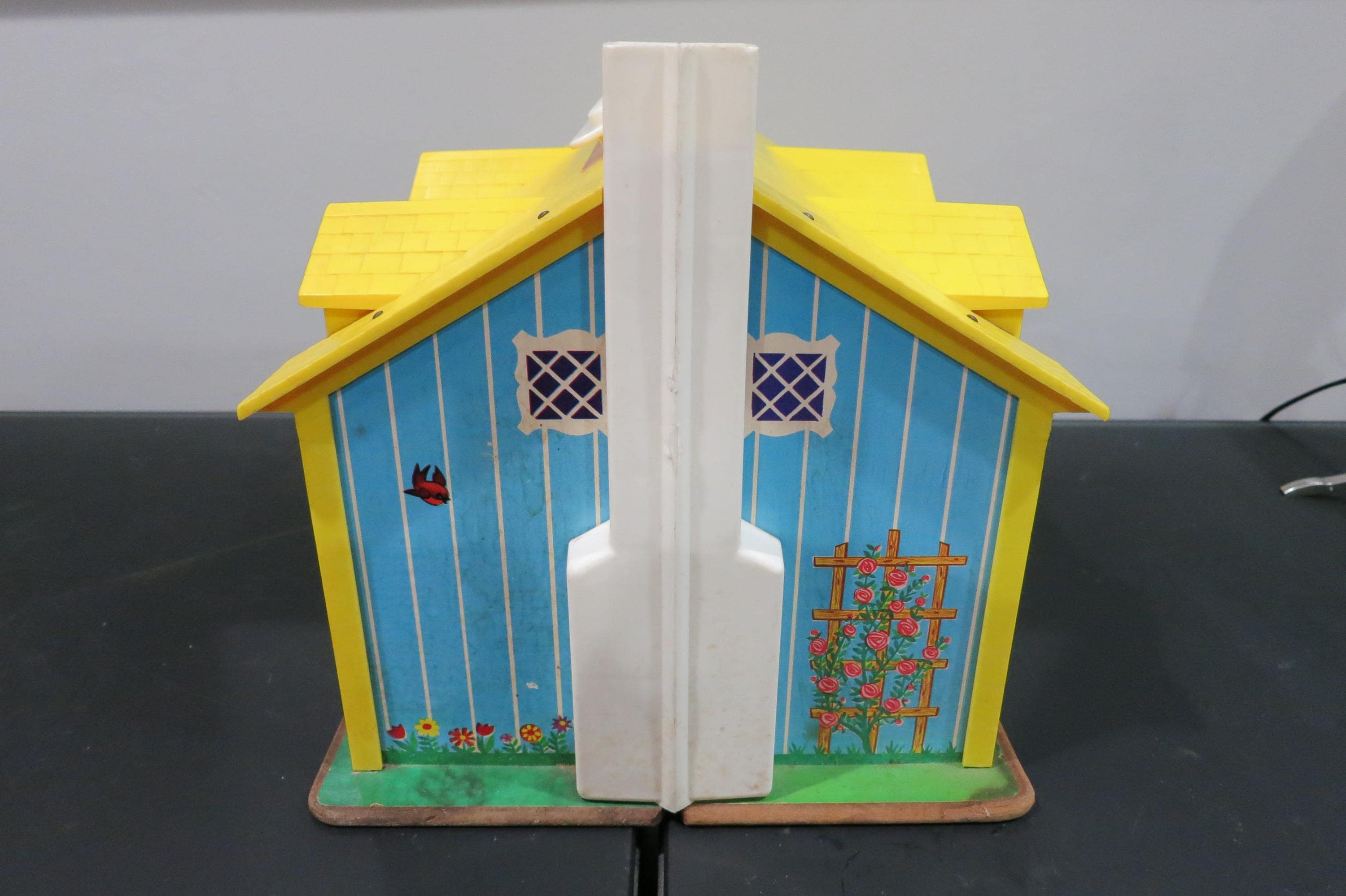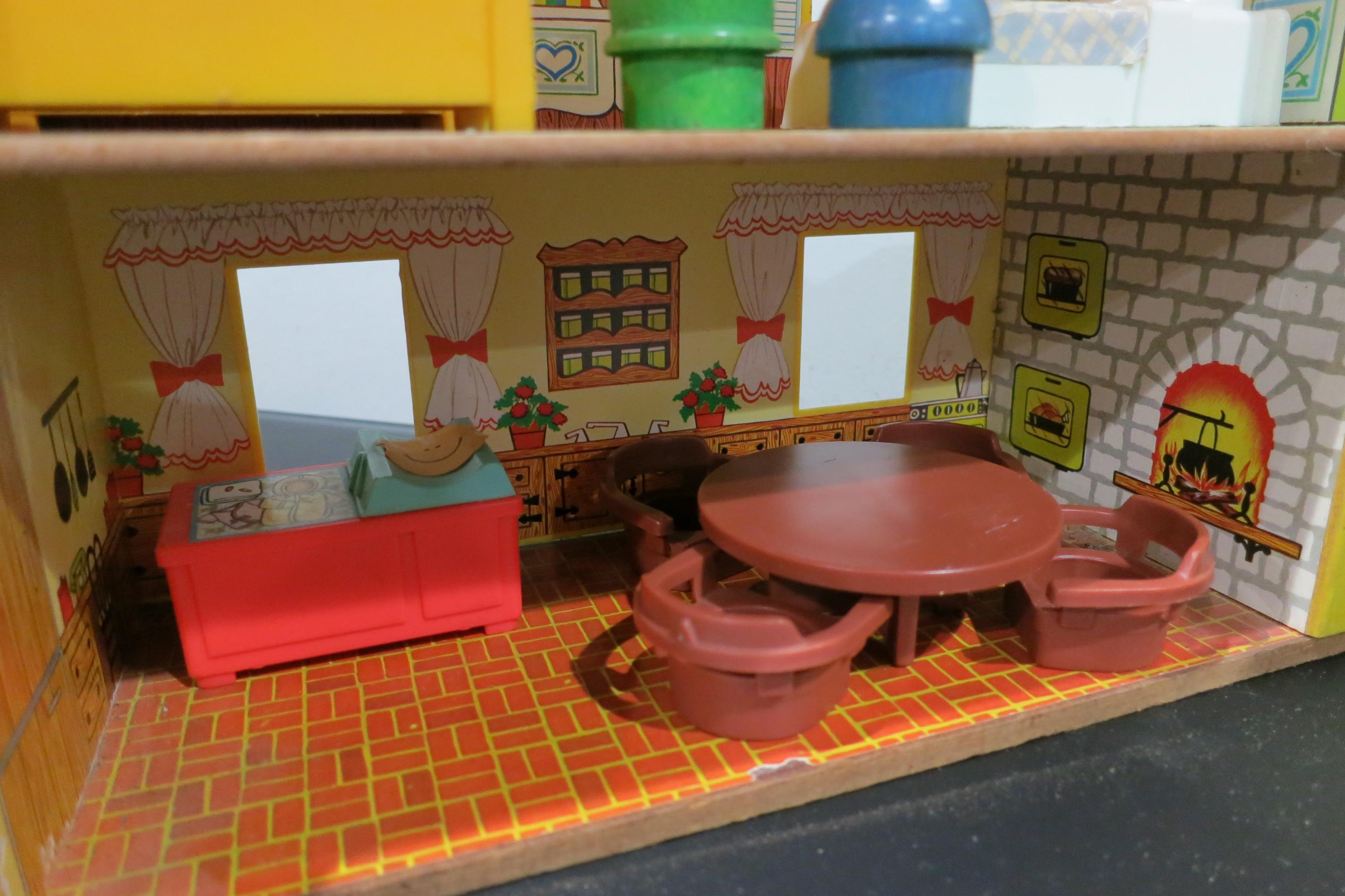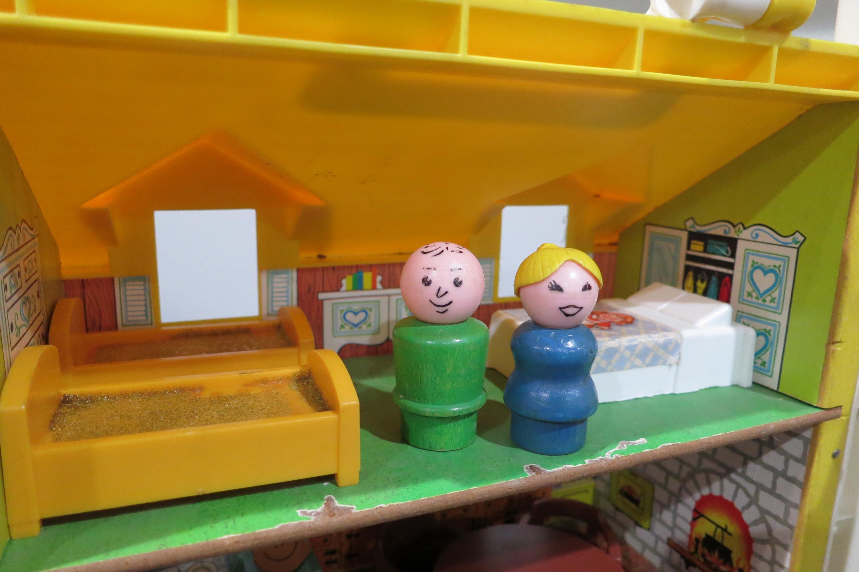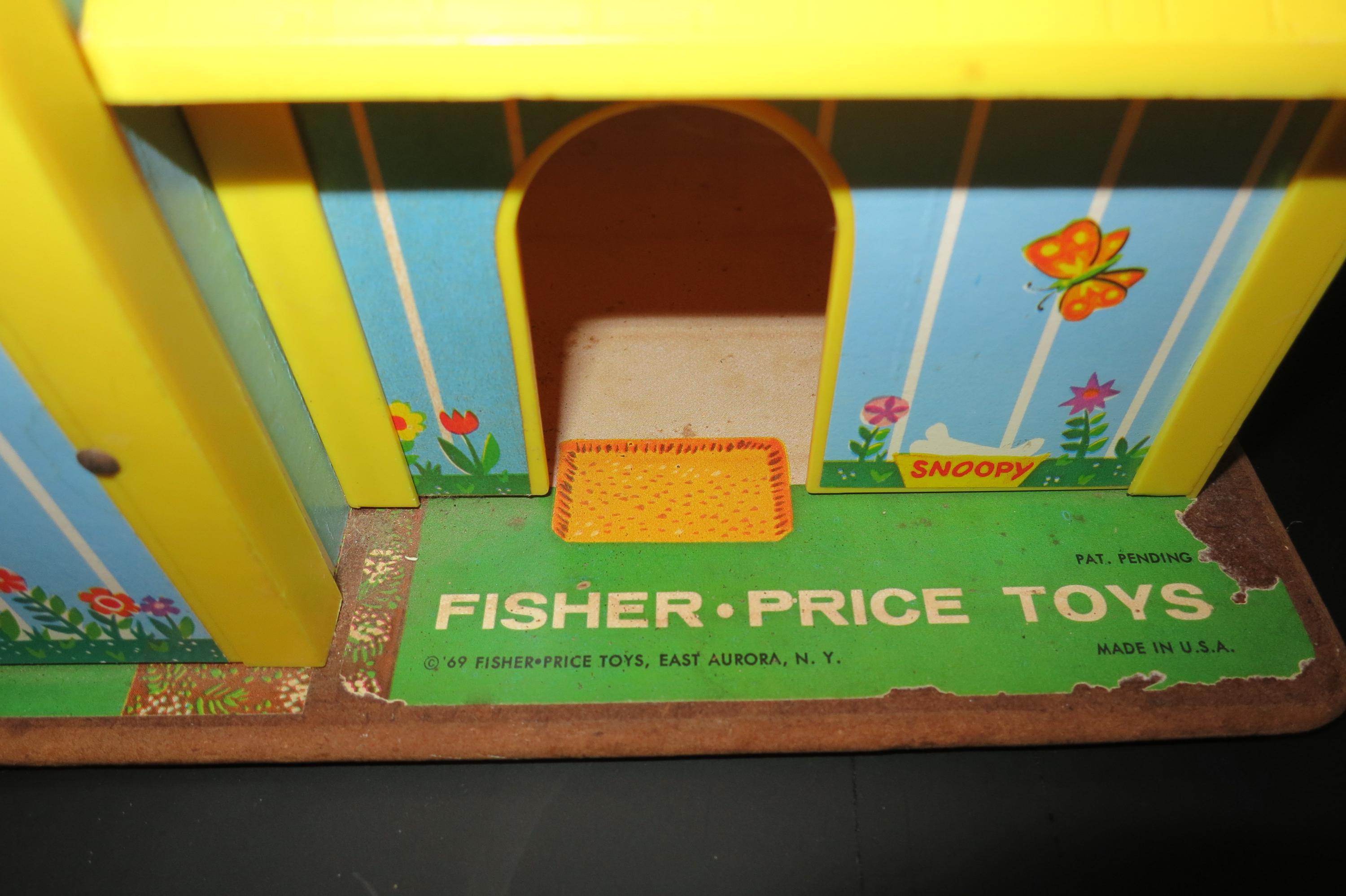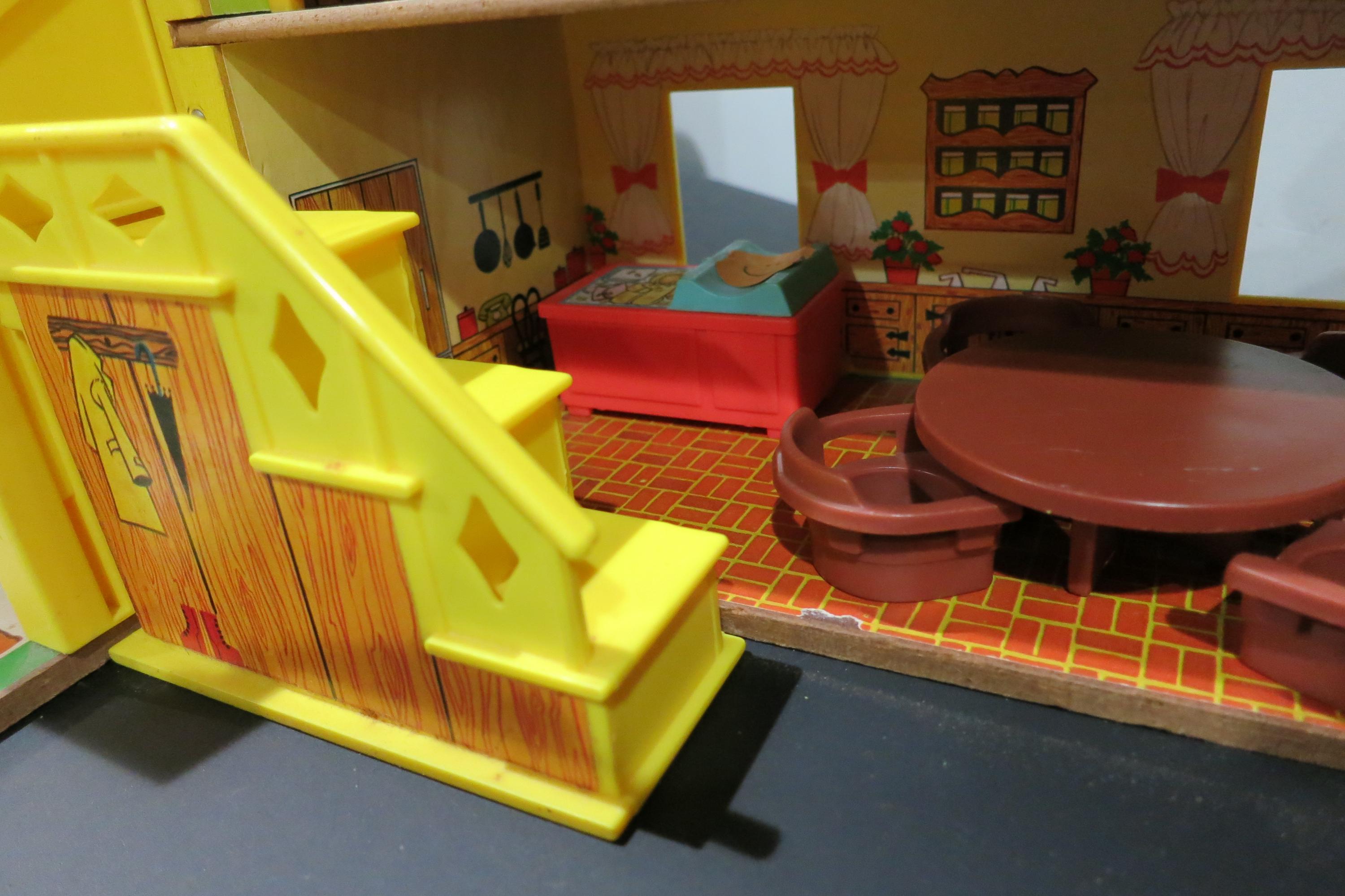 Vintage 1969 Fisher Price Play House: Yellow with Car Furniture People 22 Pieces. Excellent Condition. Obviously, this did not come fully furnished as you see it now. We added all kinds of furniture to fill the rooms, even a car for the garage. Excellent Original Condition with normal use wear. Beds could use some cleaning where the original foam came off. Doorbell Still Works! 22 Pieces, Including the House, 2 Baby People, Mom and Dad, Car, 3 Beds, Table with 4 Chairs, Changing Table, 2 High Chairs, Desk, Cradle, rocking Horse, Crib and the stairs with storage door underneath. Would make a great gift.