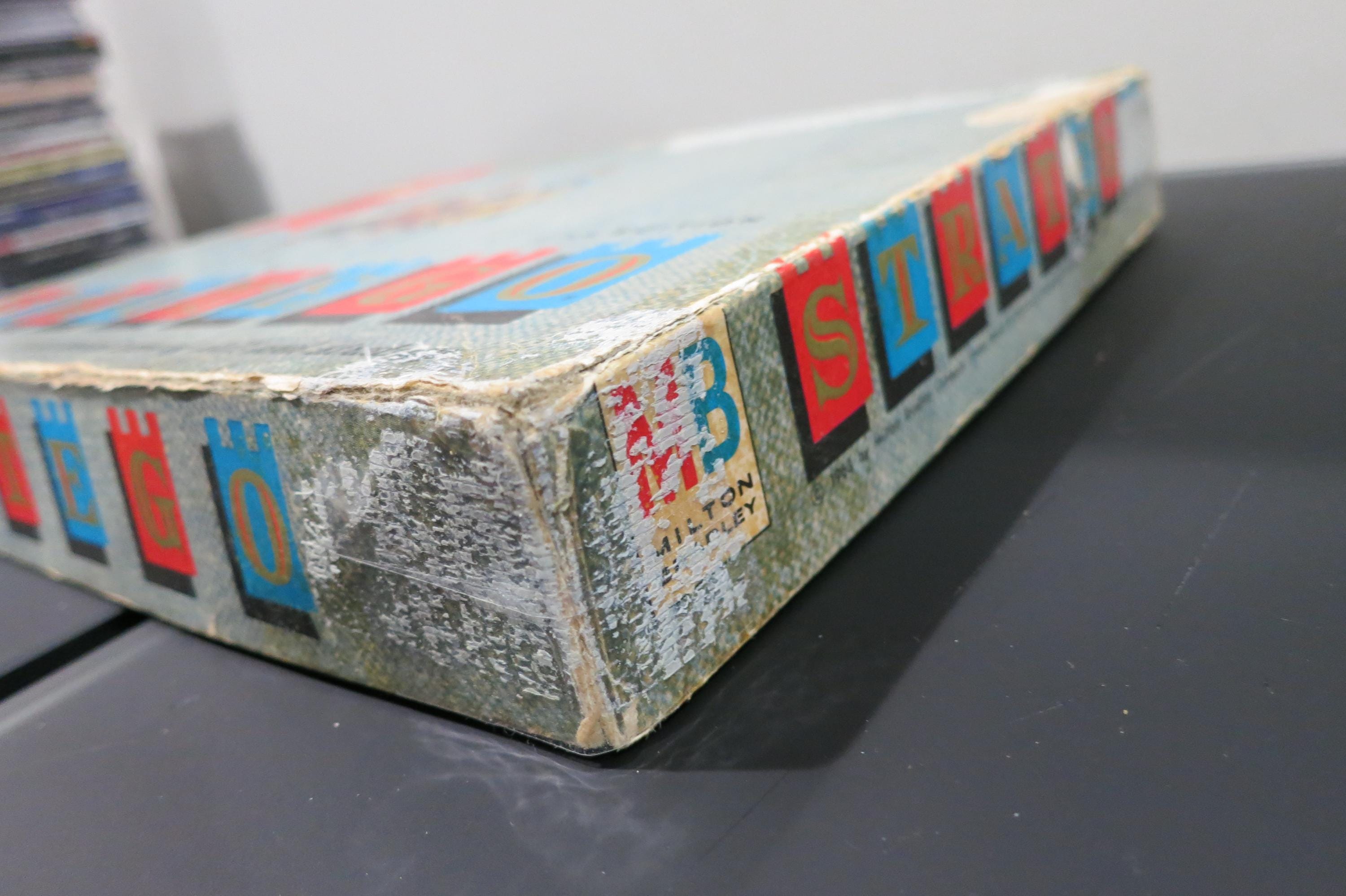 Vintage 1963 Milton Bradley Board Game Stratego Fascinating Two Handed Strategy Game Fine Edition. Early version with the smaller box and different board. Box is worn out and has tape all over it. Has been well love and played, but it is complete!!