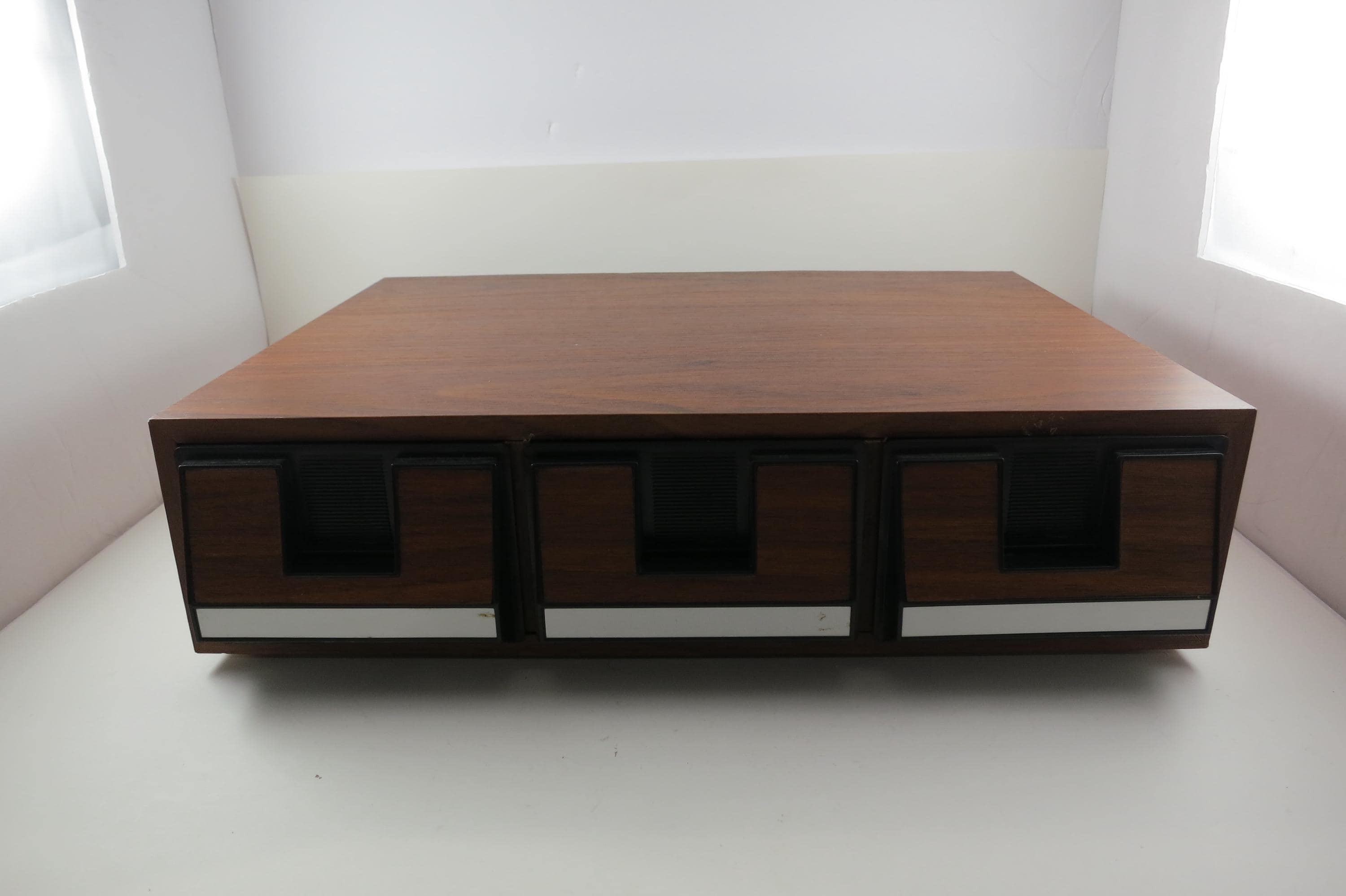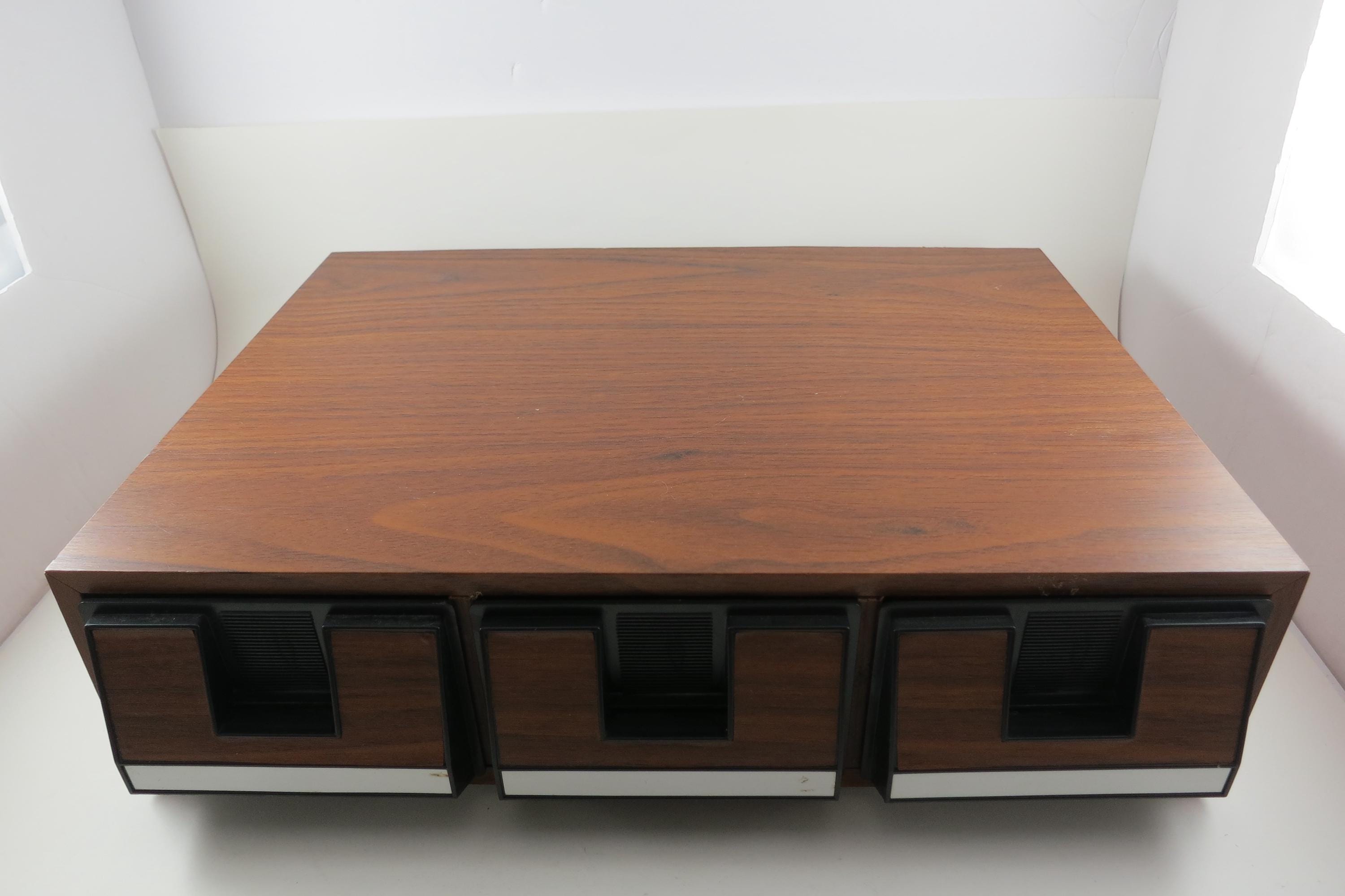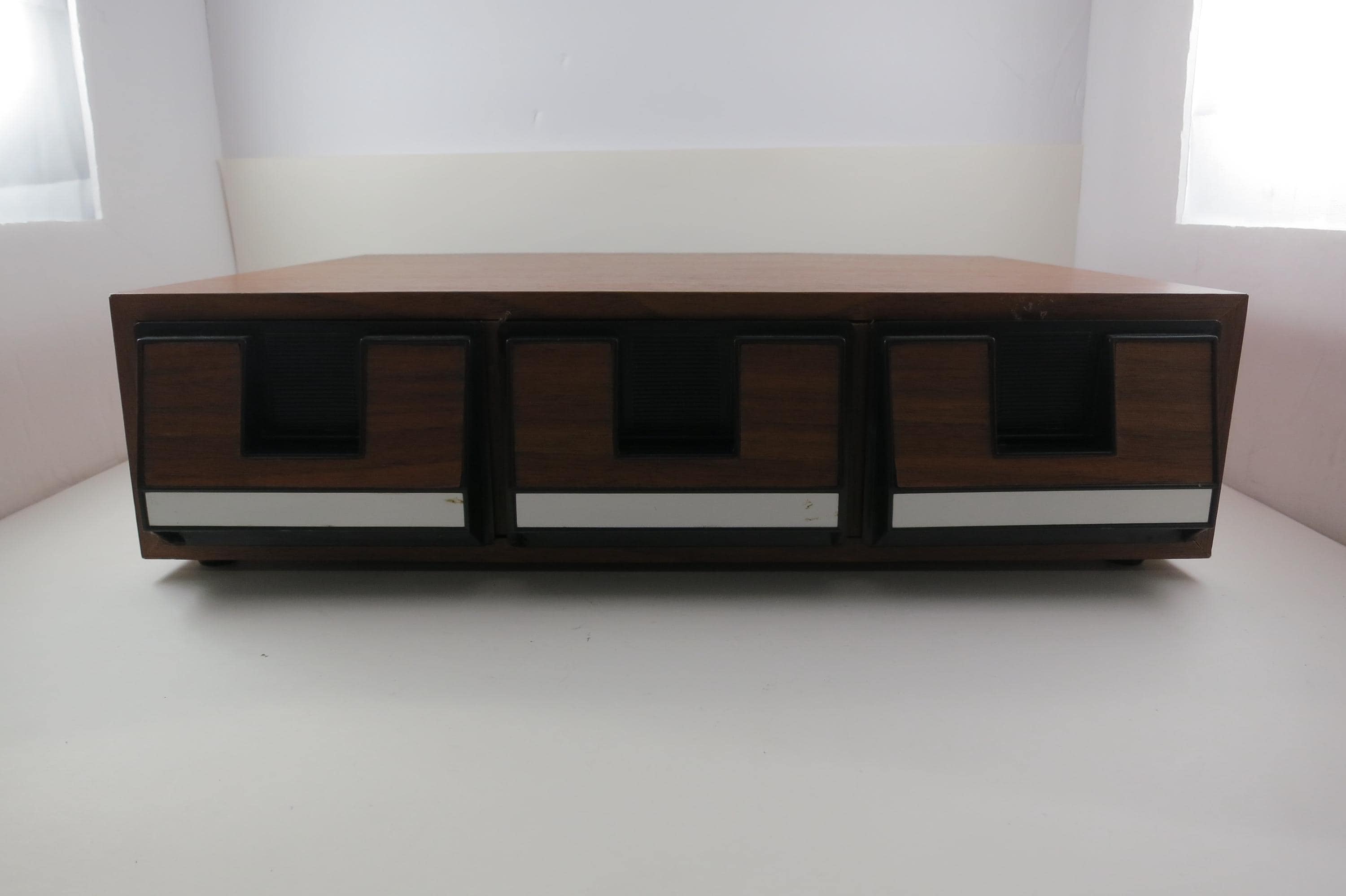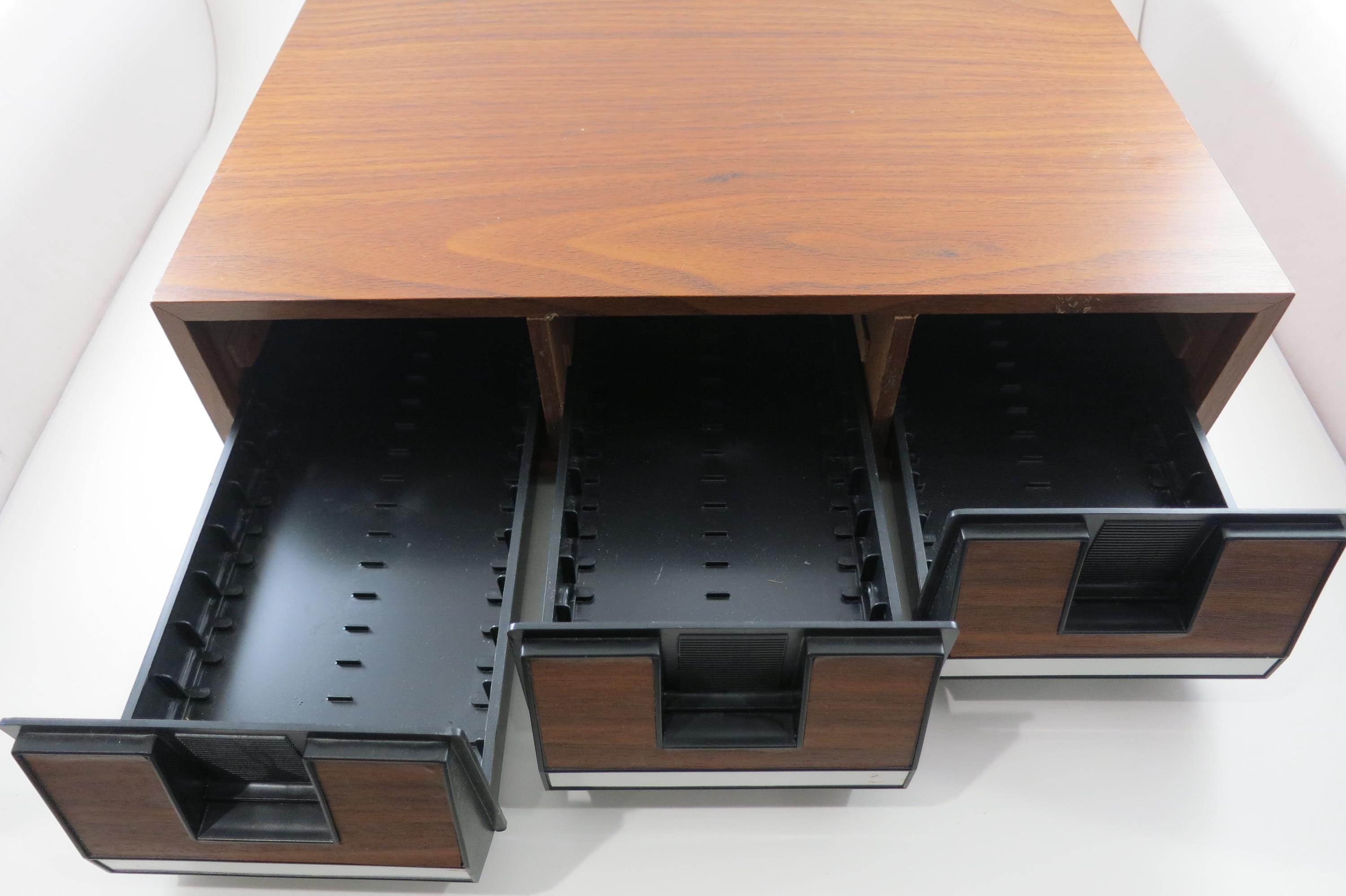 1980's Faux Wood Three Row Hard Cassette Holder Music Mate Holds 42 Cassette Tapes Excellent Condition Home Storage. Has three pull out trays that each hold 14 Cassettes for a total of 42. This is the hard variety that is for home cassette storage. Measures 15 17 1/4 inches wide, 8 1/4 inches deep and 6 7/8 inches tall.
