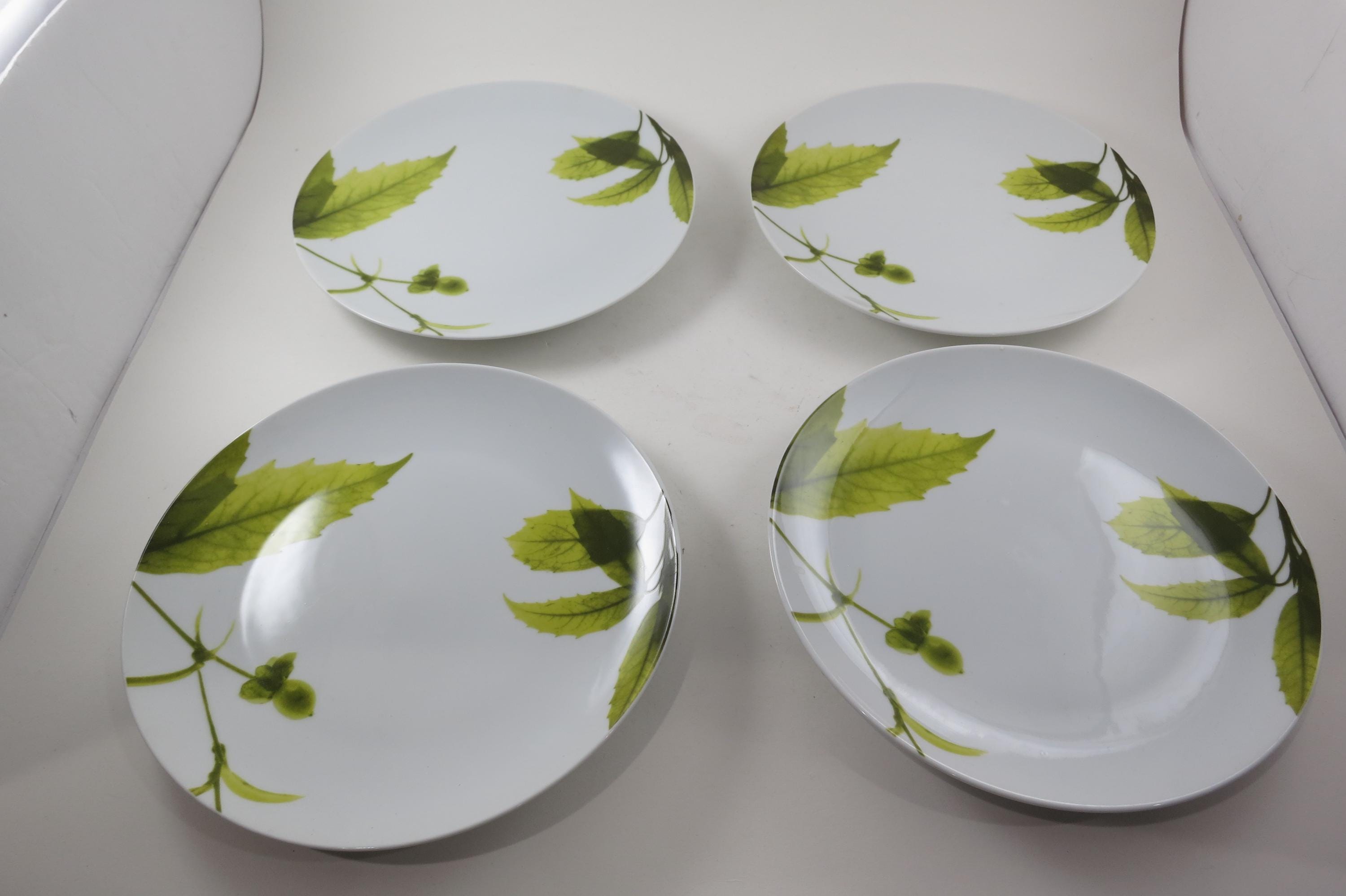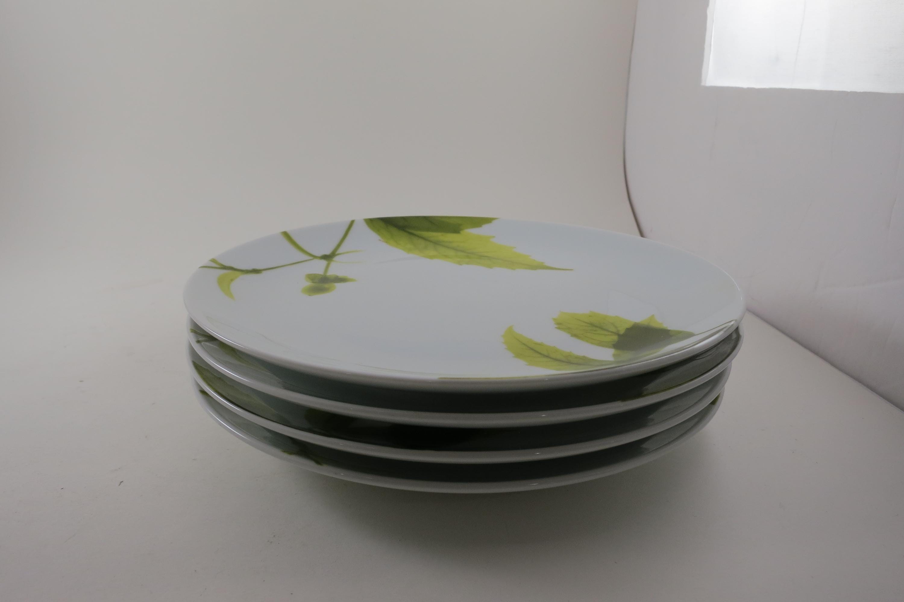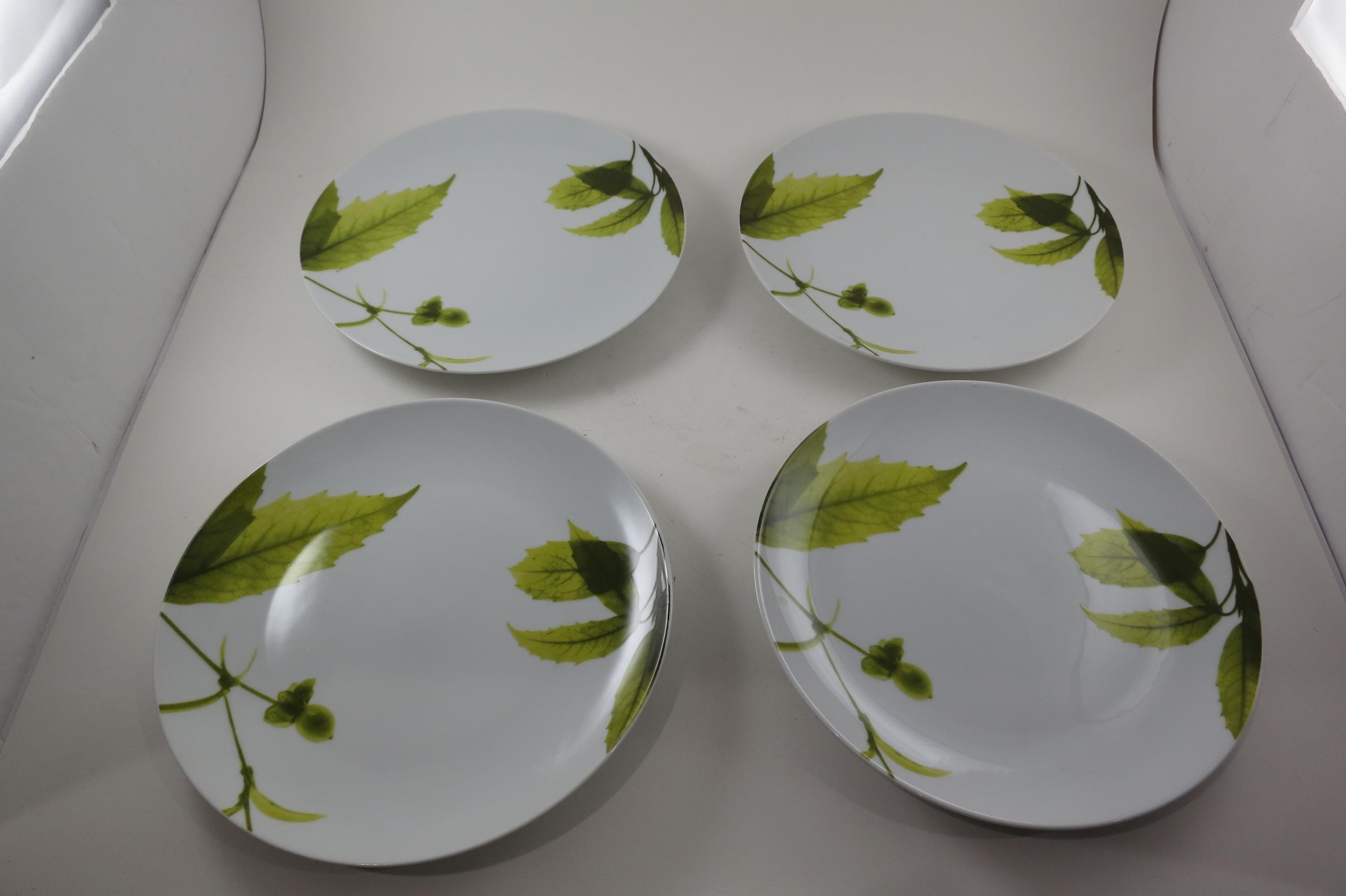 Set of Four Vintage Crate & Barrel 8 Inch Salad Plates Green Leaf Porcelain. No chips, cracks or damages. These are in very good condition and are a beautiful pattern!