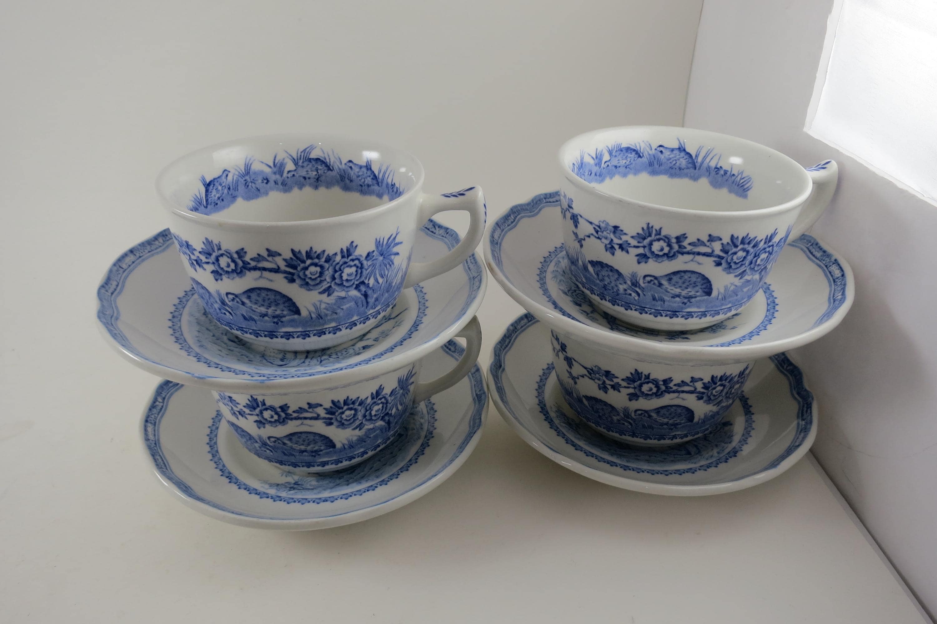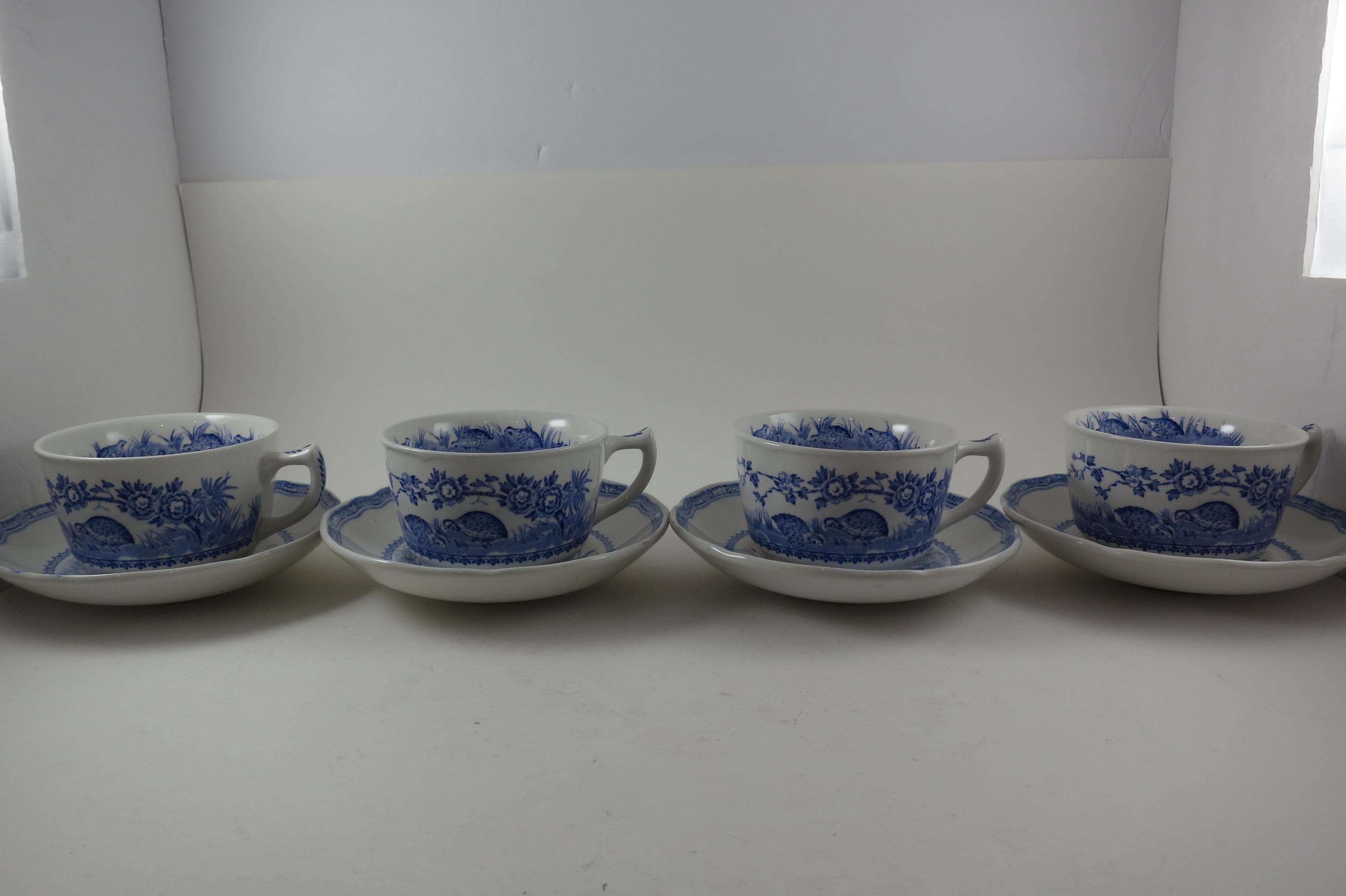 Vintage Set of Four Mason's Quail Blue & White England Cup and Saucer Sets.