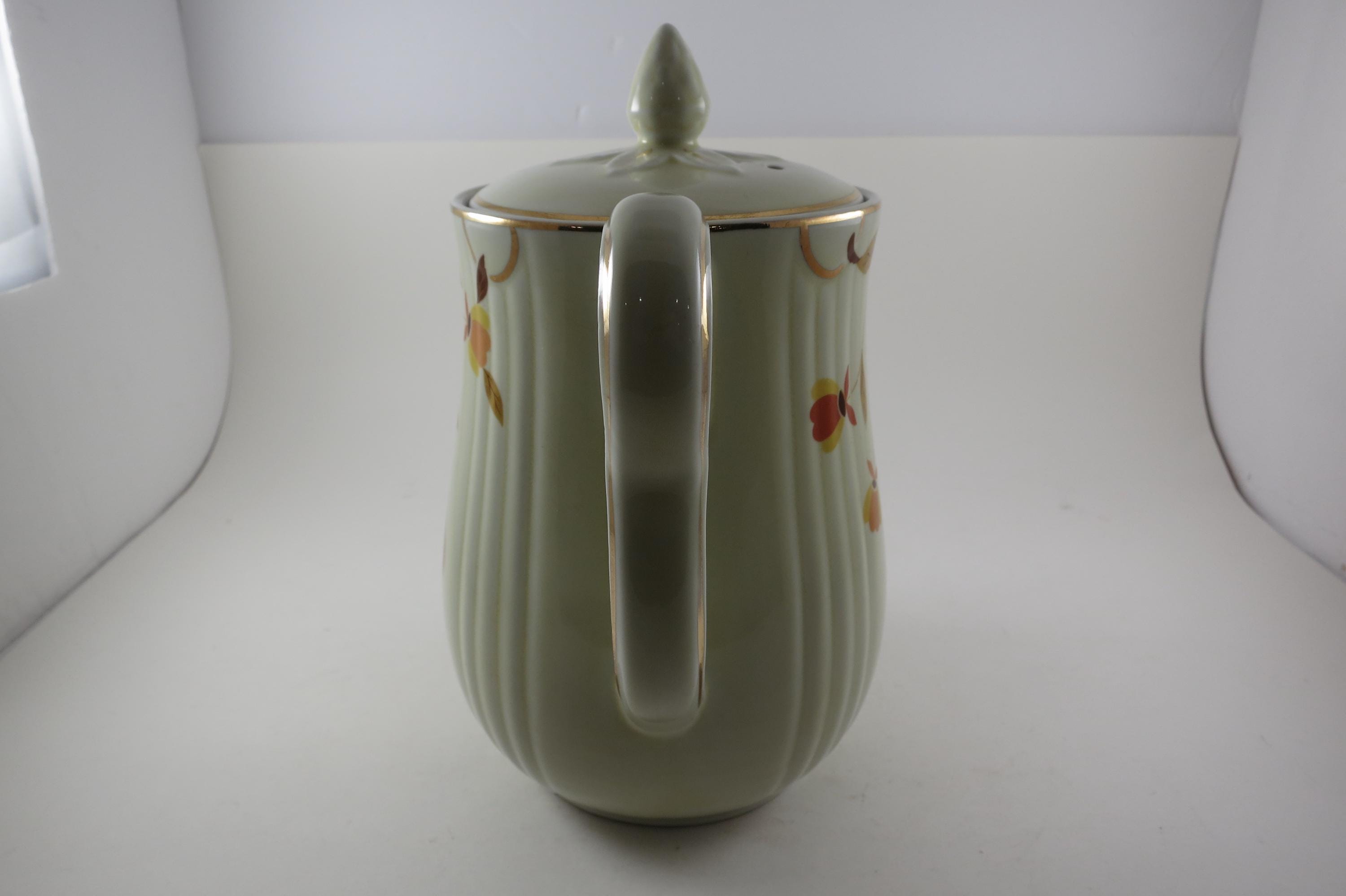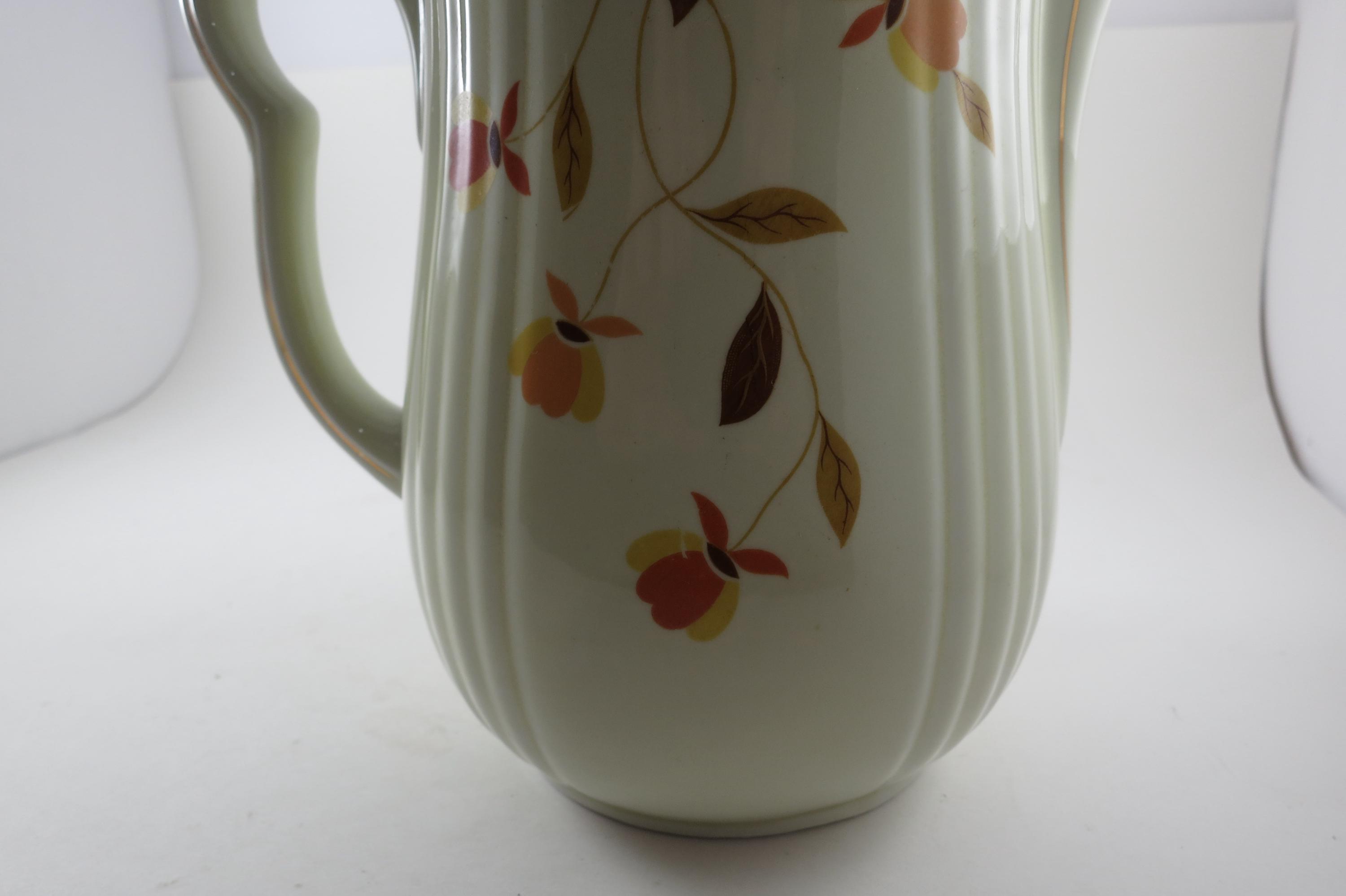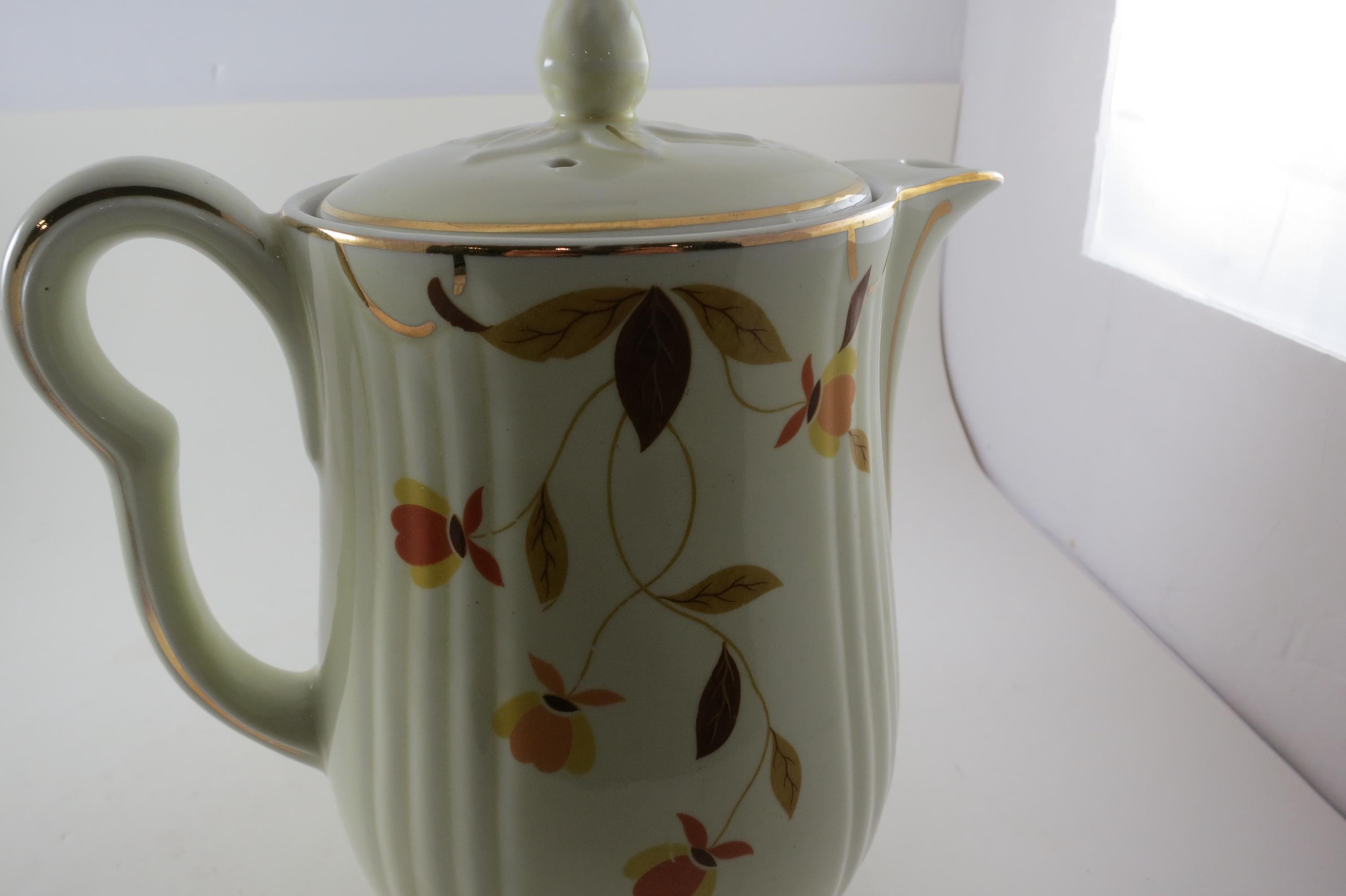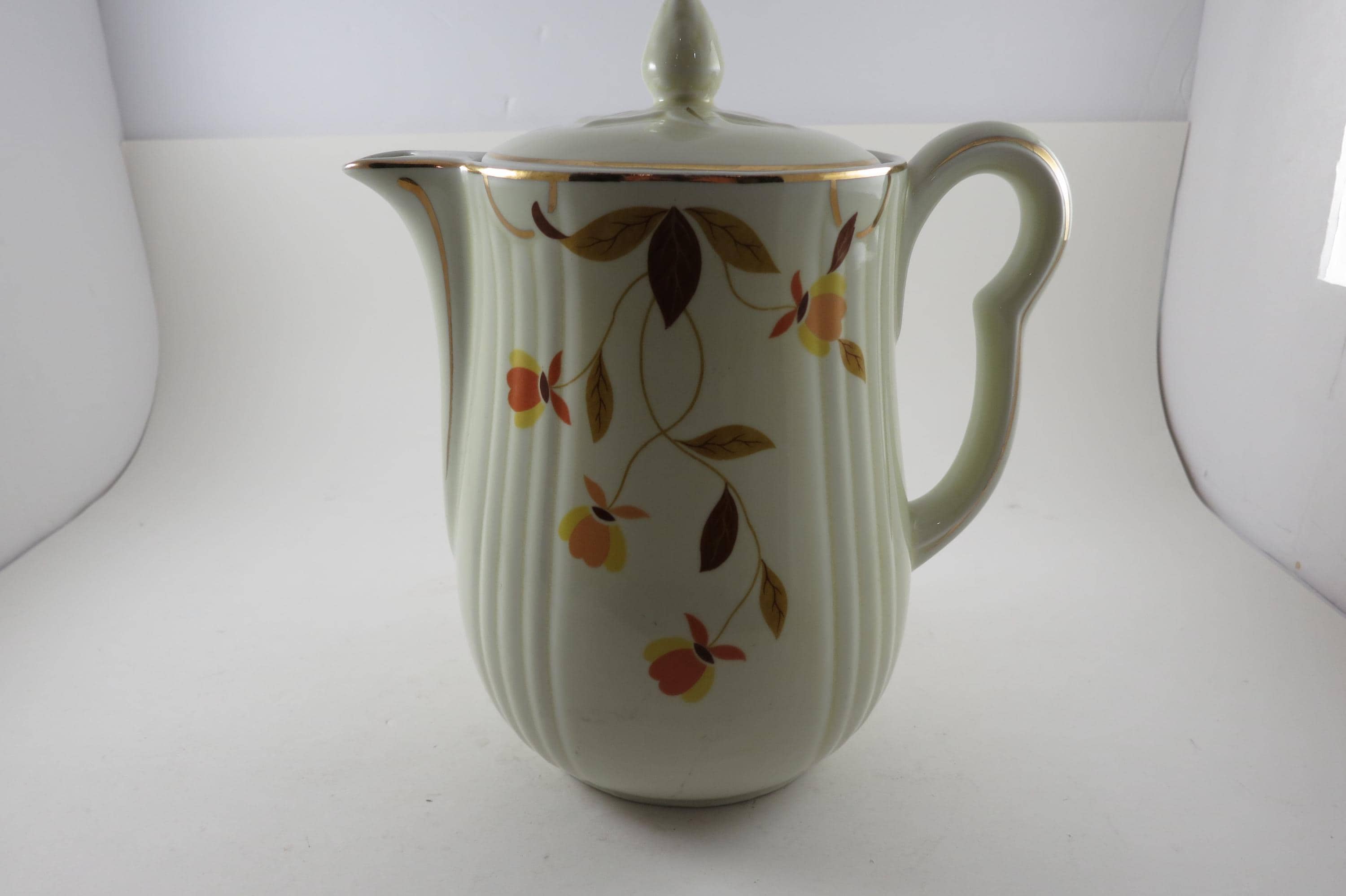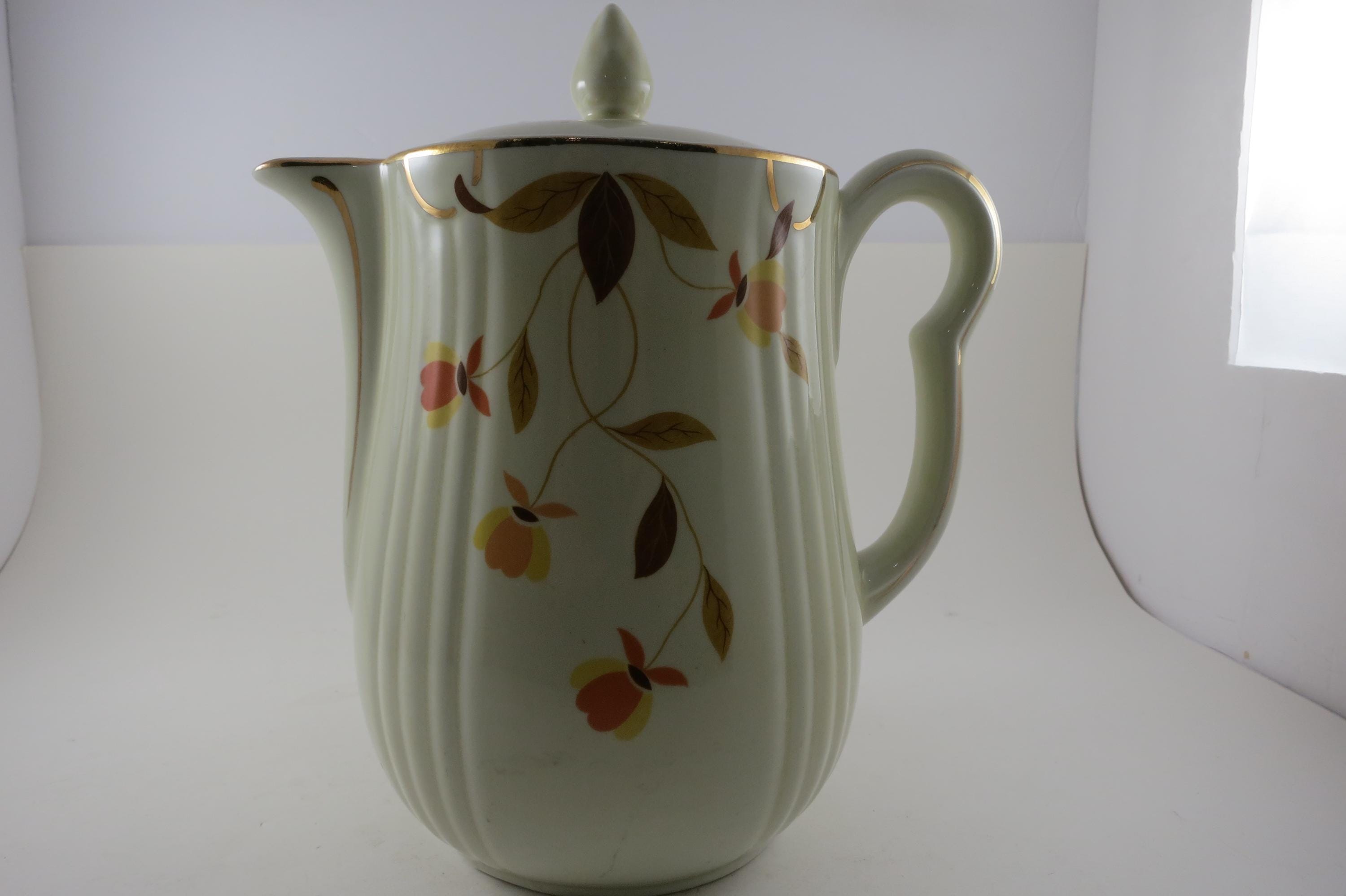 Vintage Jewel Tea Autumn Leaf Pattern Rayed Coffee Pot with Lid 2 Piece with Spout Excellent Condition. Beautiful piece with no damages. Measures 9 Inches tall and 8 inches wide. Very Nice Large Pot.