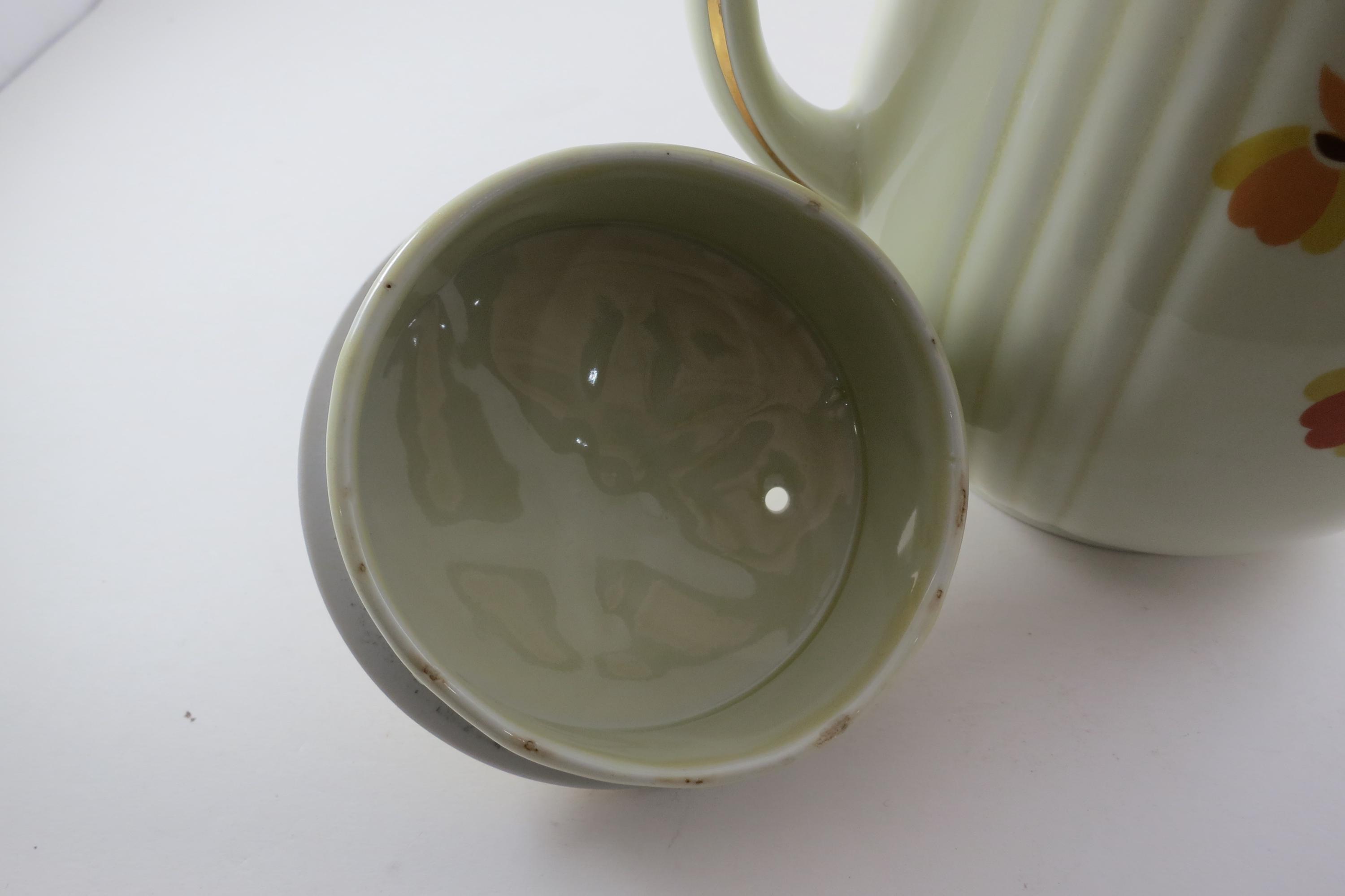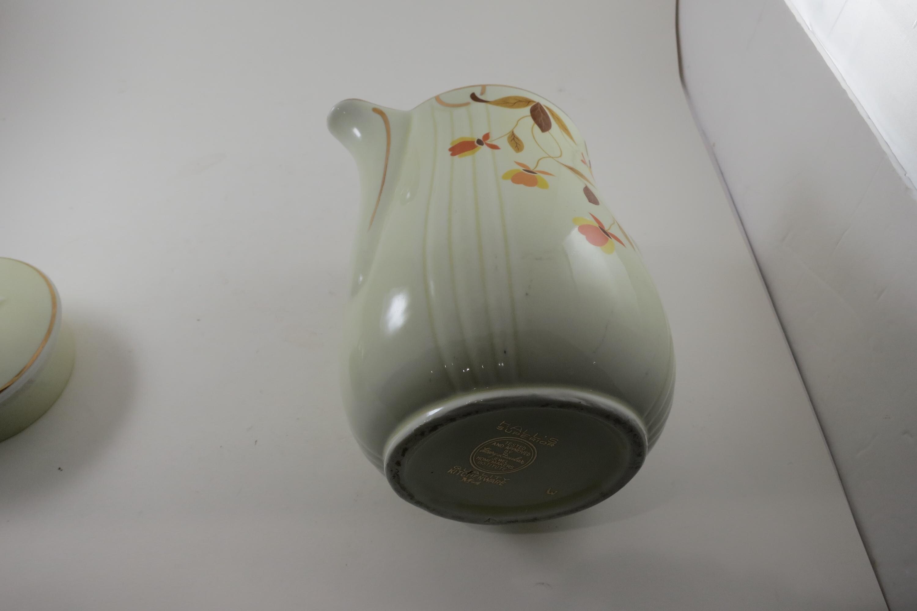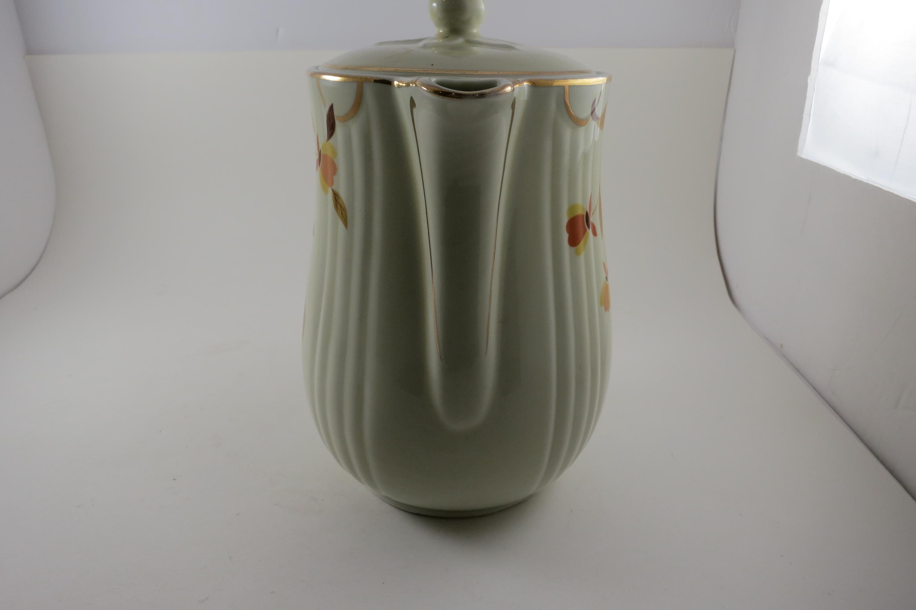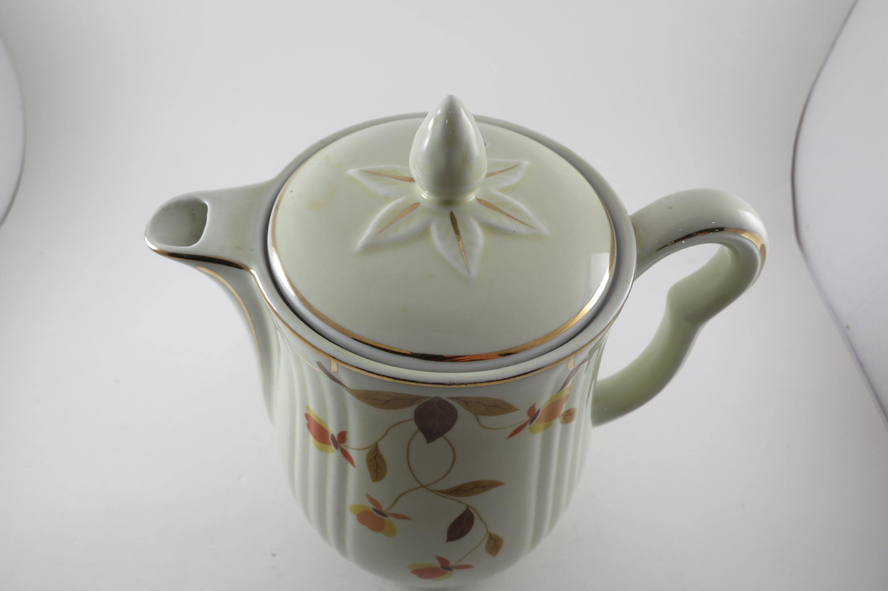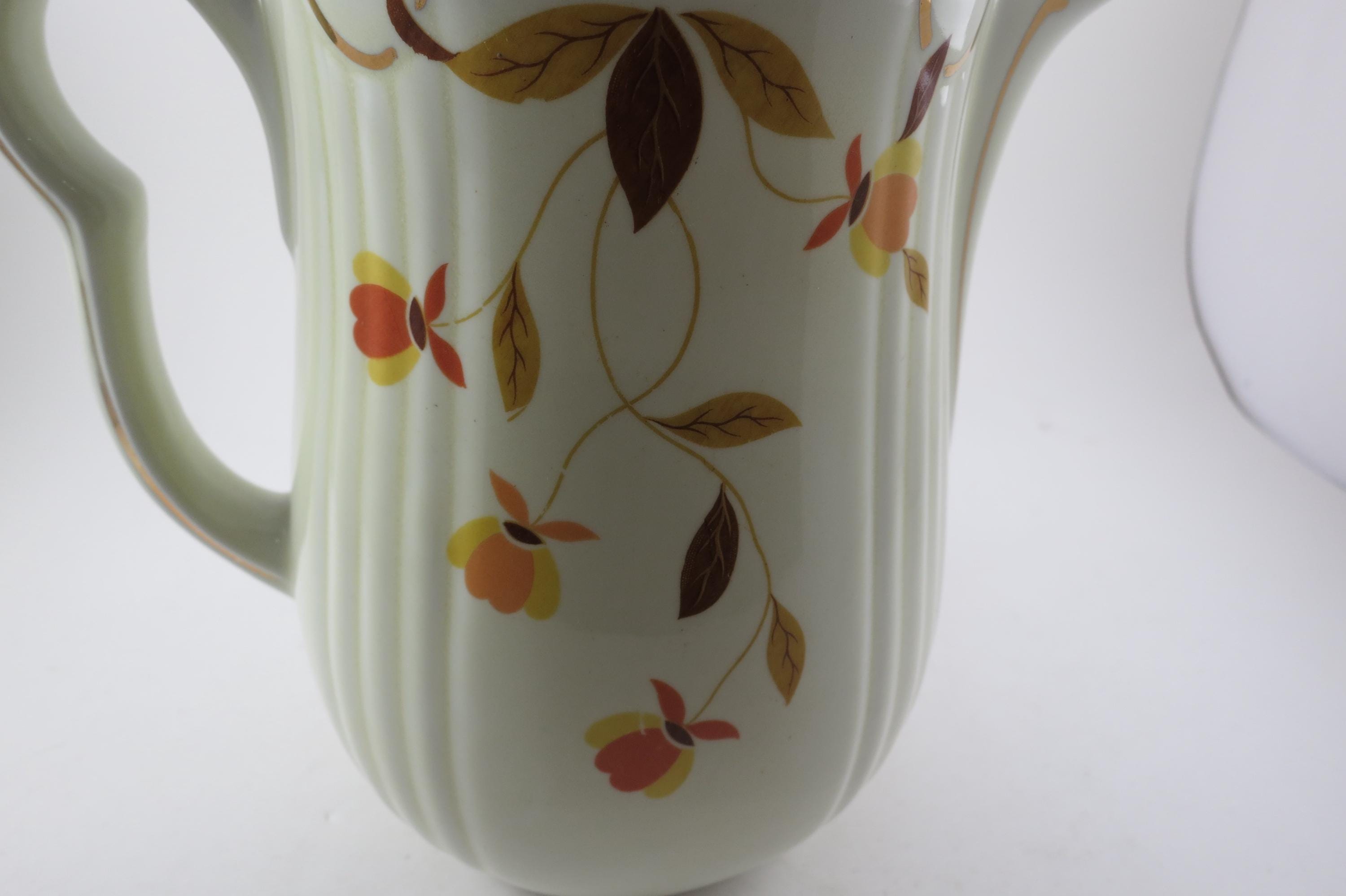 Vintage Jewel Tea Autumn Leaf Pattern Rayed Coffee Pot with Lid 2 Piece with Spout Excellent Condition. Beautiful piece with no damages. Measures 9 Inches tall and 8 inches wide. Very Nice Large Pot.