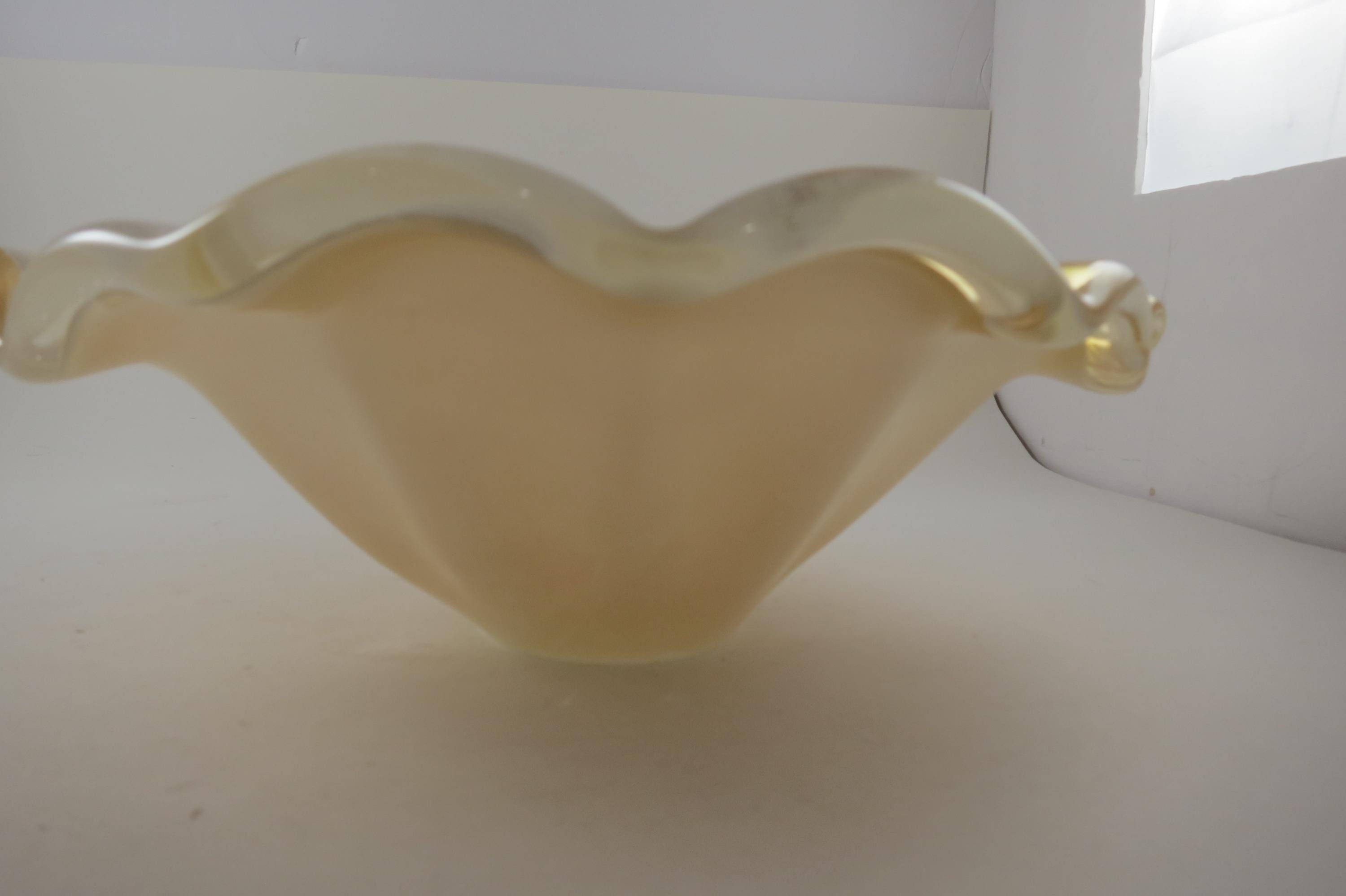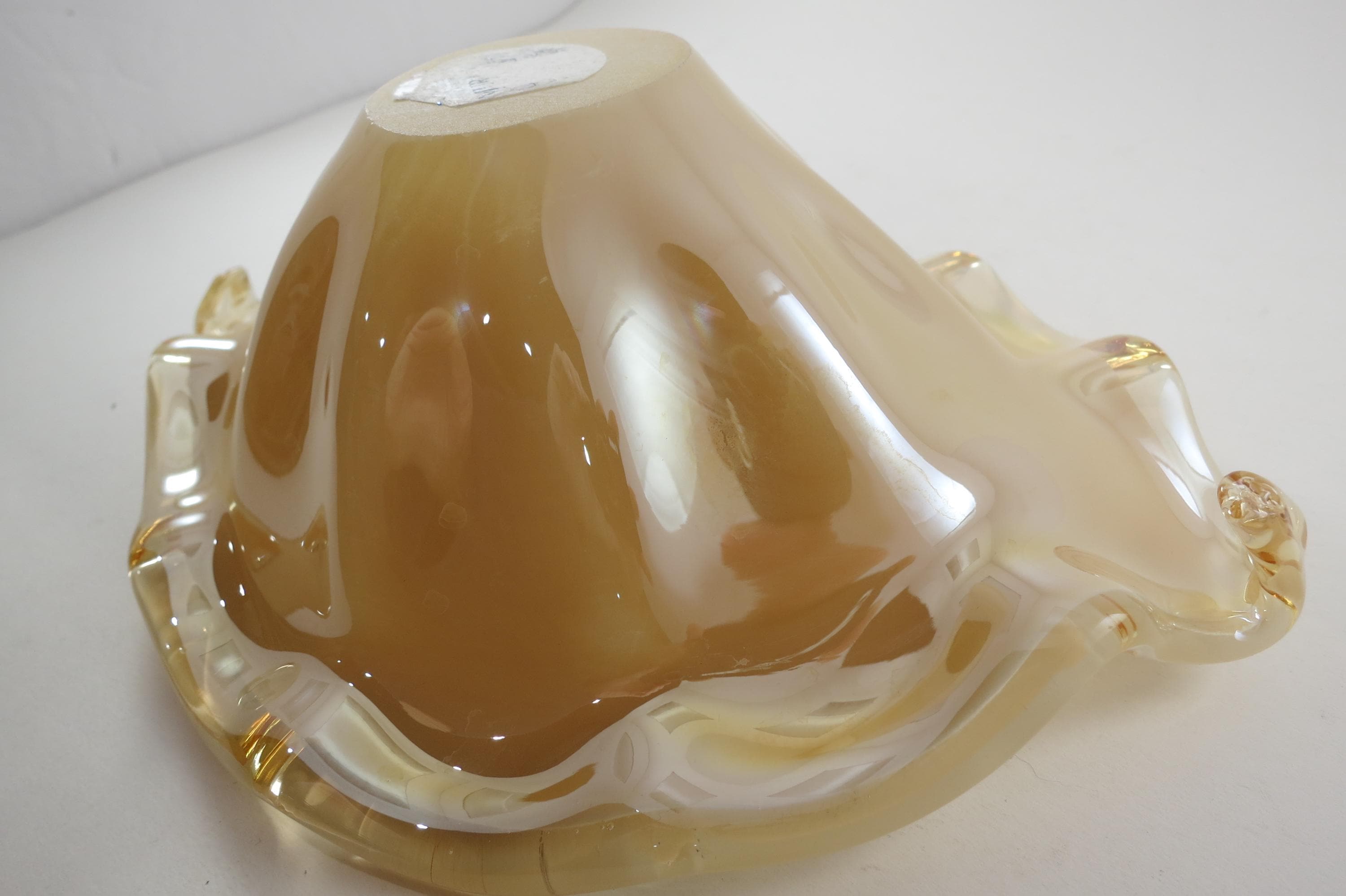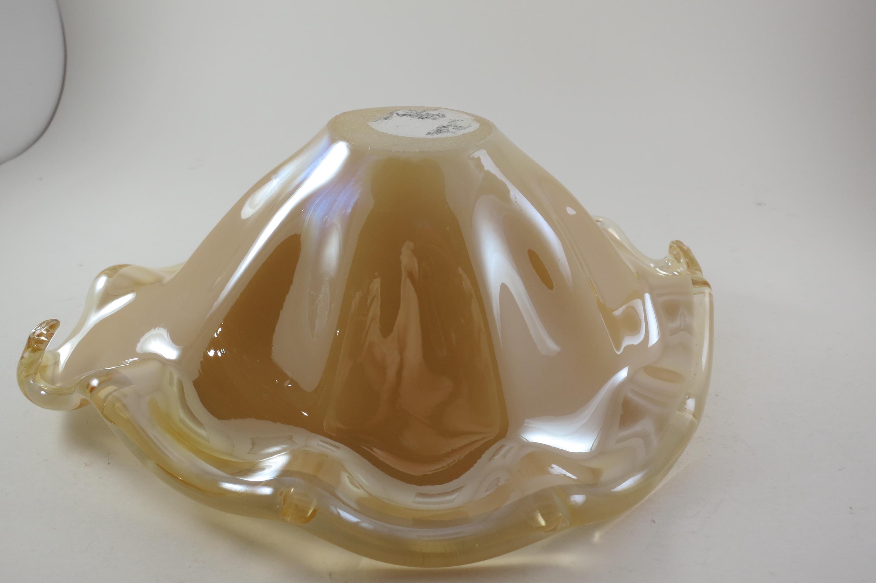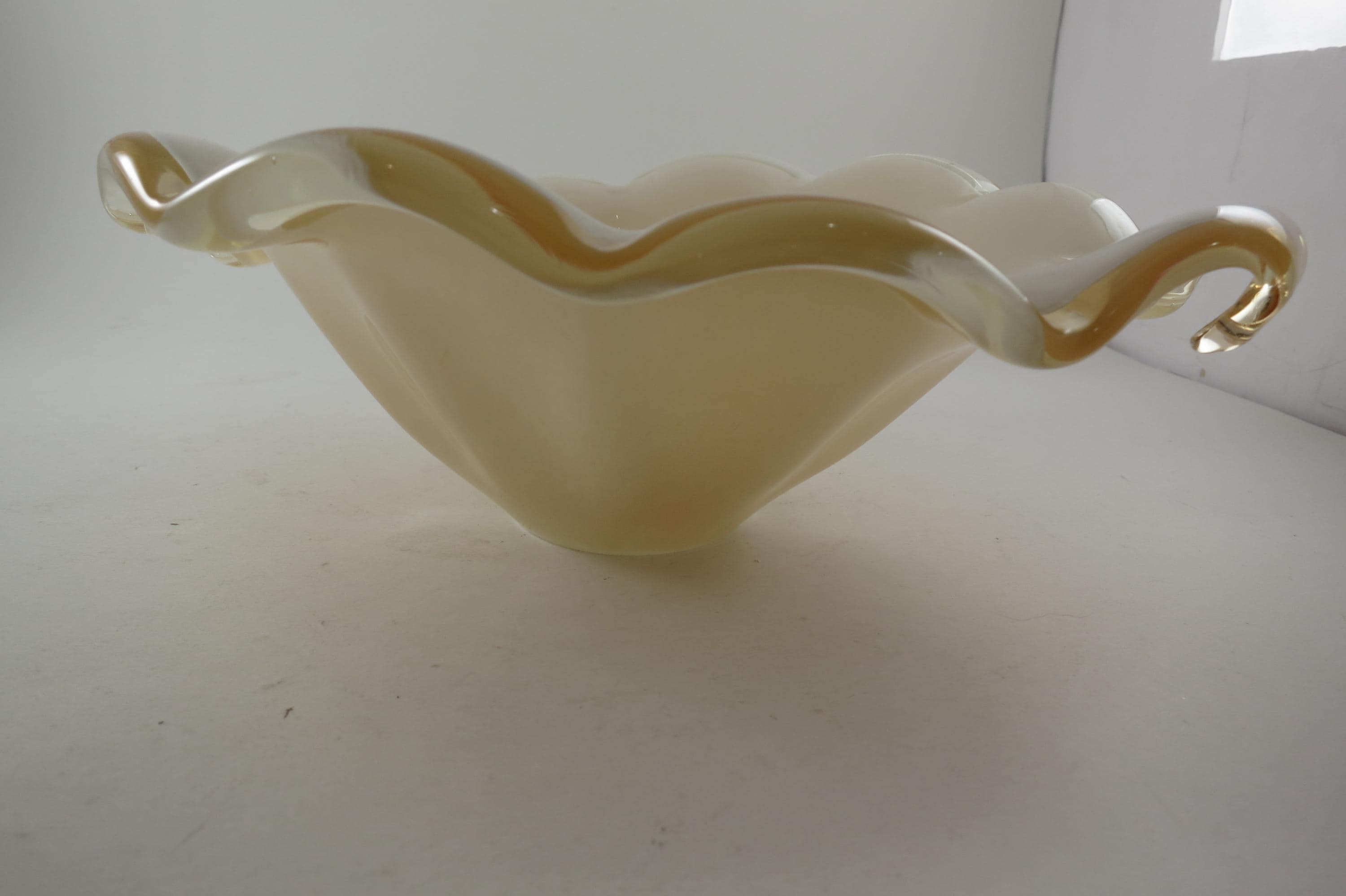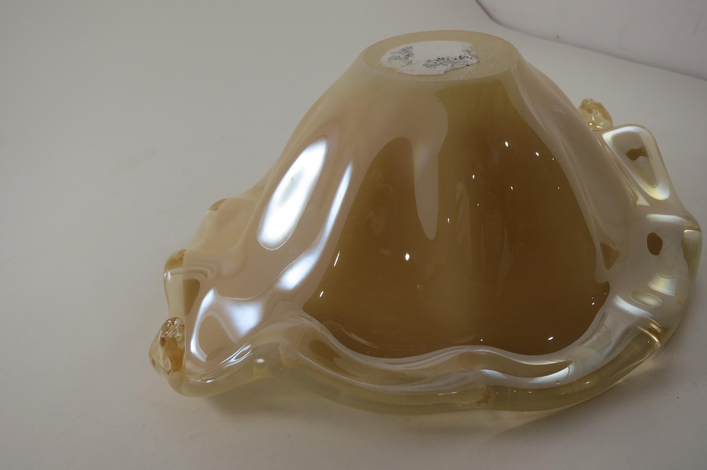 Peach Murano Art Glass Shell Display Bowl Scalloped. No damages, very nice authentic Murano Piece. Measures 9 3/4 inches long, 7 1/2 inches wide and 3 1/4 inches tall.