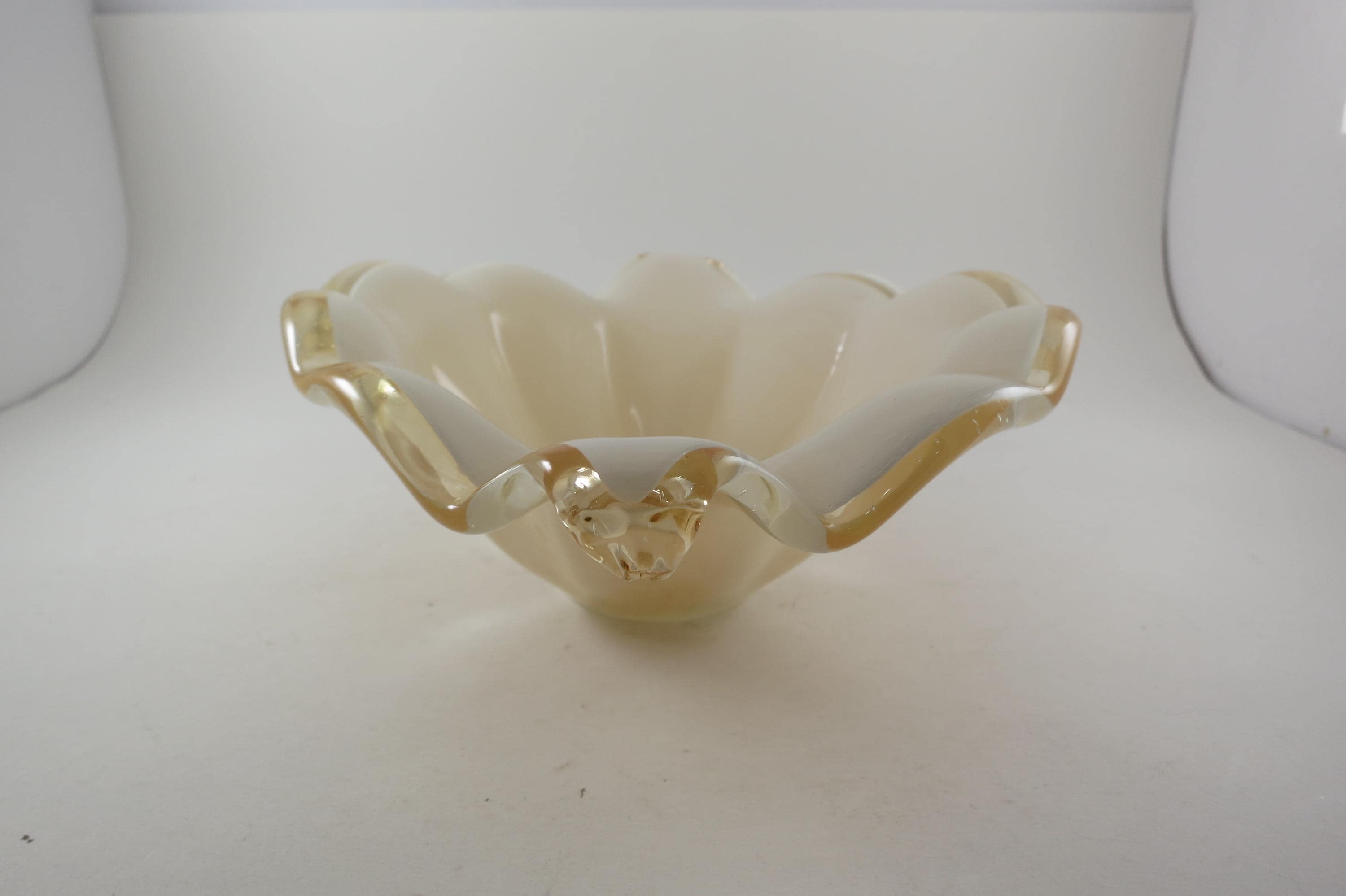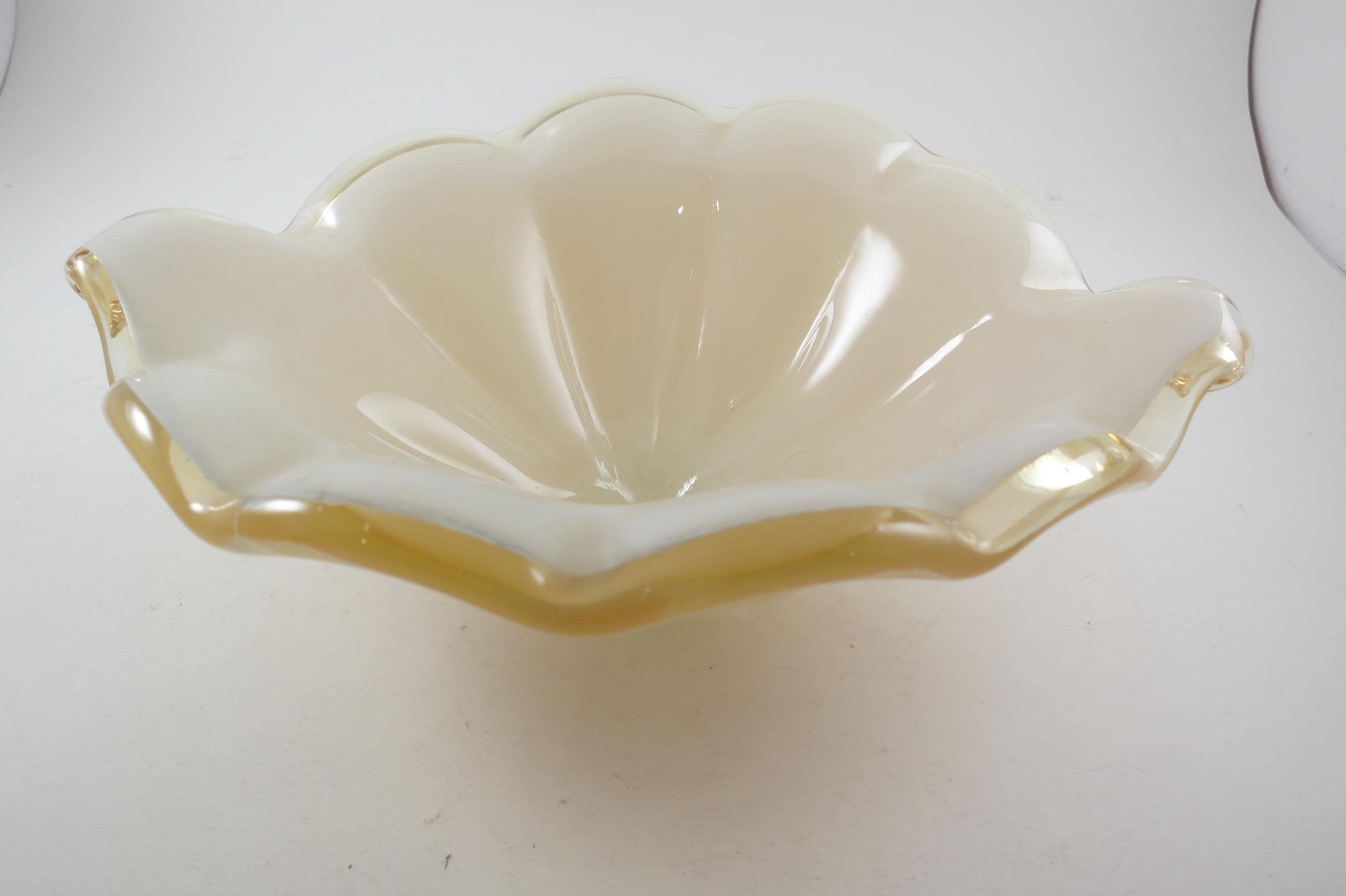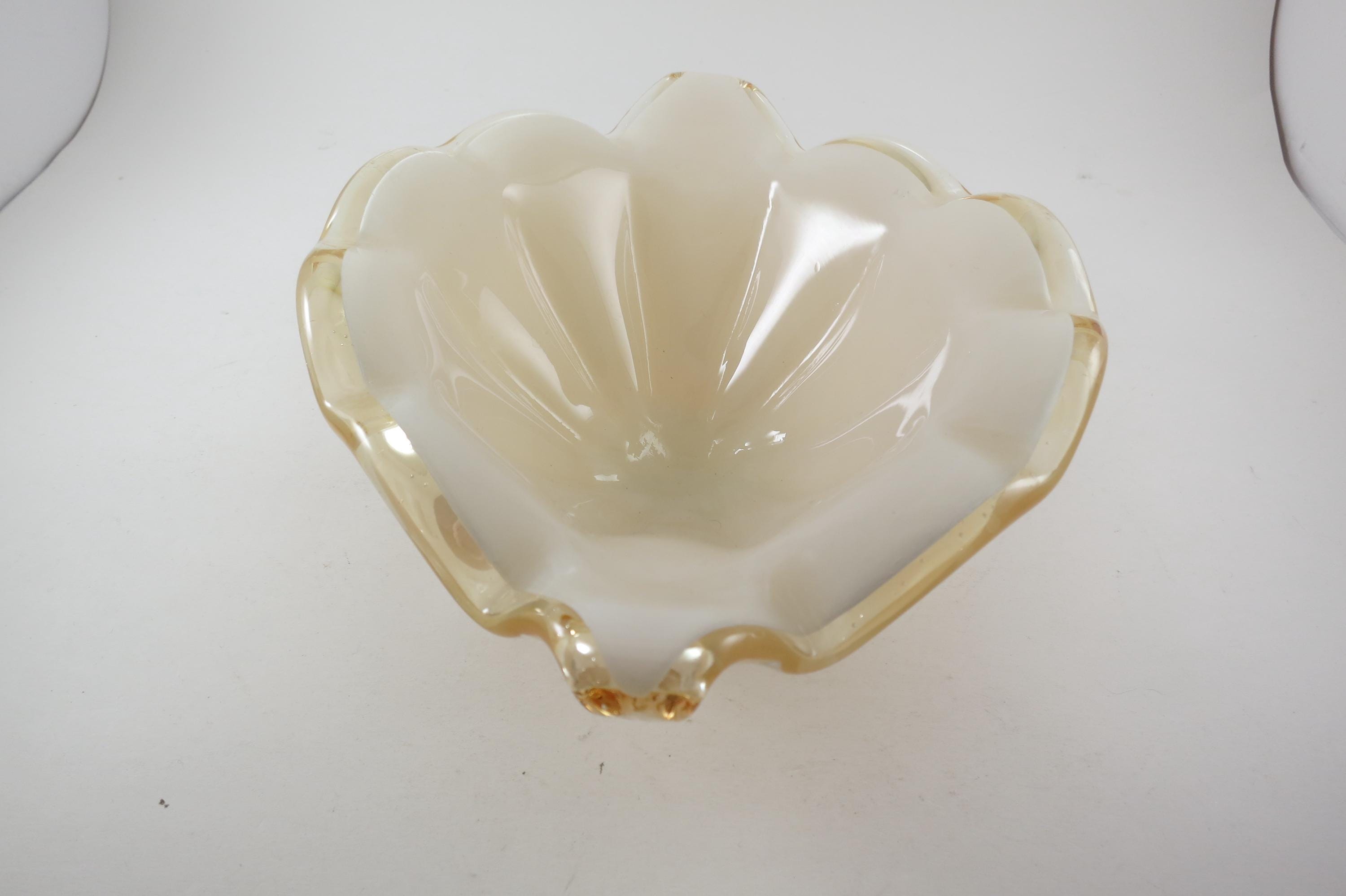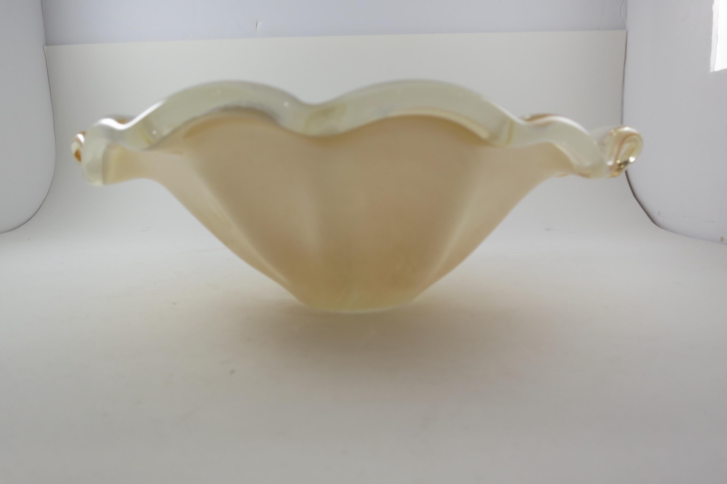 Peach Murano Art Glass Shell Display Bowl Scalloped. No damages, very nice authentic Murano Piece. Measures 9 3/4 inches long, 7 1/2 inches wide and 3 1/4 inches tall.