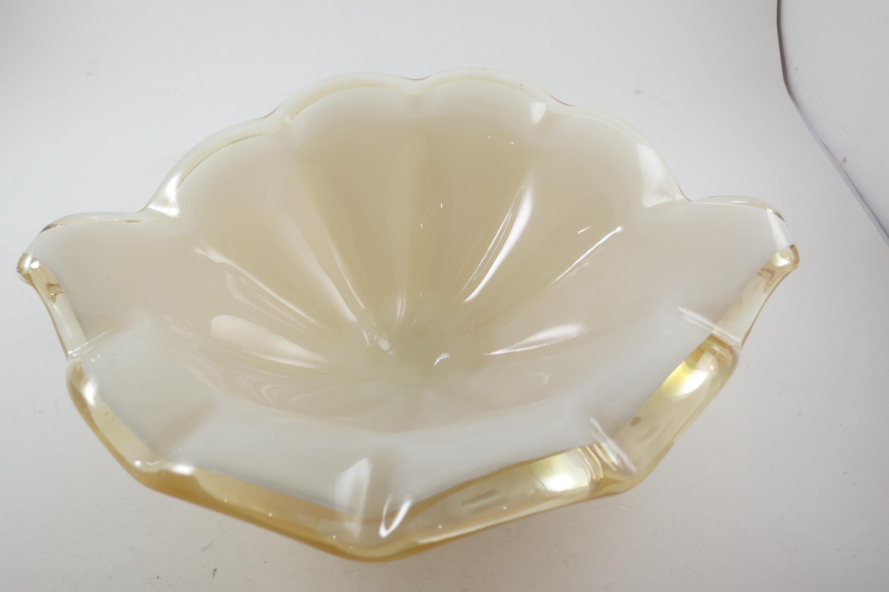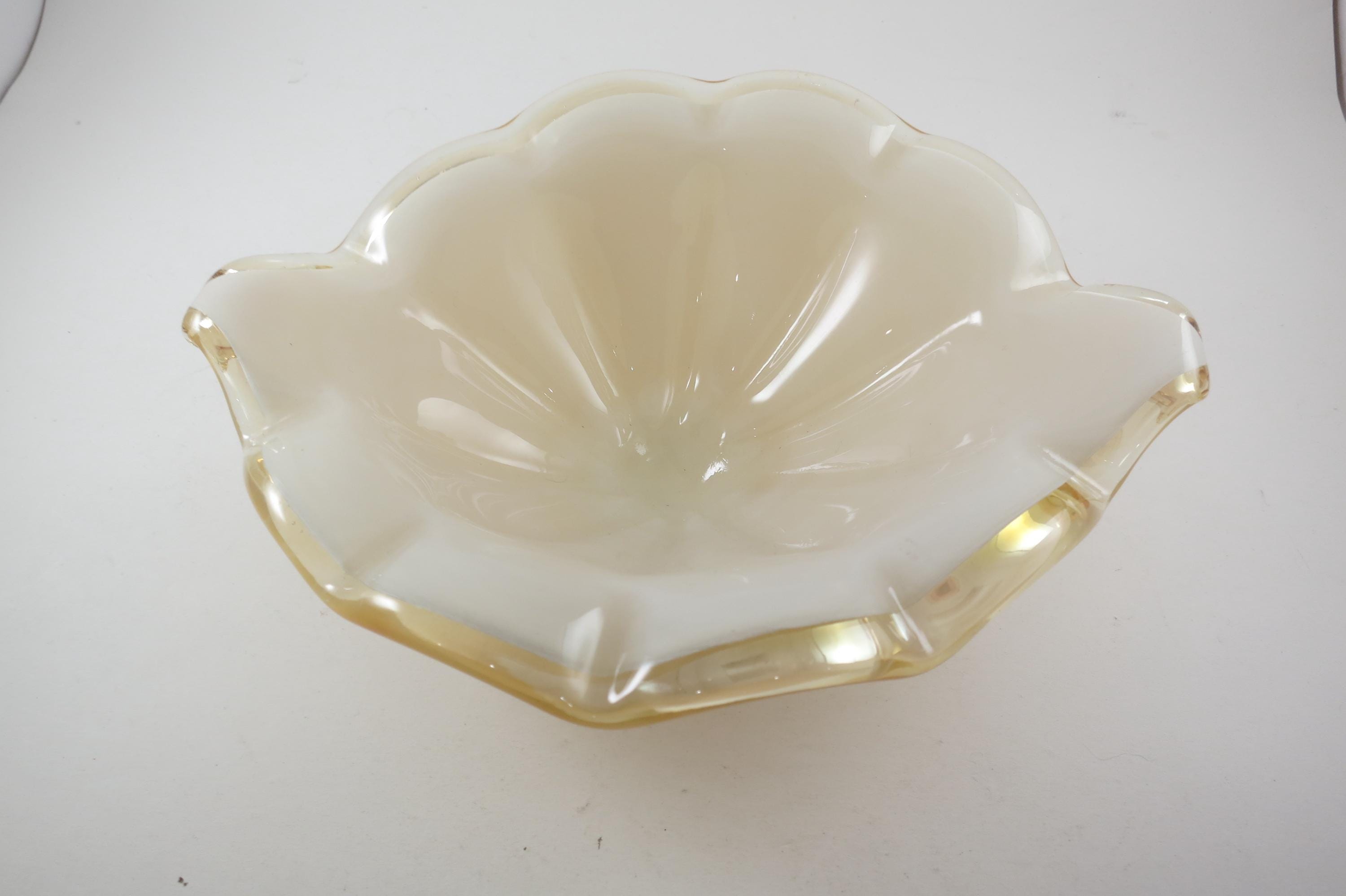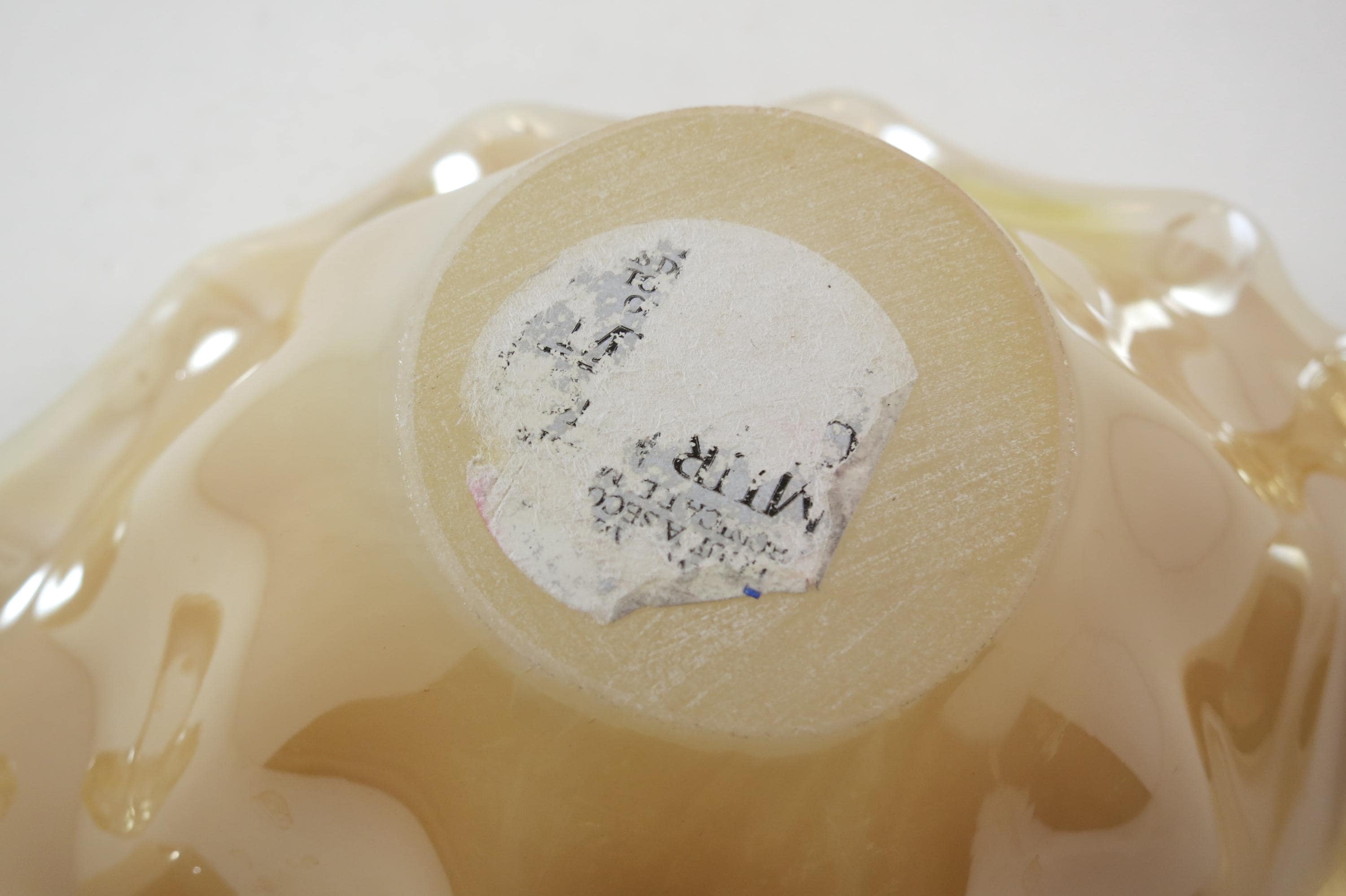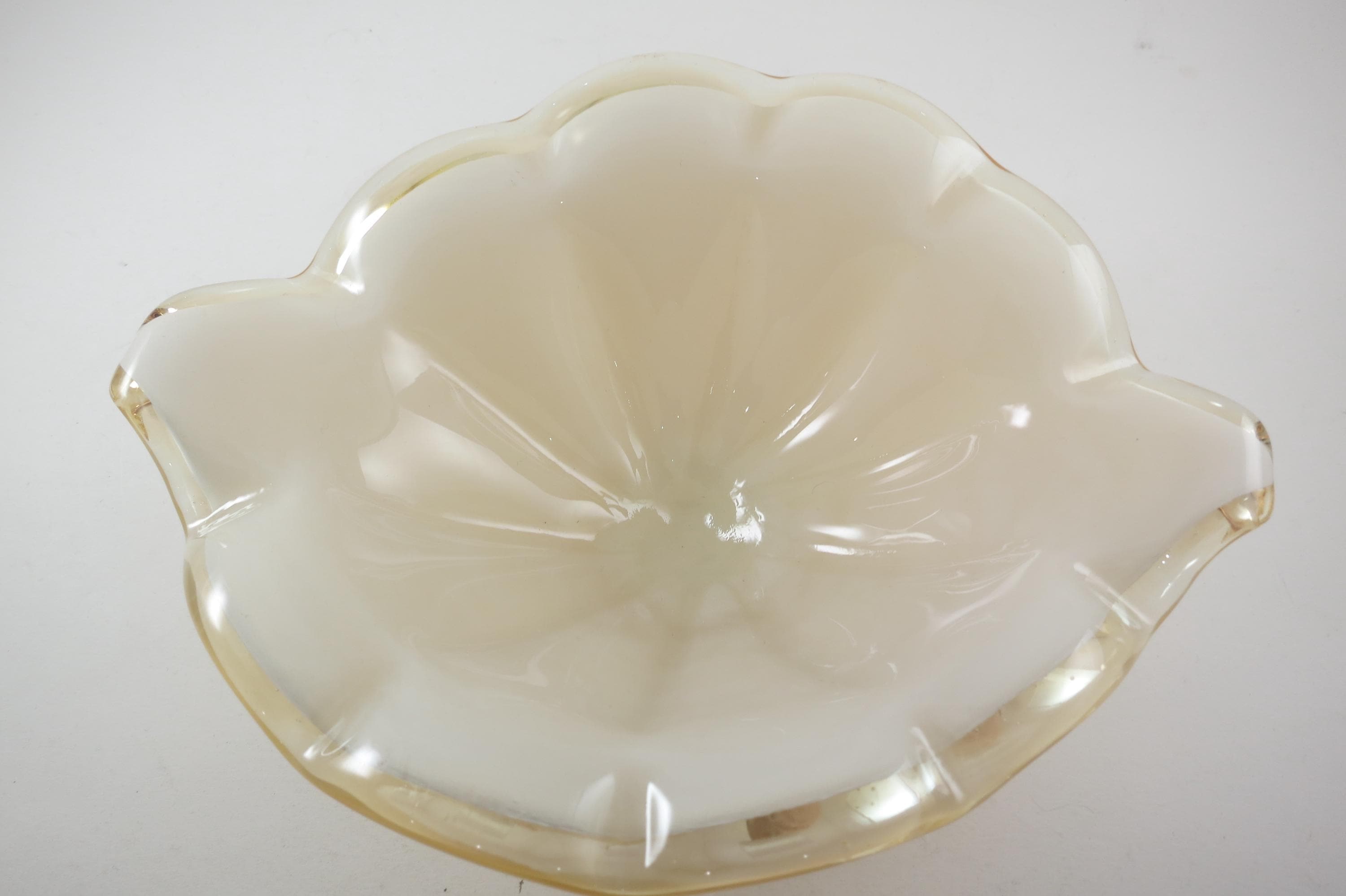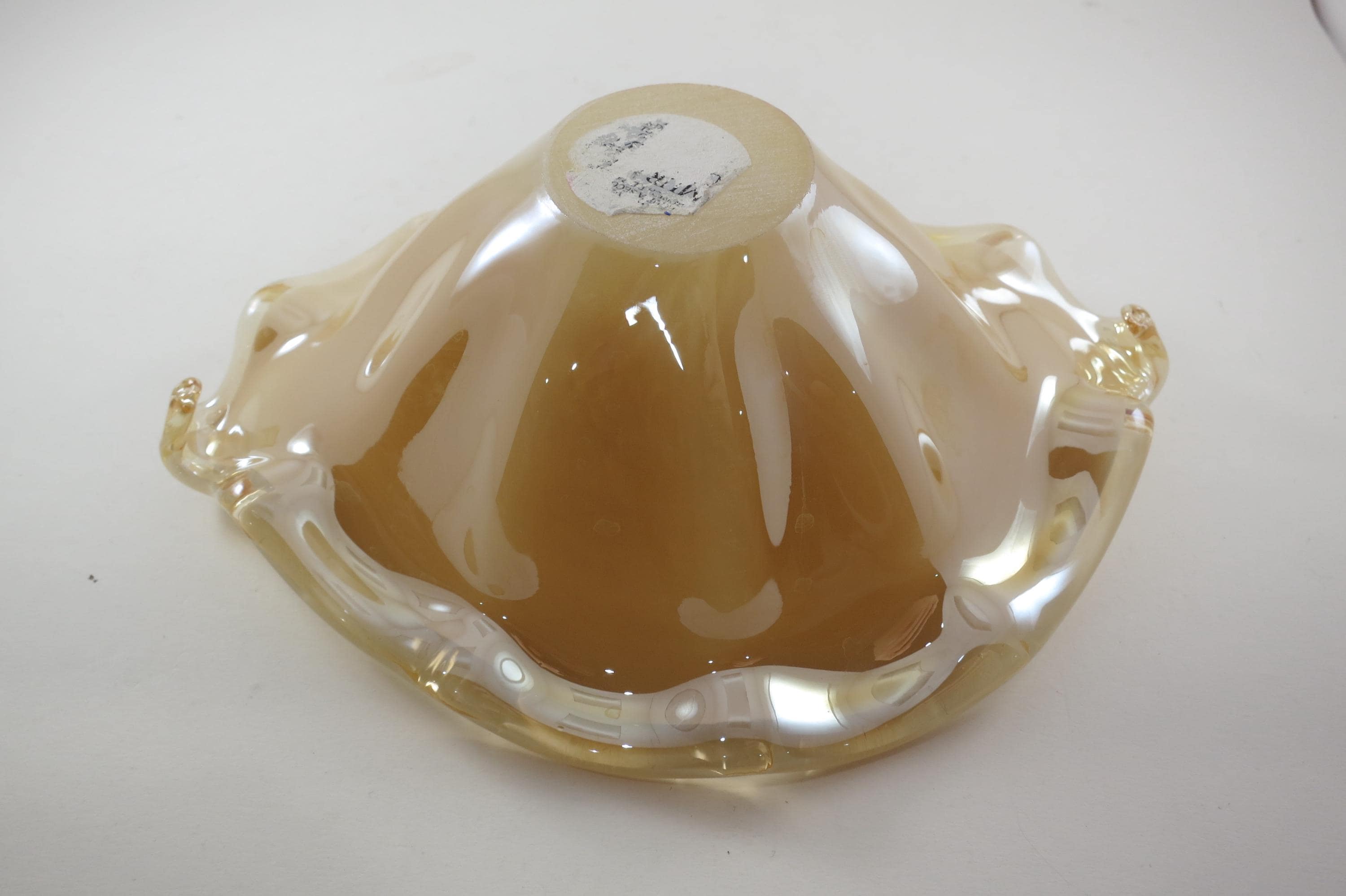 Peach Murano Art Glass Shell Display Bowl Scalloped. No damages, very nice authentic Murano Piece. Measures 9 3/4 inches long, 7 1/2 inches wide and 3 1/4 inches tall.