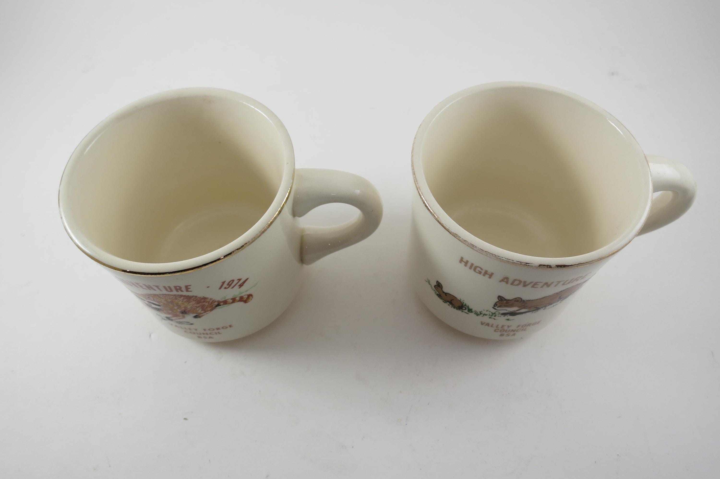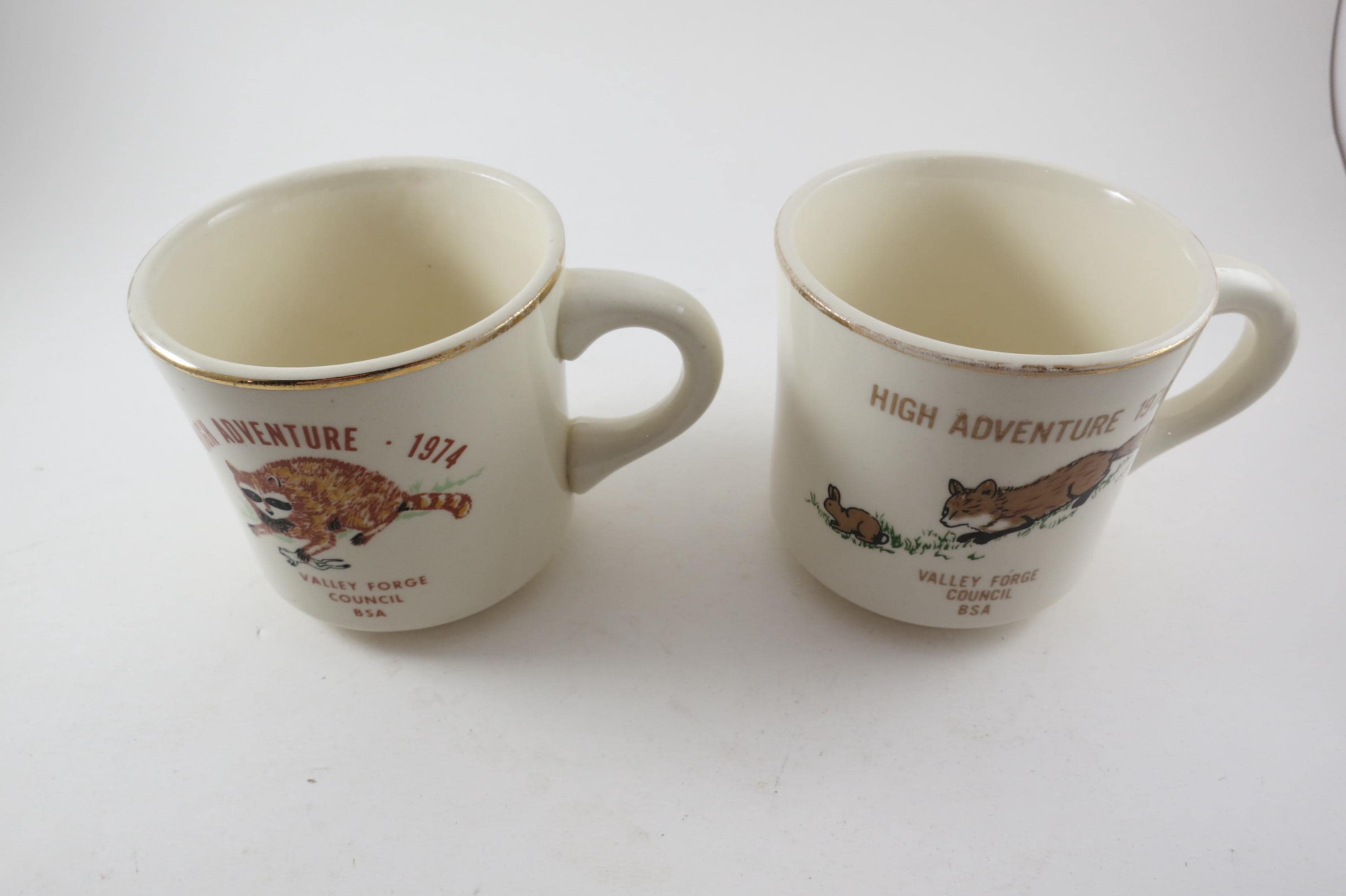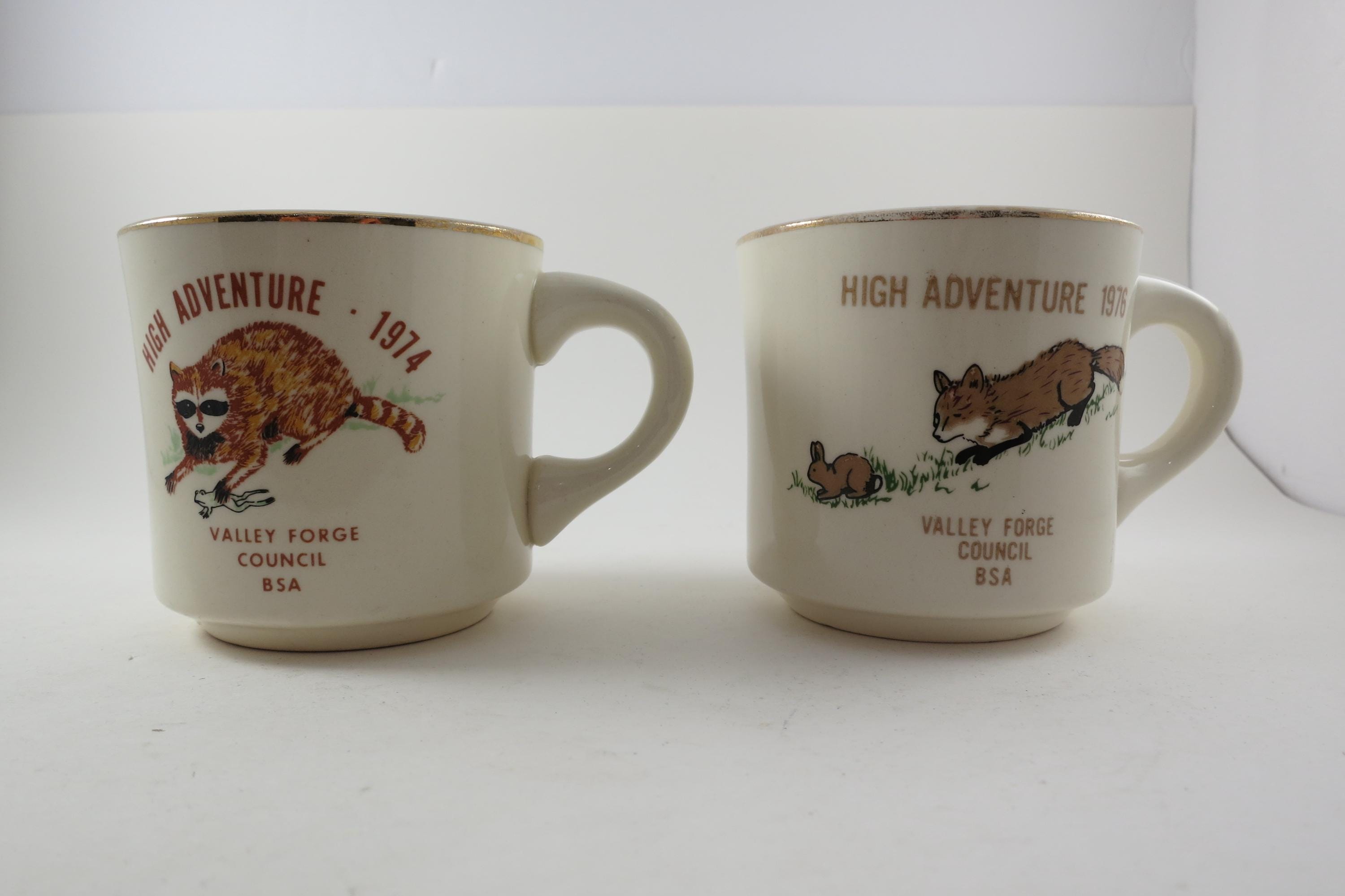 Valley Forge Council. Each measures 3 1/4 inches tall and 3 1/2 inches wide. The 1974 Mug shows almost no wear while the 1976 mug is much more worn. No chips, cracks or damages. Rare Find!!