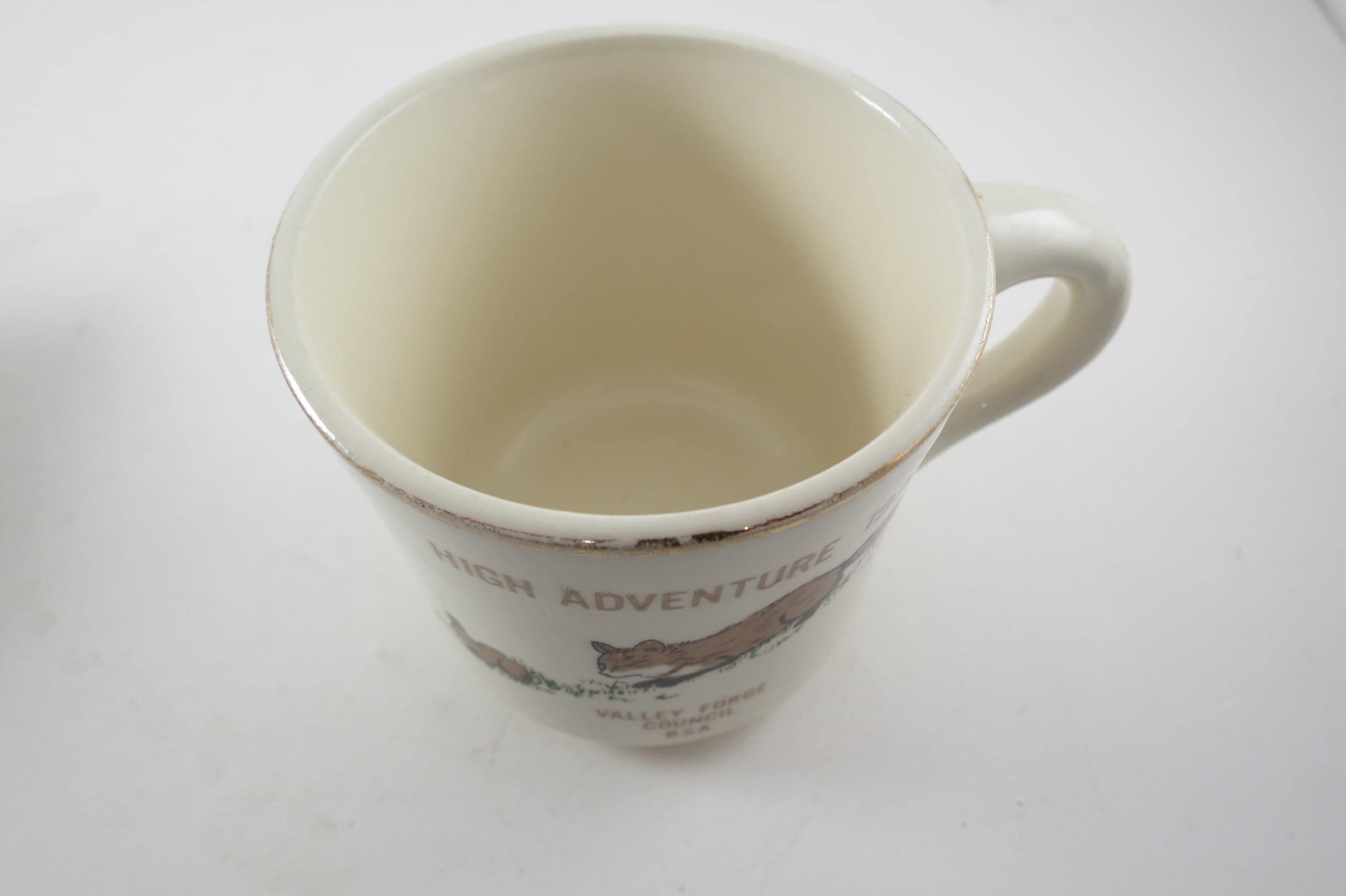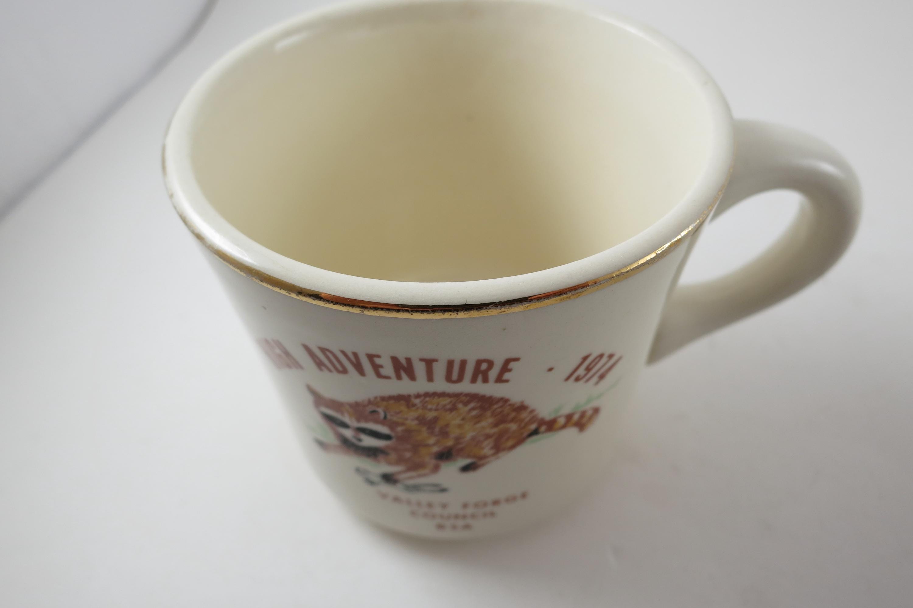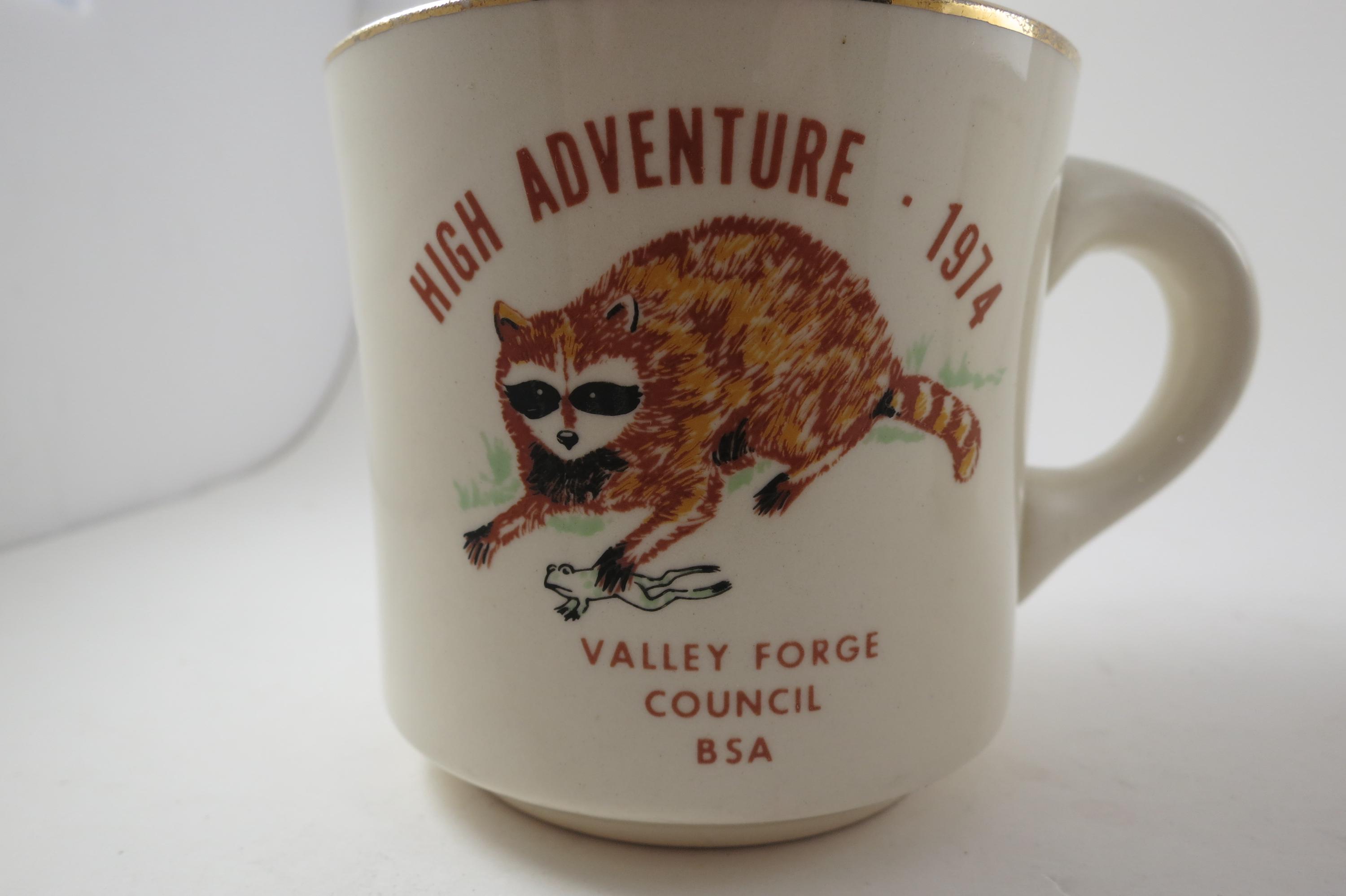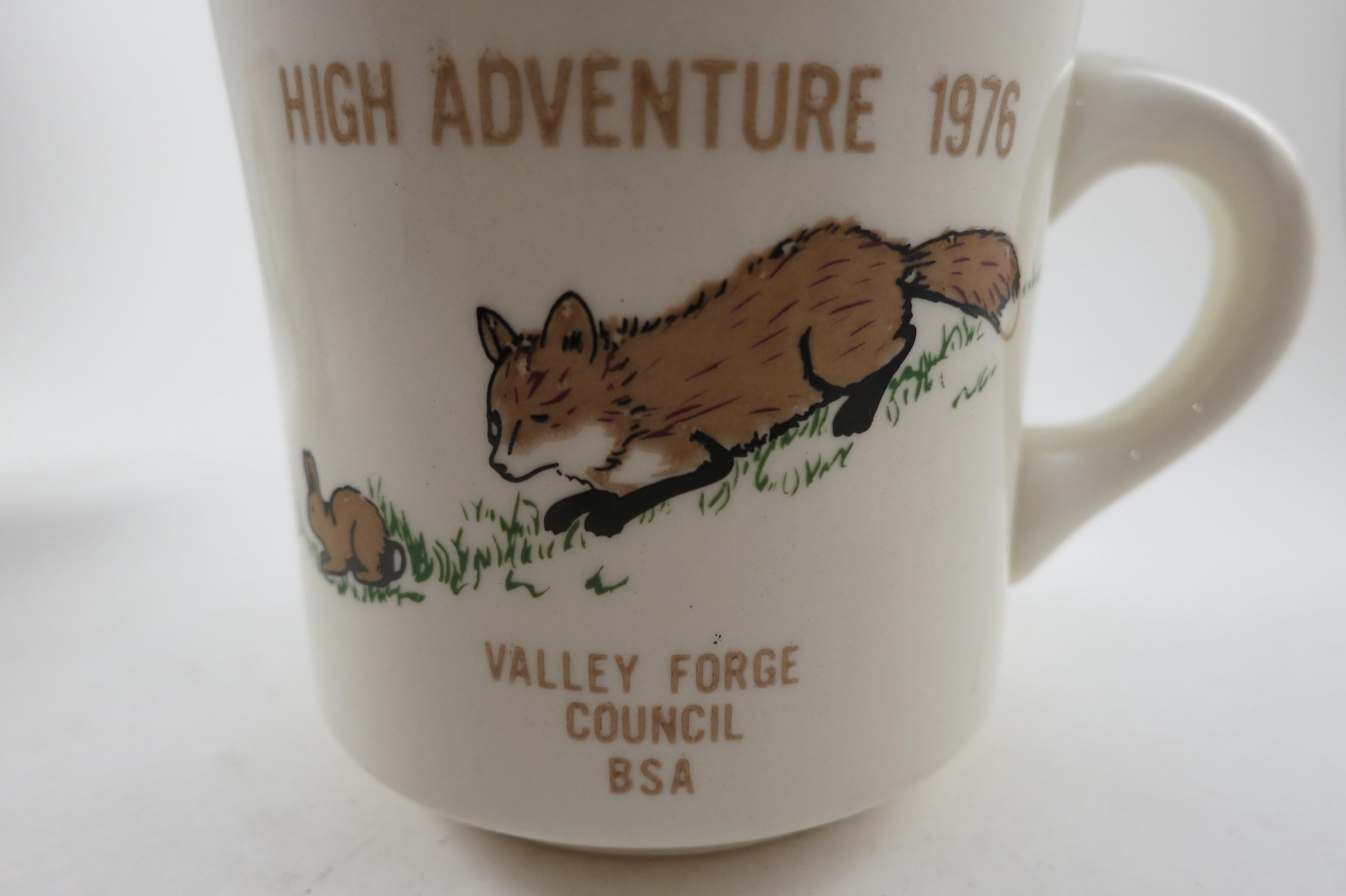 Valley Forge Council. Each measures 3 1/4 inches tall and 3 1/2 inches wide. The 1974 Mug shows almost no wear while the 1976 mug is much more worn. No chips, cracks or damages. Rare Find!!