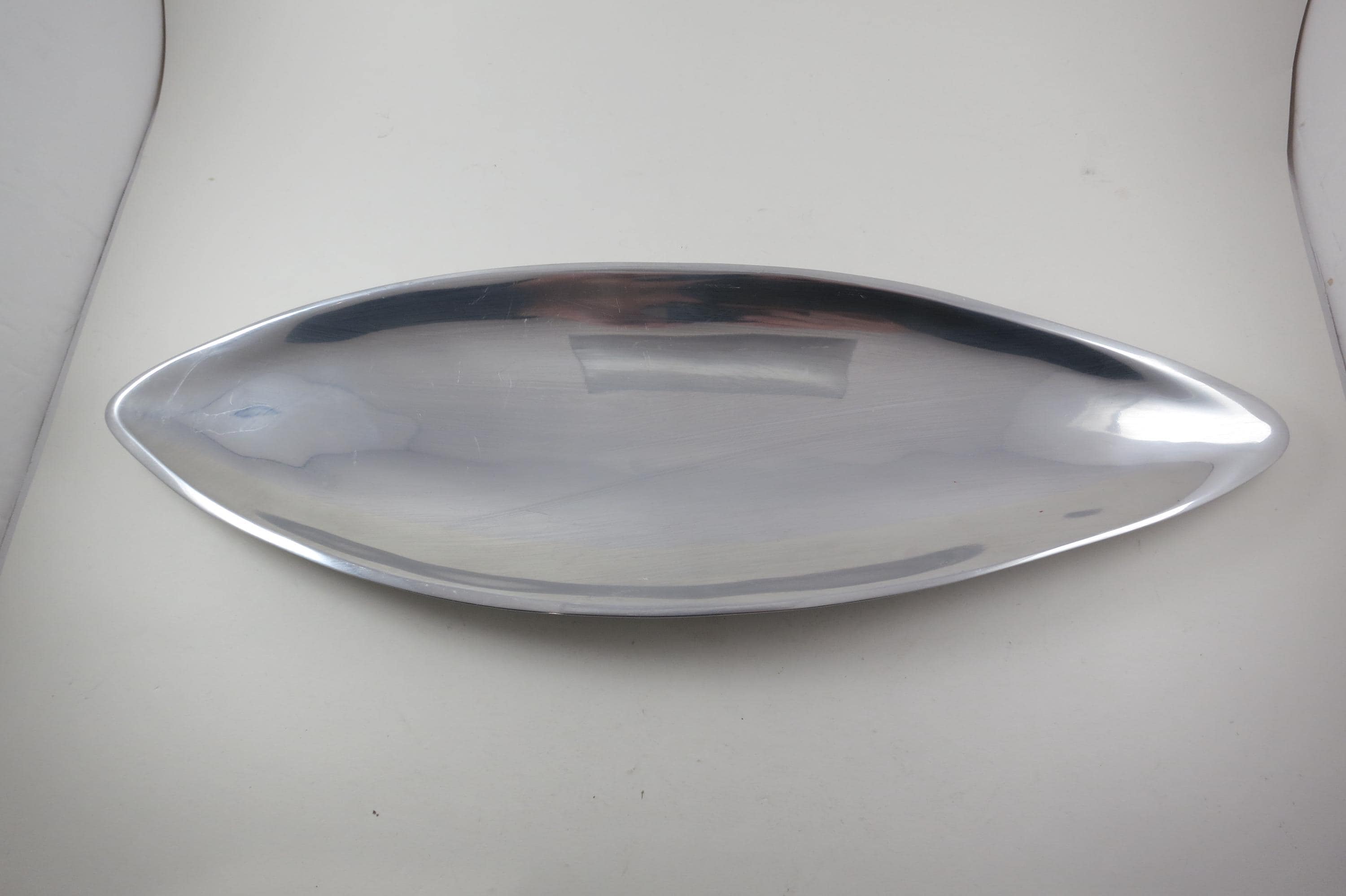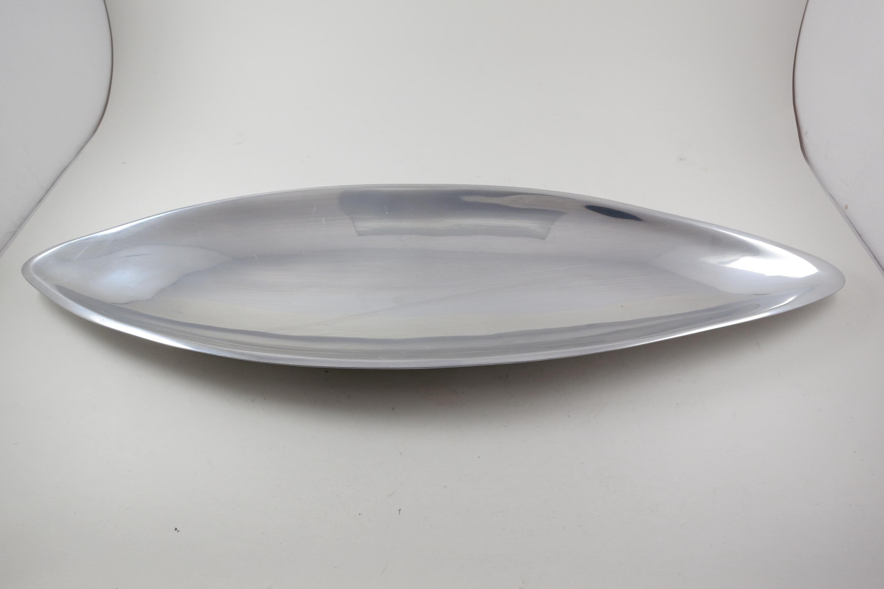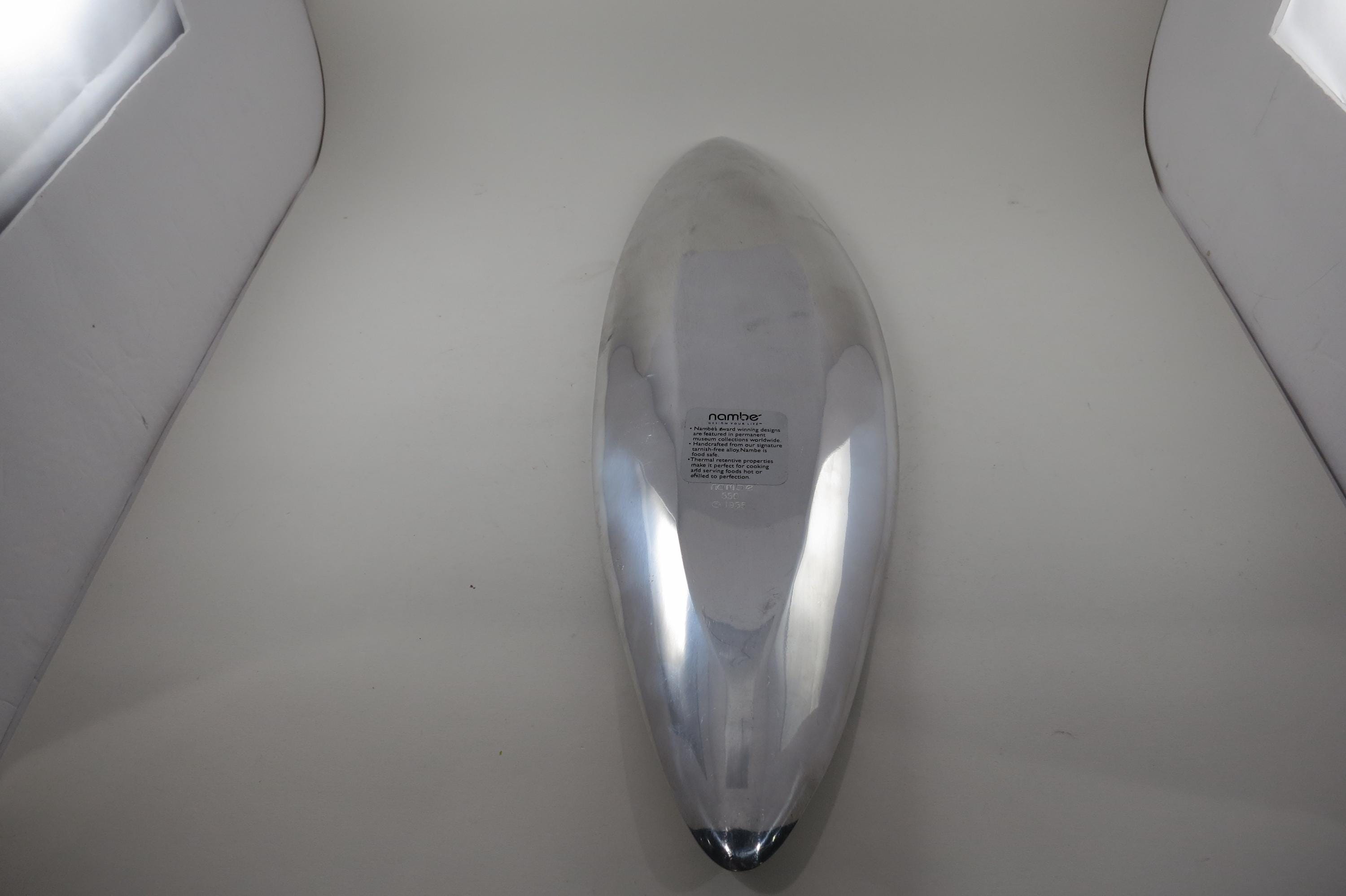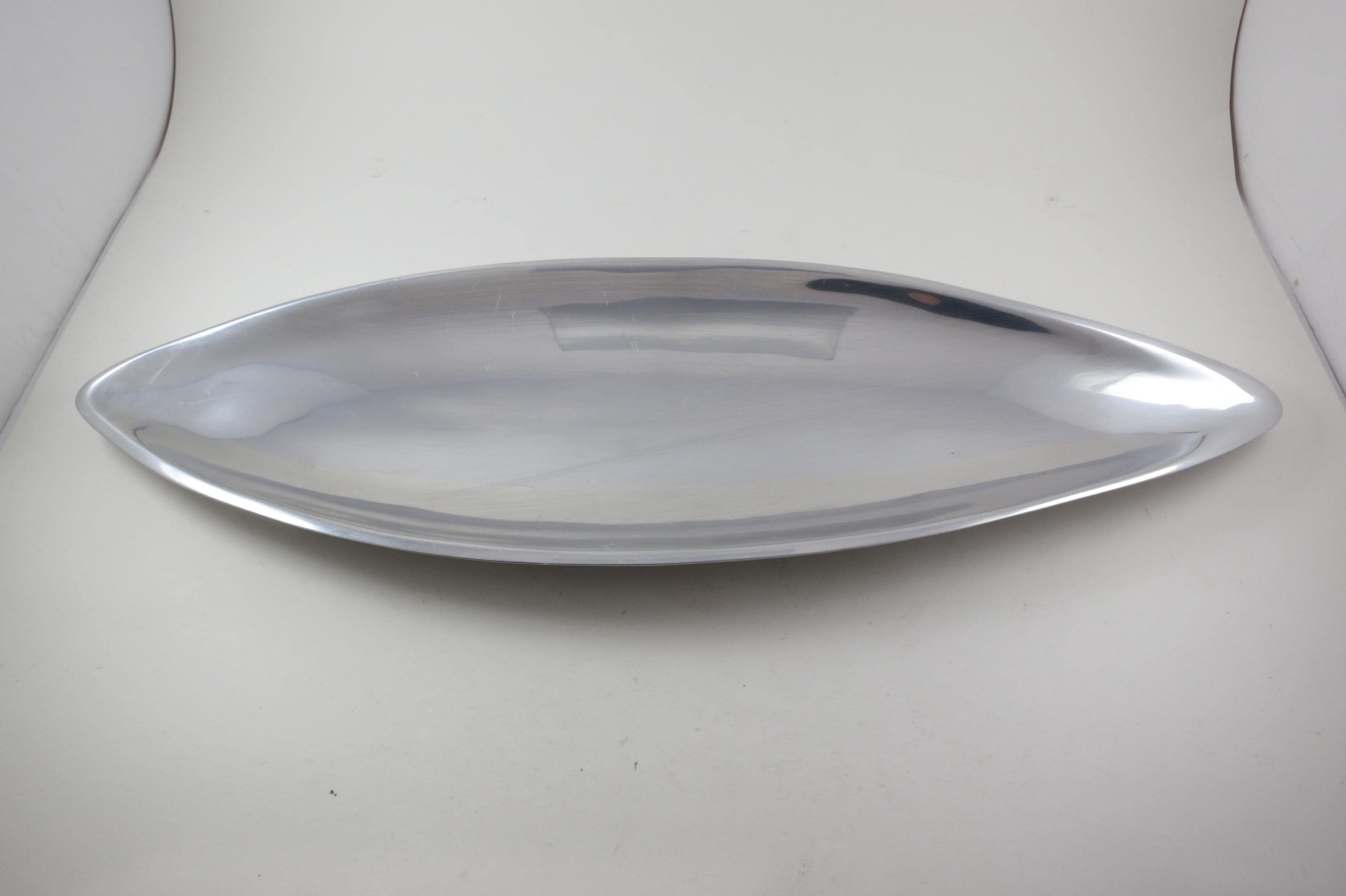 Vintage Nambe 550 Mid Century Modern Heavy Silver 19 Inch Bread Serving Bowl. Displays very nicely, measures 19 1/4 inches long and 6 inches wide. No damages, does show normal use wear for a piece this age, will polish up very nicely. Can be used for all sorts of different things!