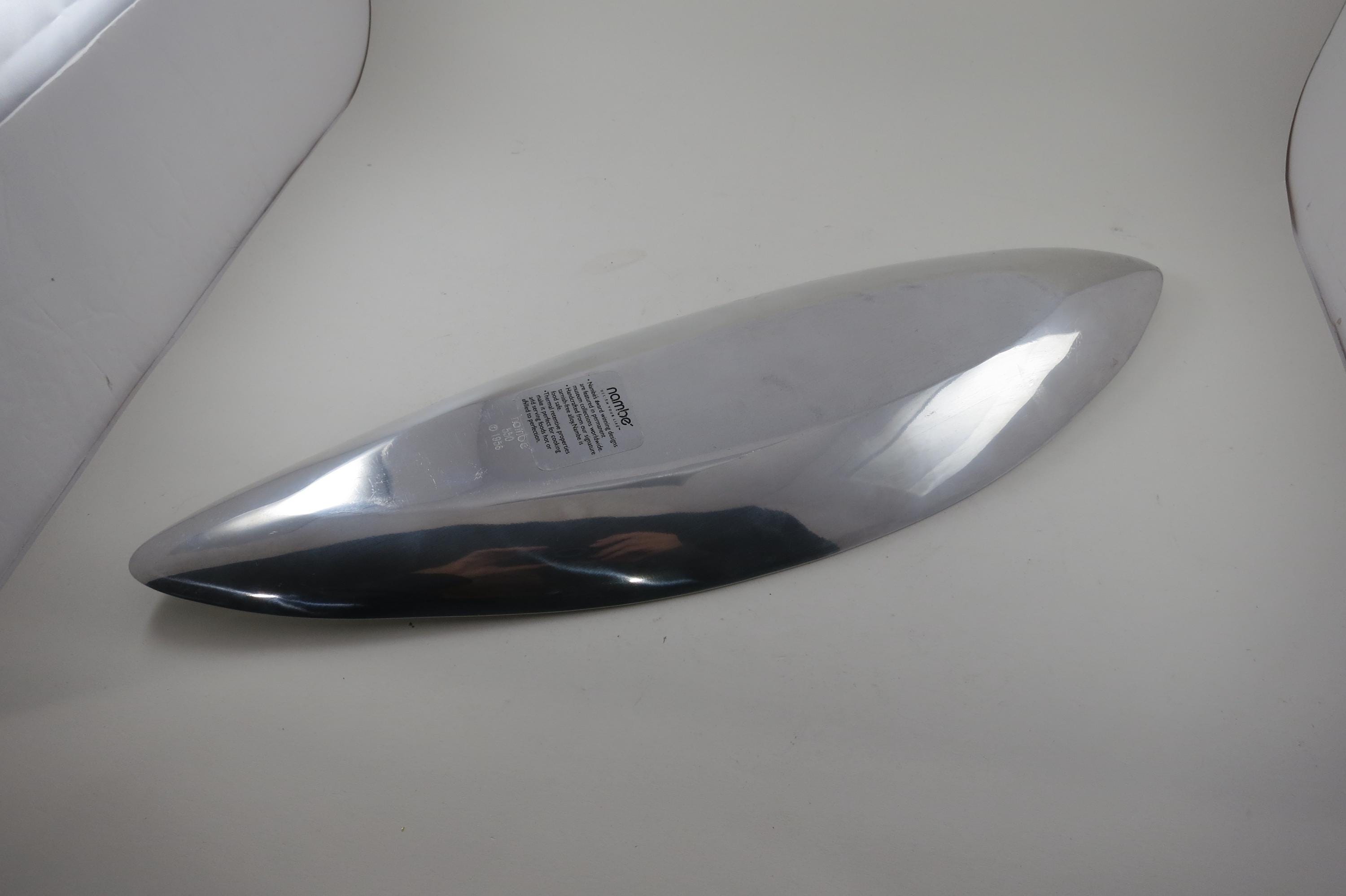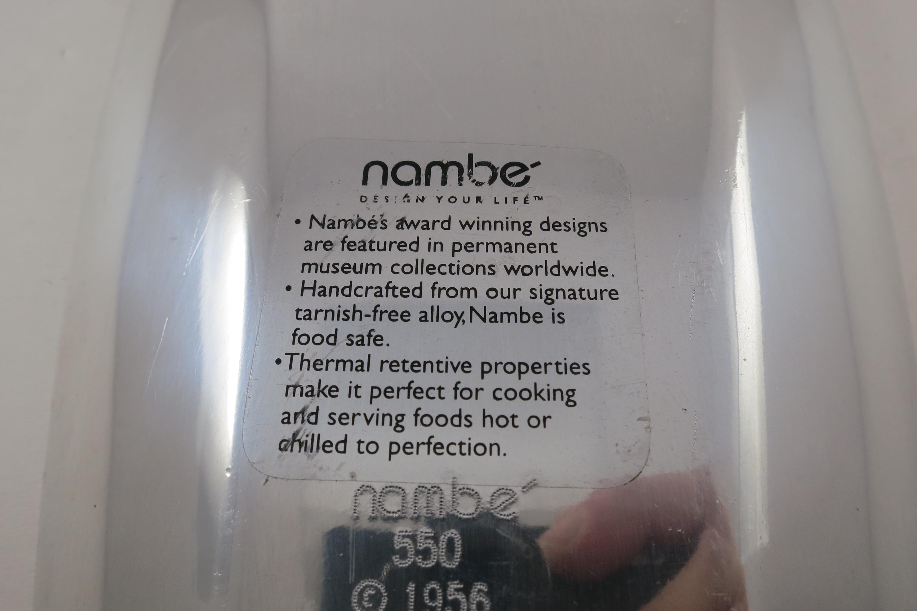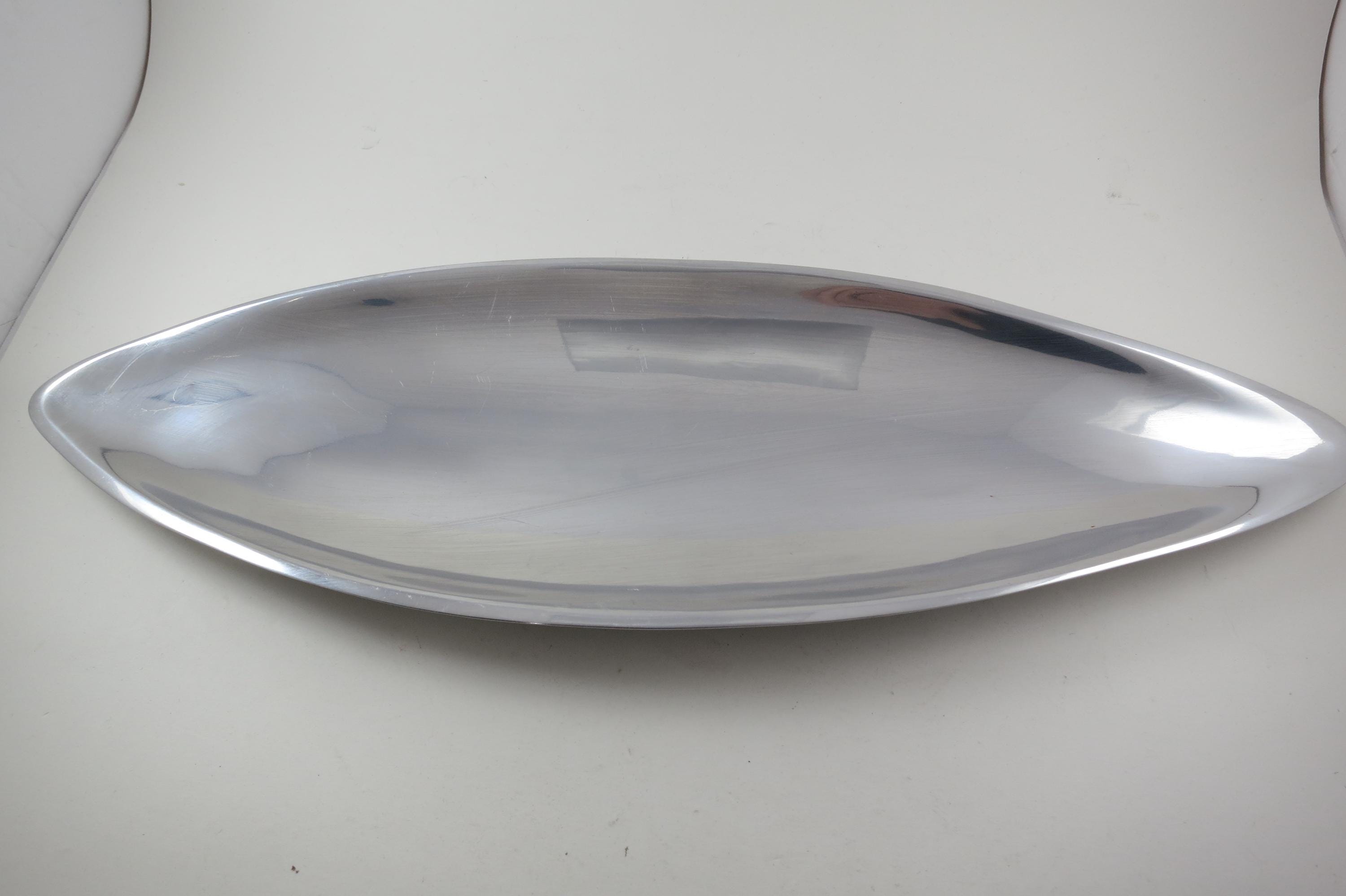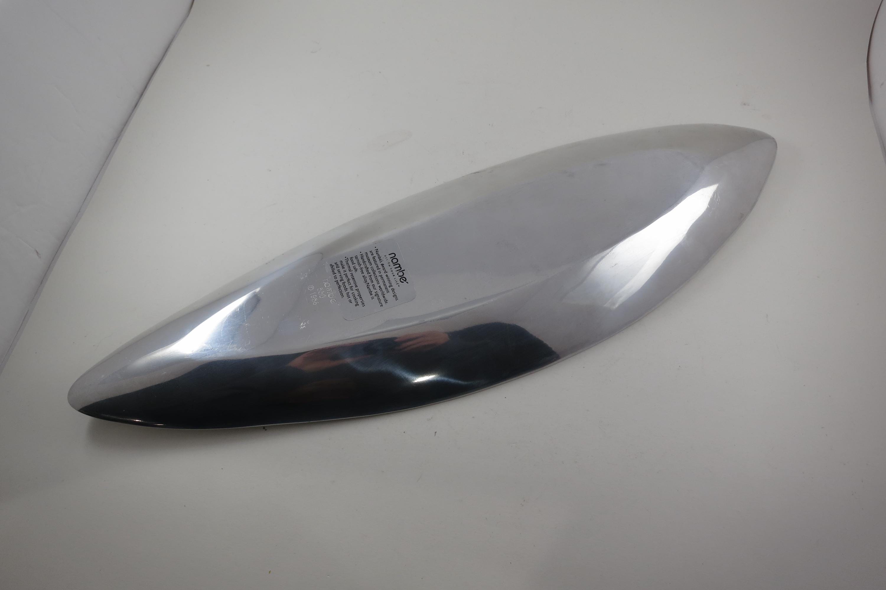 Vintage Nambe 550 Mid Century Modern Heavy Silver 19 Inch Bread Serving Bowl. Displays very nicely, measures 19 1/4 inches long and 6 inches wide. No damages, does show normal use wear for a piece this age, will polish up very nicely. Can be used for all sorts of different things!