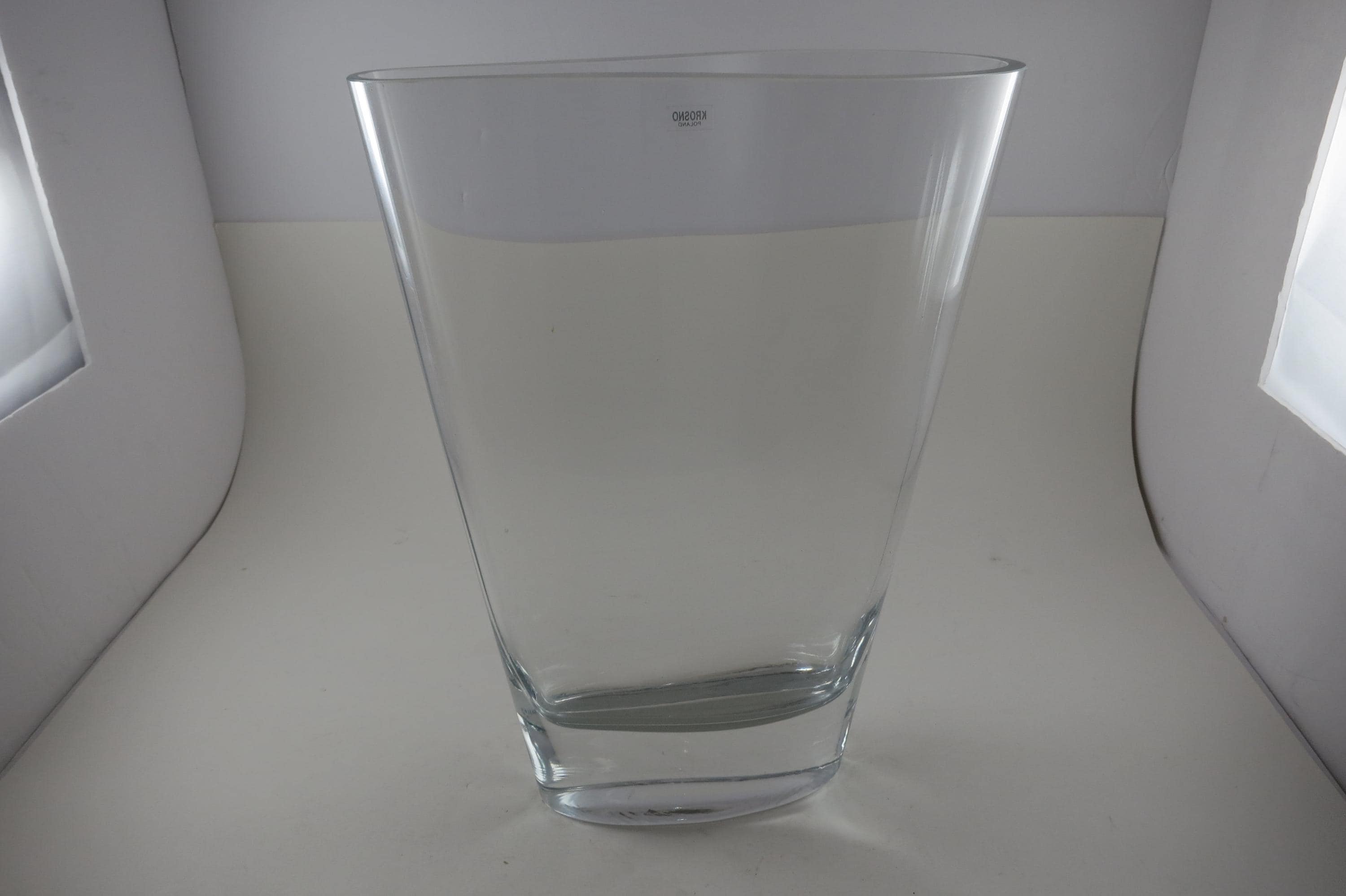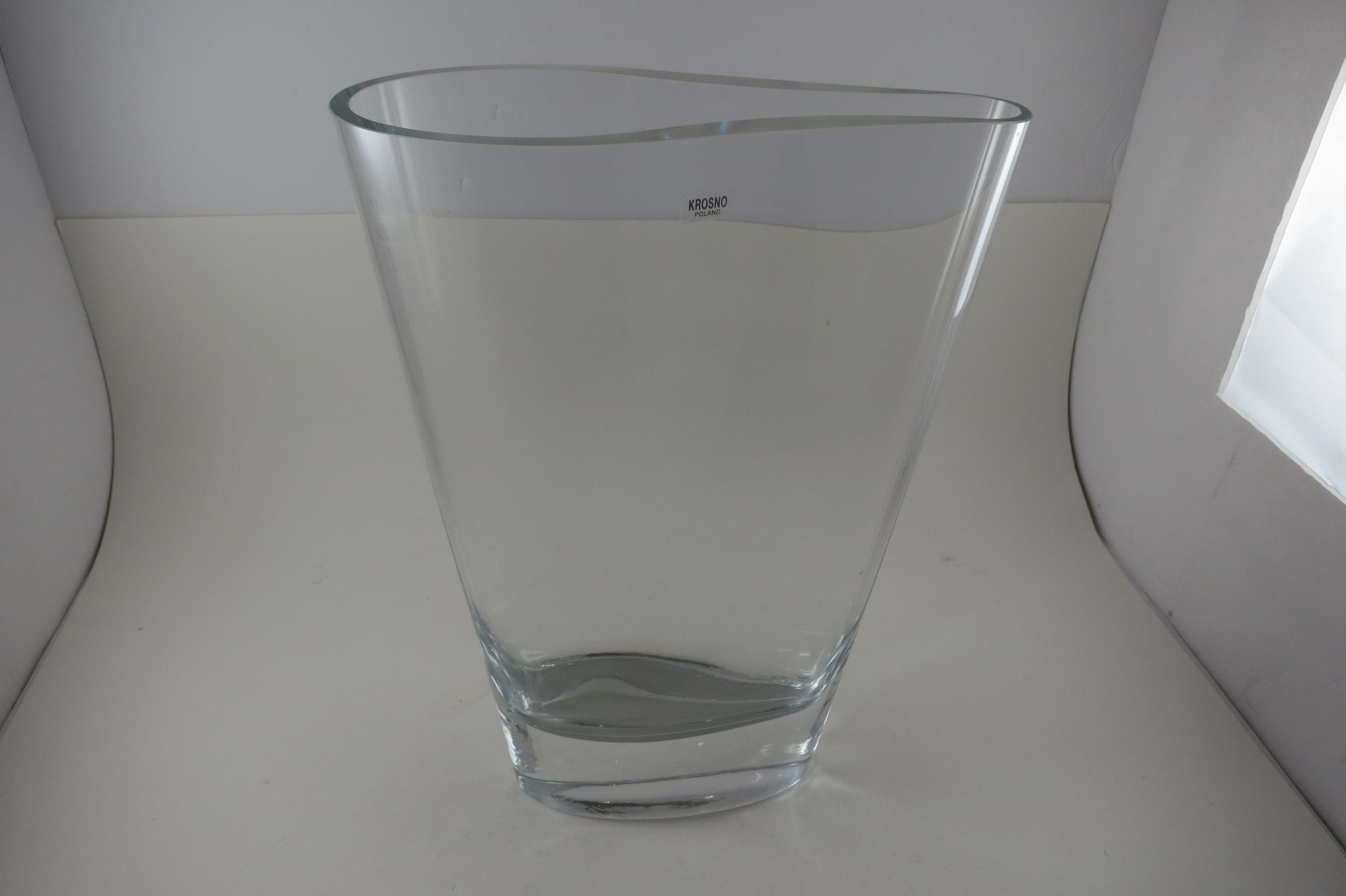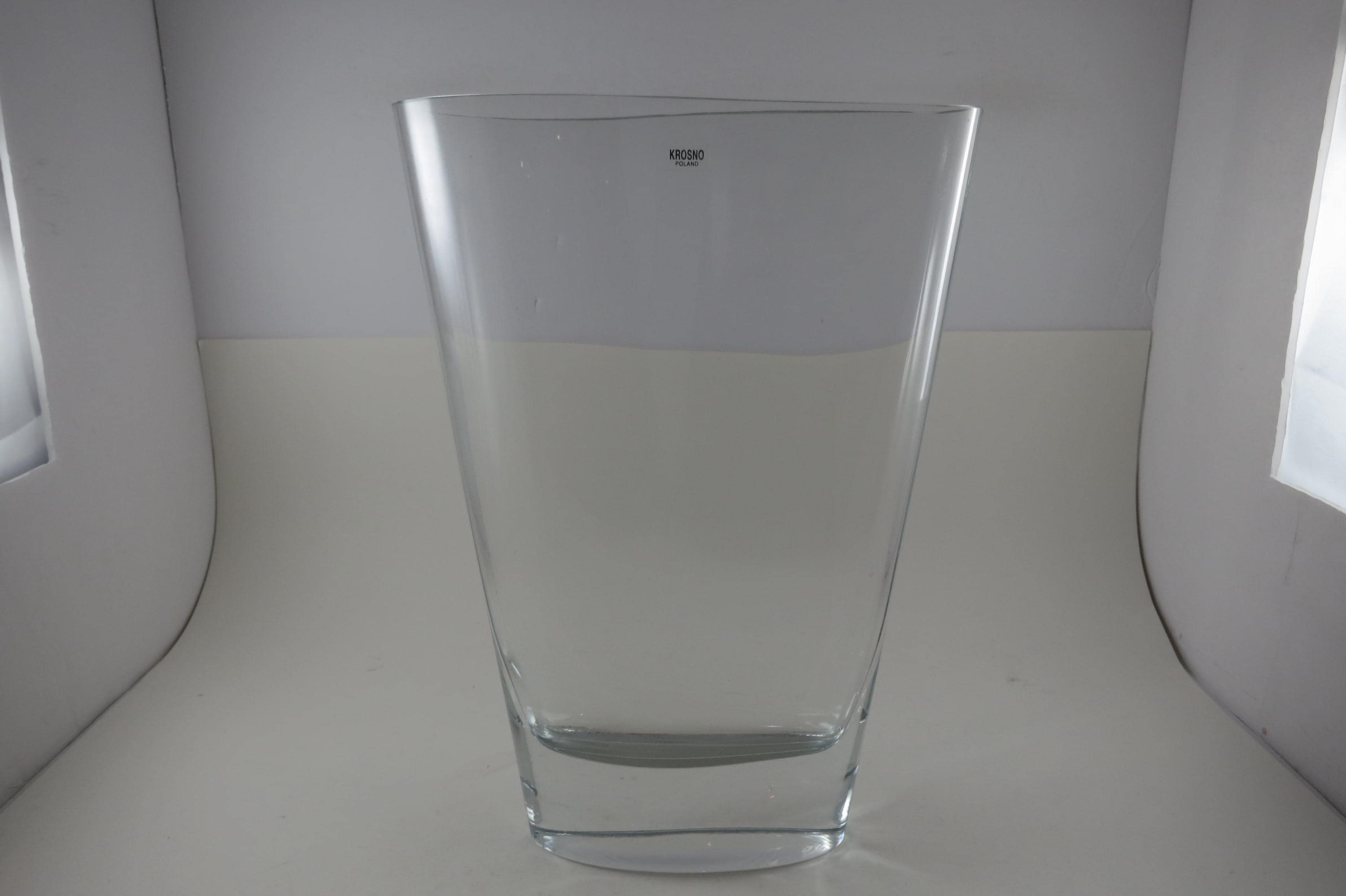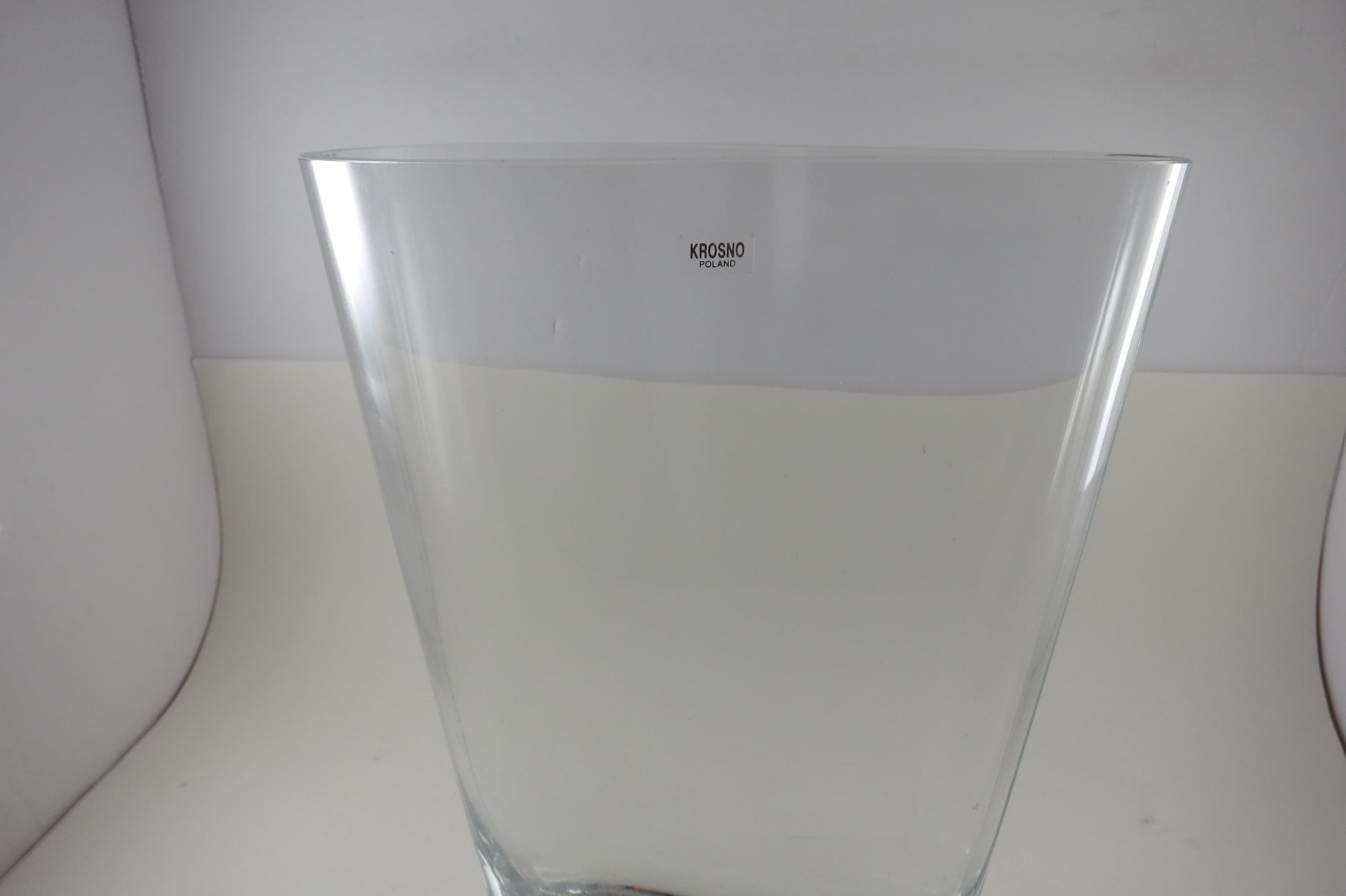 Fabulous display vase with a unique top mold. No damages, still has the krosno sticker. 11 Inches tall, one end is 3 1/2 inches wide and the other is 1 1/2 inches wide.