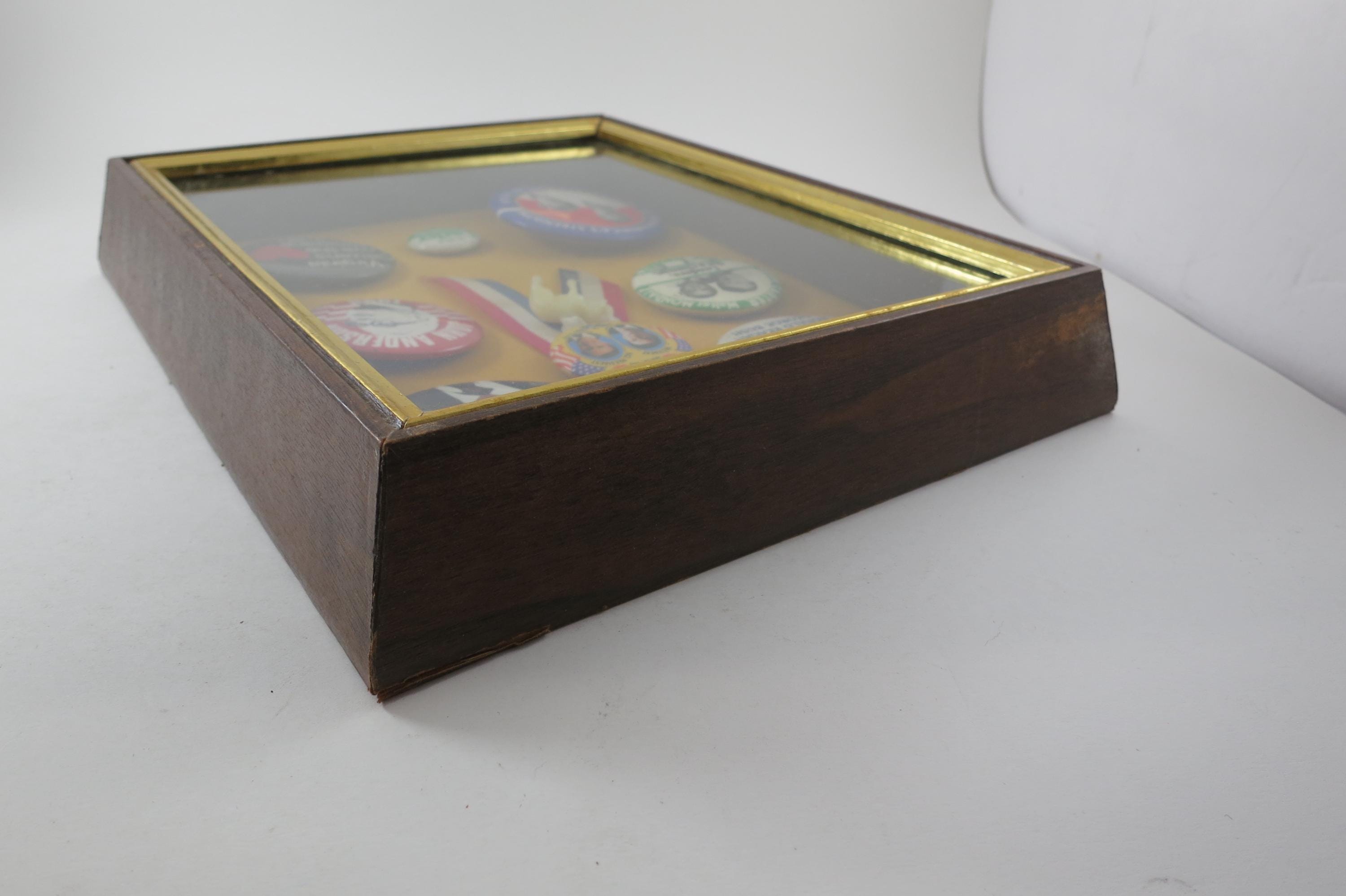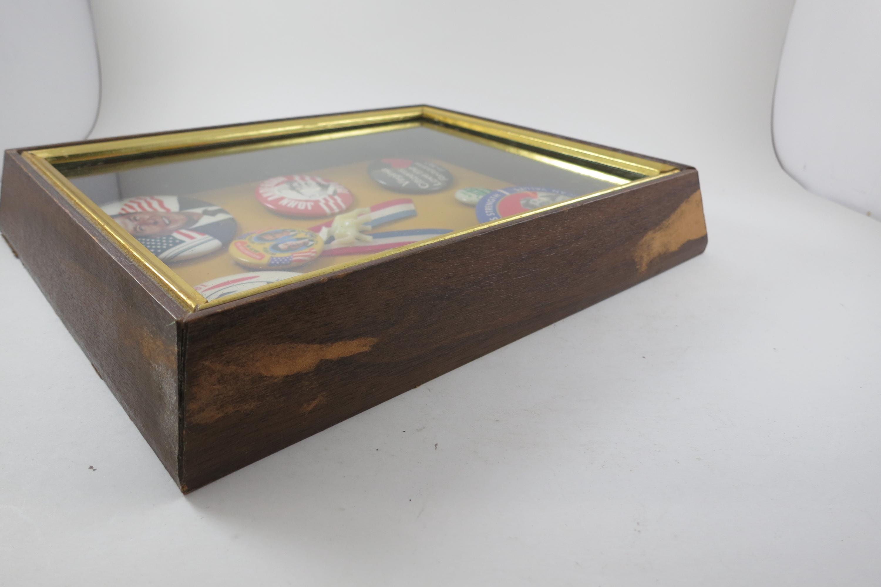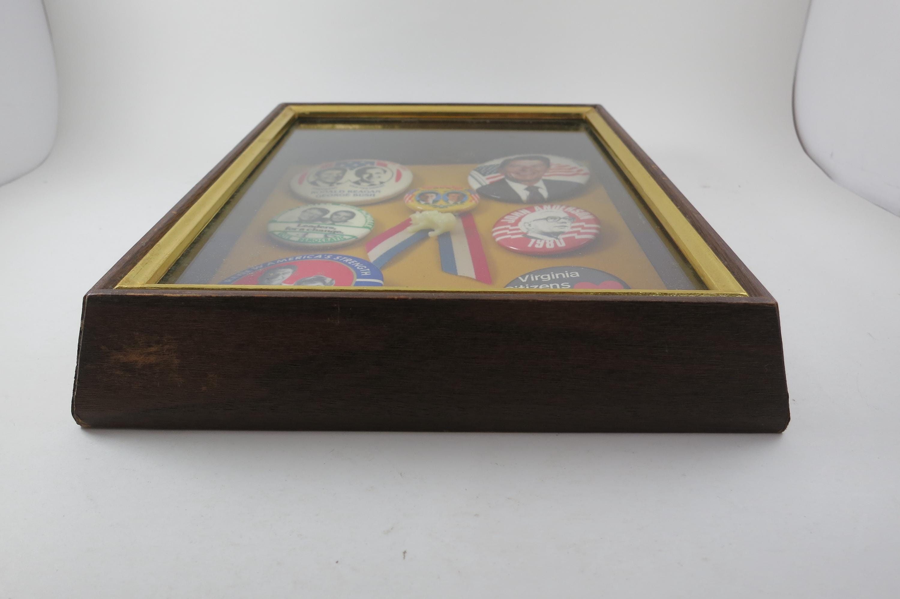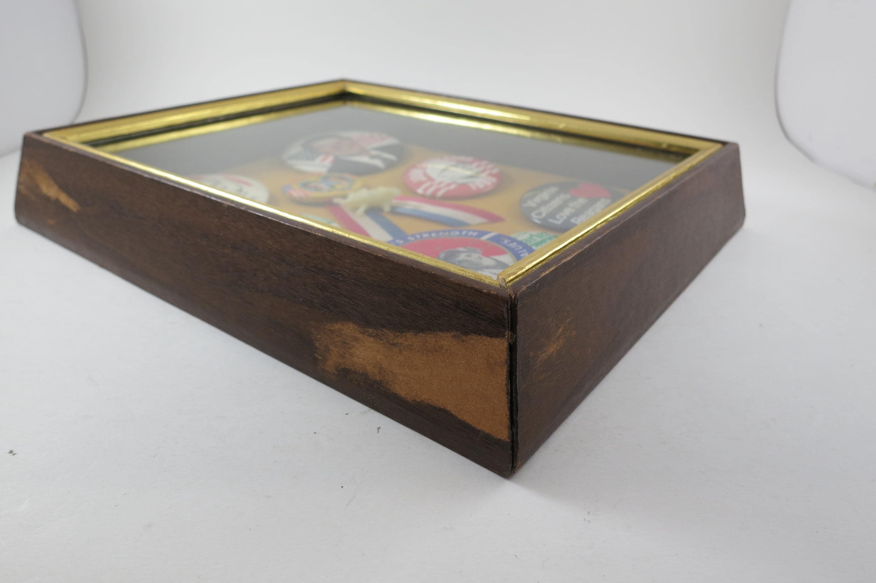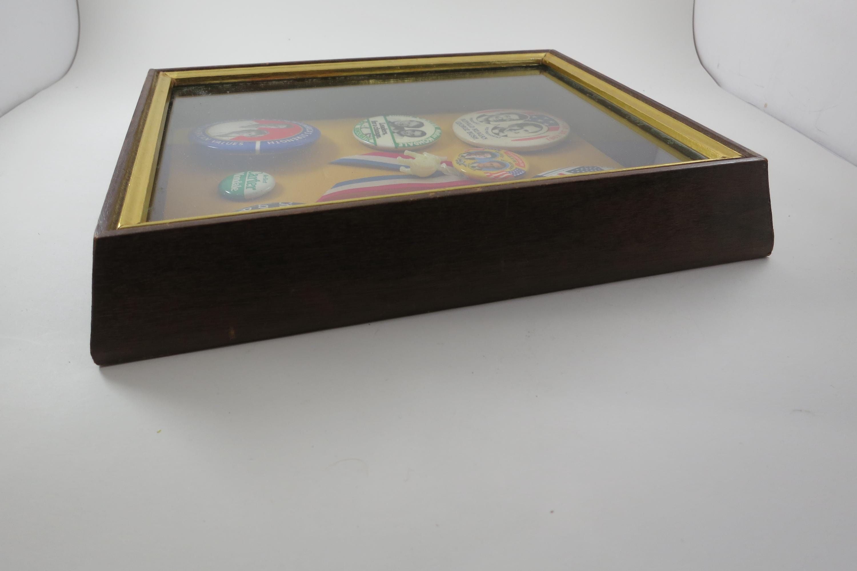 We have several of these from the elections of 1968-1984 that came from an estate sale in DC. This one contains items from the 1980 election in which Reagan defeated Carter. Box measures 9 1/4 Inches wide and 11 1/8 inches tall. Has a thick wooden frame. This box contains 8 Original Campaign Pins as show in the pictures,