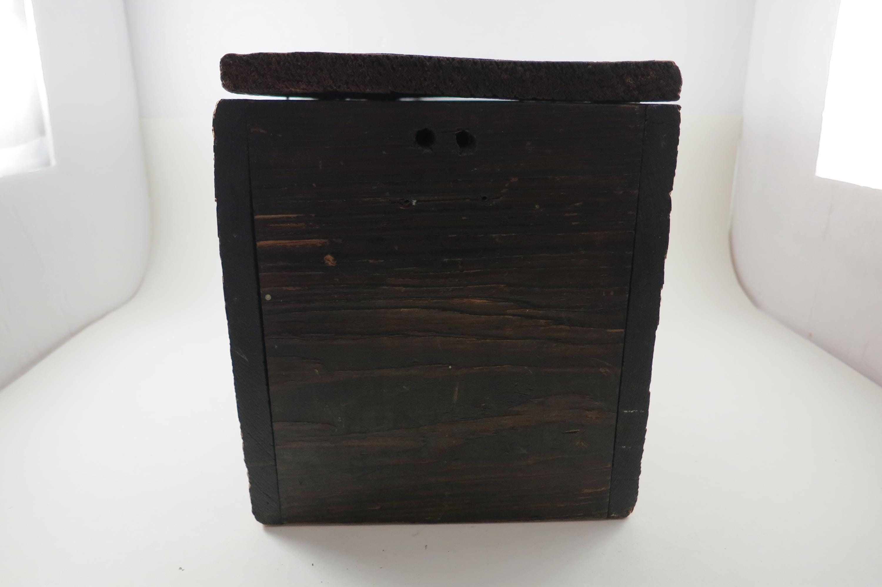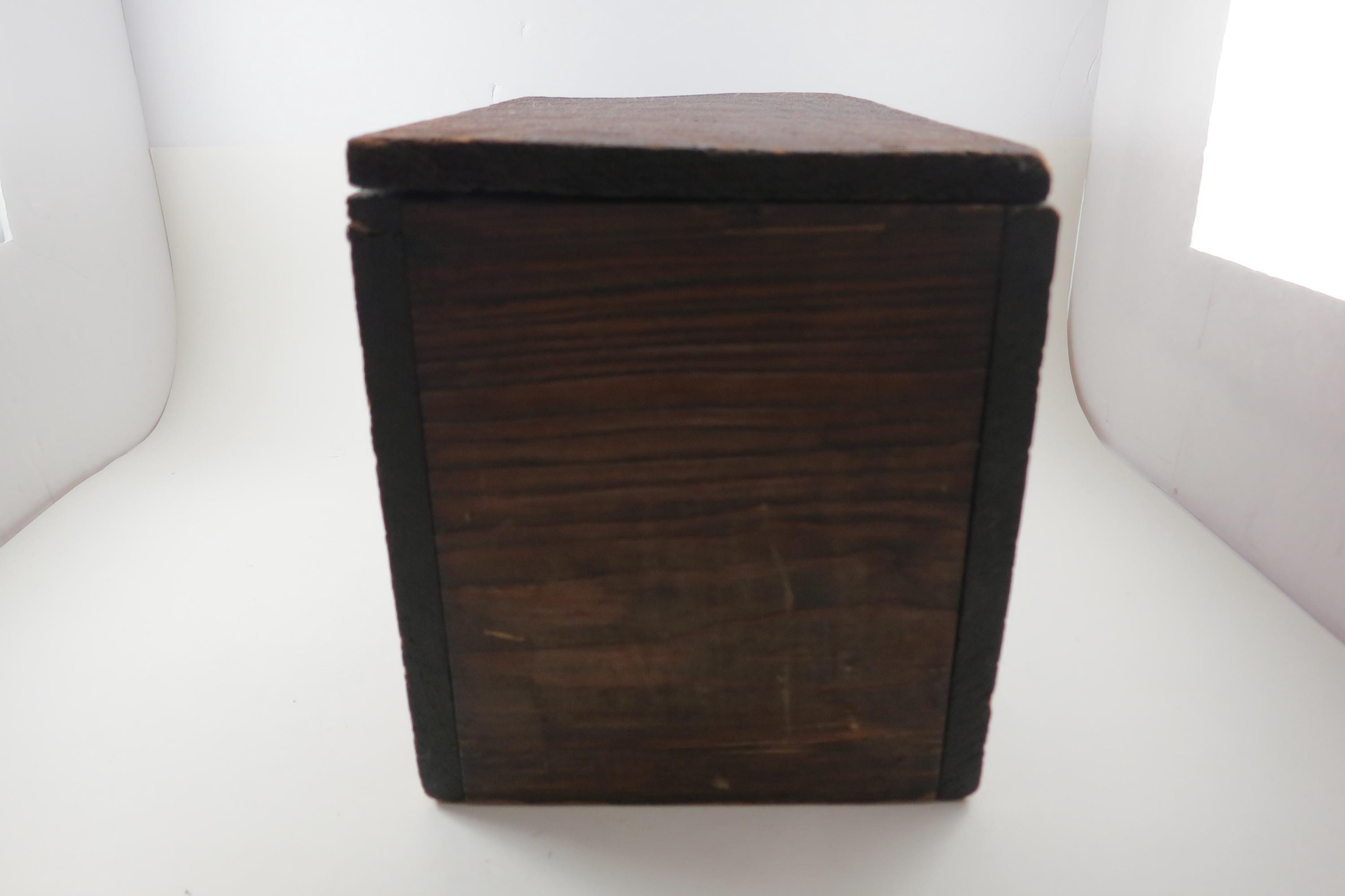 Measures 11 1/2 inches long, 6 3/4 inches deep and 7 1/2 Inches Tall. Neat Old Box!