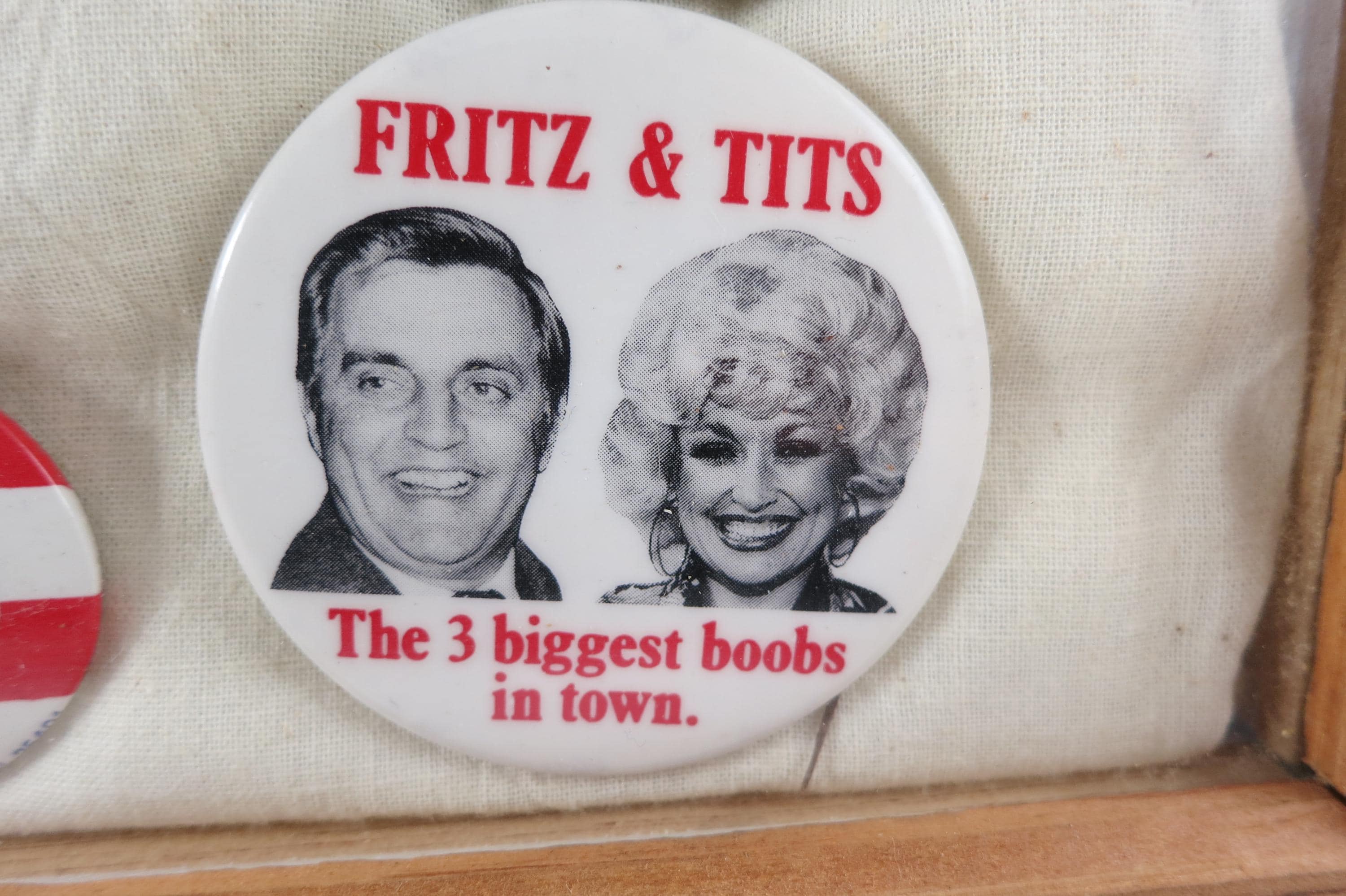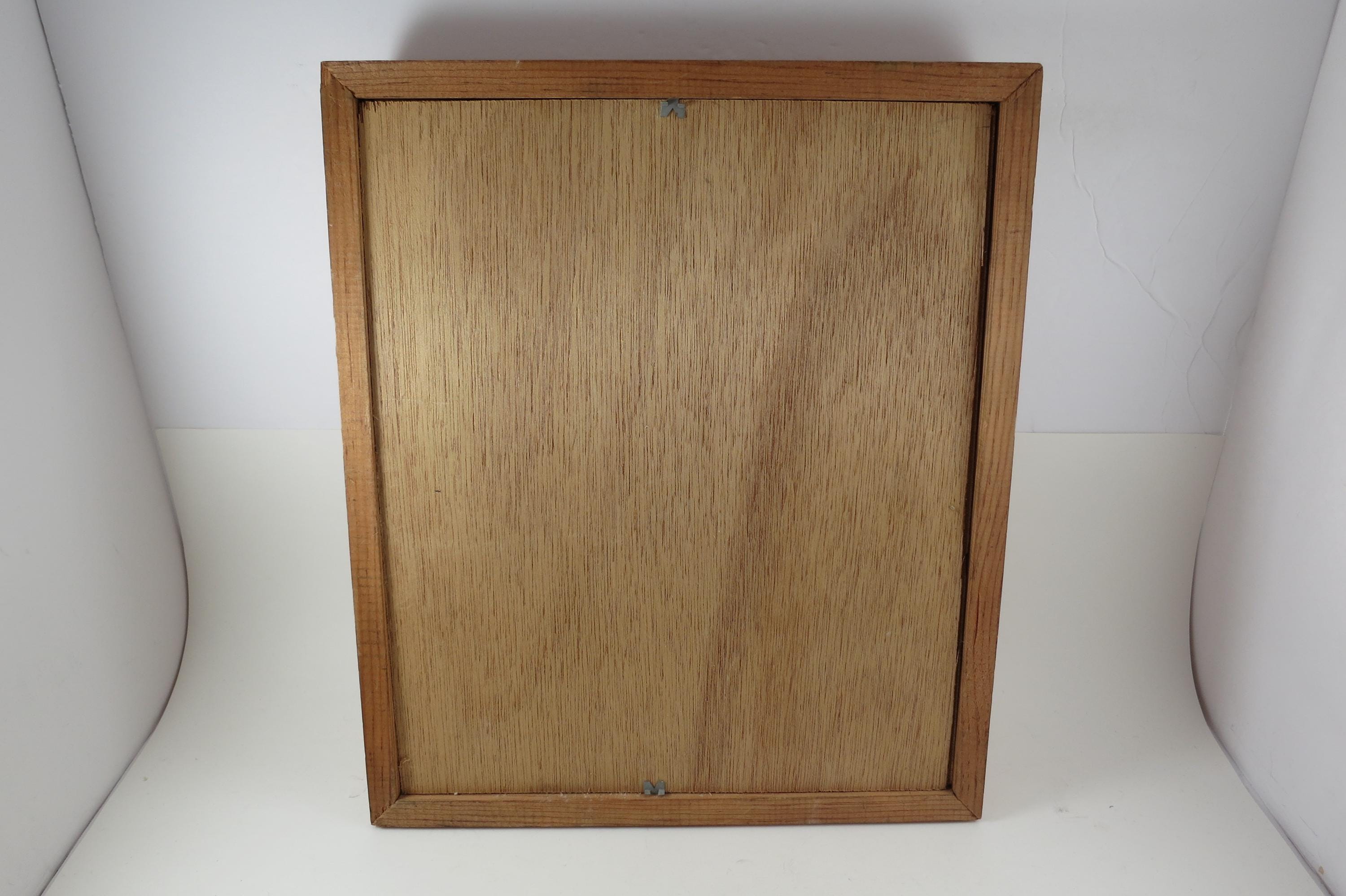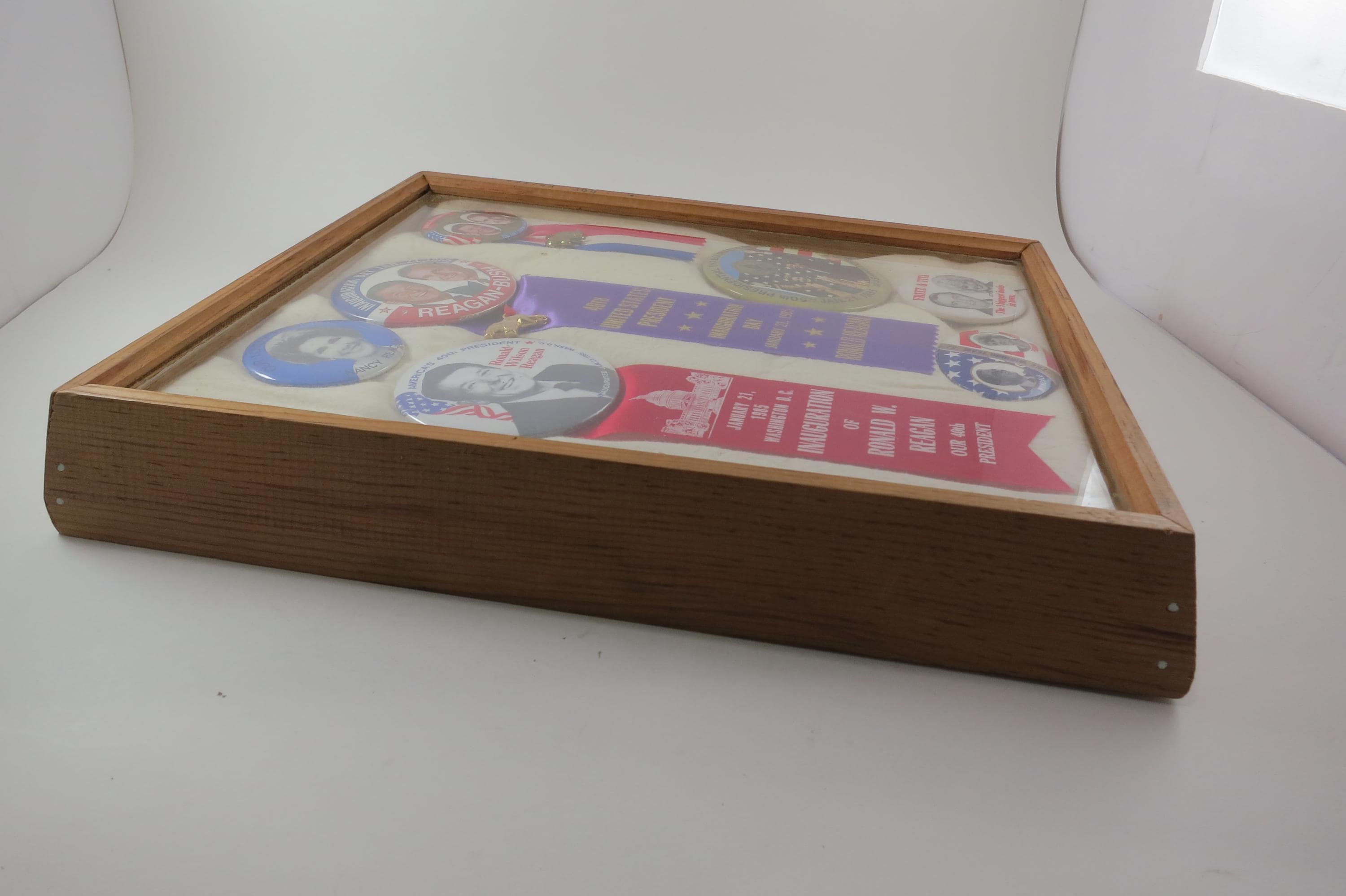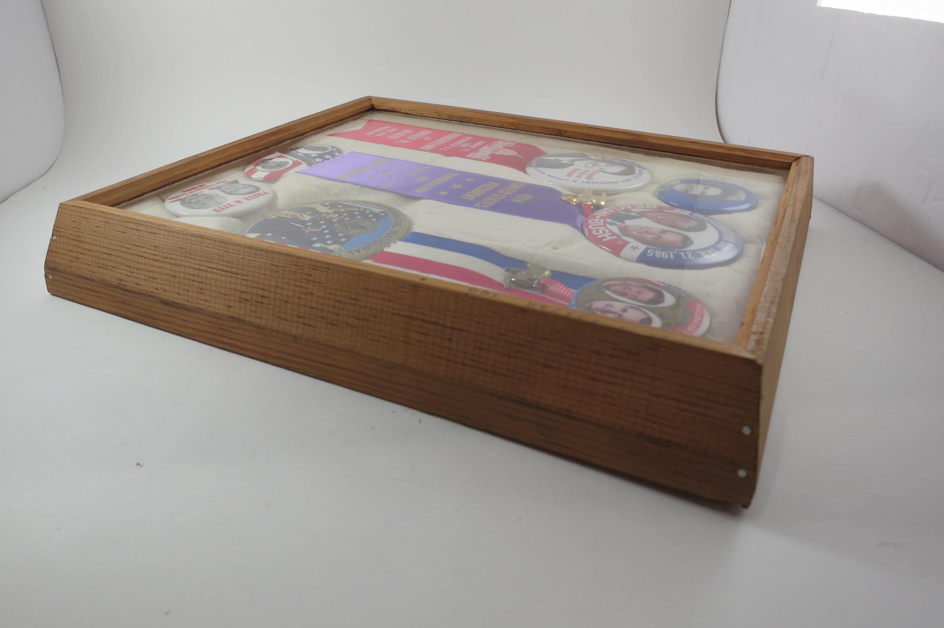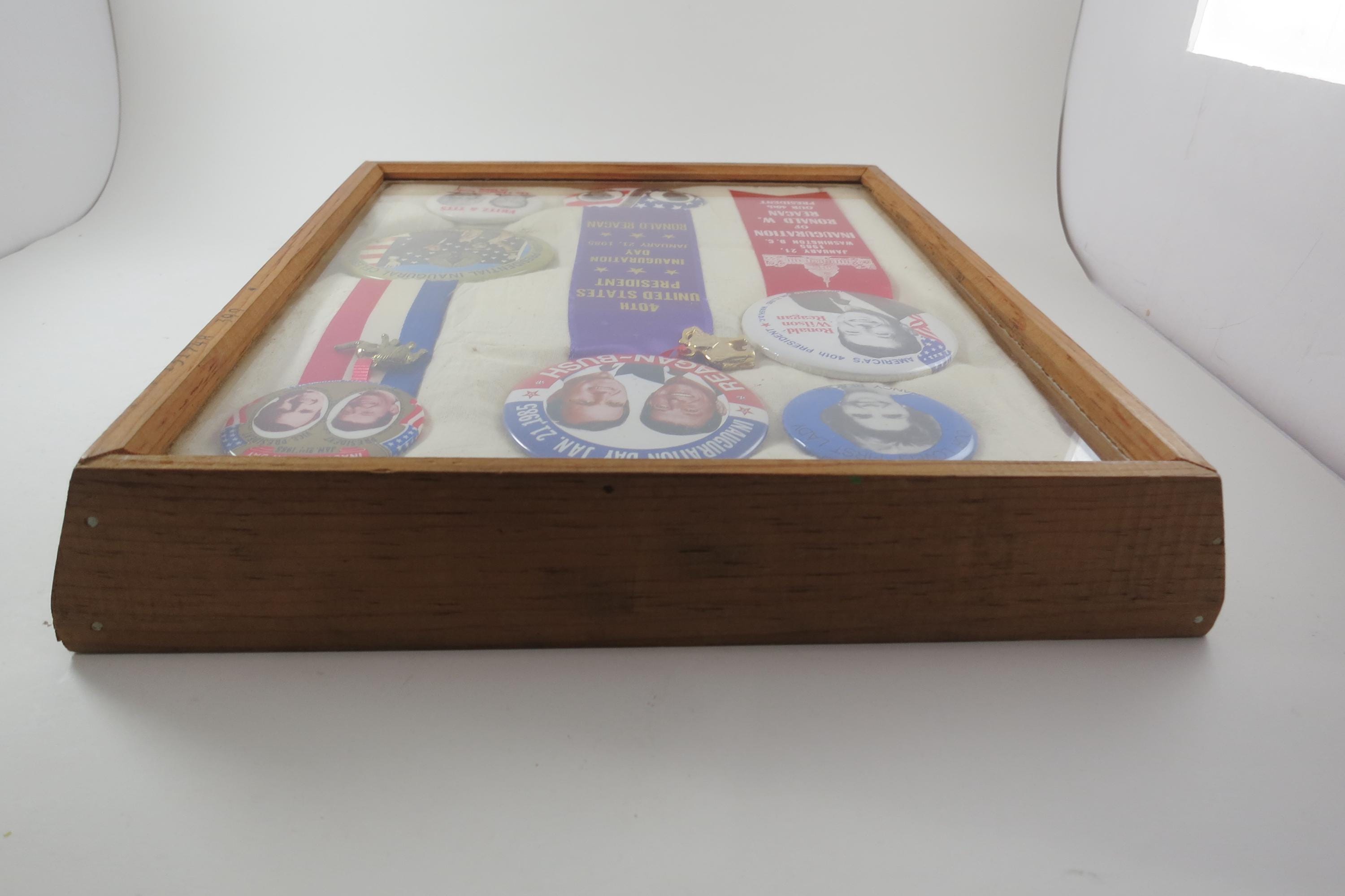 We have several of these from the elections of 1968-1984 that came from an estate sale in DC. This one contains items from the 1984 election in which Reagan defeated Mondale. Box measures 11 1/4 Inches wide and 13 1/4 inches tall. Has a thick wooden frame. This box contains 7 Original Campaign Pins as show in the pictures,