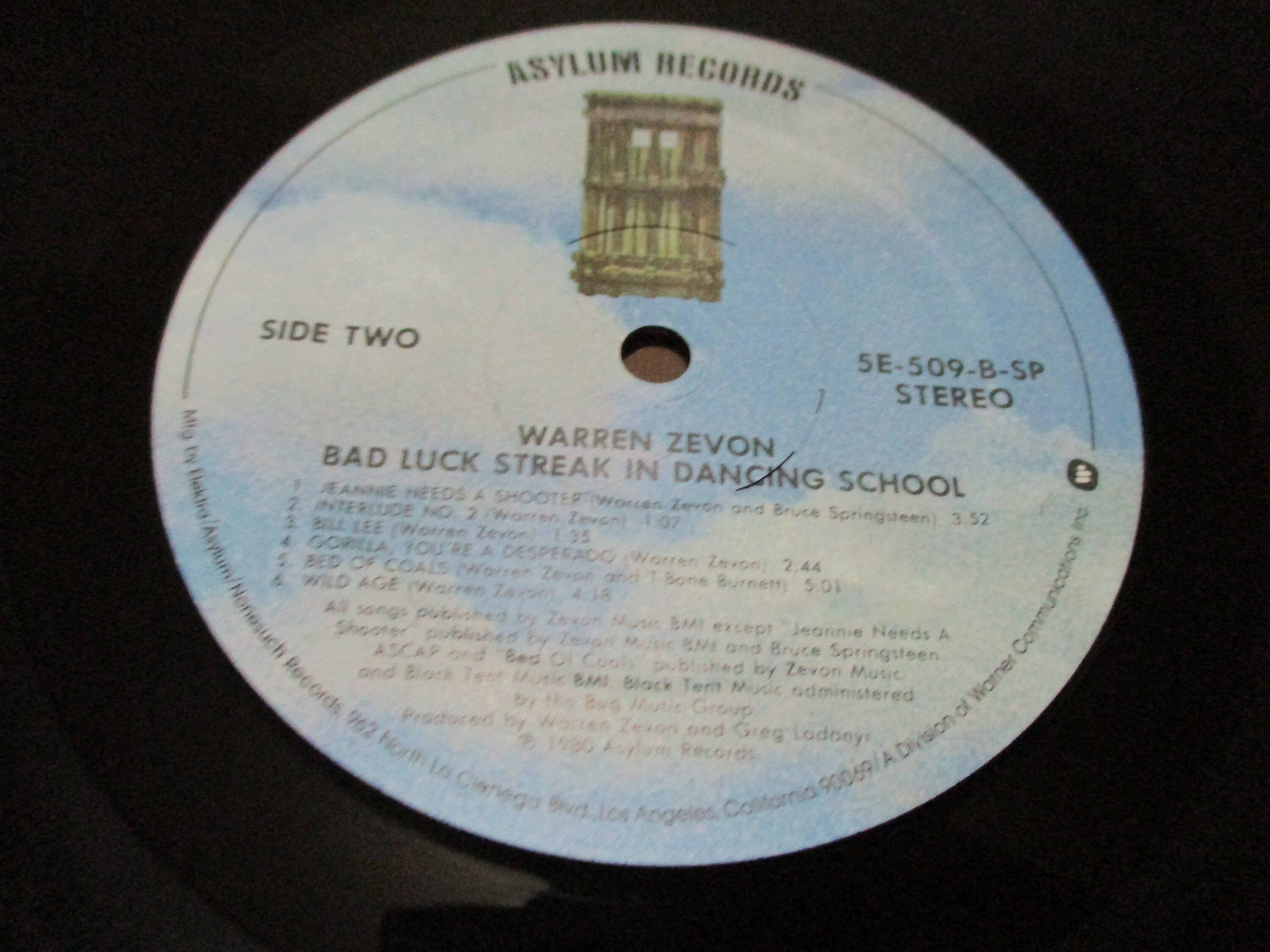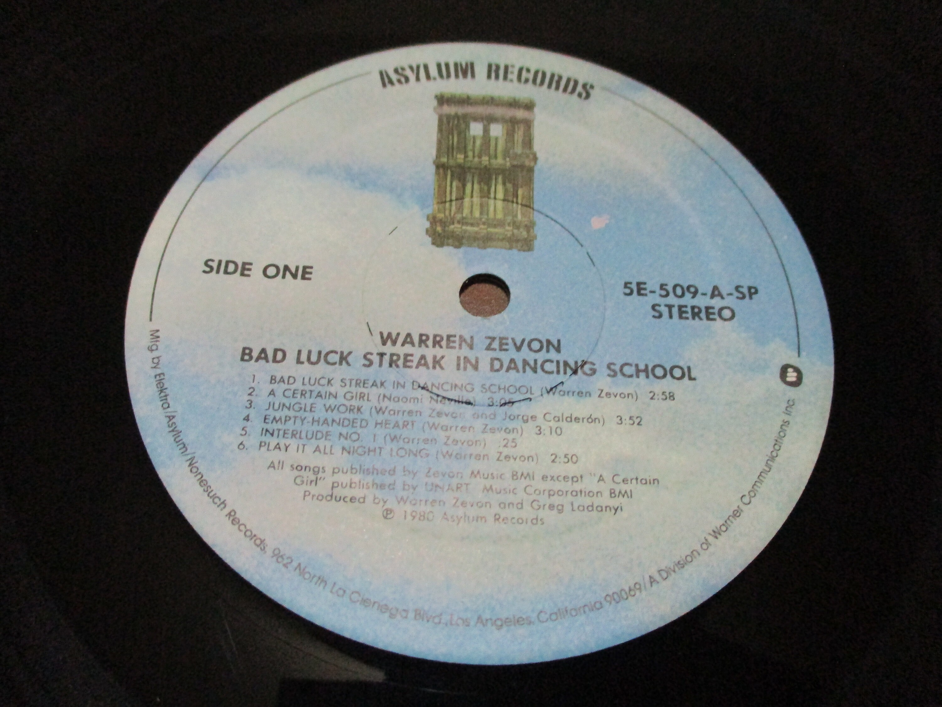 Vintage 1980 Vinyl LP Record Warren Zevon Bad Luck Streak In Dancing School Excellent Condition. Original cover is excellent and includes the original inner paper sleeve. Record is excellent as well. Tracks are as follows