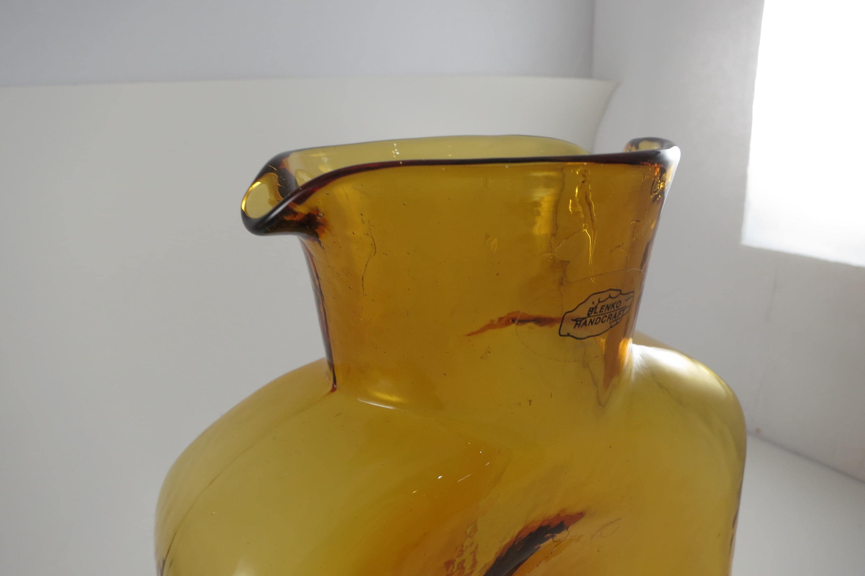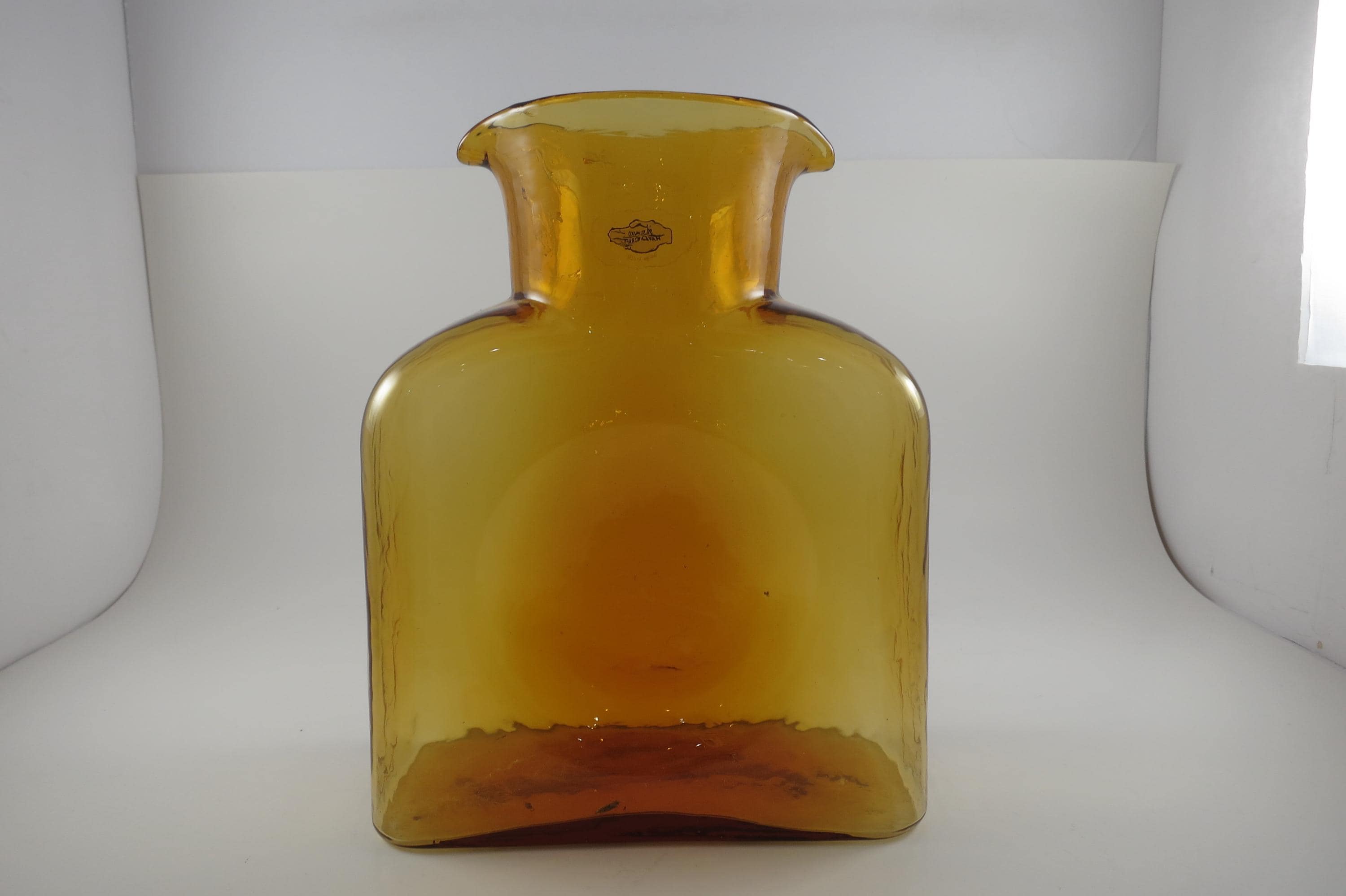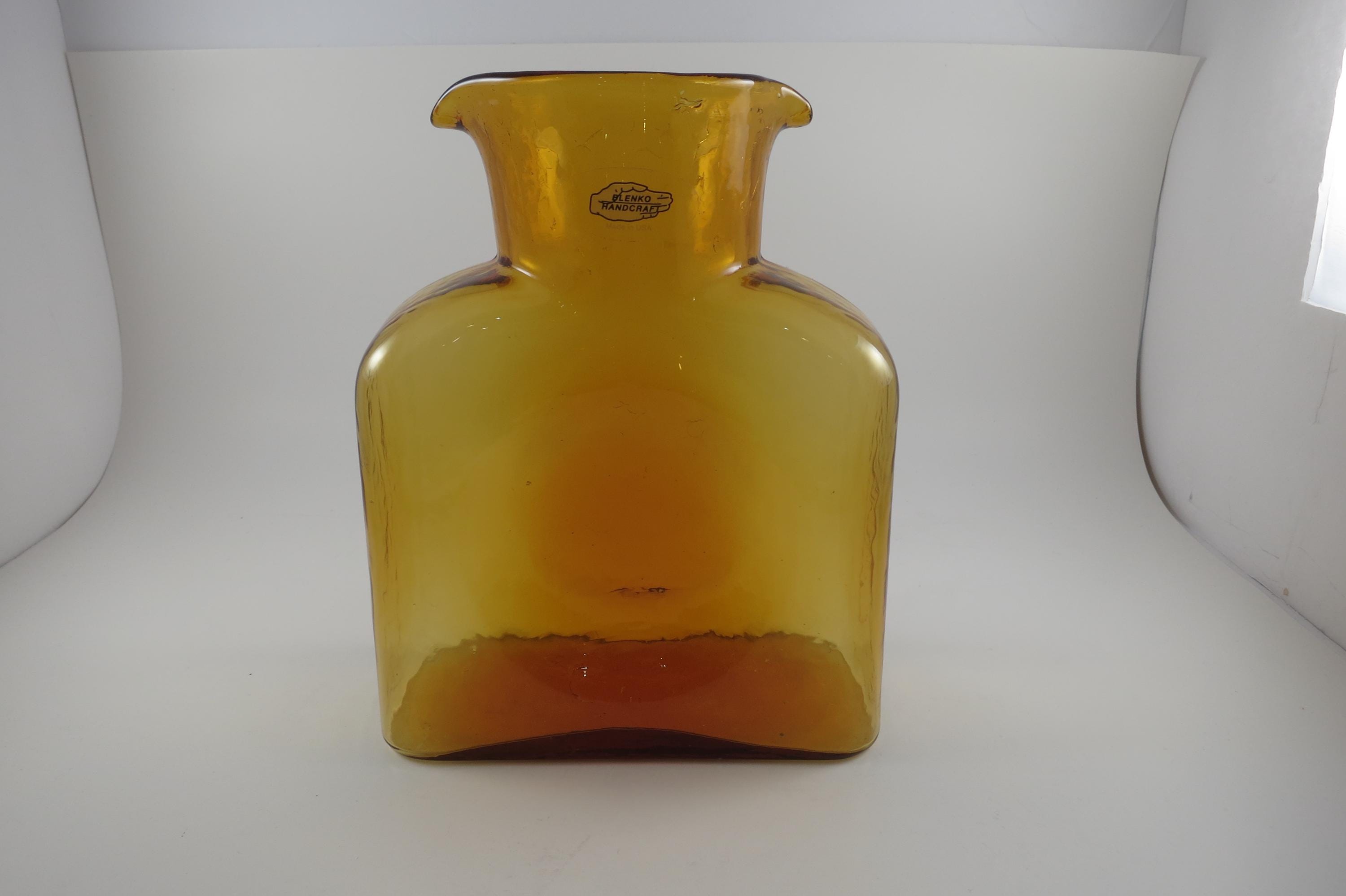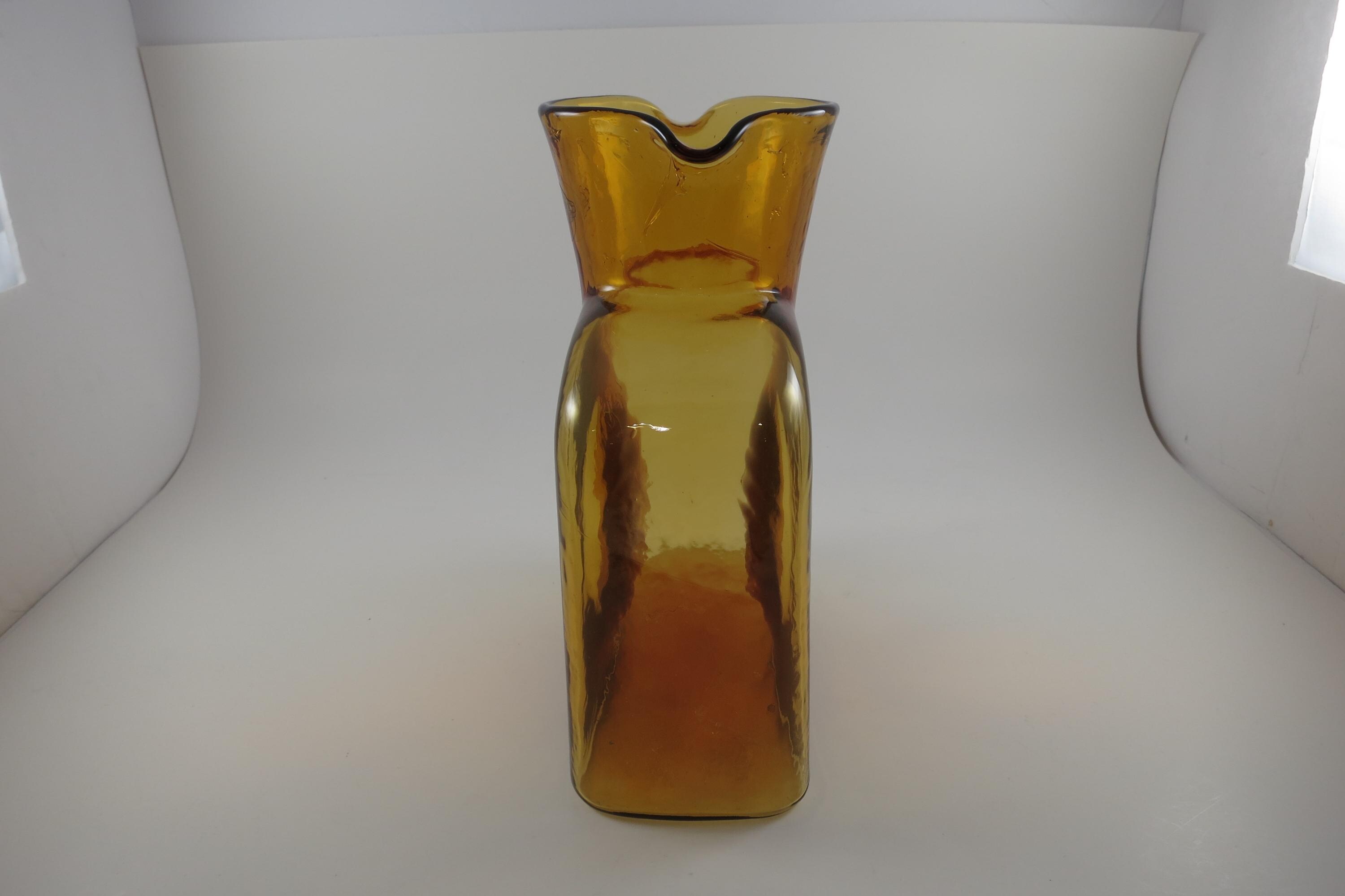 Measures 8 1/4 inches tall and 6 1/8 inches wide. Has a double spout. Beautiful Amber Color and has the Blenko sticker still attached.