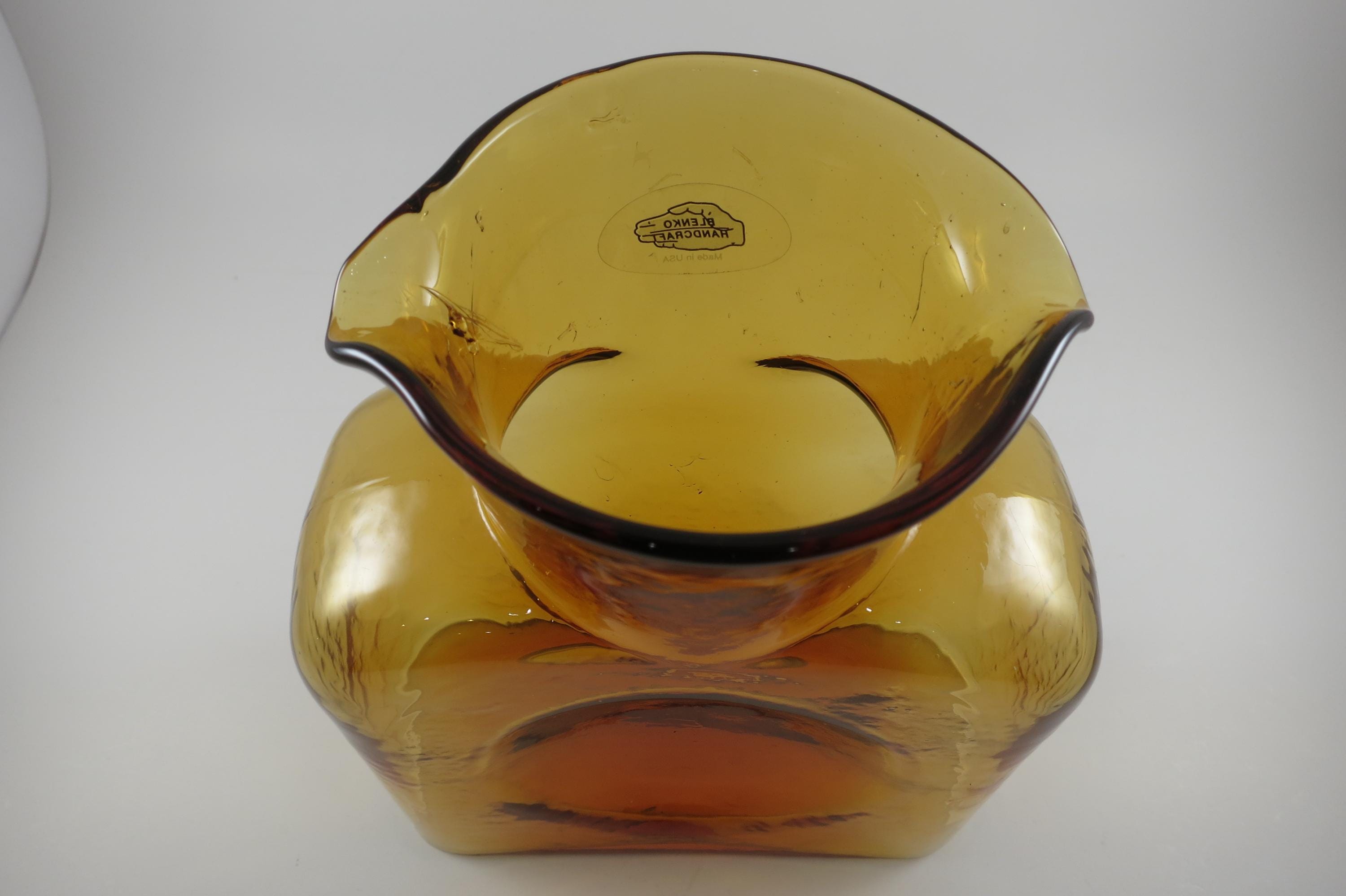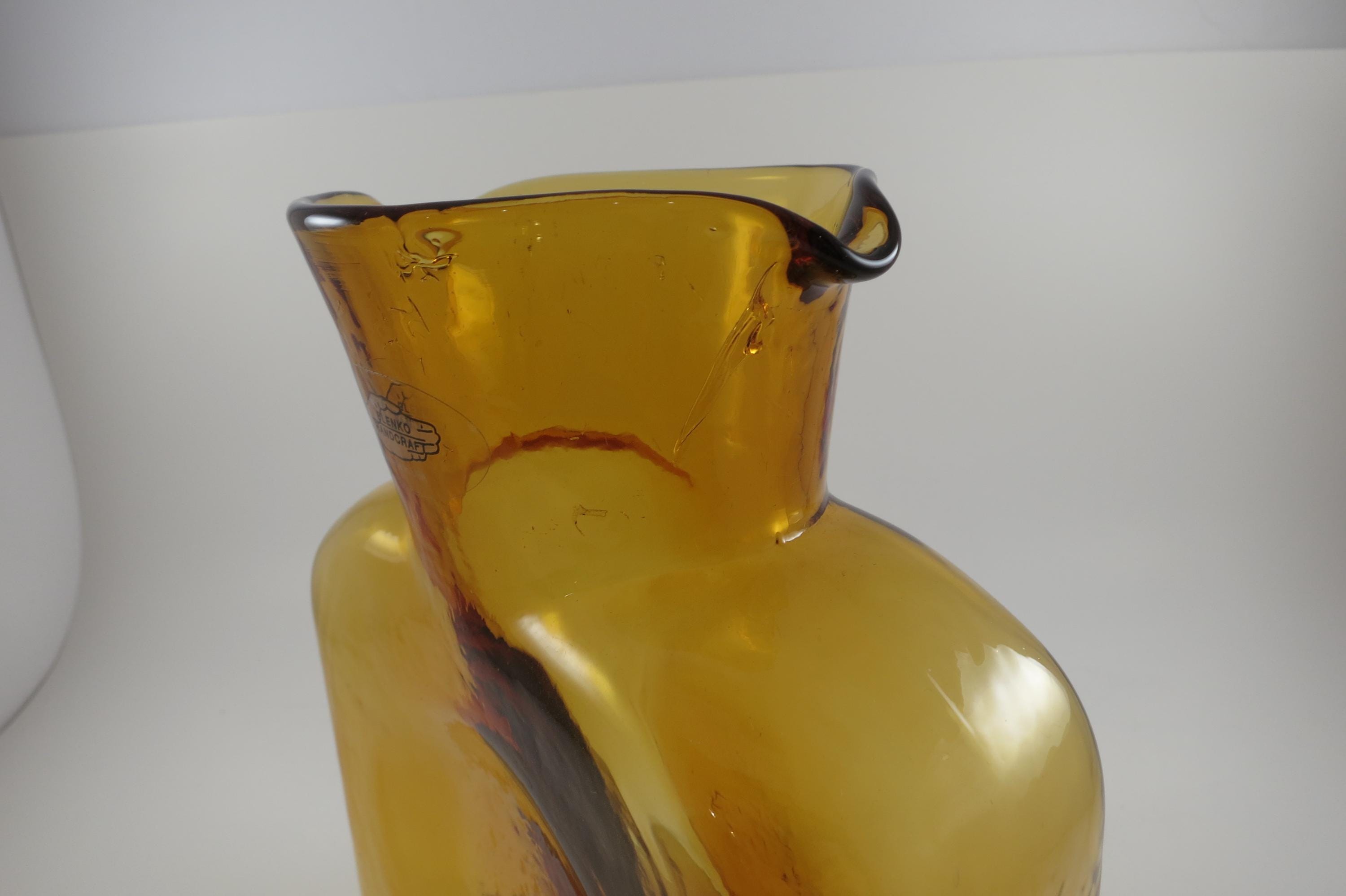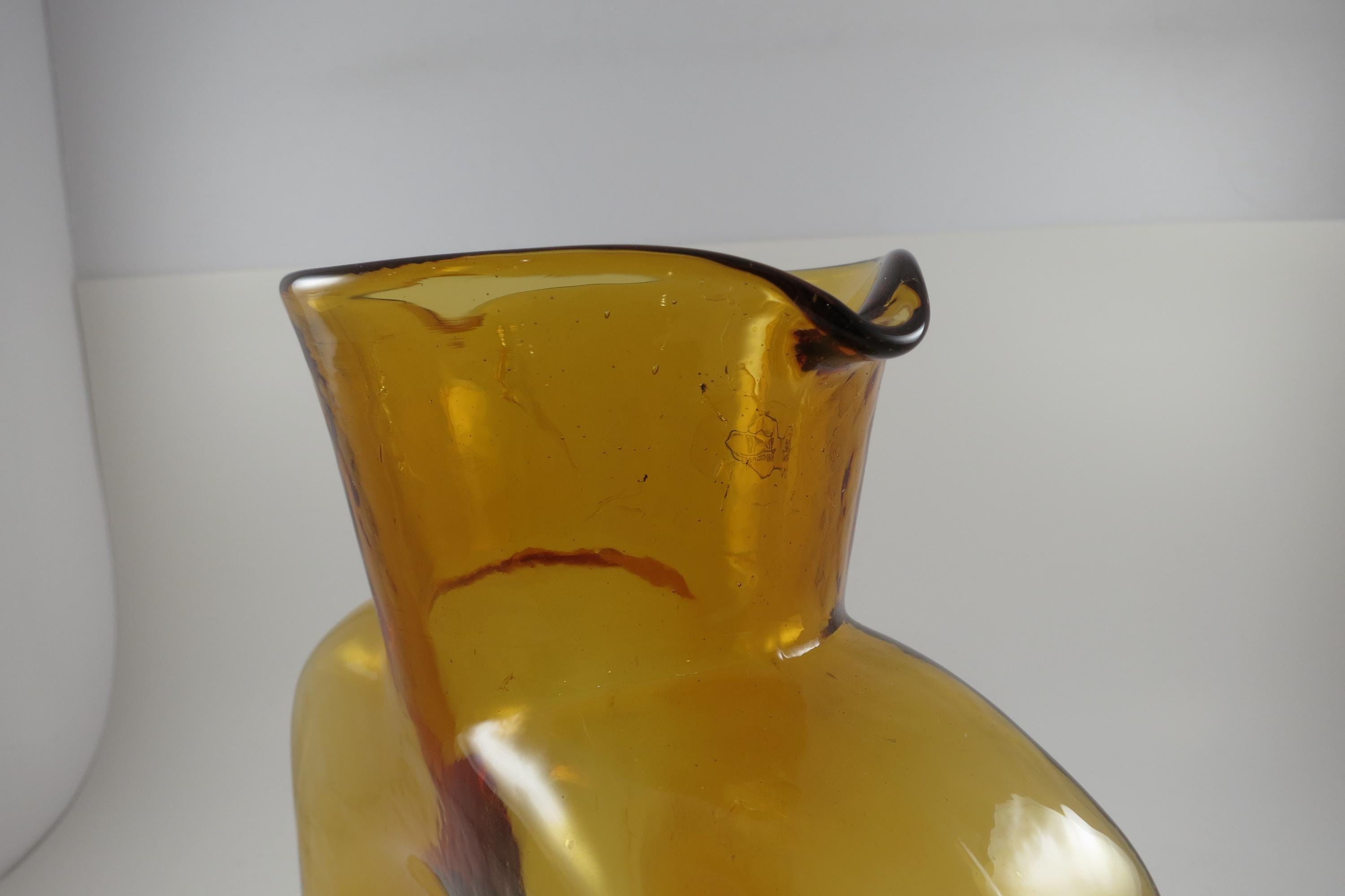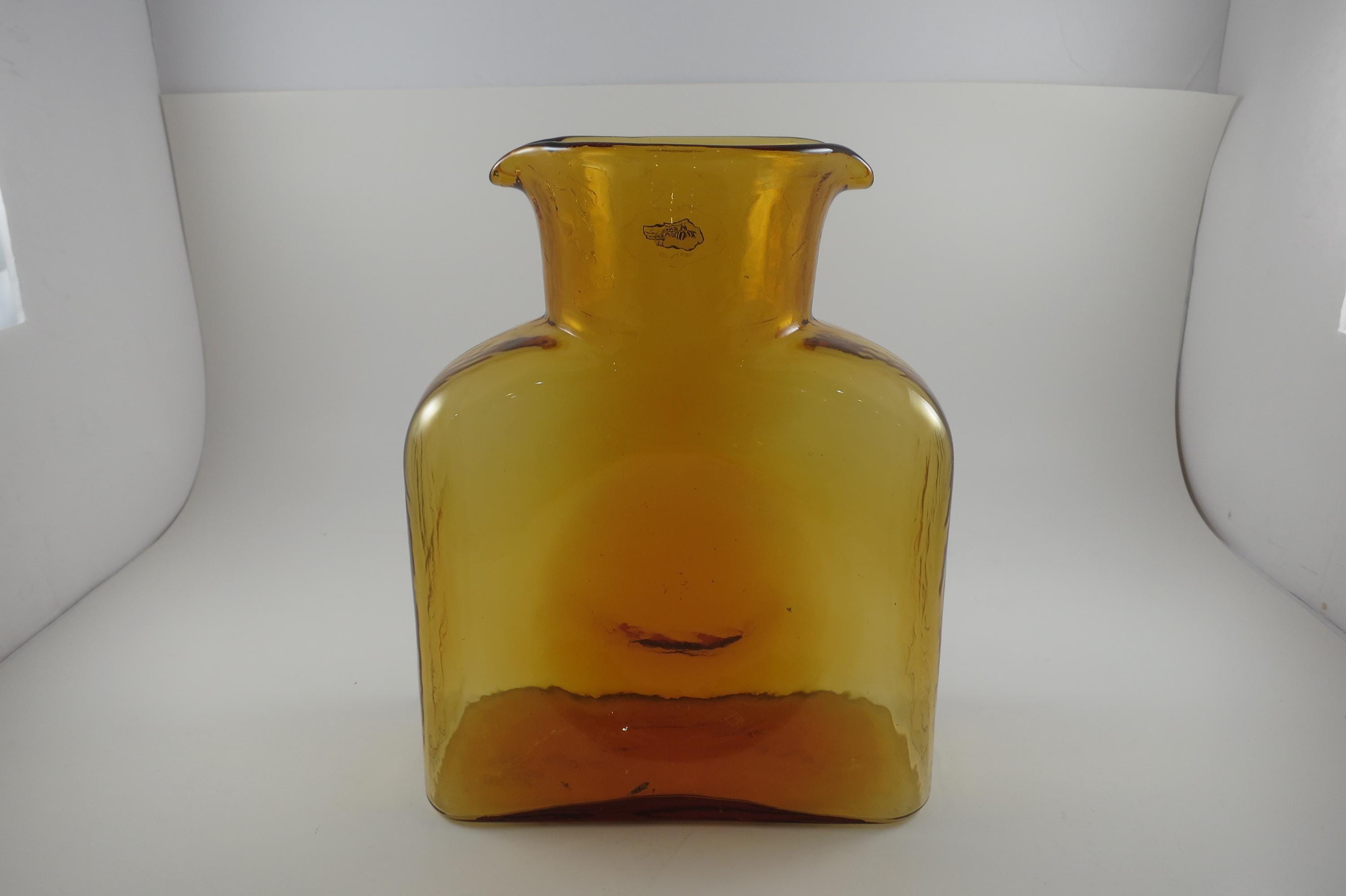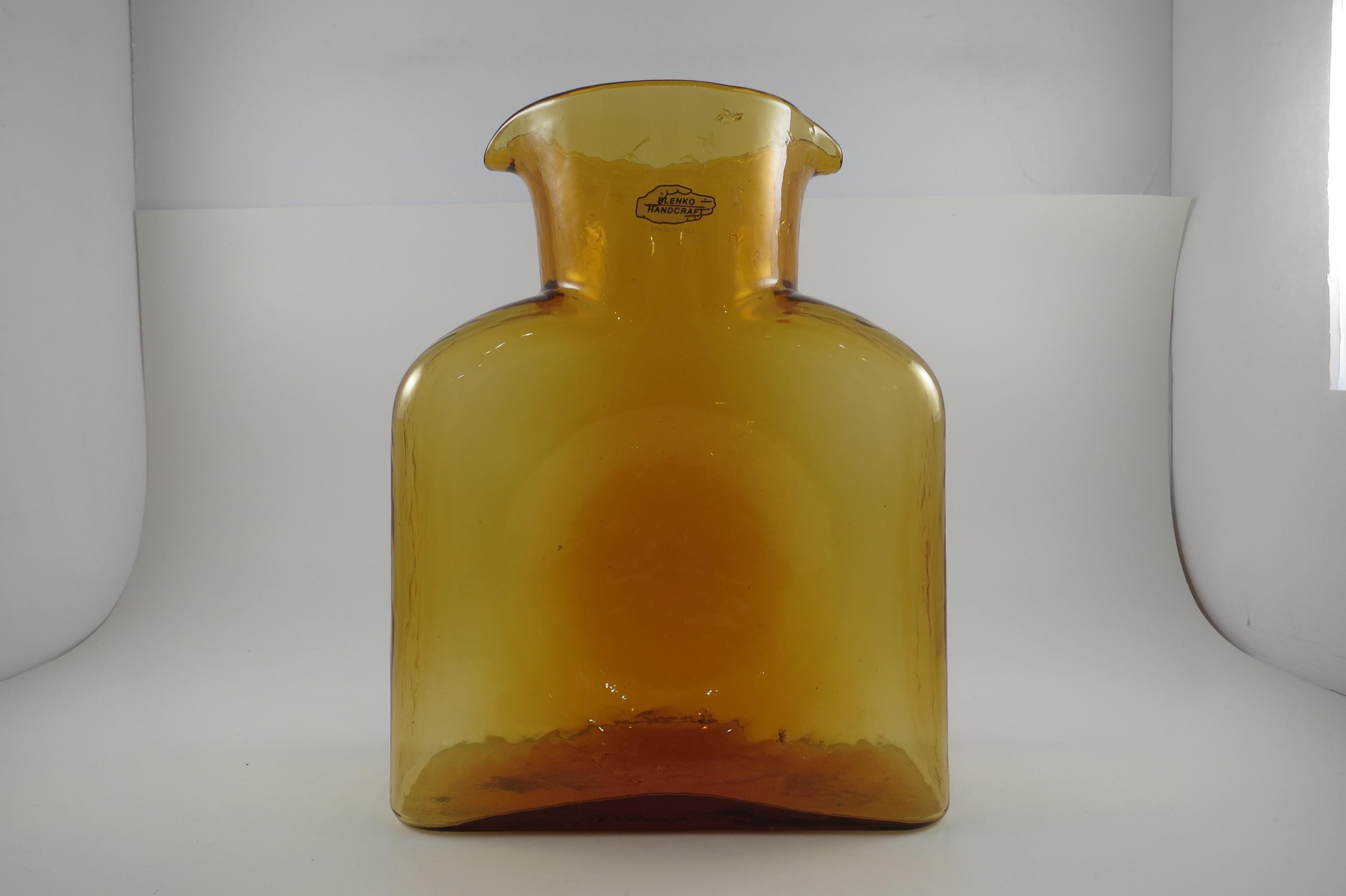 Measures 8 1/4 inches tall and 6 1/8 inches wide. Has a double spout. Beautiful Amber Color and has the Blenko sticker still attached.