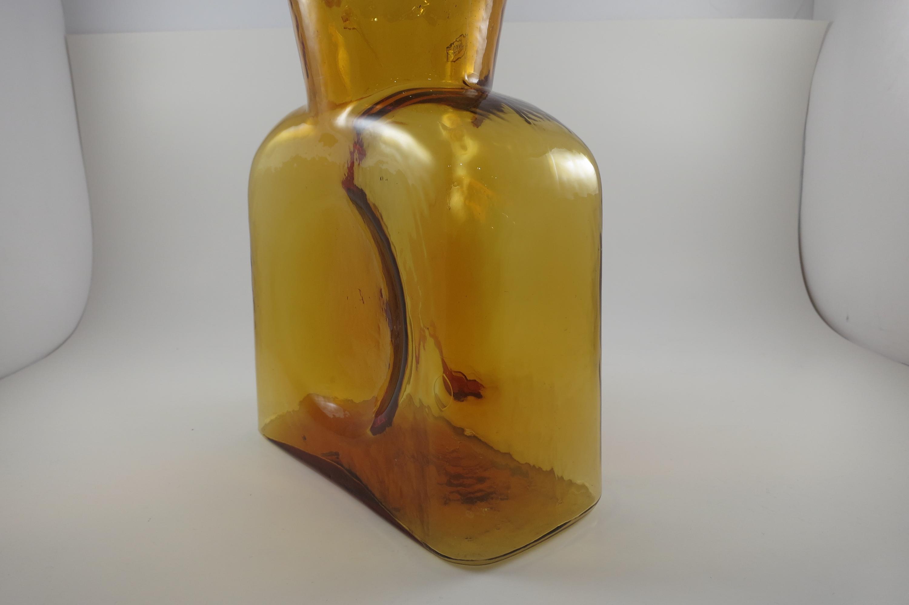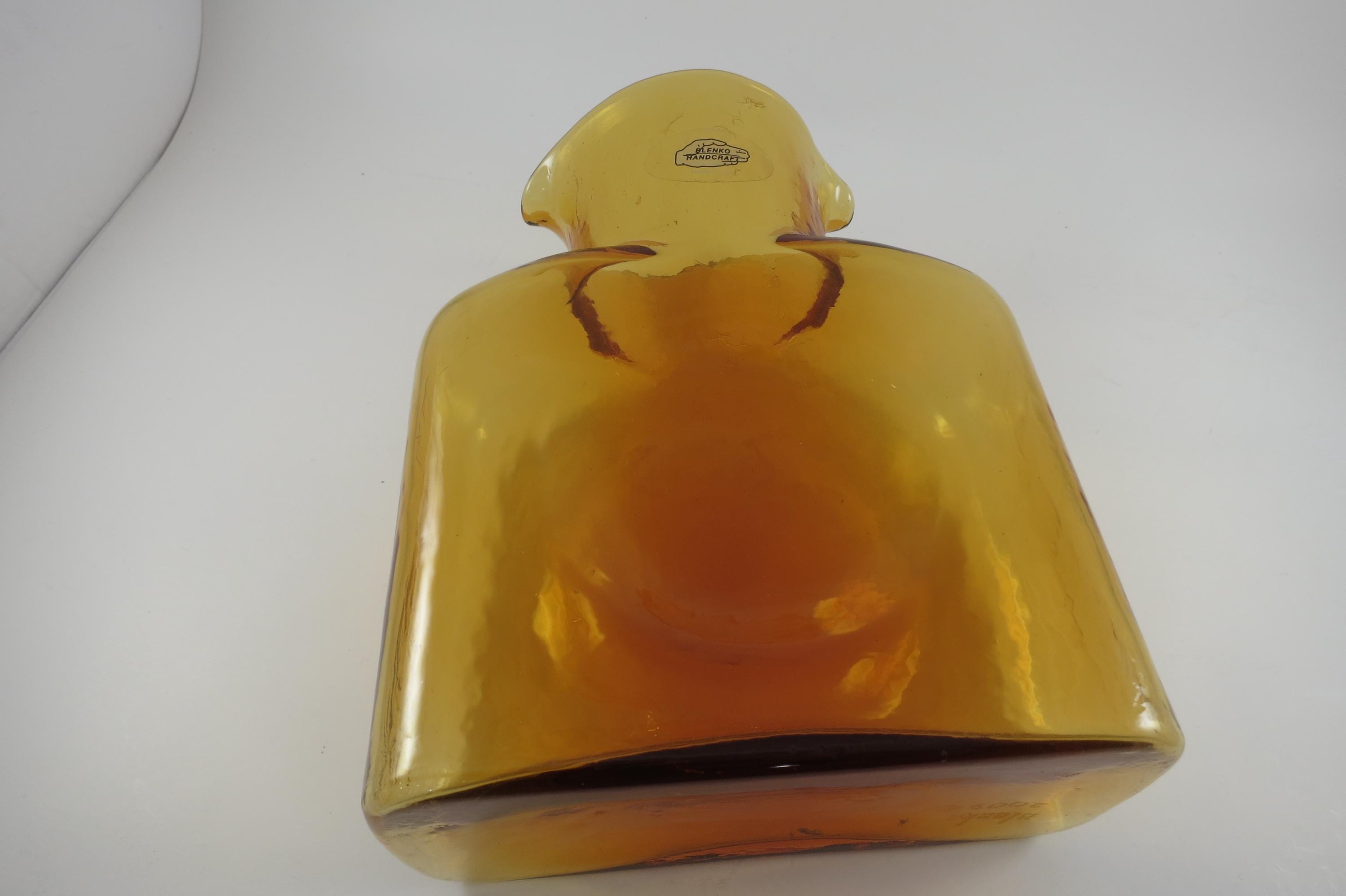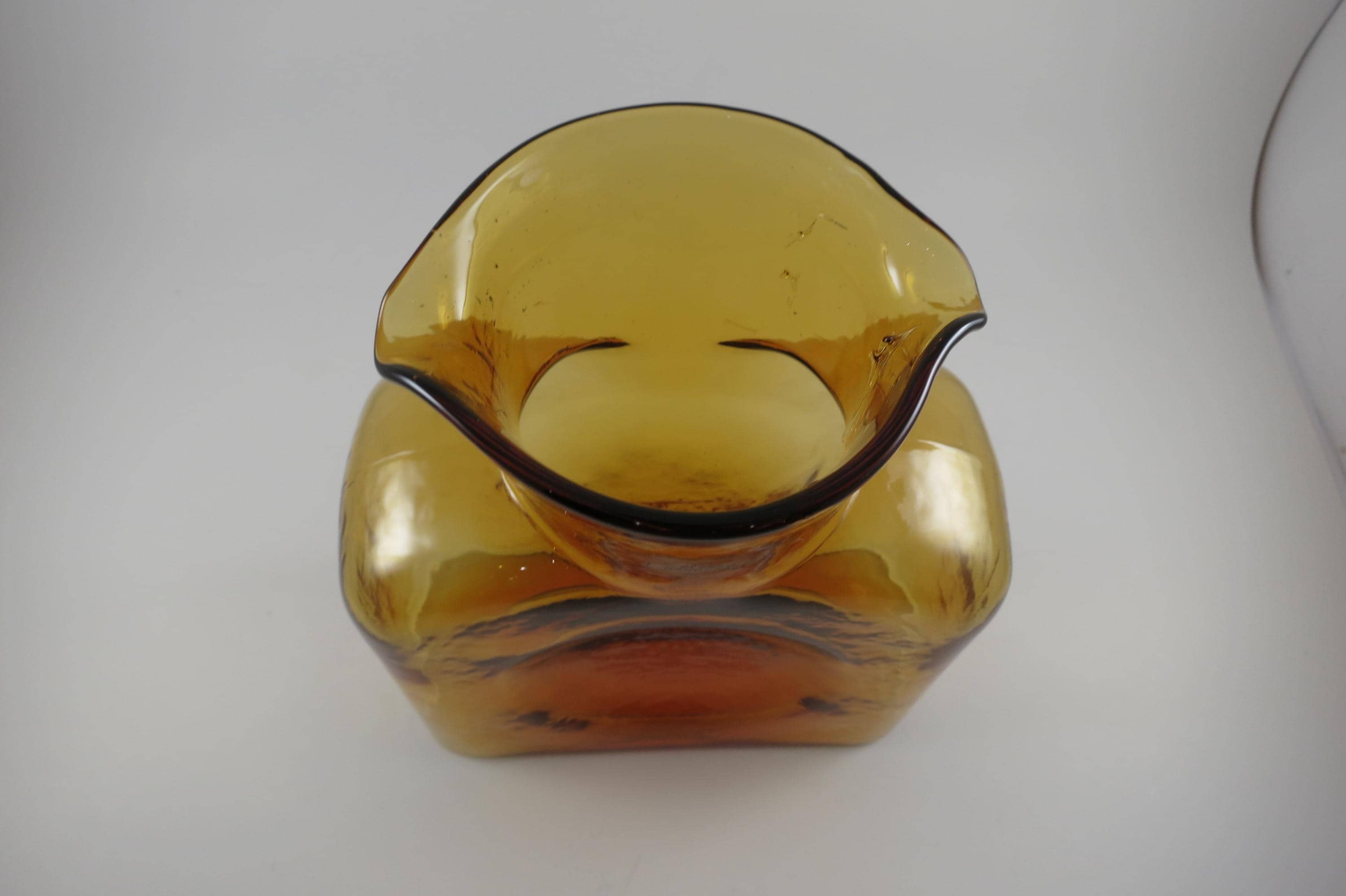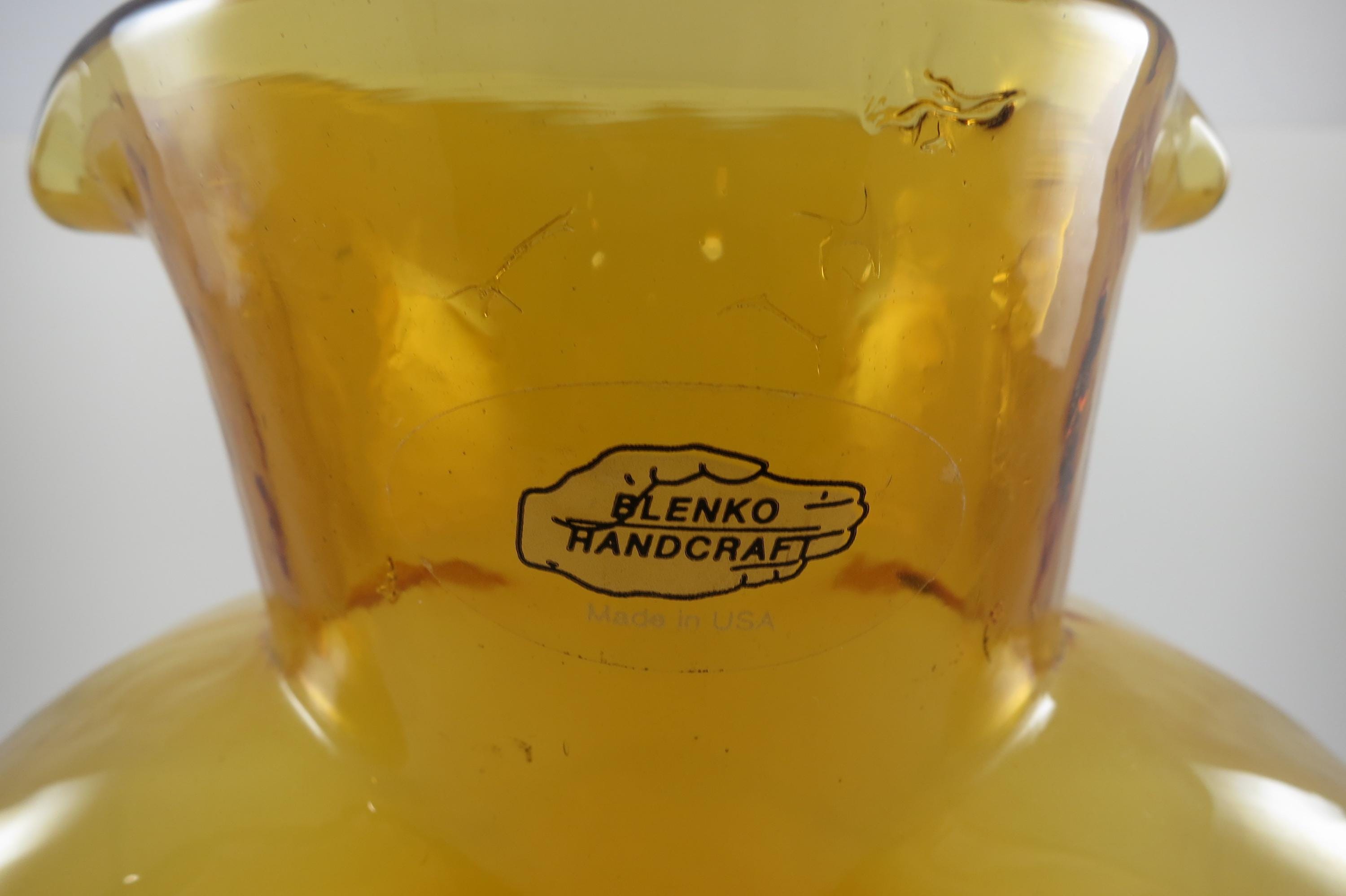 Measures 8 1/4 inches tall and 6 1/8 inches wide. Has a double spout. Beautiful Amber Color and has the Blenko sticker still attached.