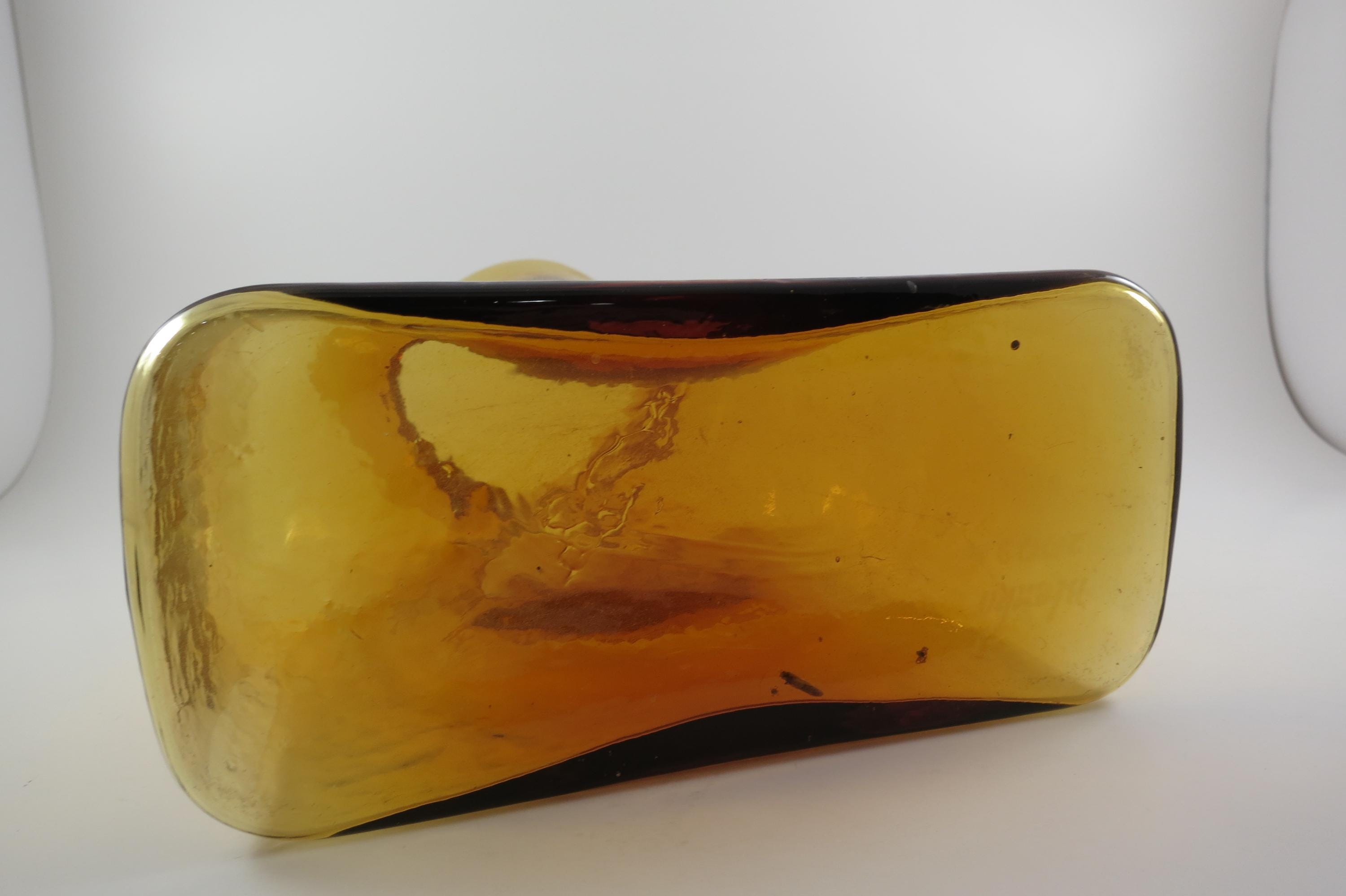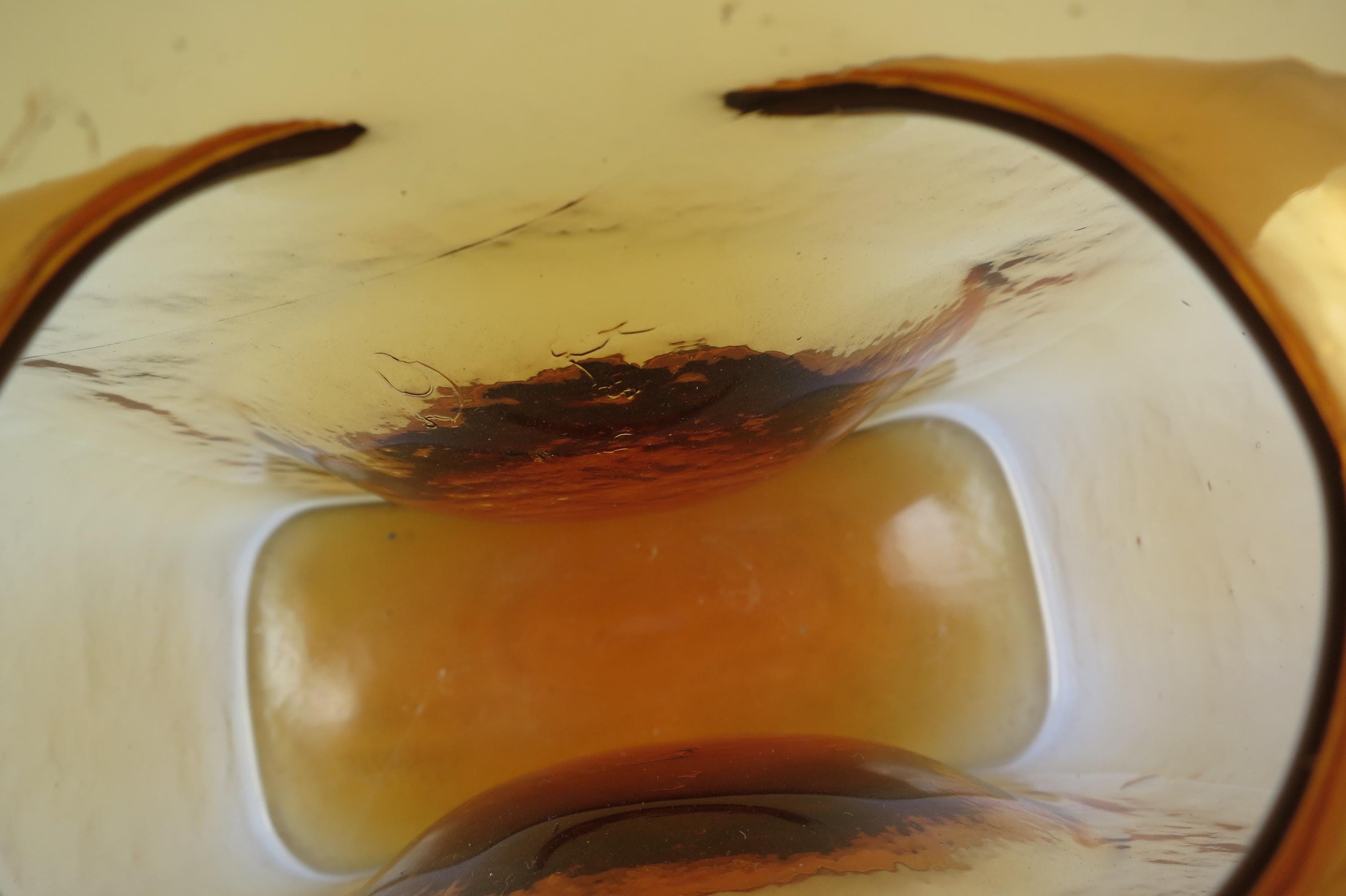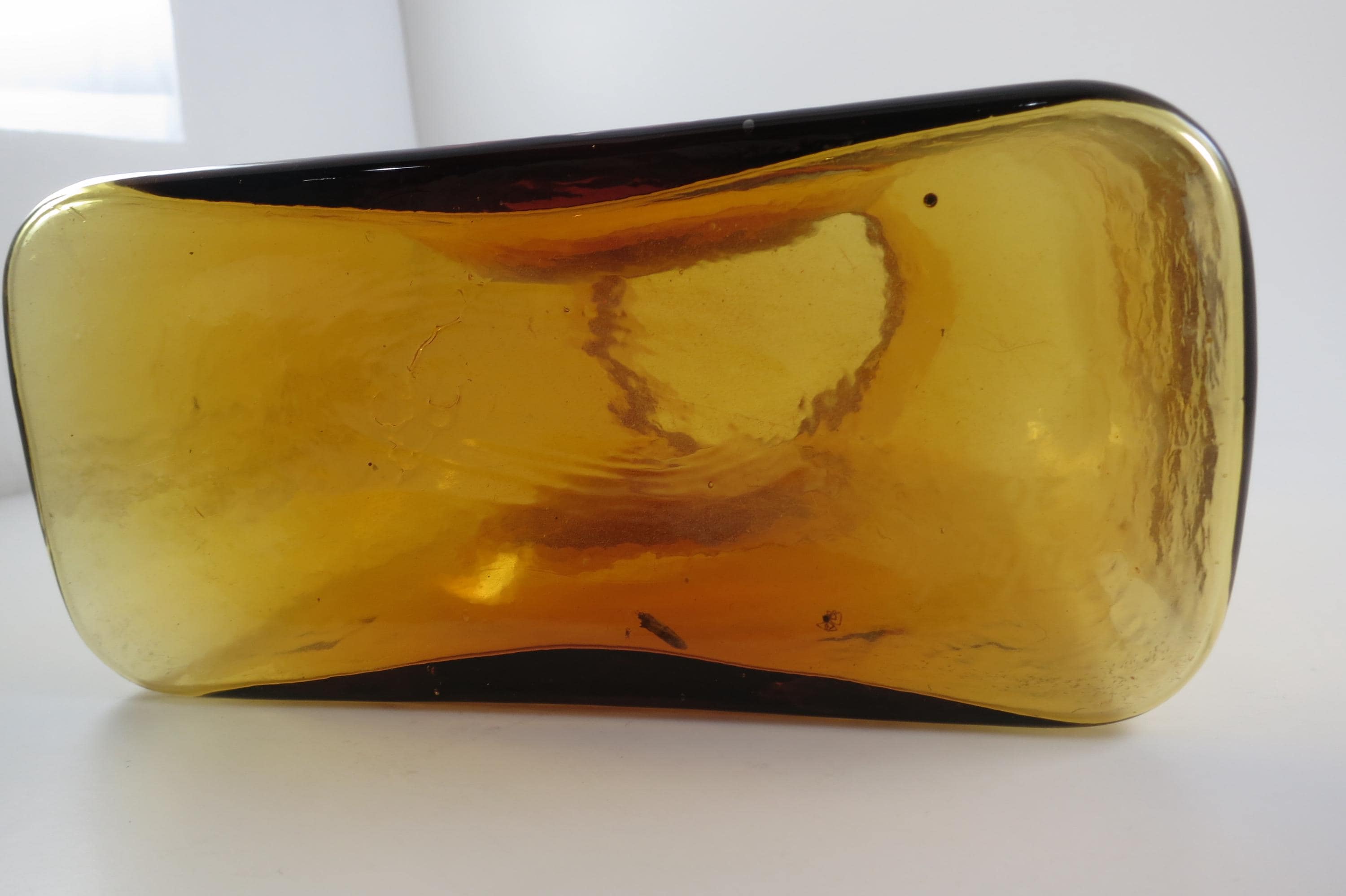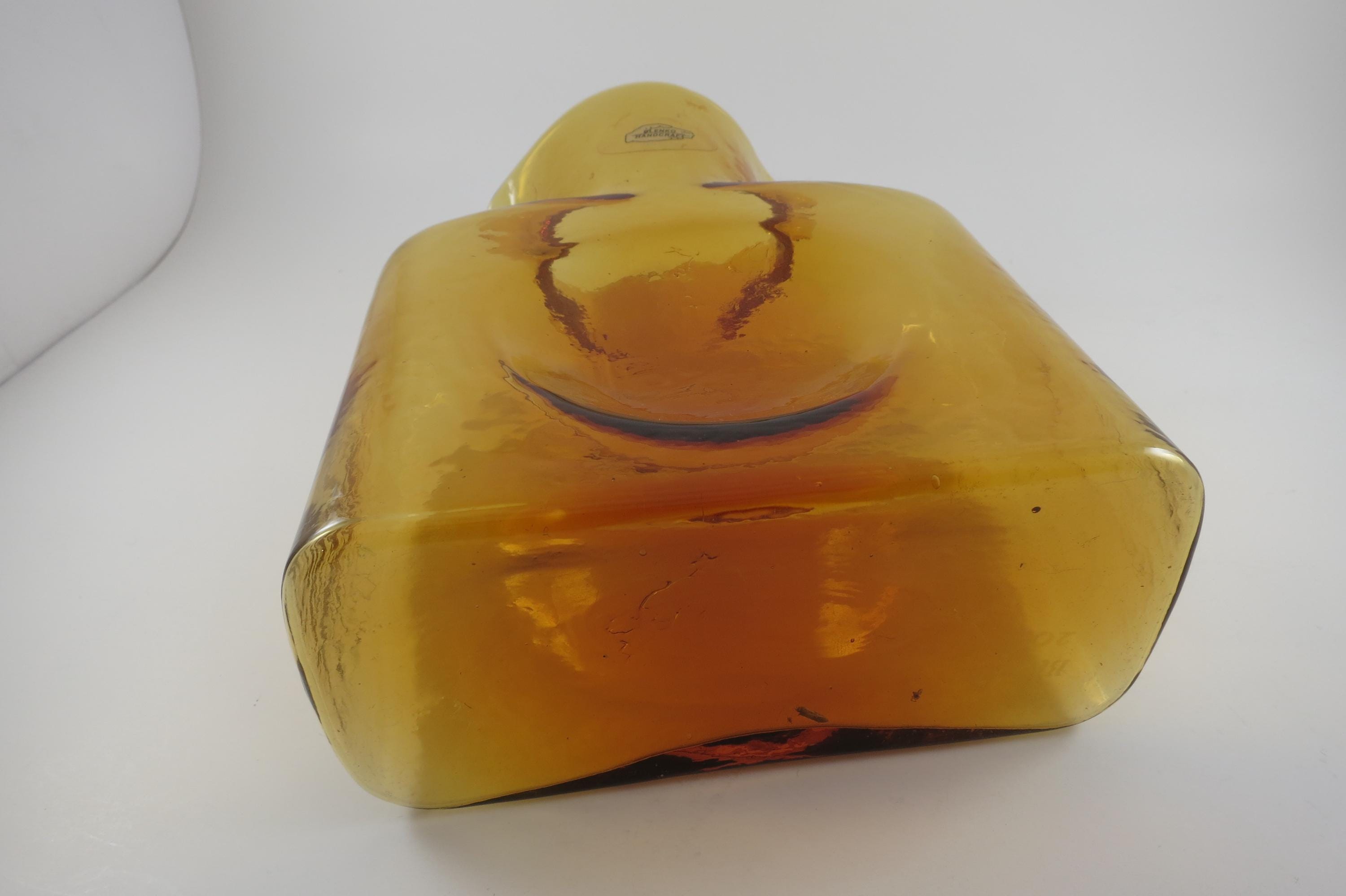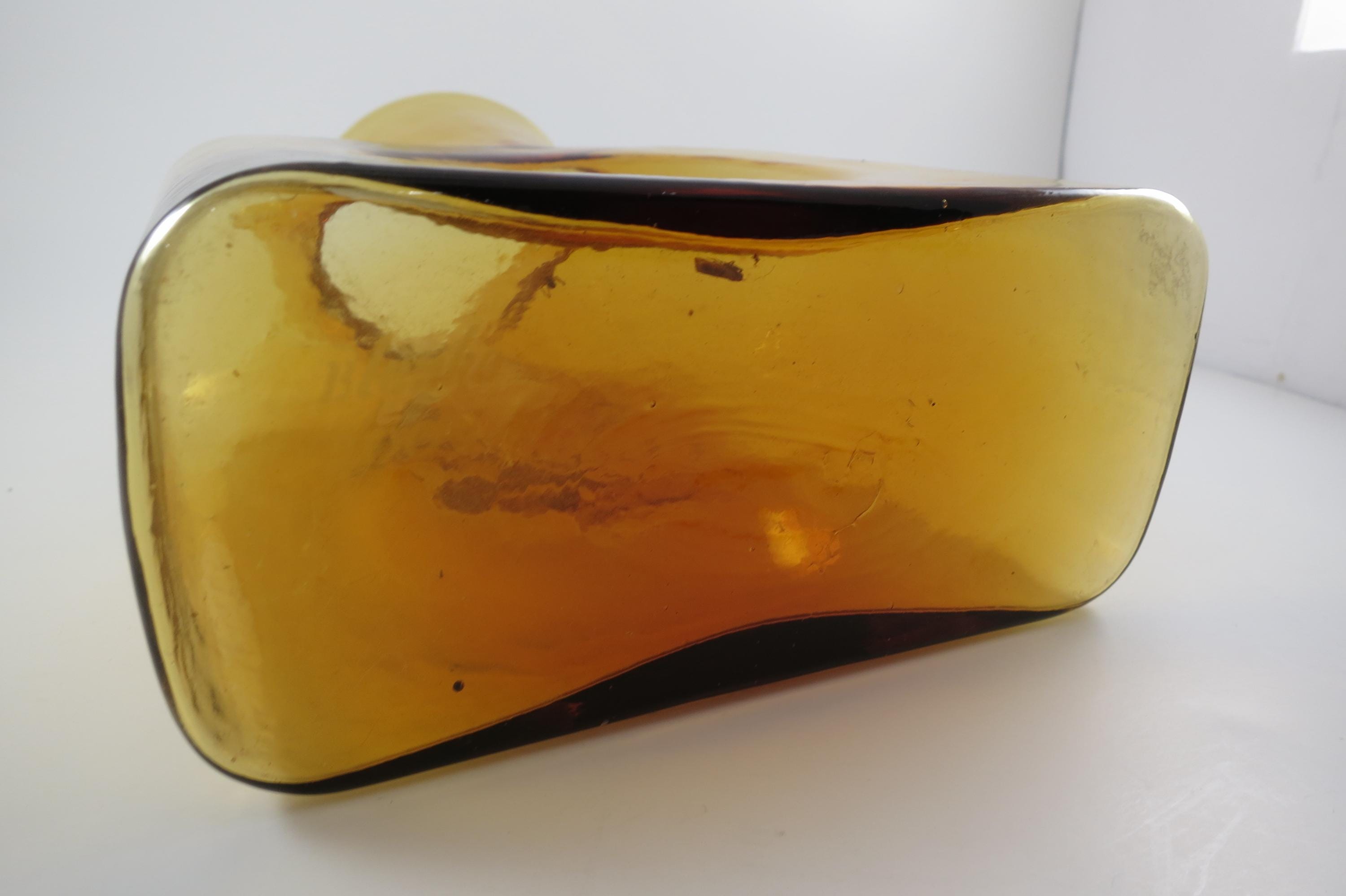 Measures 8 1/4 inches tall and 6 1/8 inches wide. Has a double spout. Beautiful Amber Color and has the Blenko sticker still attached.
