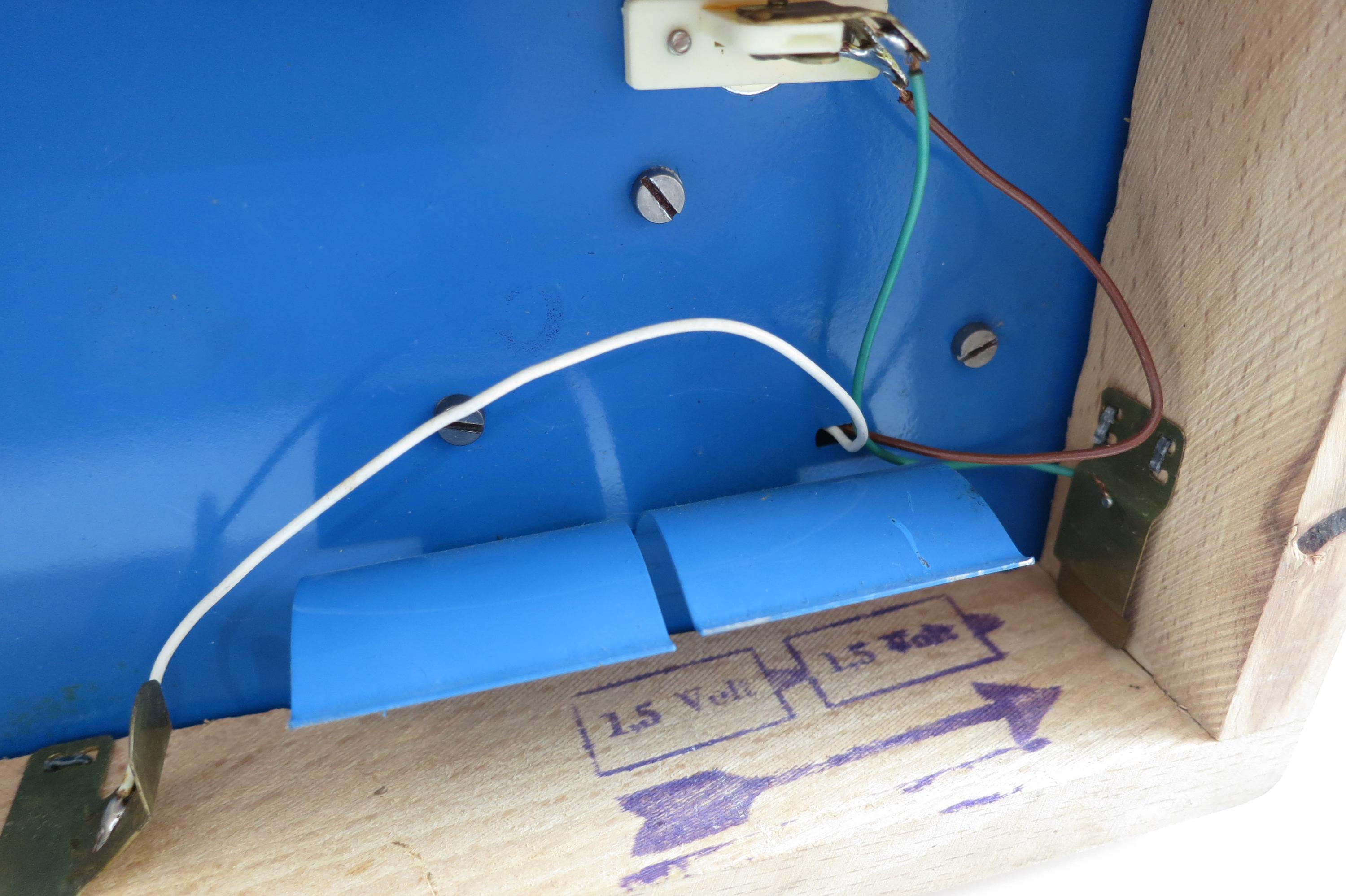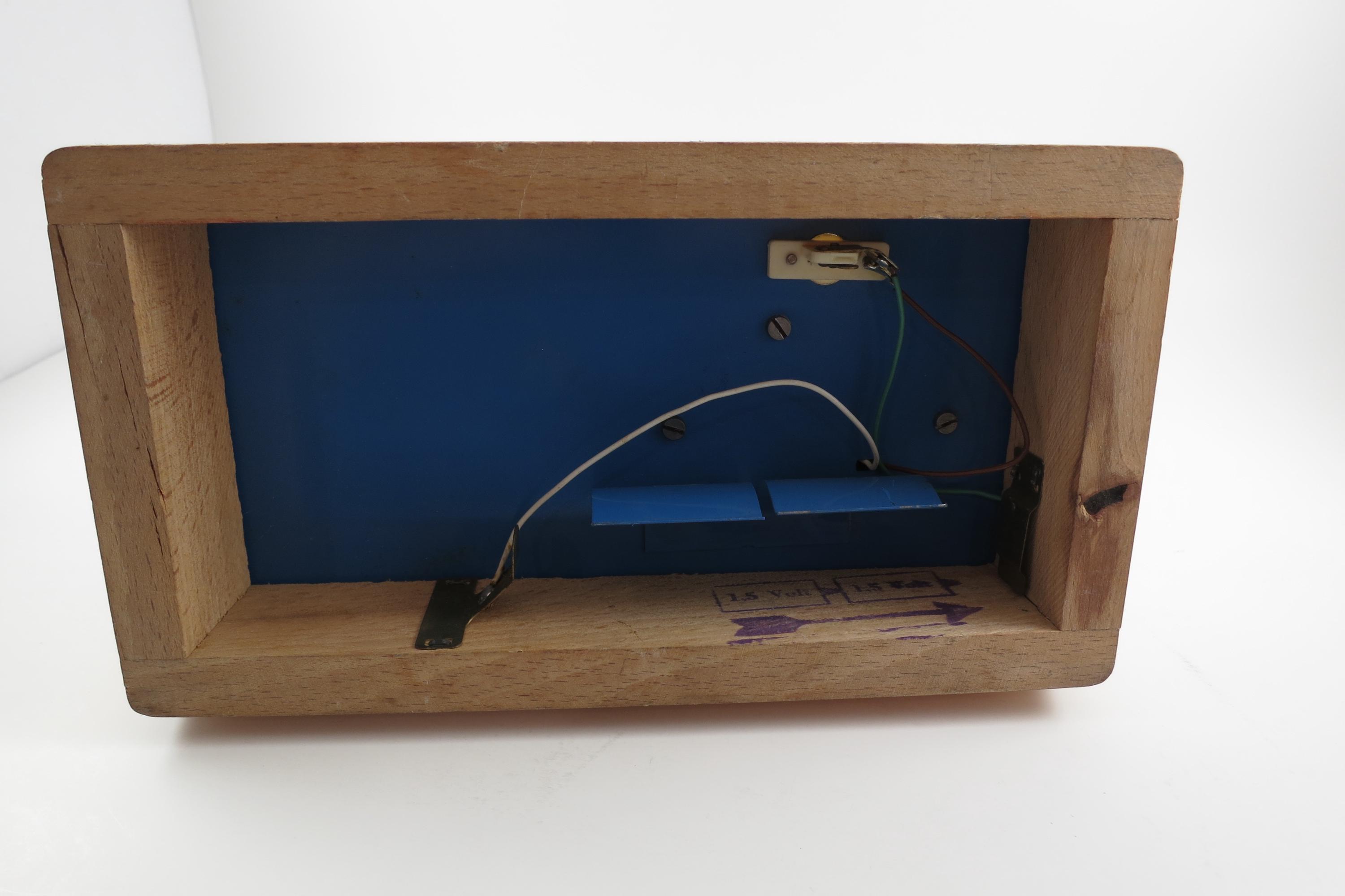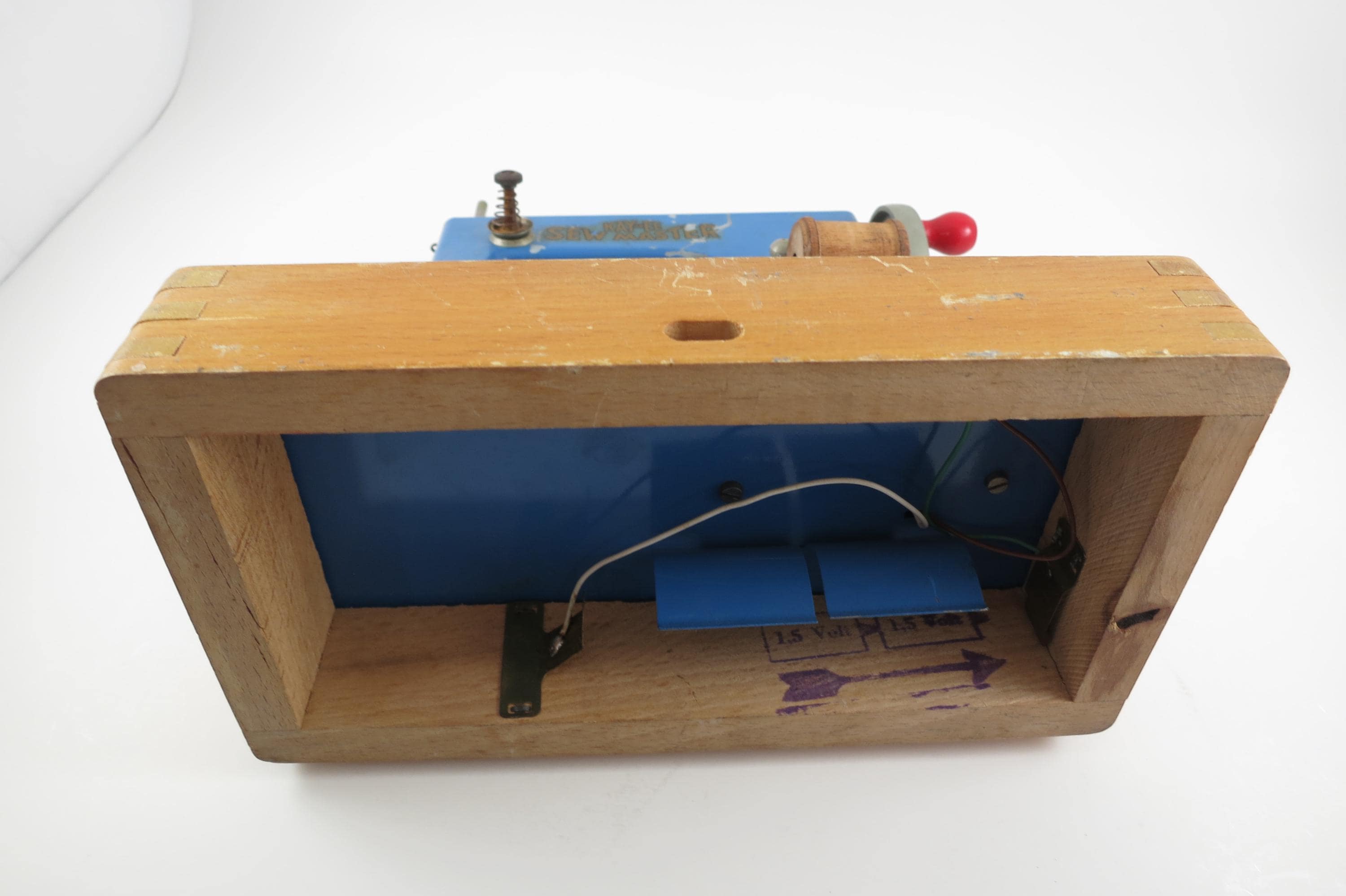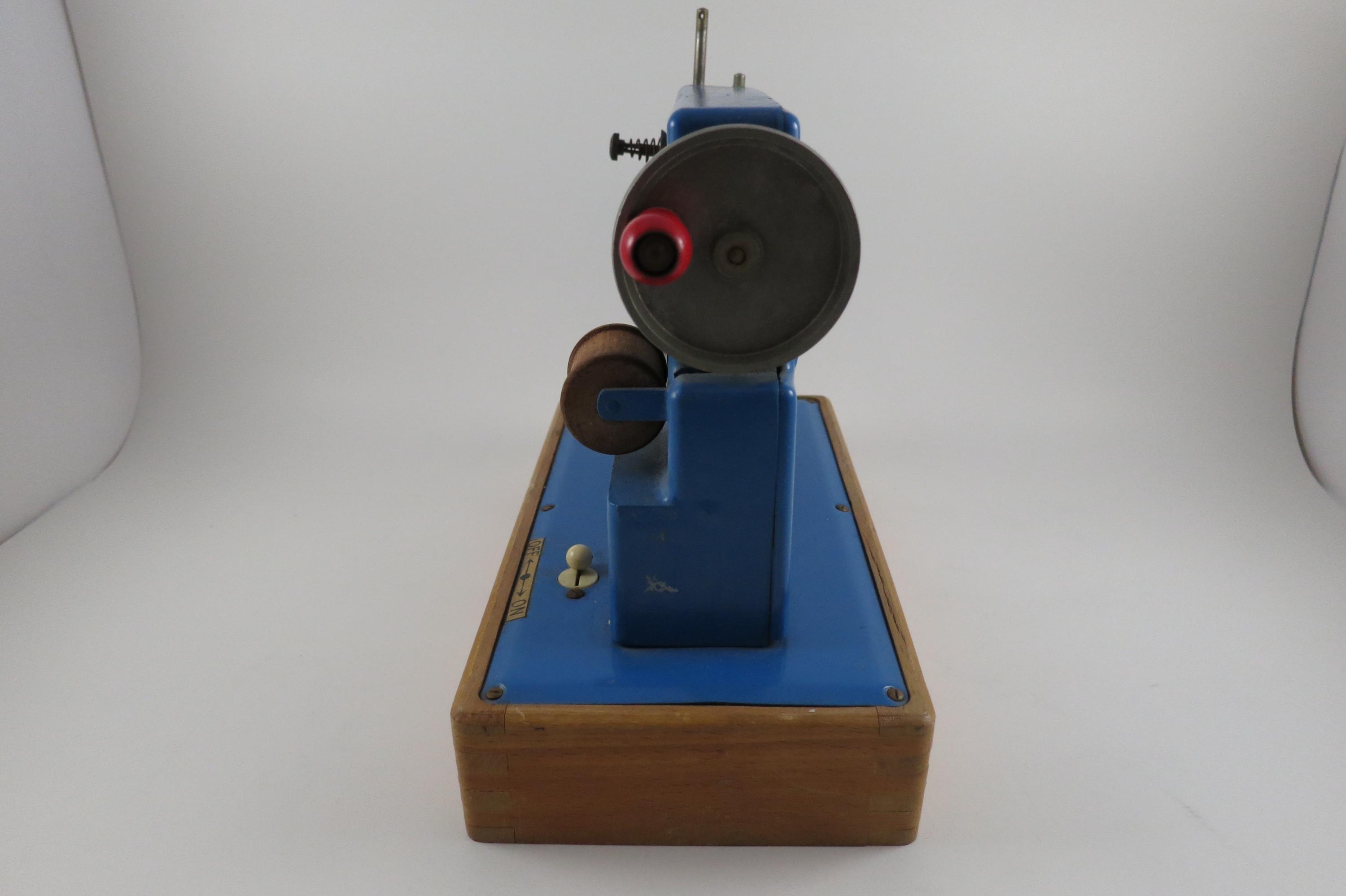In excellent condition, and actually works! This one is blue, hand held crank, made in Berlin Germany (US Zone). Has a wooden base. Measures 8 1/2 inches long, 4 3/4 inches wide and 7 1/2 inches tall.