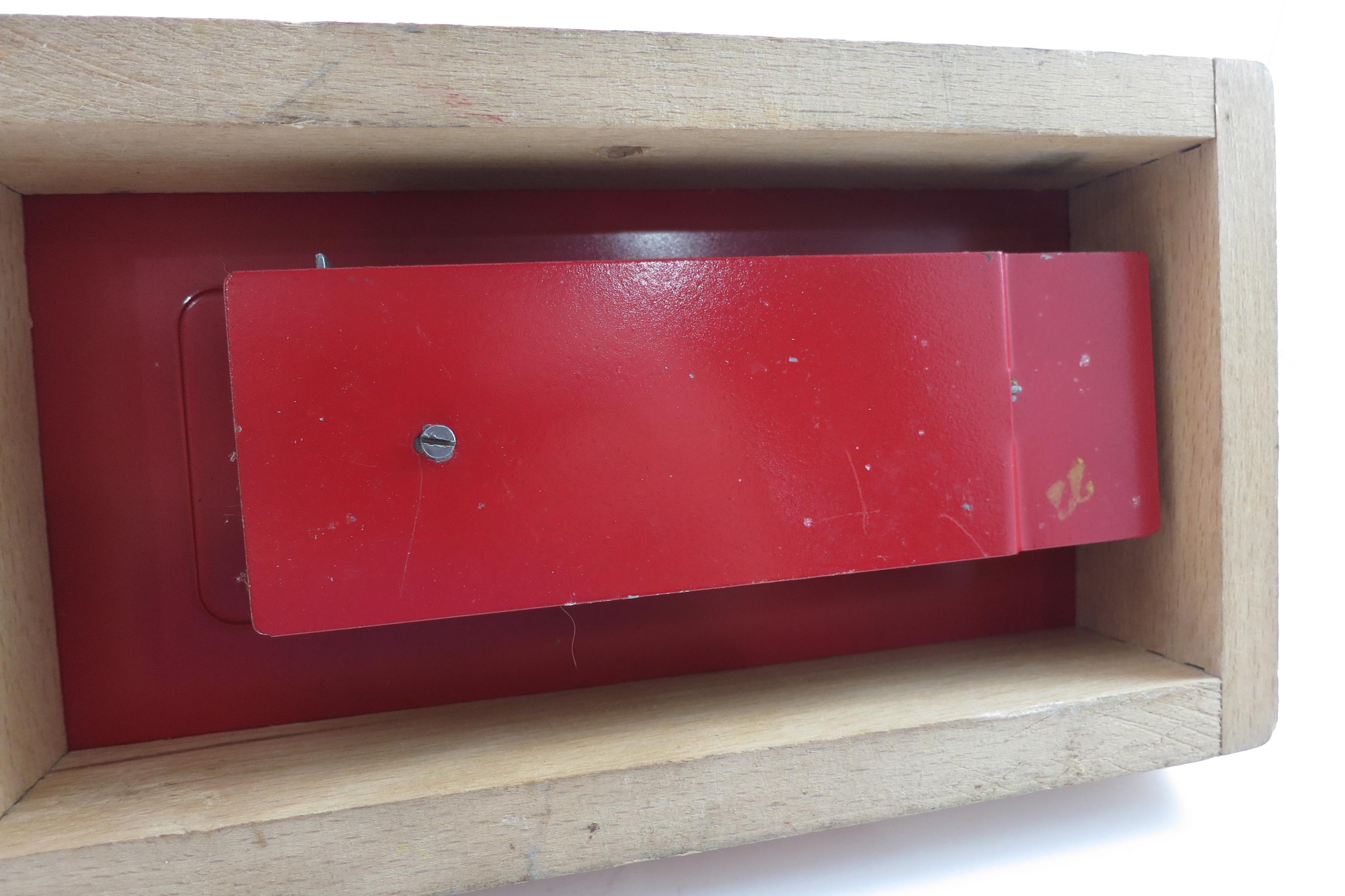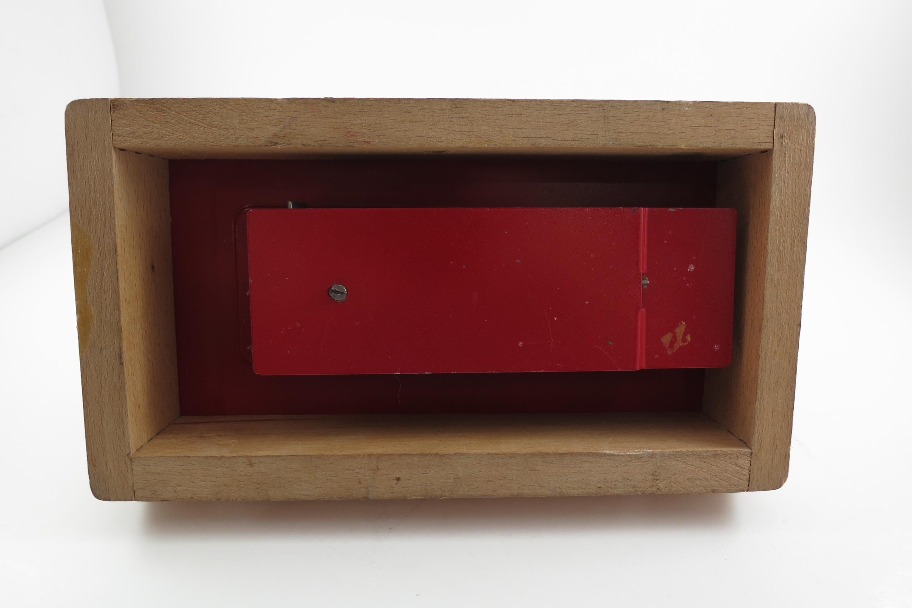 In excellent condition, and actually works! This one is red, hand held crank, made in Berlin Germany (US Zone). Has a wooden base. Measures 8 1/2 inches long, 4 3/4 inches wide and 7 1/2 inches tall.
