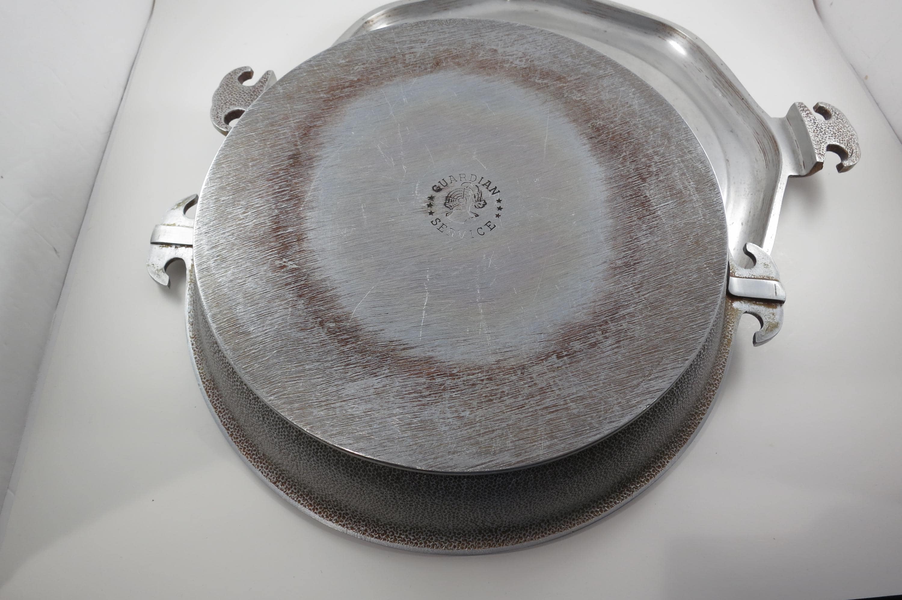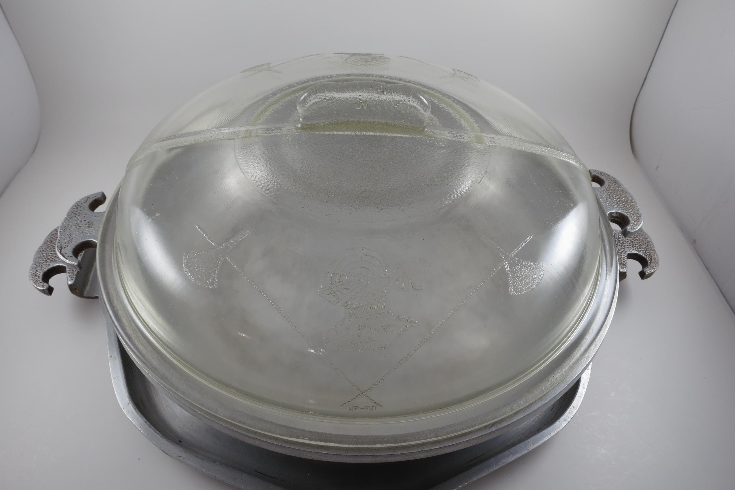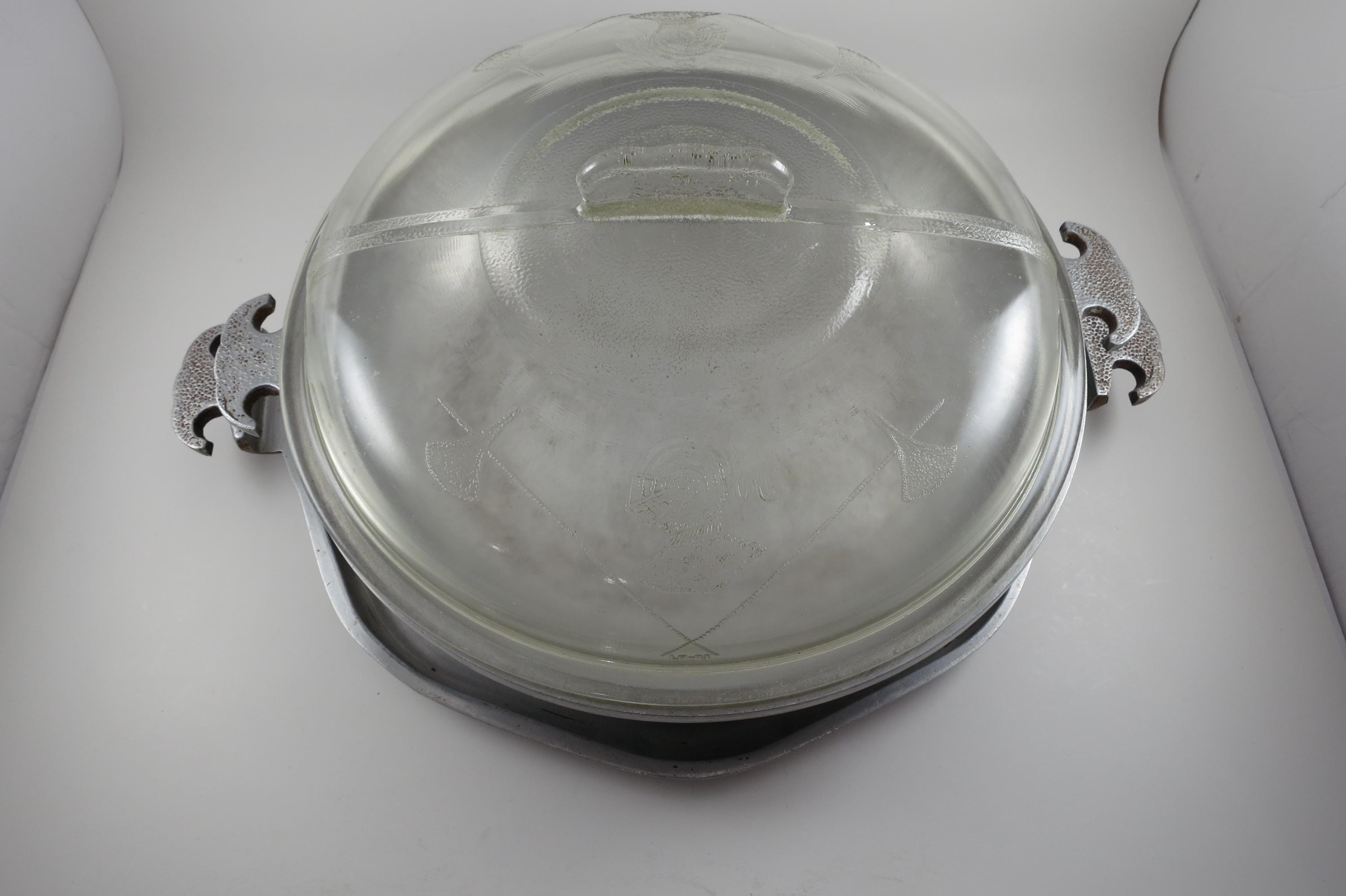 Vintage MCM Guardian Service Cookware Hammered Aluminum 3 Piece Set Tray Roaster Glass Lid.