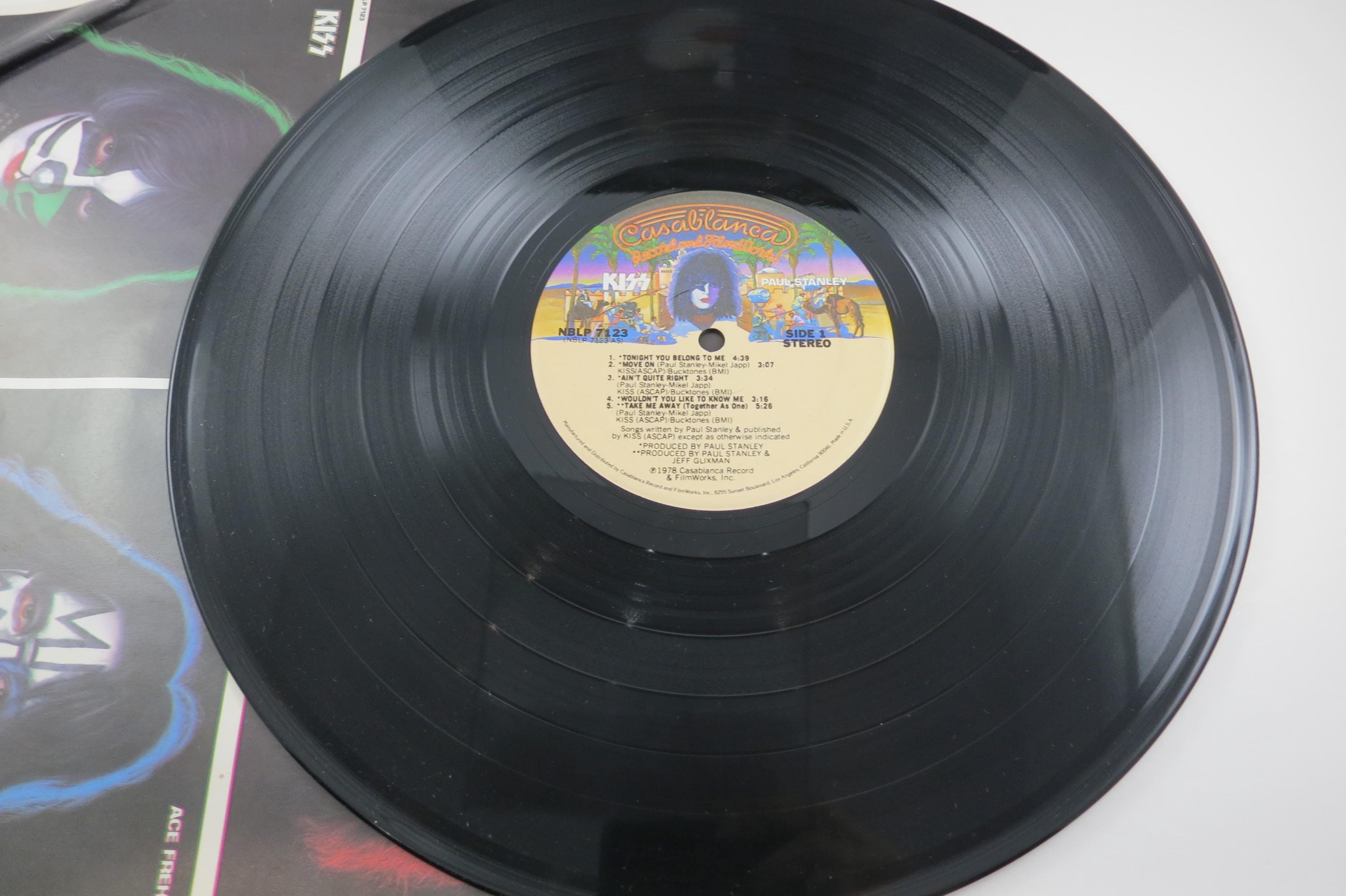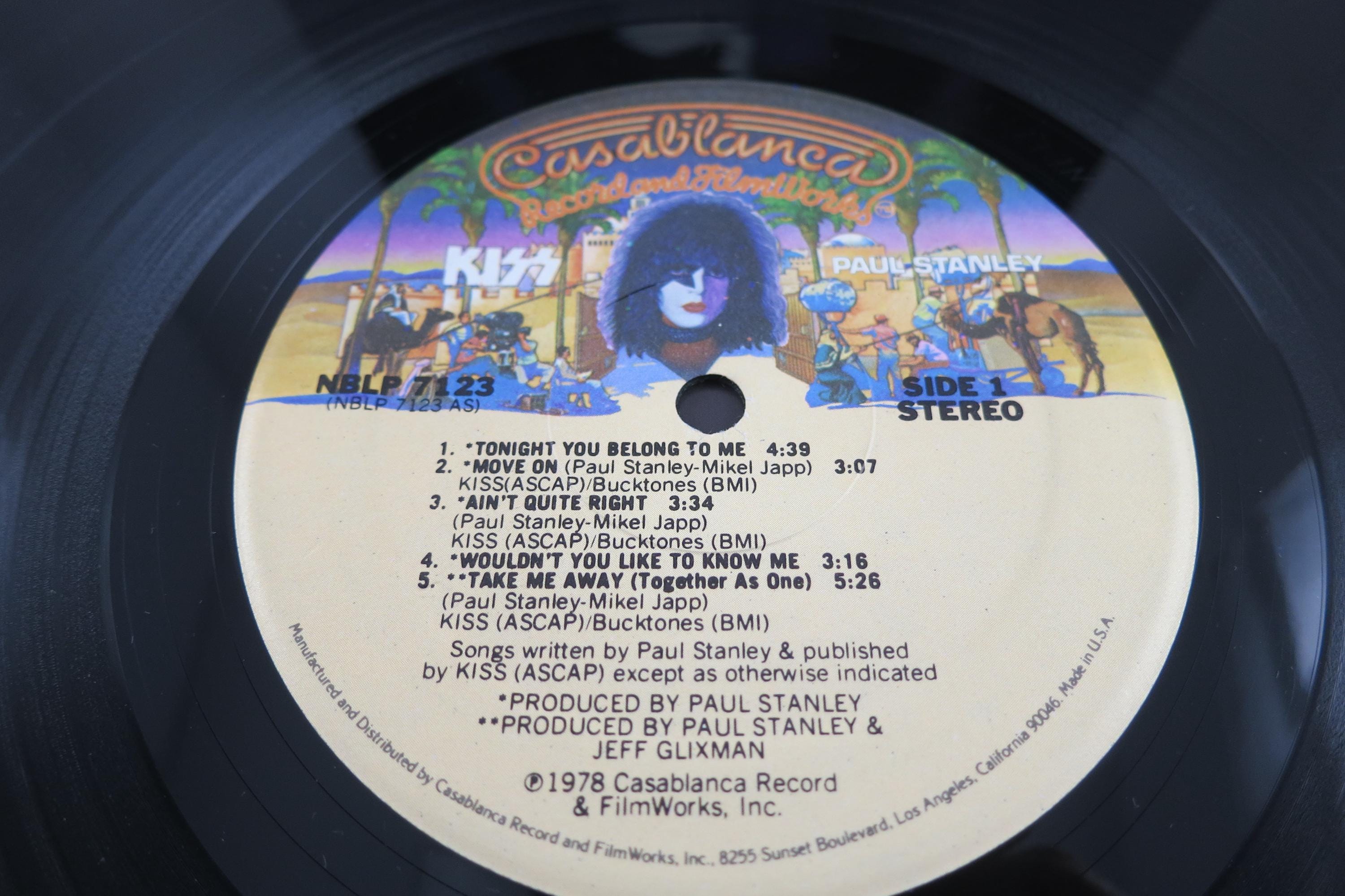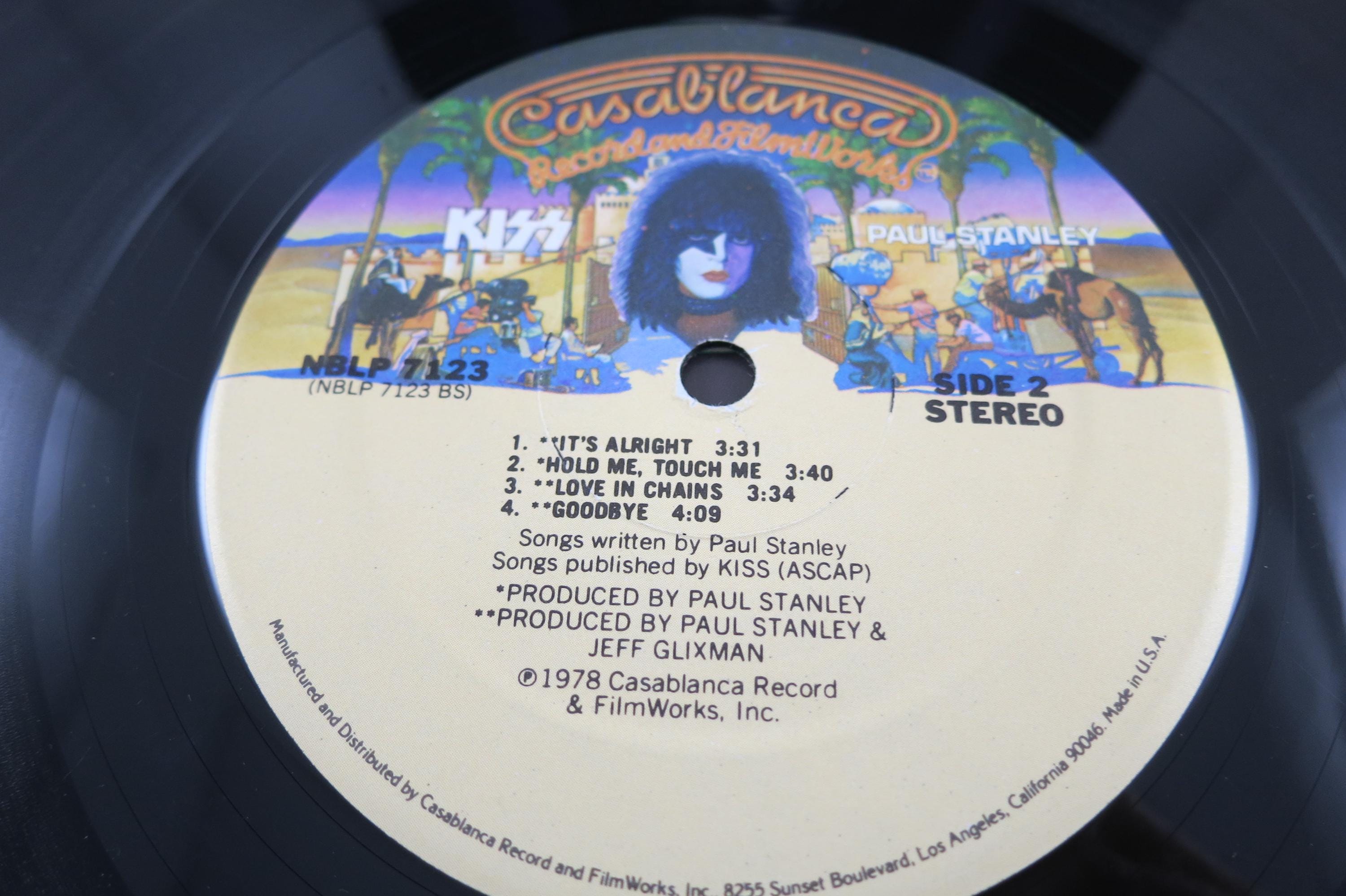 Vintage 1978 Vinyl LP Record KISS Paul Stanley Excellent Condition. Original cover is in good condition and includes the original inner paper sleeve. Cover has corner wear and a small clip bottom left. Also includes the original Poster, which has been hung at some point and has old tape residue on the back. Record is excellent with light marks. Tracks are as follows