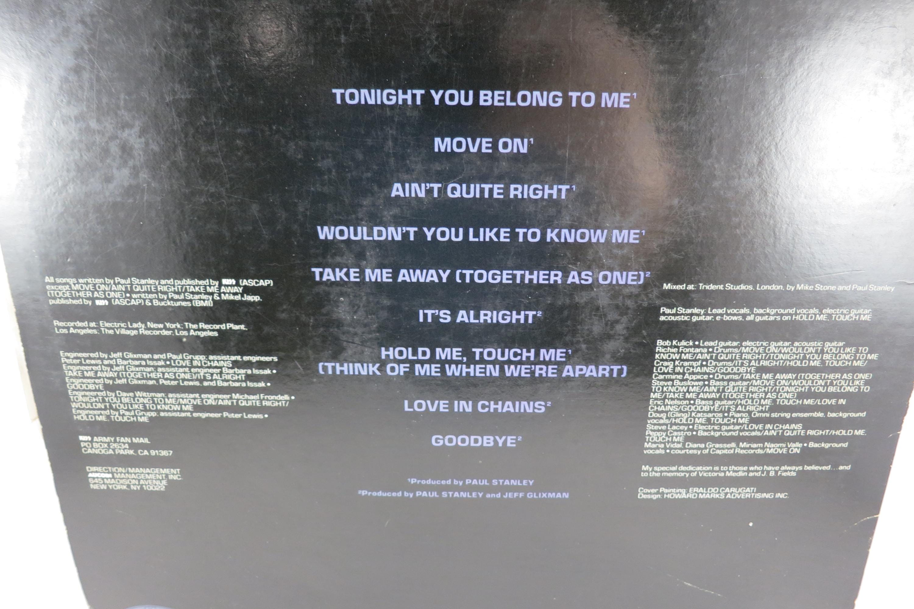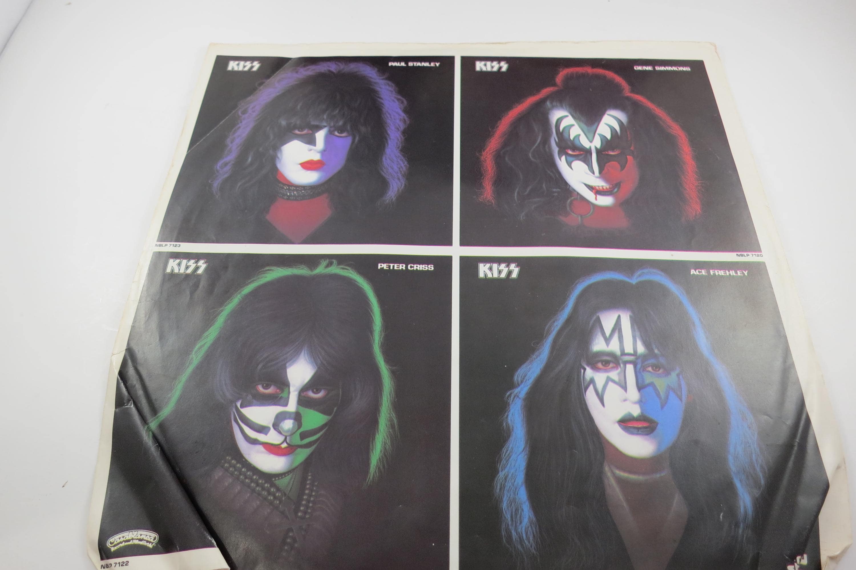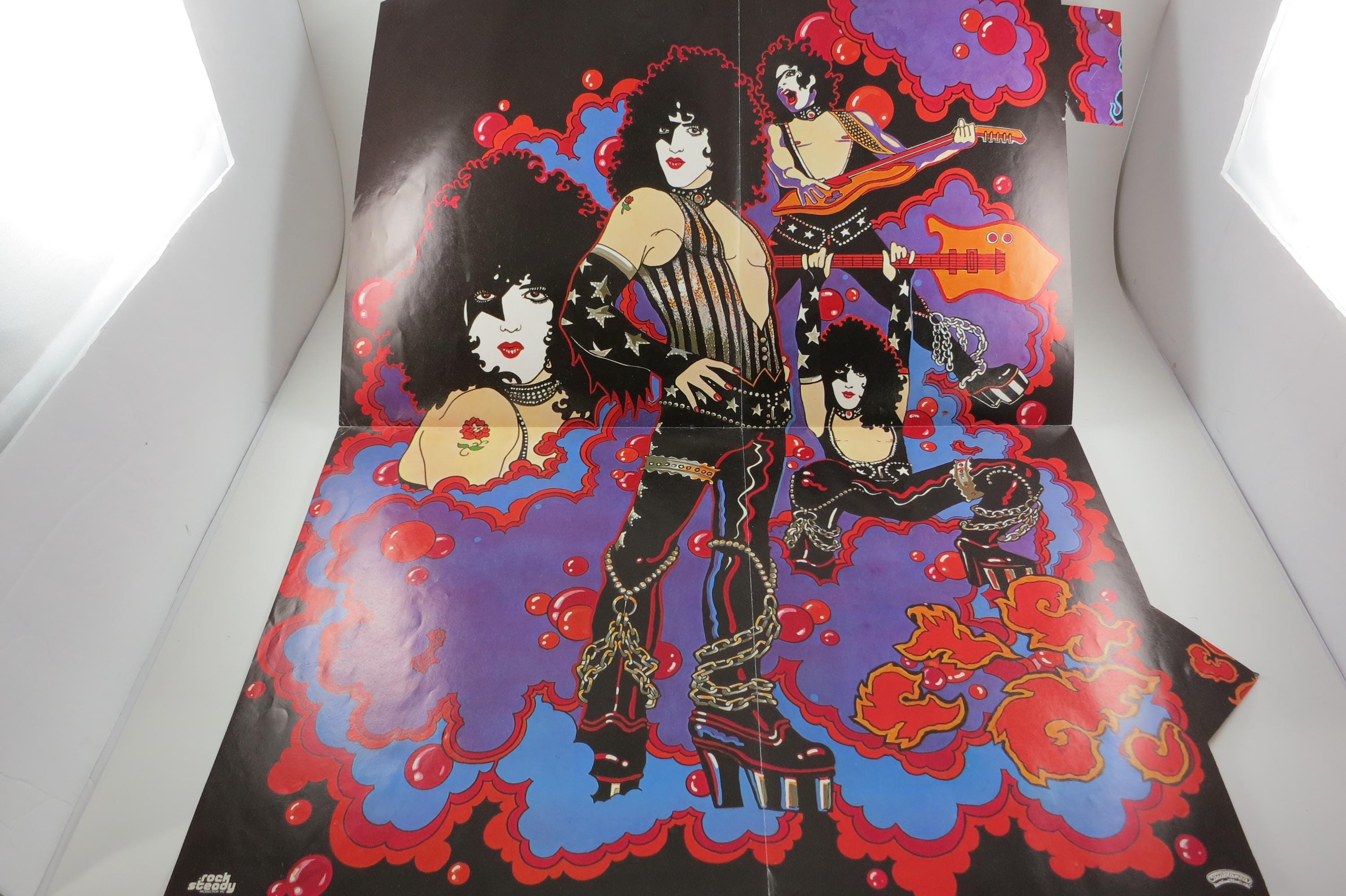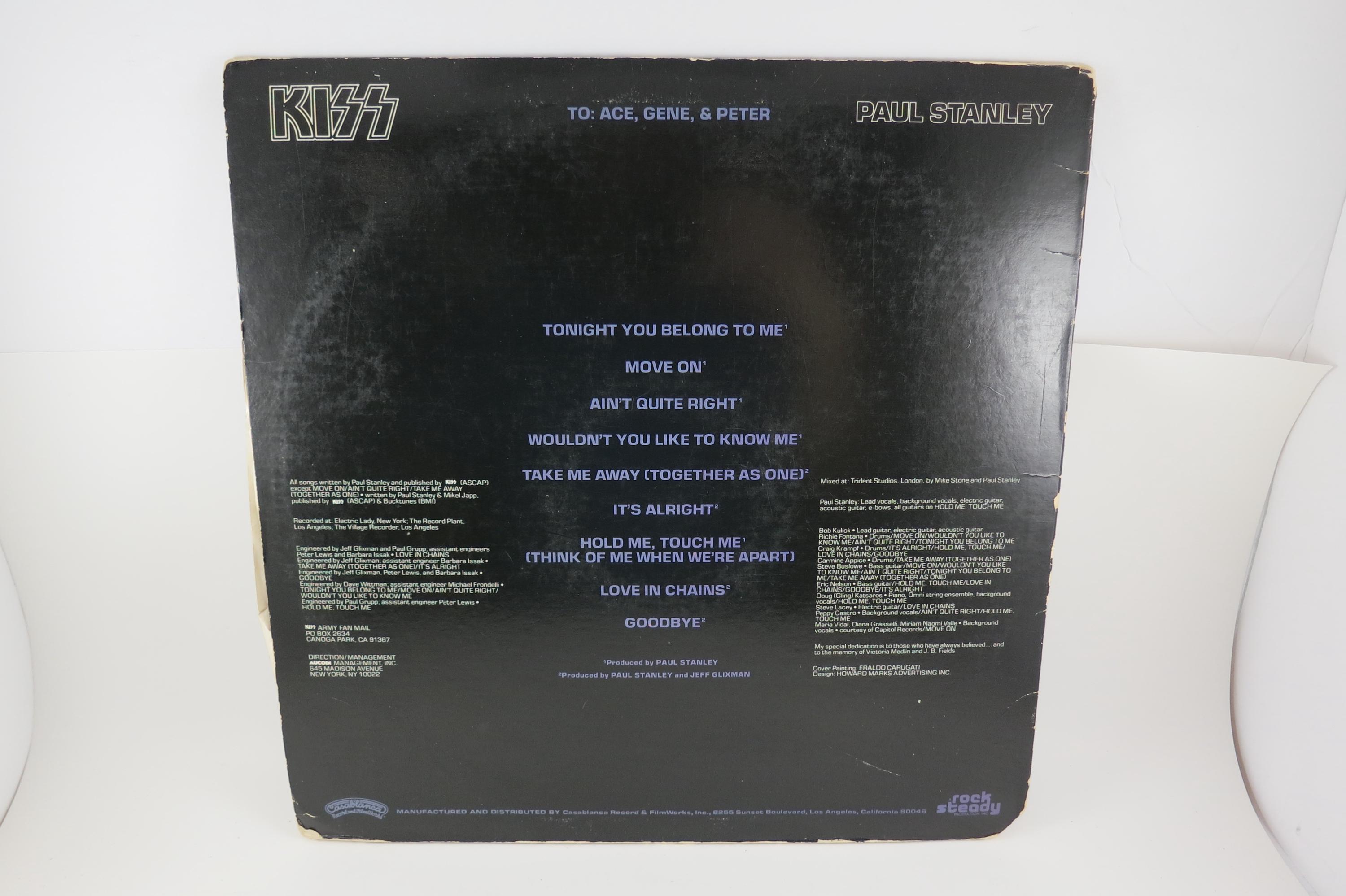 Vintage 1978 Vinyl LP Record KISS Paul Stanley Excellent Condition. Original cover is in good condition and includes the original inner paper sleeve. Cover has corner wear and a small clip bottom left. Also includes the original Poster, which has been hung at some point and has old tape residue on the back. Record is excellent with light marks. Tracks are as follows