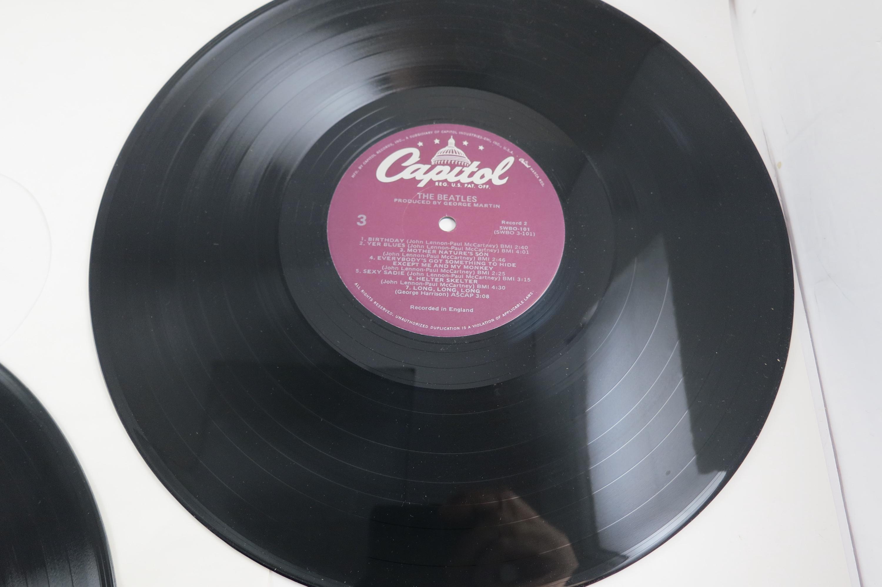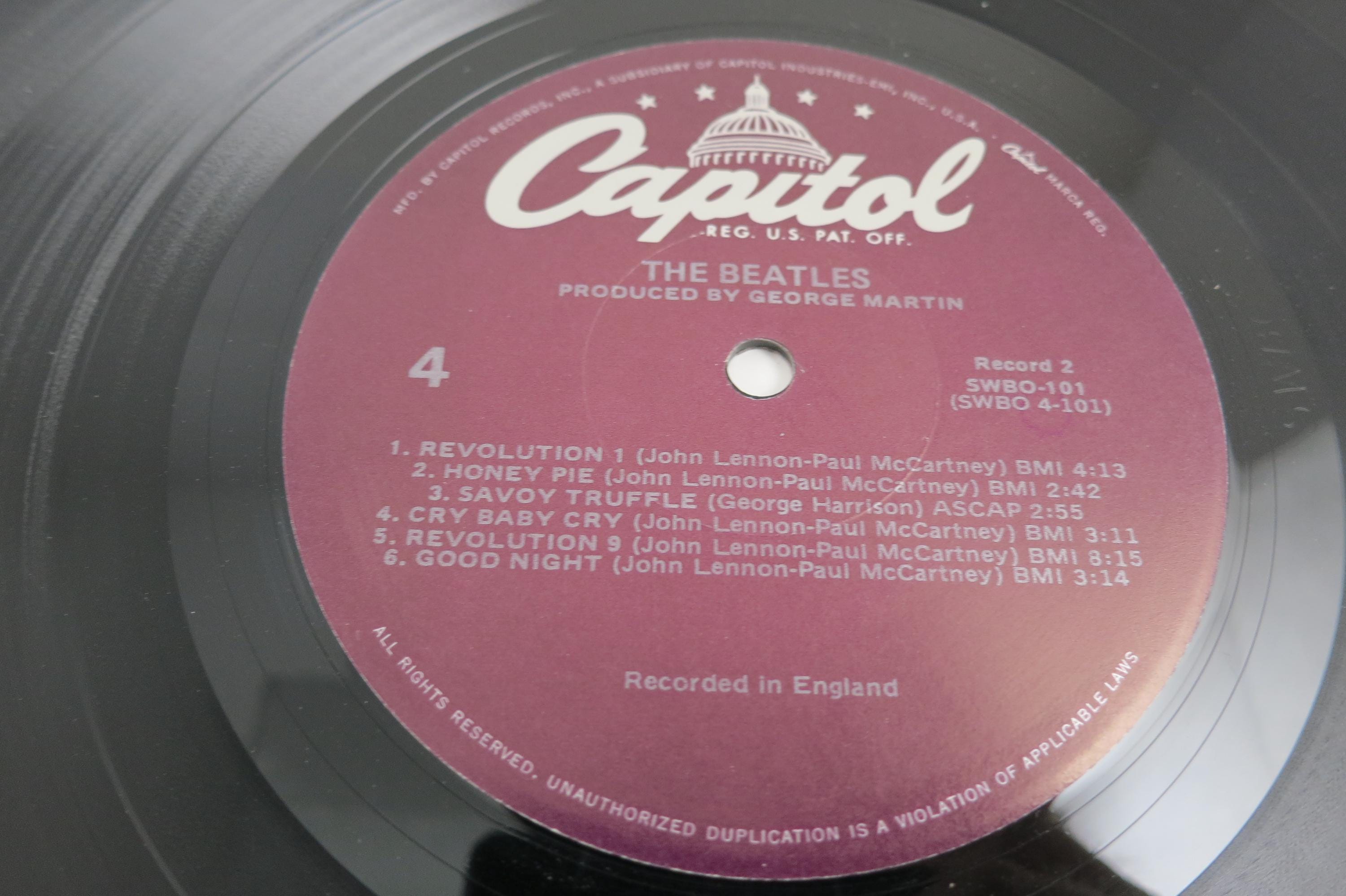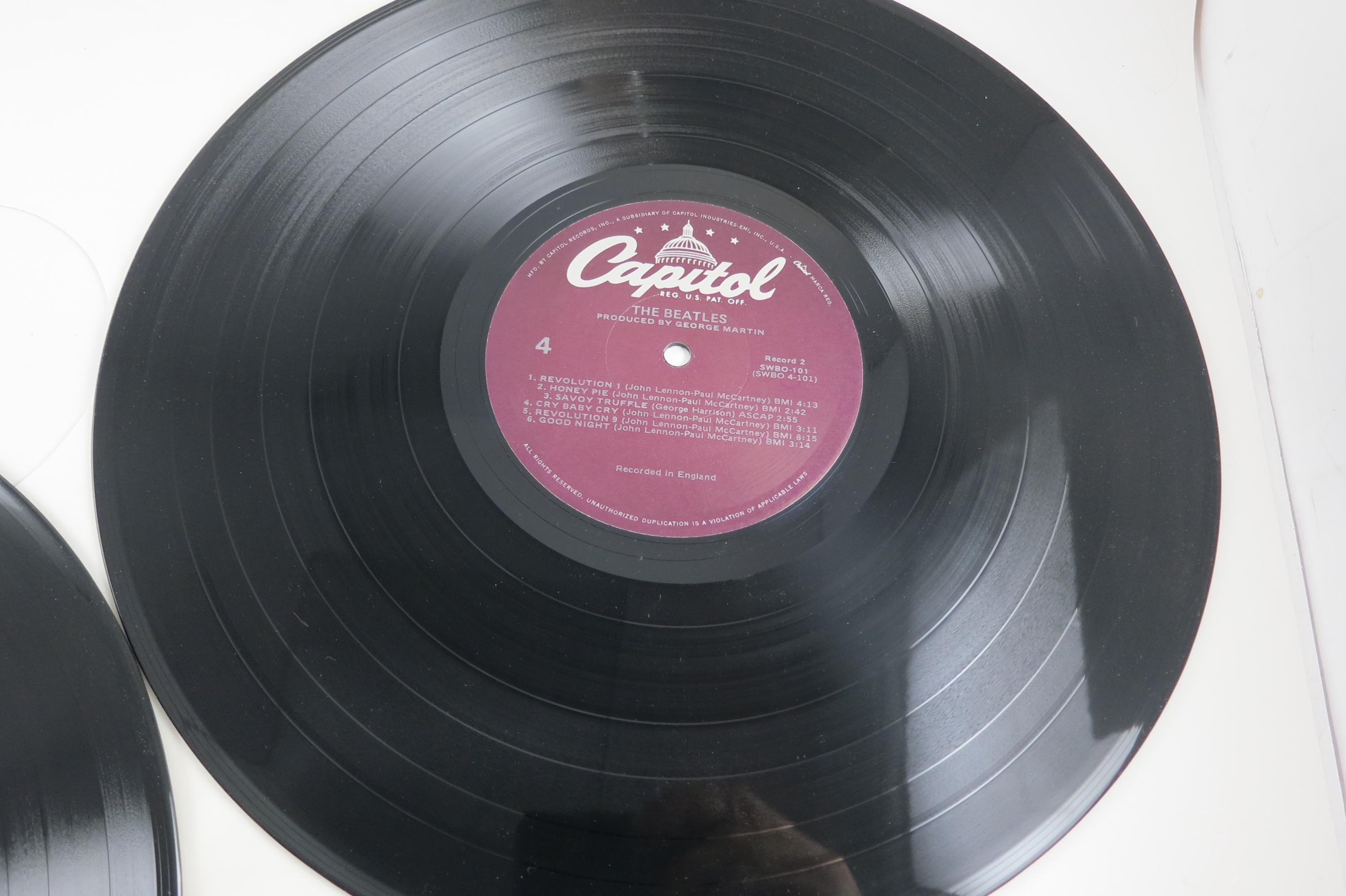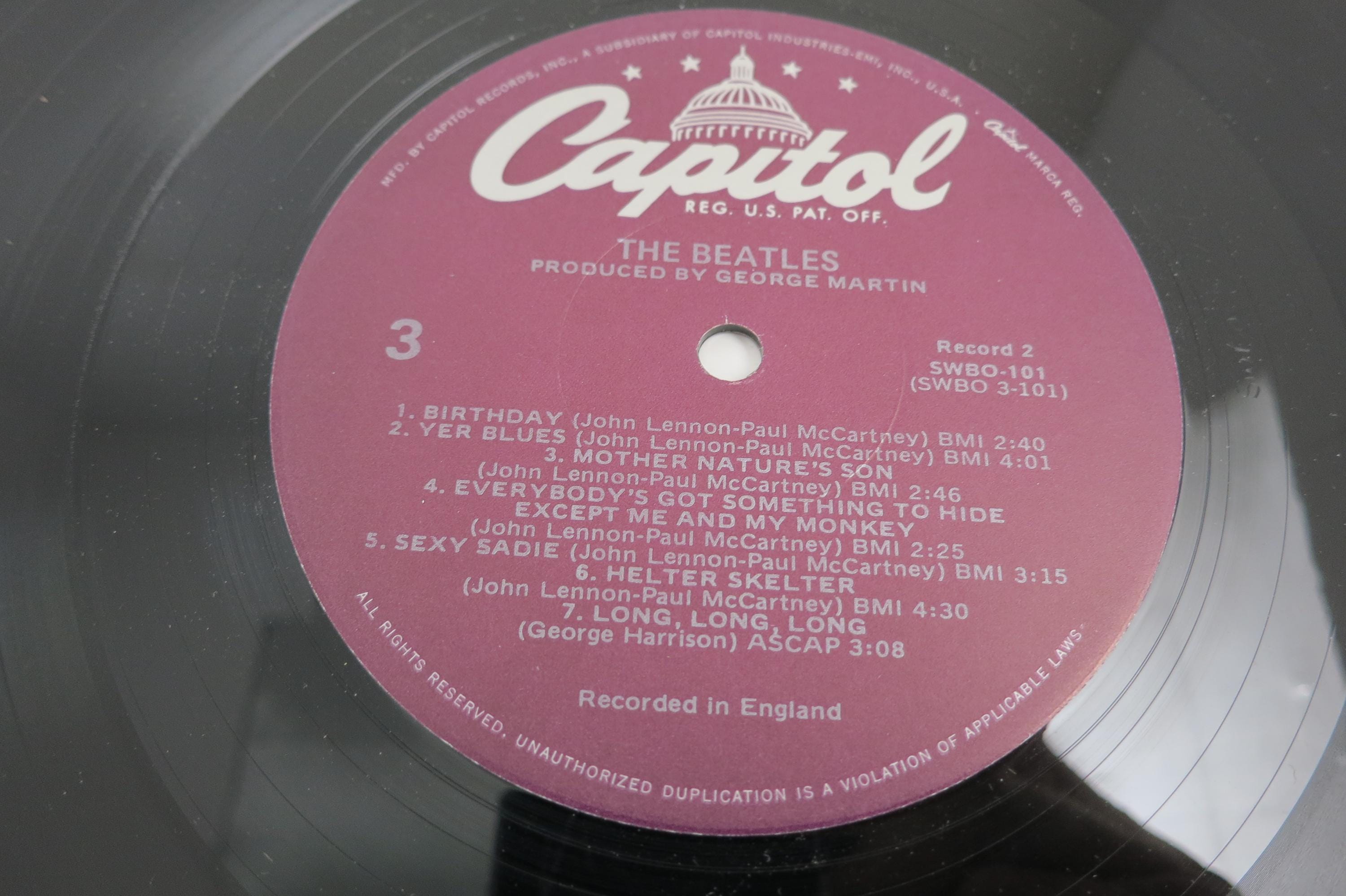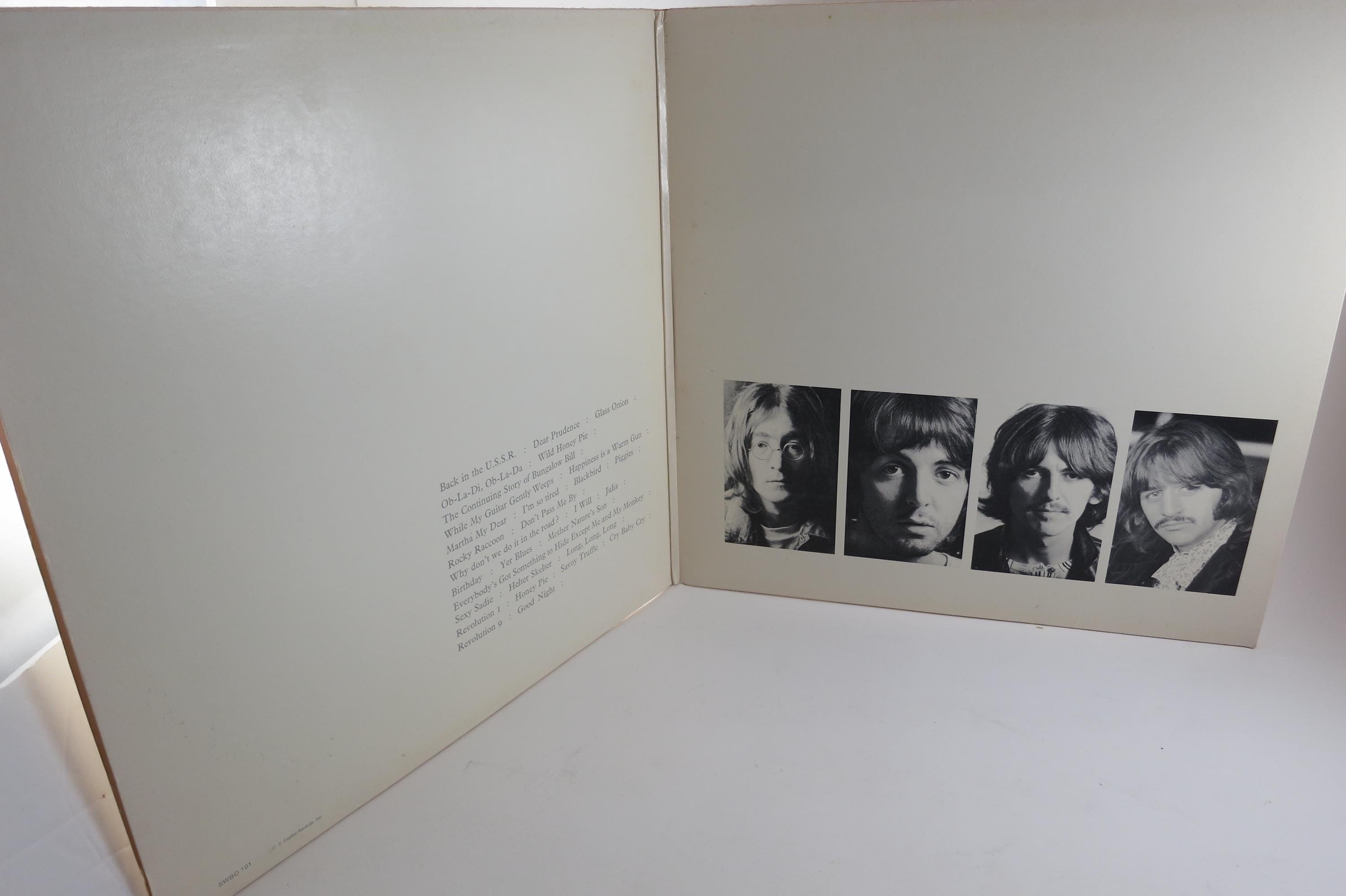 Vintage 1978 Vinyl LP Record The Beatles White Album Excellent Condition with Four Pictures & Original Poster Fair Cover. Original cover is in excellent condition and Includes both inner paper sleeves and the four original pictures as well as the poster. Records are excellent and both play well. Purple Label Pressing. Affordable Copy! Tracks are as follows