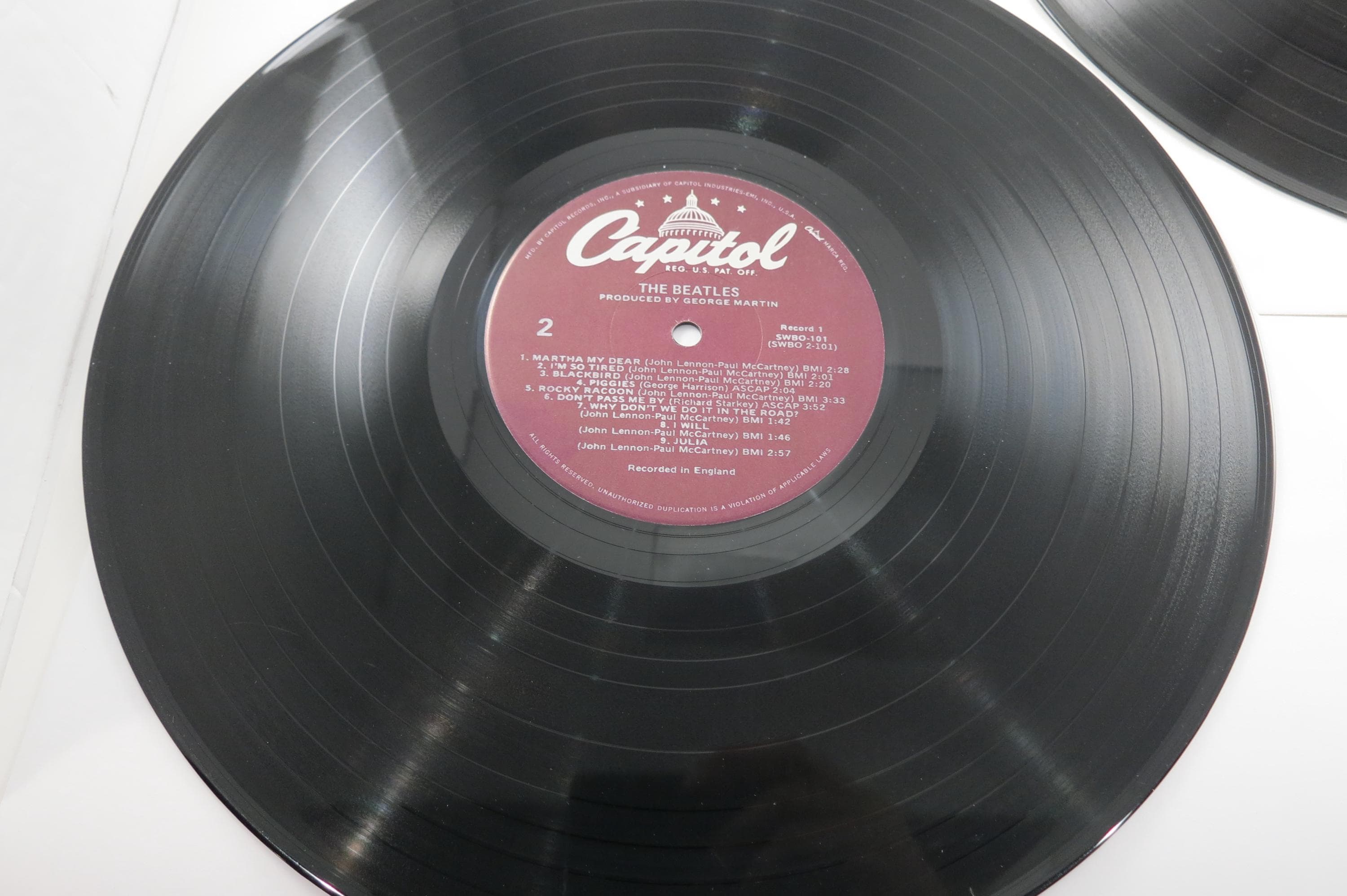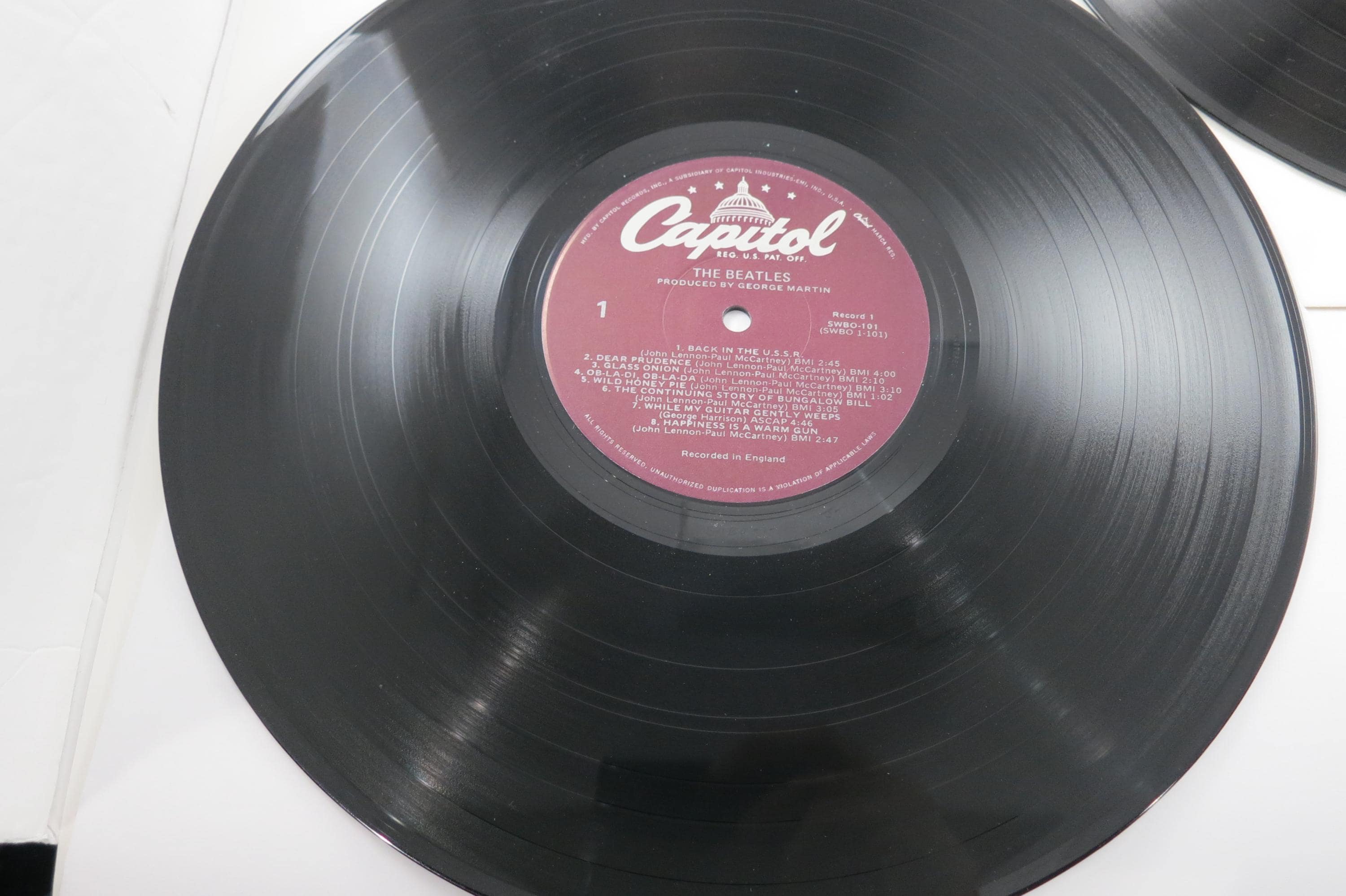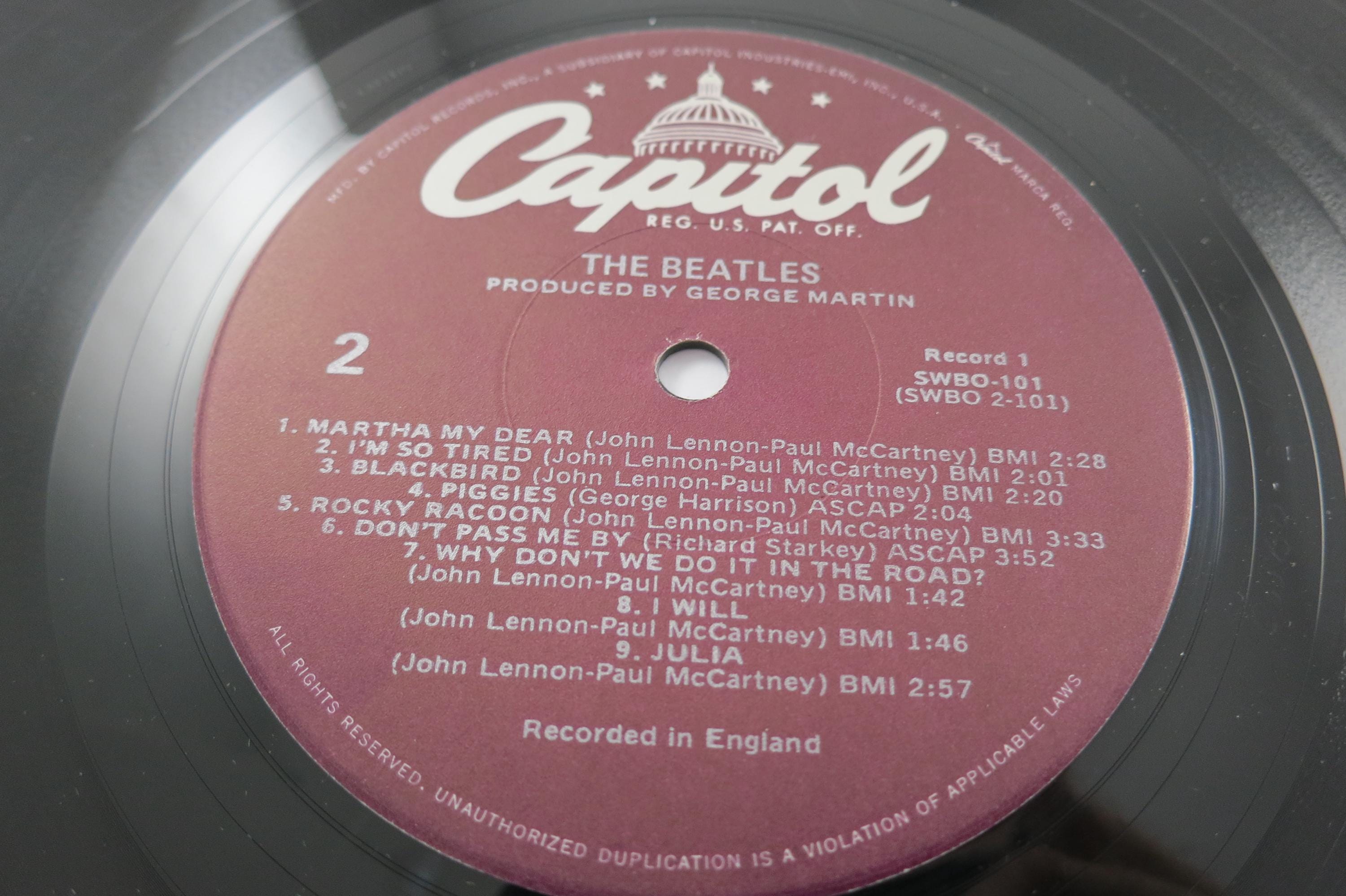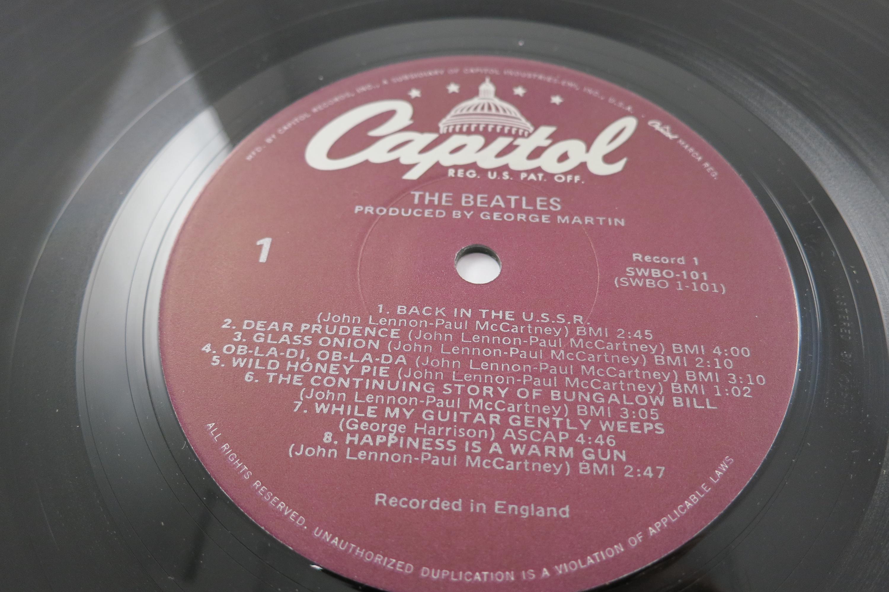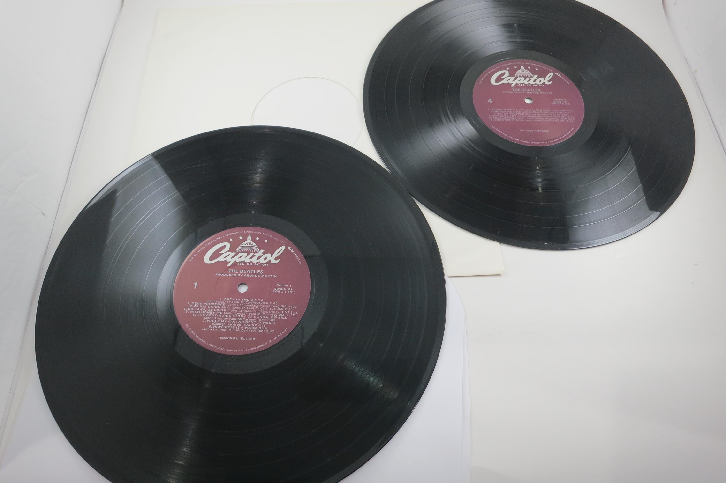Vintage 1978 Vinyl LP Record The Beatles White Album Excellent Condition with Four Pictures & Original Poster Fair Cover. Original cover is in excellent condition and Includes both inner paper sleeves and the four original pictures as well as the poster. Records are excellent and both play well. Purple Label Pressing. Affordable Copy! Tracks are as follows